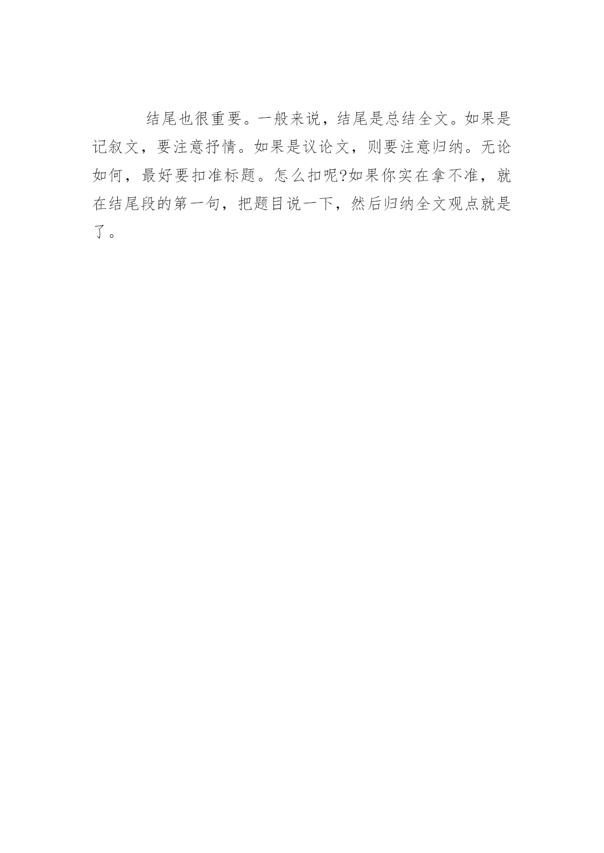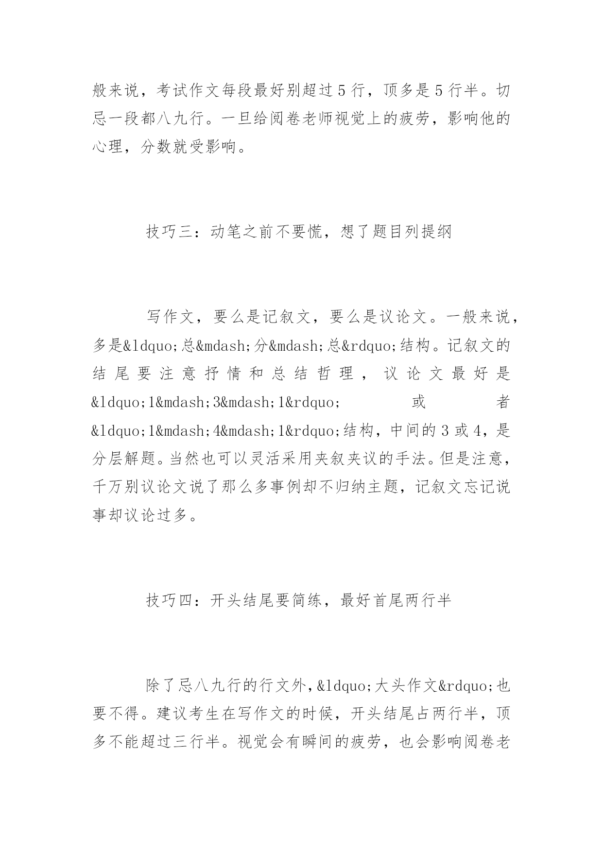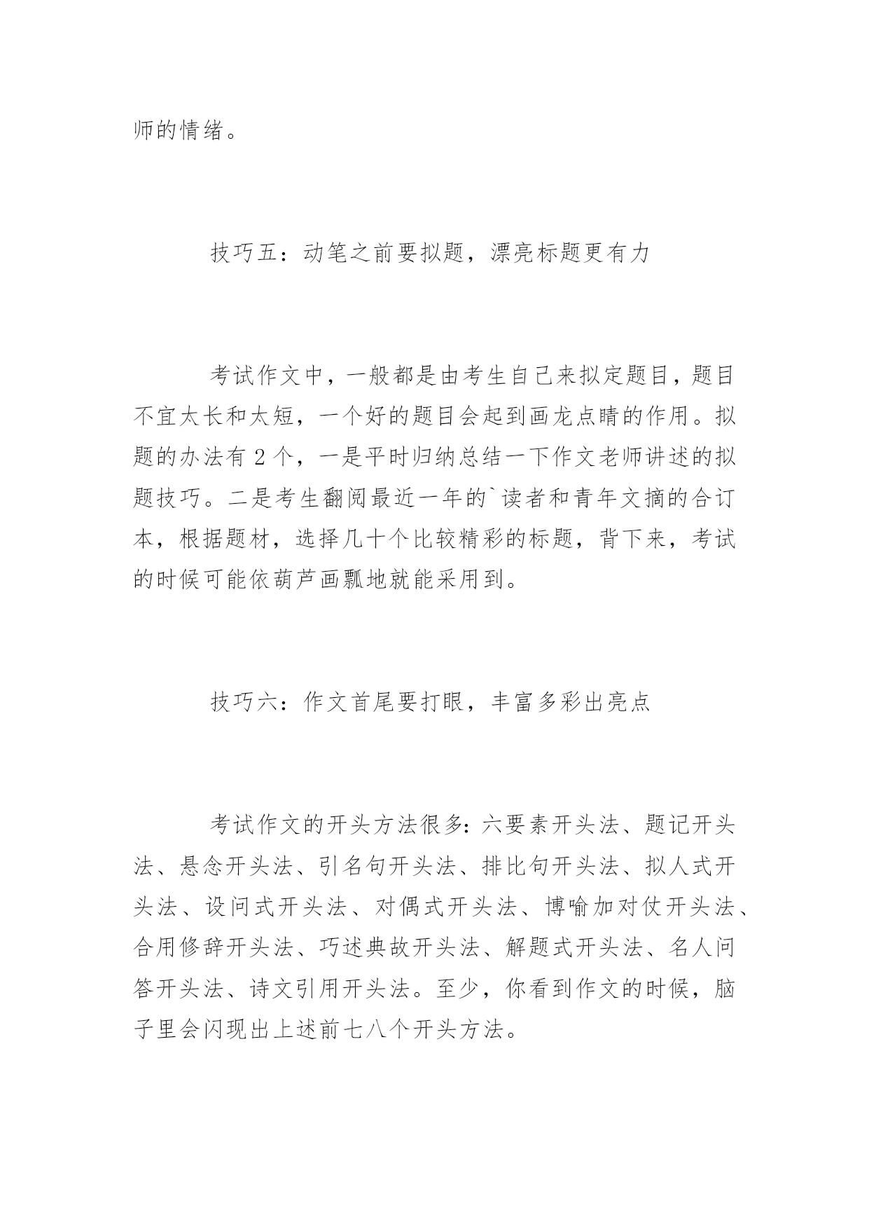 中考语文作文写作技巧中考语文作文写作技巧2017写作技巧是作者为表情达意而采取有效艺术手段。下面是小编为你带来的中考语文作文写作技巧2017,欢迎阅读。【中考语文作文写作技巧】技巧一:作文成绩看字迹,得分要素是第一任何形式的作文考试,阅卷老师打分时,第一眼,看的是字迹。因此,写作文必须要把字写好。记住,考作文考的是内容,而不是书法,切忌字迹潦草。技巧二:考试作文五六段,干净整洁看卷面考试作文中,要注意及时分段,三四个段落显得少了,八九个段落,显得琐碎了些。除非有特殊情况,段落以五六个为好。此外,卷面一定要整洁,不要涂改得乱七八糟。一般来说,考试作文每段最好别超过5行,顶多是5行半。切忌一段都八九行。一旦给阅卷老师视觉上的疲劳,影响他的心理,分数就受影响。技巧三:动笔之前不要慌,想了题目列提纲写作文,要么是记叙文,要么是议论文。一般来说,多是“总—分—总”结构。记叙文的结尾要注意抒情和总结哲理,议论文最好是“1—3—1”或者“1—4—1”结构,中间的3或4,是分层解题。当然也可以灵活采用夹叙夹议的手法。但是注意,千万别议论文说了那么多事例却不归纳主题,记叙文忘记说事却议论过多。技巧四:开头结尾要简练,最好首尾两行半除了忌八九行的行文外,“大头作文”也要不得。建议考生在写作文的时候,开头结尾占两行半,顶多不能超过三行半。视觉会有瞬间的疲劳,也会影响阅卷老师的情绪。技巧五:动笔之前要拟题,漂亮标题更有力考试作文中,一般都是由考生自己来拟定题目,题目不宜太长和太短,一个好的题目会起到画龙点睛的作用。拟题的办法有2个,一是平时归纳总结一下作文老师讲述的拟题技巧。二是考生翻阅最近一年的`读者和青年文摘的合订本,根据题材,选择几十个比较精彩的标题,背下来,考试的时候可能依葫芦画瓢地就能采用到。技巧六:作文首尾要打眼,丰富多彩出亮点考试作文的开头方法很多:六要素开头法、题记开头法、悬念开头法、引名句开头法、排比句开头法、拟人式开头法、设问式开头法、对偶式开头法、博喻加对仗开头法、合用修辞开头法、巧述典故开头法、解题式开头法、名人问答开头法、诗文引用开头法。至少,你看到作文的时候,脑子里会闪现出上述前七八个开头方法。结尾也很重要。一般来说,结尾是总结全文。如果是记叙文,要注意抒情。如果是议论文,则要注意归纳。无论如何,最好要扣准标题。怎么扣呢?如果你实在拿不准,就在结尾段的第一句,把题目说一下,然后归纳全文观点就是了。