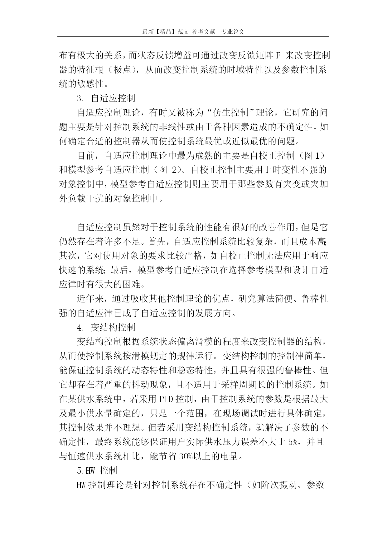 最新【精品】范文参考文献专业论文论机电控制系统的控制方式论机电控制系统的控制方式【摘要】:电子技术与计算机技术的发展,使得当时的机电控制技术逐渐向现代控制技术发展,并由单变量控制系统逐渐向多变量控制系统过渡。从70年代开始,计算机技术领域逐渐向微型化扩展。机电控制技术通过引入微型计算机,已开始向着智能化的方向发展。本文结合笔者多年工作经验,对机电控制系统的控制方式以及现代机电控制技术的应用进行了探讨。【关键词】:机电控制系统控制方式中图分类号:O421+.4文献标识码:A文章编号:现如今,机电控制技术的发展对我国的经济与国防等的建设增添新活力。机电控制技术指的是把机械、电子等知识紧密结合在一起的一种应用技术,这就需要多种新技术的应用才得以实现,目前主要的机电控制系统的控制方式有以下几种:1.PID控制PID控制理论是经典控制理论的代表,其名称来源于它的3种修正算法,即P(比例控制单元)、(I积分控制单元)和D(微分控制单元),分别对被控量的当前值、过去值和将来值进行控制修正。这3种修正算法都是用加法来实现被控制量的调整,在实际过程中,由于被加数总是为负的,所以这些加法运算实际上是相当于减法运算的。虽然PID控制结构简单,易于实现,但传统的PID控制器无法解决控制系统的快速性和稳态特性之间的矛盾,而且鲁棒性也不够强。然而通过这种经典控制理论的发展,目前已经出现了模糊PID、自适应PID等控制效果良好的控制器。2.状态反馈控制状态反馈控制的全称是全状态反馈控制,它把控制系统的全部状态变量反馈回控制器的输入端,从而提高控制系统的阻尼,全面改善控制系统的动态性能。在控制理论中,控制器的时域特性与极点的分布有极大的关系,而状态反馈增益可通过改变反馈矩阵F来改变控制器的特征根(极点),从而改变控制系统的时域特性以及参数控制系统的敏感性。3.自适应控制自适应控制理论,有时又被称为“仿生控制”理论,它研究的问题主要是针对控制系统的非线性或由于各种因素造成的不确定性,如何确定合适的控制器从而使控制系统最优或近似最优的问题。目前,自适应控制理论中最为成熟的主要是自校正控制(图1)和模型参考自适应控制(图2)。自校正控制主要用于时变性不强的对象控制中,模型参考自适应控制则主要用于那些参数有突变或突加外负载干扰的对象控制中。自适应控制虽然对于控制系统的性能有很好的改善作用,但是它仍然存在着许多不足。首先,自适应控制系统比较复杂,而且成本高;其次,它对使用对象的要求比较严格,如自校正控制无法应用于响应快速的系统;最后,模型参考自适应控制在选择参考模型和设计自适应律时有很大的困难。近年来,通过吸收其他控制理论的优点,研究算法简便、鲁棒性强的自适应律已成了自适应控制的发展方向。4.变结构控制变结构控制根据系统状态偏离滑模的程度来改变控制器的结构,从而使控制系统按滑模规定的规律运行。变结构控制的控制律简单,能保证控制系统的动态特性和稳态特性,并且具有很强的鲁棒性。但它却存在着严重的抖动现象,且不适用于采样周期长的控制系统。如在某供水系统中,若采用PID控制,由于控制系统的参数是根据最大及最小供水量确定的,只是一个范围,在现场调试时进行具体确定,其控制效果并不理想。但若采用变结构控制系统,就解决了参数的不确定性,最终系统能够保证用户实际供水压力误差不大于5%,并且与恒速供水系统相比,能节省30%以上的电量。5.HW控制HW控制理论是针对控制系统存在不确定性(如阶次摄动、参数摄动)和外界干扰的情况,通过求取出某种控制律,从而使控制系统对这些不确定性和外界干扰不敏感的控制方法。HW控制的优点在于对于能量有界的外界干扰问题以及系统的不确定性,它都有效。同时,最小灵敏度问题、鲁棒性问题等都可以转化为HW最优控制问题。然而,HW控制方法很难同时满足系统的鲁棒性问题和其他性能指标,同时它的非线性控制问题还不是很完善。6.模糊控制模糊控制(FuzzyControl)是一种利用模糊理论、模糊语言变量以及模糊逻辑推理的知识来模拟人的模糊思维方式,使计算机实现与操作者相同的控制方式。模糊控制的主要适用对象是那些被控量没有精确的表示方法和被控对象各参数间没有精确的相互关系的情况。模糊控制系统示意图如图3所示。模糊控制可以简化系统设计的复杂性,适用于那些非线性、时变、模型不完全的系统。它利用控制法则来描述系统变量之间的关系,用语言而不用数值来描述系统,这使得设计人员在设计模糊控制器时不必对控制对象建立完整的数学模型。另外,模糊控制器是一种易于控制的非线性控制器,有较好的适应性、强健性和容错性。但模糊控制也存在一些不足:(1)模糊控制的设计尚不具有系统性,难以实现复杂的控制;(2)模糊控制系统设计方法仍只是凭借着设计人员的经验进