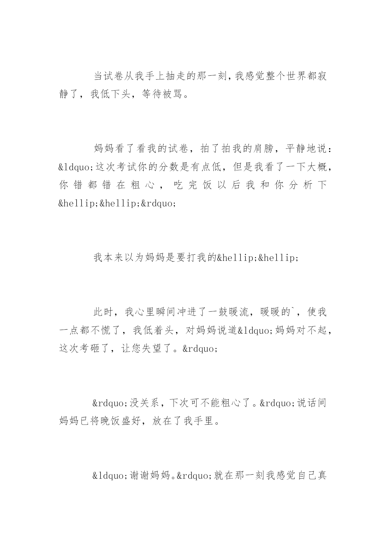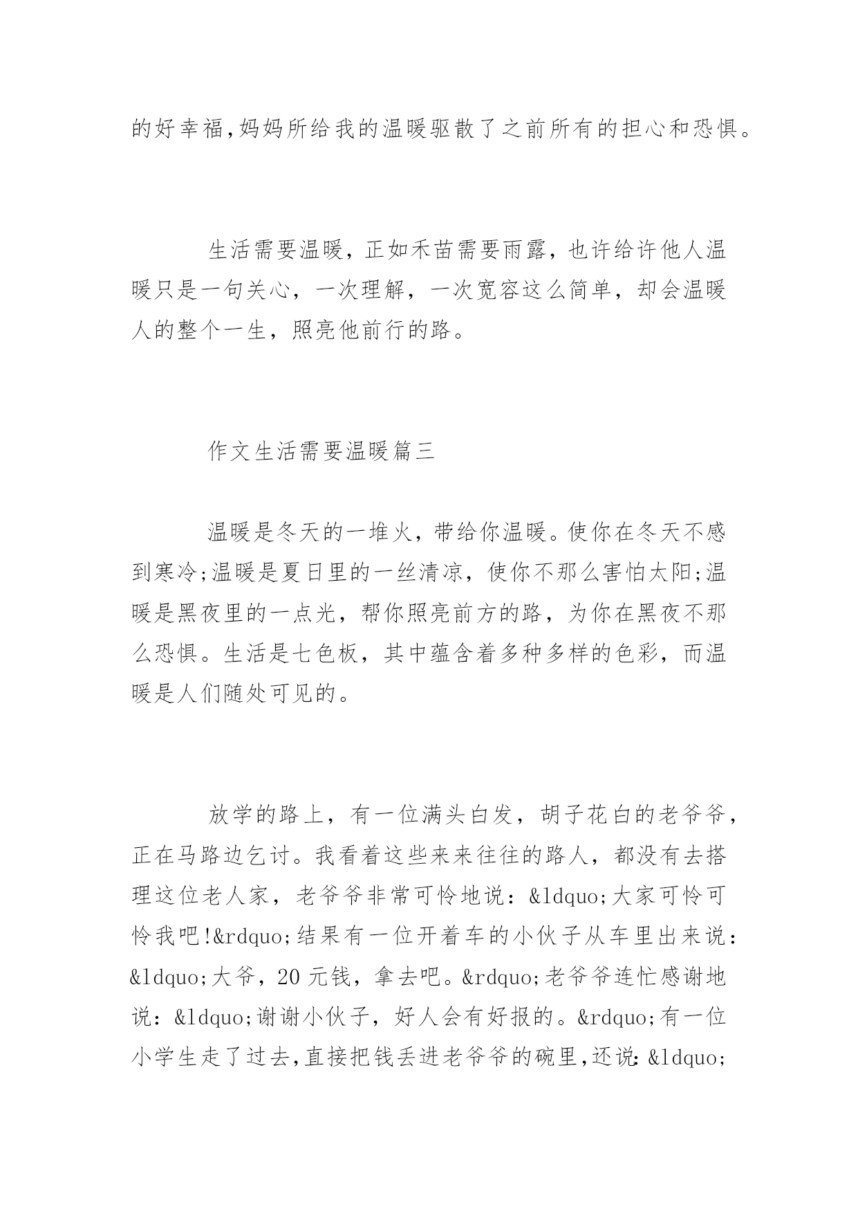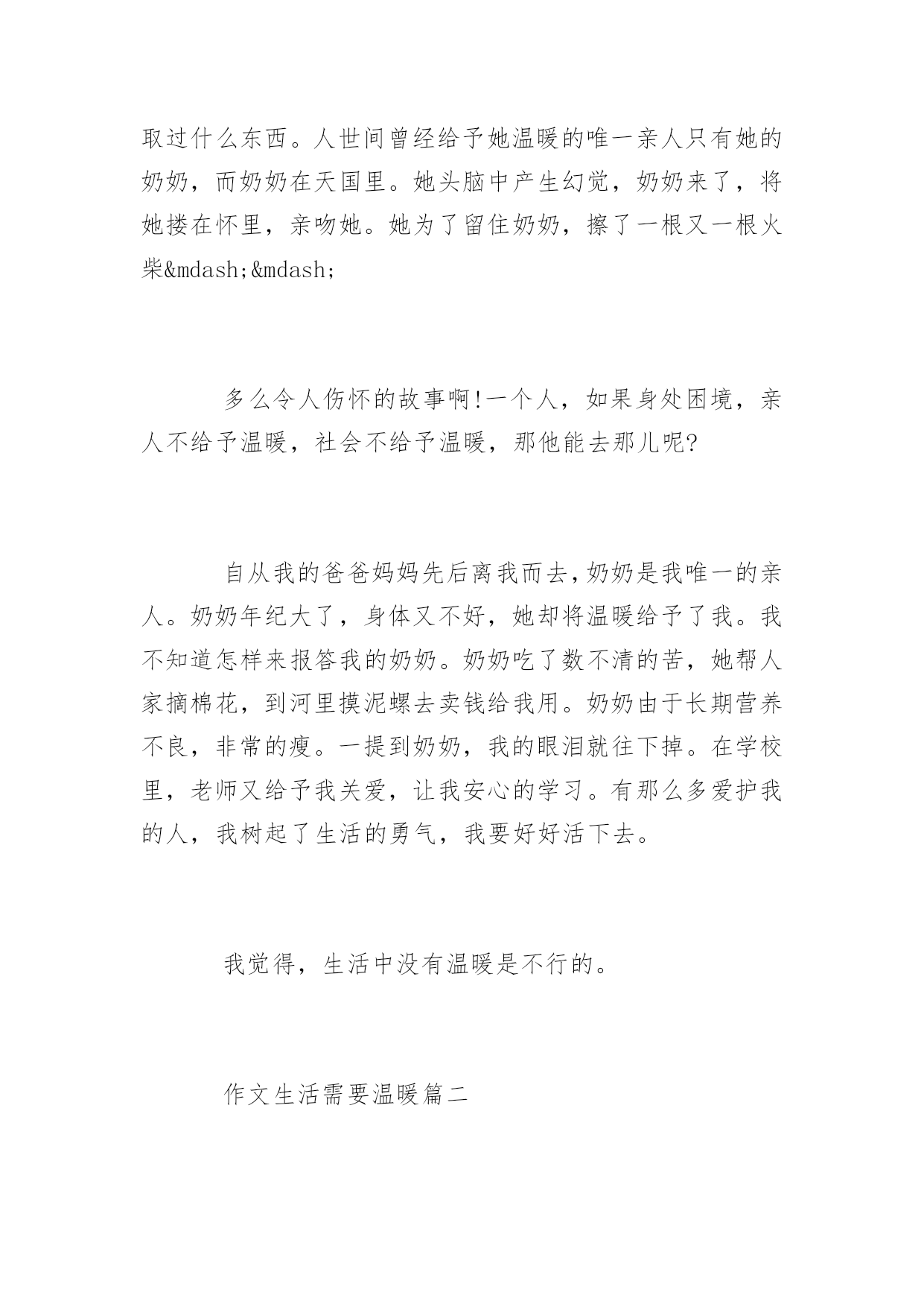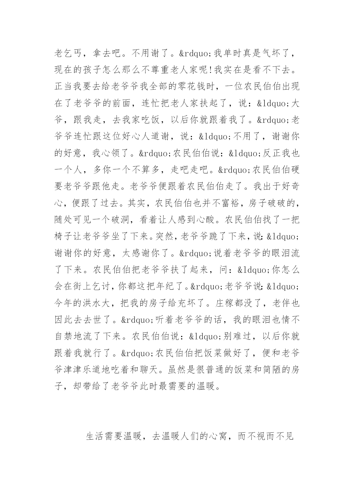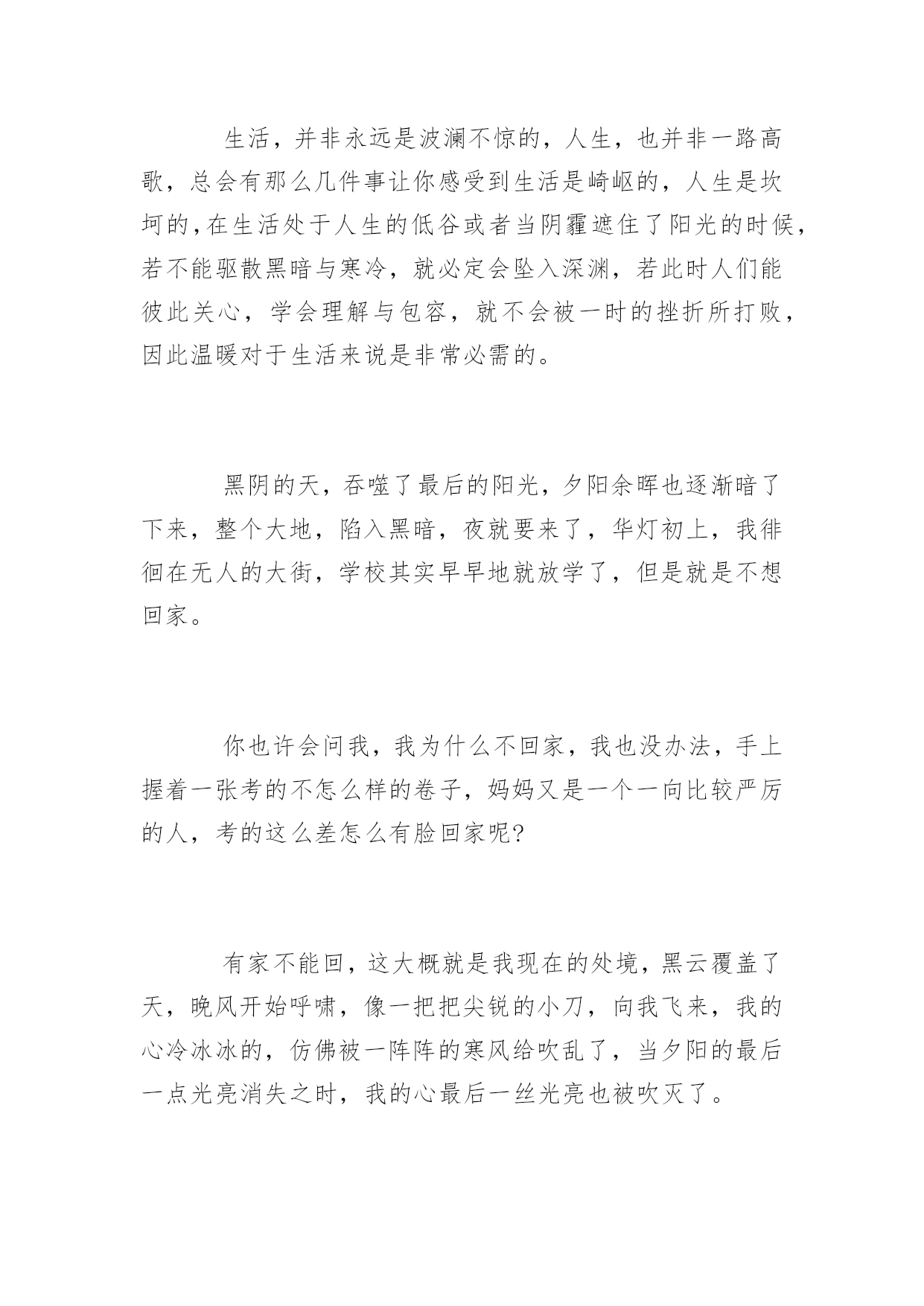 作文生活需要温暖作文生活需要温暖关于作文生活需要温暖有哪些呢?生活是经历酸甜苦辣、悲欢离合的过程;生活是吃喝拉撒睡的堆积;生活也是在一个人的能力范围内达到最充分而实际的需要,是满足自己的同时,尽可能给别人快乐,也是满足欲望所做的一切,同时,生活更是把人性扭曲的根源!下面是小编为您整理的作文生活需要温暖,欢迎阅读参考!作文生活需要温暖篇一生活中,每个人都需要温暖,如果没有温暖,那么生活着又有什么意义呢?我记得安徒生的童话《卖火柴的小女孩》,那个女孩非常的苦,没有鞋子,没有御寒的衣服,没有裹腹的食物。在大年三十的夜晚,在街头叫卖火柴,没有人来帮助她,没有给予她爱和温暖。她对那个社会是怎样的绝望啊!严寒紧逼,她蜷缩在富人家的墙角下,徒有幻想,徒有黄粱美梦。她肯定大哭过,她伸出肮胀的冻得馒头似的小手,向空中抓取过什么东西。人世间曾经给予她温暖的唯一亲人只有她的奶奶,而奶奶在天国里。她头脑中产生幻觉,奶奶来了,将她搂在怀里,亲吻她。她为了留住奶奶,擦了一根又一根火柴——多么令人伤怀的故事啊!一个人,如果身处困境,亲人不给予温暖,社会不给予温暖,那他能去那儿呢?自从我的爸爸妈妈先后离我而去,奶奶是我唯一的亲人。奶奶年纪大了,身体又不好,她却将温暖给予了我。我不知道怎样来报答我的奶奶。奶奶吃了数不清的苦,她帮人家摘棉花,到河里摸泥螺去卖钱给我用。奶奶由于长期营养不良,非常的瘦。一提到奶奶,我的眼泪就往下掉。在学校里,老师又给予我关爱,让我安心的学习。有那么多爱护我的人,我树起了生活的勇气,我要好好活下去。我觉得,生活中没有温暖是不行的。作文生活需要温暖篇二生活,并非永远是波澜不惊的,人生,也并非一路高歌,总会有那么几件事让你感受到生活是崎岖的,人生是坎坷的,在生活处于人生的低谷或者当阴霾遮住了阳光的时候,若不能驱散黑暗与寒冷,就必定会坠入深渊,若此时人们能彼此关心,学会理解与包容,就不会被一时的挫折所打败,因此温暖对于生活来说是非常必需的。黑阴的天,吞噬了最后的阳光,夕阳余晖也逐渐暗了下来,整个大地,陷入黑暗,夜就要来了,华灯初上,我徘徊在无人的大街,学校其实早早地就放学了,但是就是不想回家。你也许会问我,我为什么不回家,我也没办法,手上握着一张考的不怎么样的卷子,妈妈又是一个一向比较严厉的人,考的这么差怎么有脸回家呢?有家不能回,这大概就是我现在的处境,黑云覆盖了天,晚风开始呼啸,像一把把尖锐的小刀,向我飞来,我的心冷冰冰的,仿佛被一阵阵的寒风给吹乱了,当夕阳的最后一点光亮消失之时,我的心最后一丝光亮也被吹灭了。天渐渐下起了小雨,滴滴哒哒落在我的脸上,我急忙退进了阴暗的走廊,我想敲门,却又向后退了步,我的心里慌乱急了,恐惧、不安,我在走廊里来回的度步,要进去还是别进去,内心很挣扎。突然,我看到眼前发出了亮光,原来妈妈出来倒垃圾了。我倒吸一口凉气,心想听天由命吧。“潼潼,你终于回来了,你这孩子跑哪儿去了?你一定饿坏了吧!快进来吃饭。”我走进房间,浓浓的香味吸进了我的鼻子,我走进屋子,坐下来,妈妈问我:“听说今天数学考试,你考了几分啊?”果然还是逃不掉的。“那个……那什么……”还没等我说完,妈妈拿走了我手上的试卷……当试卷从我手上抽走的那一刻,我感觉整个世界都寂静了,我低下头,等待被骂。妈妈看了看我的试卷,拍了拍我的肩膀,平静地说:“这次考试你的分数是有点低,但是我看了一下大概,你错都错在粗心,吃完饭以后我和你分析下……”我本来以为妈妈是要打我的……此时,我心里瞬间冲进了一鼓暖流,暖暖的`,使我一点都不慌了,我低着头,对妈妈说道“妈妈对不起,这次考砸了,让您失望了。””没关系,下次可不能粗心了。”说话间妈妈已将晚饭盛好,放在了我手里。“谢谢妈妈。”就在那一刻我感觉自己真的好幸福,妈妈所给我的温暖驱散了之前所有的担心和恐惧。生活需要温暖,正如禾苗需要雨露,也许给许他人温暖只是一句关心,一次理解,一次宽容这么简单,却会温暖人的整个一生,照亮他前行的路。作文生活需要温暖篇三温暖是冬天的一堆火,带给你温暖。使你在冬天不感到寒冷;温暖是夏日里的一丝清凉,使你不那么害怕太阳;温暖是黑夜里的一点光,帮你照亮前方的路,为你在黑夜不那么恐惧。生活是七色板,其中蕴含着多种多样的色彩,而温暖是人们随处可见的。放学的路上,有一位满头白发,胡子花白的老爷爷,正在马路边乞讨。我看着这些来