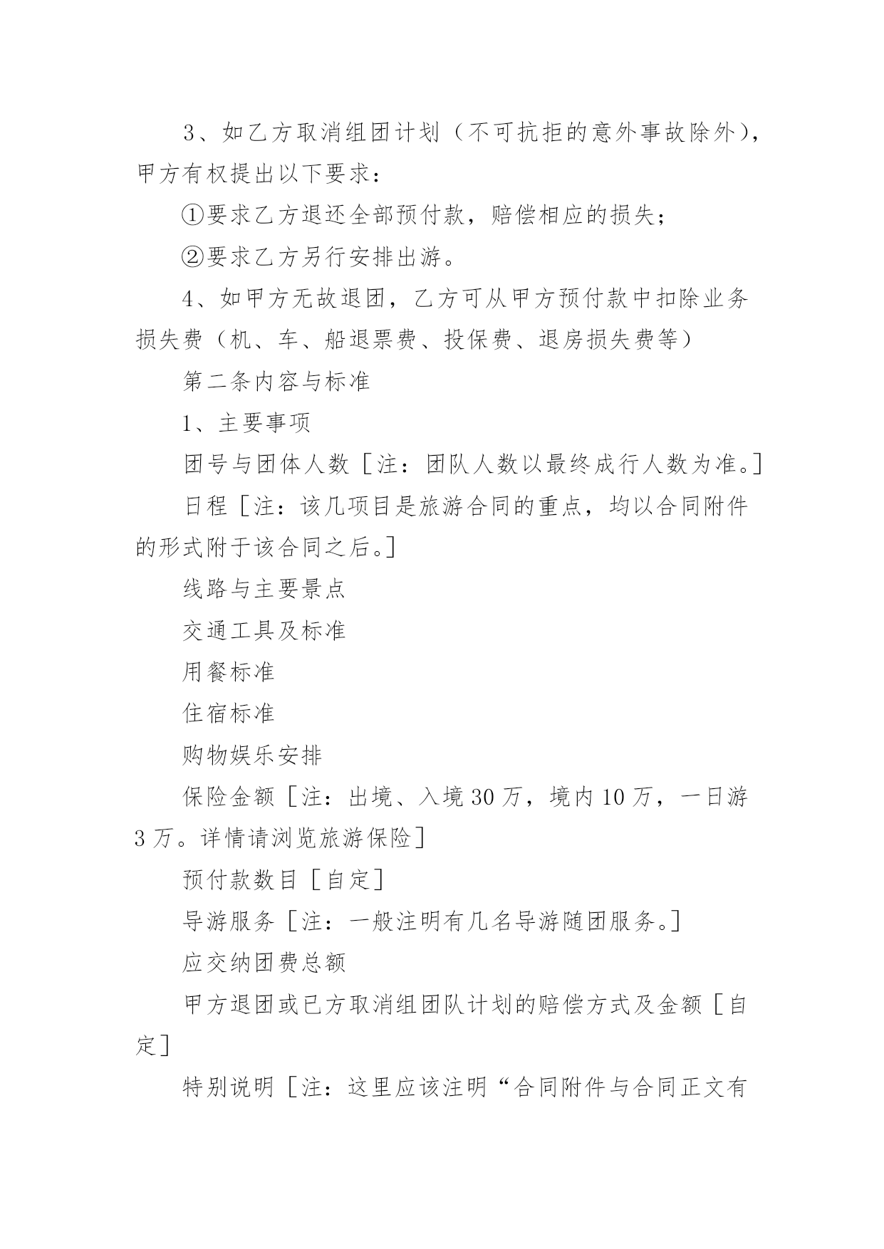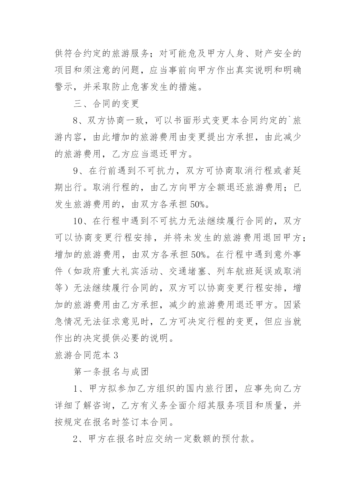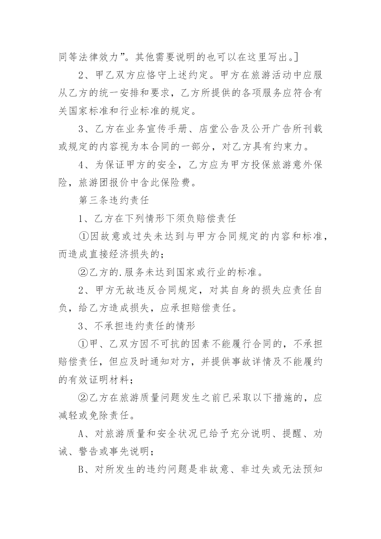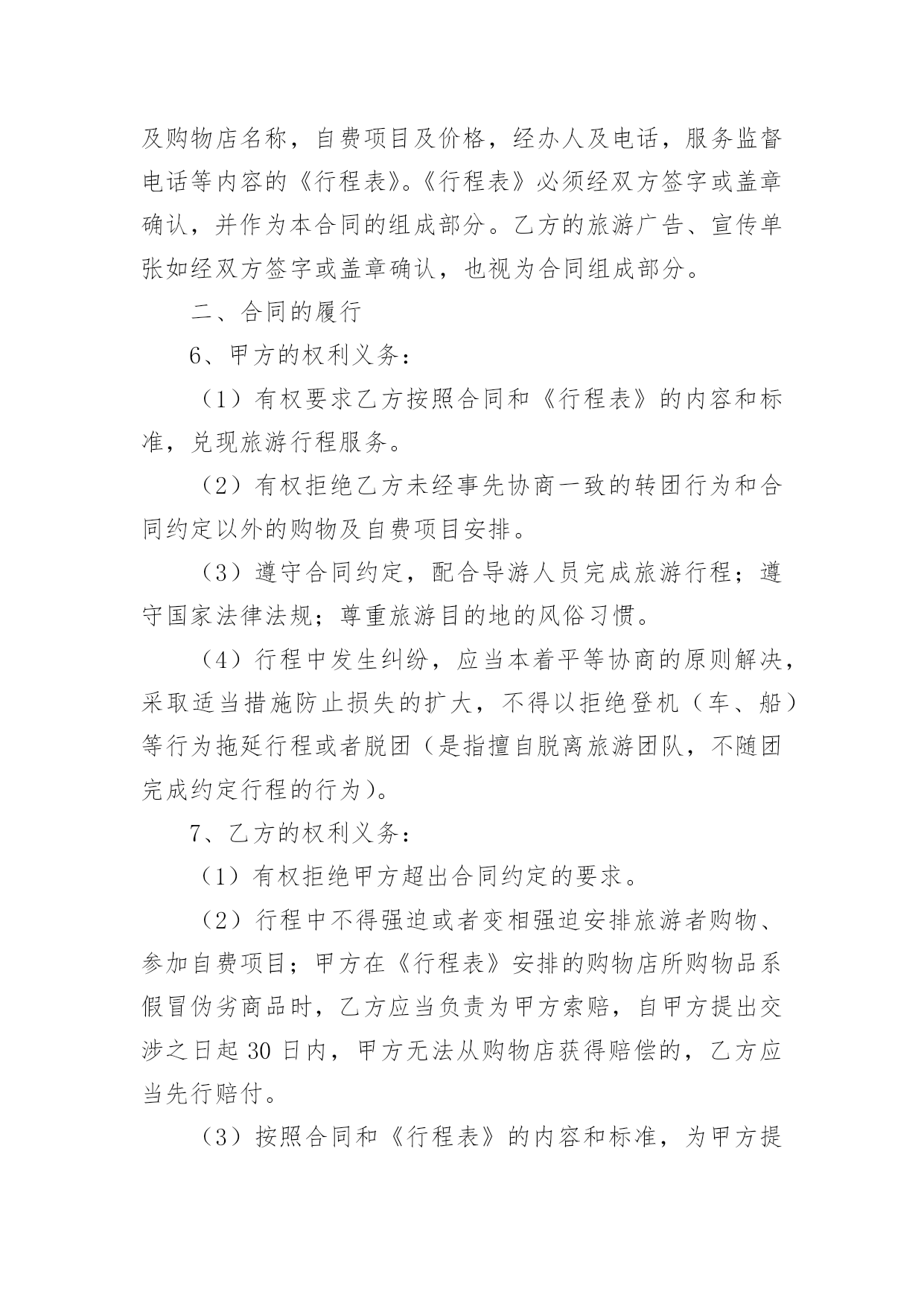 旅游合同旅游合同范本随着广大人民群众法律意识的普遍提高,合同对我们的帮助越来越大,在达成意见一致时,制定合同可以享有一定的自由。那么一份详细的合同要怎么写呢?下面是小编收集整理的旅游合同范本,希望能够帮助到大家。旅游合同范本1甲方(用人单位)名称:旅游公司地址:性质:法定代表人(委托代理人)乙方(劳动者)姓名:性别:出生年月:家庭住址:居民身份证号码:导游资格证号码:导游证号码:甲乙双方根据《中华人民共和国劳动法》等法律、法规、规章的规定,在平等自愿、协商一致的基础上,同意订立本合同,共同遵守本合同所列条款。一、合同期限1、甲乙双方在签订本合同之时开始生效,年月日起至年月日止,共年。二、工作内容、要求1、甲方安排乙方担任导游工作。2、乙方应按照甲方的要求,按时完成规定的工作数量,达到规定的质量标准。3、甲方要求乙方将《导游资格证》挂靠甲方公司。三、工作待遇1、甲方负责购买三险(即:养老保险、失业保险、医疗保险)2、工资采取与经济效益挂钩考核的办法,多劳多得。3、乙方组团出游,乙方获利润的`10%酬金。4、带游客到河源大宾馆住宿提5%酬金。5、由旅行社委托的接:150元/次。6、外出带团300元/次。7、公司提供劳动保护,公司根据规定配发工作服,带团外出含个人旅游保险,利用淡季免费对导游进行各地景点考察学习。8、一个月有四天休假,休假时间由公司安排,员工也可以根据自身情况提出安排休假时间。四、劳动合同的变更、解除、终止和续订1、经甲乙双方协商一致,可以变更本合同相关内容或解除本合同。2、甲乙双方单方面解除劳动合同,必须符合《劳动法》第25条、第26条、第27条、第31条和第32条的规定。乙方有《劳动法》第29条规定情形的,甲方不得随意解除本合同。3、本合同期限届满,劳动合同即可终止。甲乙双方经协商同意,可以续订劳动合同。五、经济补偿与赔偿1、甲方依法解除乙方劳动合同,应执行劳部发[1994]481号文件关于支付乙方经济补偿金的规定。乙方依据《劳动法》第32条第(二)第(三)项规定解除本合同,甲方也应按劳部发[1994]481号文件规定支付经济补偿金。2、甲方支付乙方的工资报酬低于当地最低工资标准的,要在补足低于标准部分的同时,依法支付赔偿金。六、劳动争议处理及其它1、因履行本合同发生的劳动争议,甲乙双方均可以向本单位劳动争议调解委员会申请调解;不愿调解或调解不成,一方要求仲裁的,应当自劳动争议发生之日起六十日内向劳动争议仲裁委员会申请仲裁。一方也可以直接向劳动争议仲裁委员会申请仲裁,对仲裁裁决不服的,可以向人民法院提起诉讼。2、本合同未尽事宜,双方可另协商解决;与今后国家法律、行政法规等有关规定相悖的,按有关规定执行。3、本合同一式两份,甲乙双方各执一份。法定代表人或负责人签名:甲方盖章:乙方签名:盖章日期:签名日期:旅游合同范本2甲方(团体或个人):_______________________合同编号:_______________________乙方(组团旅行社):_______________________签约地点及日期:_________________甲方自愿参加乙方组织的旅行团旅游,为明确双方的权利和义务,现就有关事宜达成如下协议:一、报名及签约1、甲方应提供准确的个人信息(含身体状况等),经甲方签名确认的报名信息,作为本合同的组成部分。2、甲方应在签订合同时付清旅游费用。旅游费用包括:乙方代订飞机票或火车票等城市间交通费用;旅游观光汽车费用;住宿费;餐费;非自费项目景点(区)的第一道门票费;行程中安排的其他项目费用;导游服务费;双方另有约定的除外。3、乙方有权根据甲方的身体状况等因素决定是否接纳甲方报名参团。4、乙方收取旅游费用时应出具合法的发票。5、乙方在签订本合同时应当向甲方提供列明旅行社经营范围及经营许可证编号,旅游出发地、途经地和目的地,交通、住宿、餐饮安排及标准,统一安排的游览项目的具体内容及时间,自由活动的时间和次数,购物次数、停留时间及购物店名称,自费项目及价格,经办人及电话,服务监督电话等内容的《行程表》。《行程表》必须经双方签字或盖章确认,并作为本合同的组成部分。乙方的旅游广告、宣传单张如经双方签字或盖章确认,也视为合同组成部分。二、合同的履行6、甲方的权利义务:(1)有权要求乙方按照合同和《行程表》的内容和标准,兑现旅游行程服务。(2)有权拒绝乙方未经事先协商一致的转团行为和合同约定以外的购物及自费项目安排。(3)遵守合同约定,配合导游人员完成旅游行程;遵守国家法律法规;尊重旅游目的地的风俗习惯。(4)行程中发生纠纷,应当本着平等协商的原则解决,采取适当措施防止损失的扩大,不得以拒绝登机(车、船)等行为拖延行程或者脱团(是指擅自脱离旅游团队,不随团完成约定行程的行为)。7、乙方的权利义务