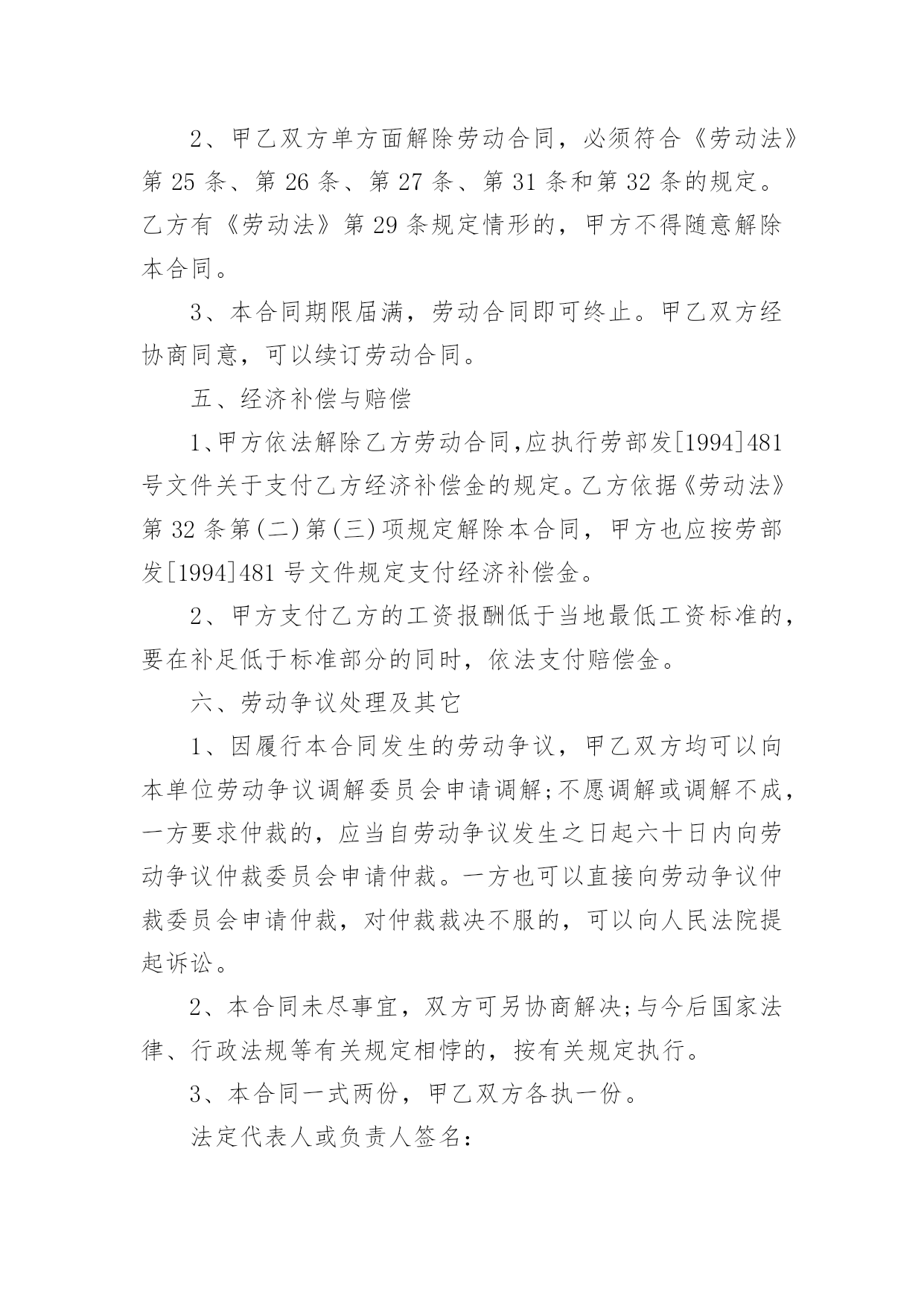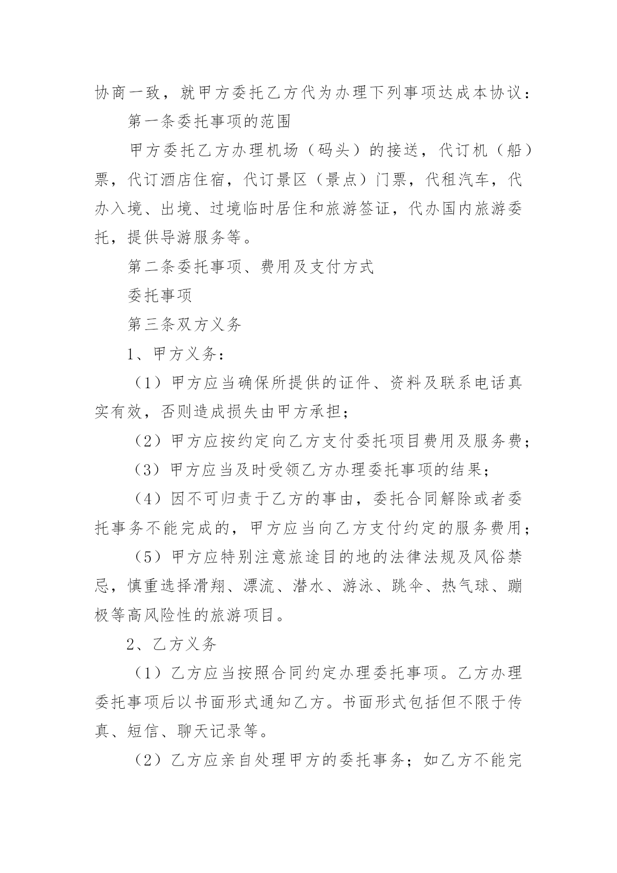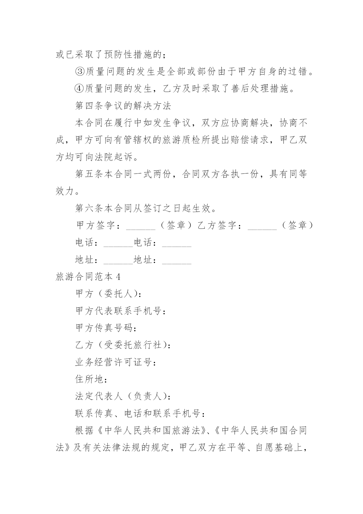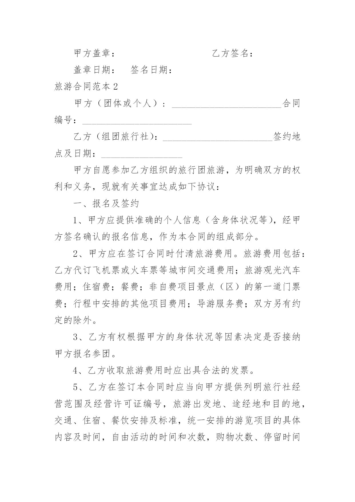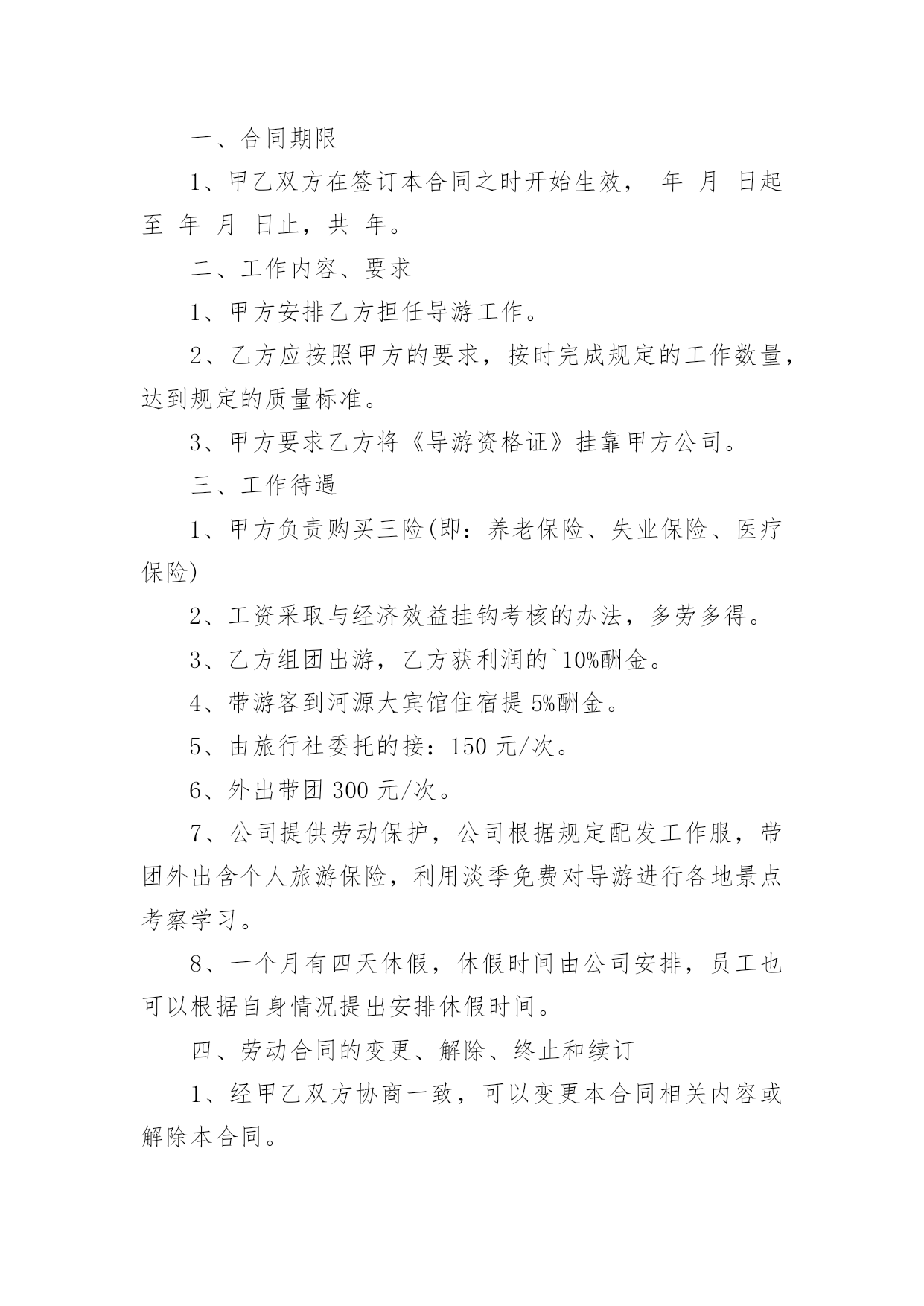 旅游合同旅游合同范本随着广大人民群众法律意识的普遍提高,合同对我们的帮助越来越大,在达成意见一致时,制定合同可以享有一定的自由。那么一份详细的合同要怎么写呢?下面是小编收集整理的旅游合同范本,希望能够帮助到大家。旅游合同范本1甲方(用人单位)名称:旅游公司地址:性质:法定代表人(委托代理人)乙方(劳动者)姓名:性别:出生年月:家庭住址:居民身份证号码:导游资格证号码:导游证号码:甲乙双方根据《中华人民共和国劳动法》等法律、法规、规章的规定,在平等自愿、协商一致的基础上,同意订立本合同,共同遵守本合同所列条款。一、合同期限1、甲乙双方在签订本合同之时开始生效,年月日起至年月日止,共年。二、工作内容、要求1、甲方安排乙方担任导游工作。2、乙方应按照甲方的要求,按时完成规定的工作数量,达到规定的质量标准。3、甲方要求乙方将《导游资格证》挂靠甲方公司。三、工作待遇1、甲方负责购买三险(即:养老保险、失业保险、医疗保险)2、工资采取与经济效益挂钩考核的办法,多劳多得。3、乙方组团出游,乙方获利润的`10%酬金。4、带游客到河源大宾馆住宿提5%酬金。5、由旅行社委托的接:150元/次。6、外出带团300元/次。7、公司提供劳动保护,公司根据规定配发工作服,带团外出含个人旅游保险,利用淡季免费对导游进行各地景点考察学习。8、一个月有四天休假,休假时间由公司安排,员工也可以根据自身情况提出安排休假时间。四、劳动合同的变更、解除、终止和续订1、经甲乙双方协商一致,可以变更本合同相关内容或解除本合同。2、甲乙双方单方面解除劳动合同,必须符合《劳动法》第25条、第26条、第27条、第31条和第32条的规定。乙方有《劳动法》第29条规定情形的,甲方不得随意解除本合同。3、本合同期限届满,劳动合同即可终止。甲乙双方经协商同意,可以续订劳动合同。五、经济补偿与赔偿1、甲方依法解除乙方劳动合同,应执行劳部发[1994]481号文件关于支付乙方经济补偿金的规定。乙方依据《劳动法》第32条第(二)第(三)项规定解除本合同,甲方也应按劳部发[1994]481号文件规定支付经济补偿金。2、甲方支付乙方的工资报酬低于当地最低工资标准的,要在补足低于标准部分的同时,依法支付赔偿金。六、劳动争议处理及其它1、因履行本合同发生的劳动争议,甲乙双方均可以向本单位劳动争议调解委员会申请调解;不愿调解或调解不成,一方要求仲裁的,应当自劳动争议发生之日起六十日内向劳动争议仲裁委员会申请仲裁。一方也可以直接向劳动争议仲裁委员会申请仲裁,对仲裁裁决不服的,可以向人民法院提起诉讼。2、本合同未尽事宜,双方可另协商解决;与今后国家法律、行政法规等有关规定相悖的,按有关规定执行。3、本合同一式两份,甲乙双方各执一份。法定代表人或负责人签名:甲方盖章:乙方签名:盖章日期:签名日期:旅游合同范本2甲方(团体或个人):_______________________合同编号:_______________________乙方(组团旅行社):_______________________签约地点及日期:_________________甲方自愿参加乙方组织的旅行团旅游,为明确双方的权利和义务,现就有关事宜达成如下协议:一、报名及签约1、甲方应提供准确的个人信息(含身体状况等),经甲方签名确认的报名信息,作为本合同的组成部分。2、甲方应在签订合同时付清旅游费用。旅游费用包括:乙方代订飞机票或火车票等城市间交通费用;旅游观光汽车费用;住宿费;餐费;非自费项目景点(区)的第一道门票费;行程中安排的其他项目费用;导游服务费;双方另有约定的除外。3、乙方有权根据甲方的身体状况等因素决定是否接纳甲方报名参团。4、乙方收取旅游费用时应出具合法的发票。5、乙方在签订本合同时应当向甲方提供列明旅行社经营范围及经营许可证编号,旅游出发地、途经地和目的地,交通、住宿、餐饮安排及标准,统一安排的游览项目的具体内容及时间,自由活动的时间和次数,购物次数、停留时间及购物店名称,自费项目及价格,经办人及电话,服务监督电话等内容的《行程表》。《行程表》必须经双方签字或盖章确认,并作为本合同的组成部分。乙方的旅游广告、宣传单张如经双方签字或盖章确认,也视为合同组成部分。二、合同的履行6、甲方的权利义务:(1)有权要求乙方按照合同和《行程表》的内容和标准,兑现旅游行程服务。(2)有权拒绝乙方未经事先协商一致的转团行为和合同约定以外的购物及自费项目安排。(3)遵守合同约定,配合导游人员完成旅游行程;遵守国家法律法规;尊重旅游目的地的风俗习惯。(4)行程中发生纠纷,应当本着平等协商的原则解决,采取适当措施防止损失的扩大,不得以拒绝登机(车、船)等行为拖延行程或者脱团(是指擅自脱离旅游团队,不随团完成约定行程的行为)。7、乙方的权利义务