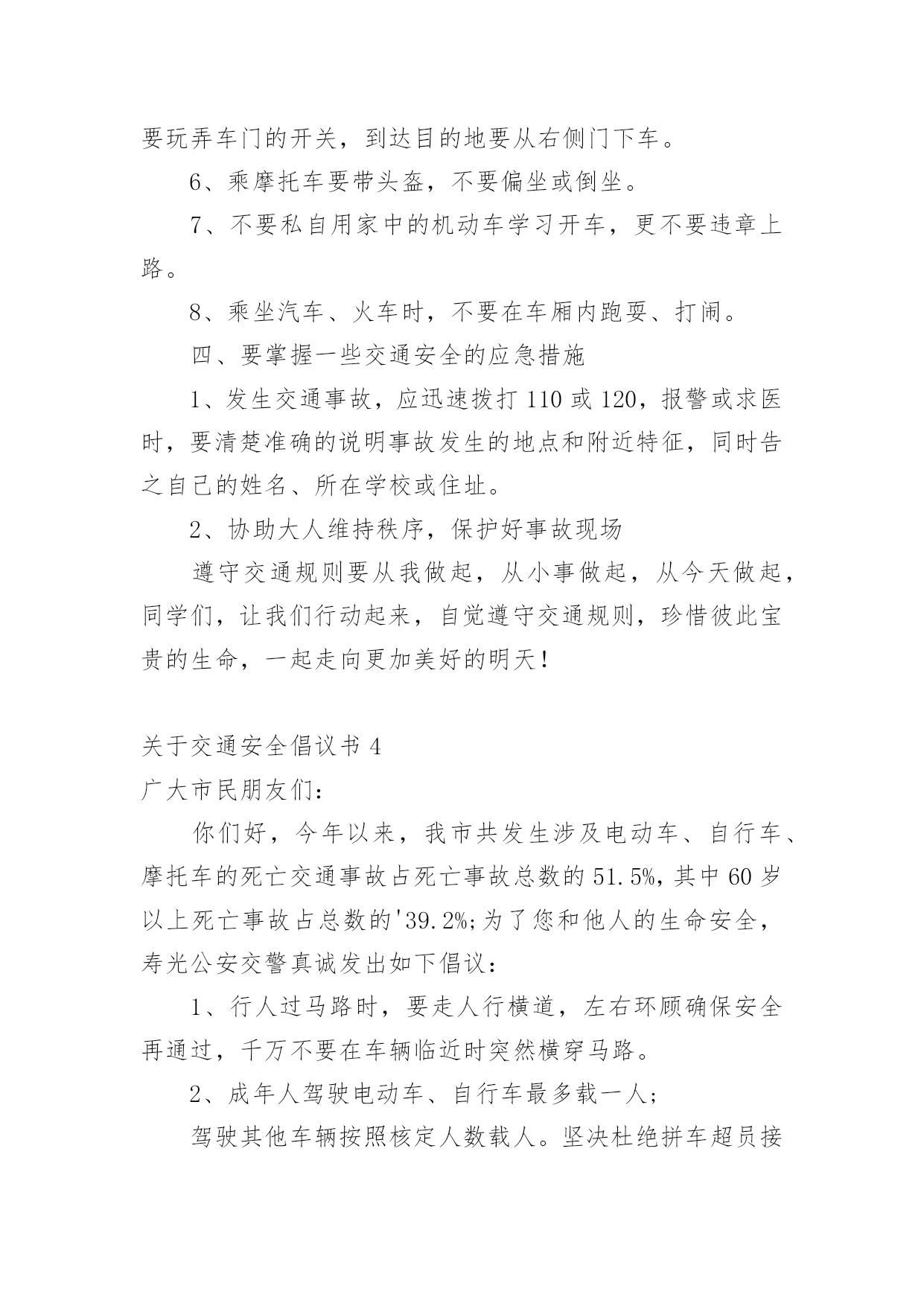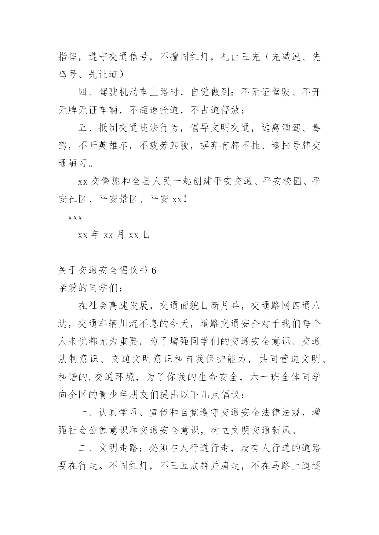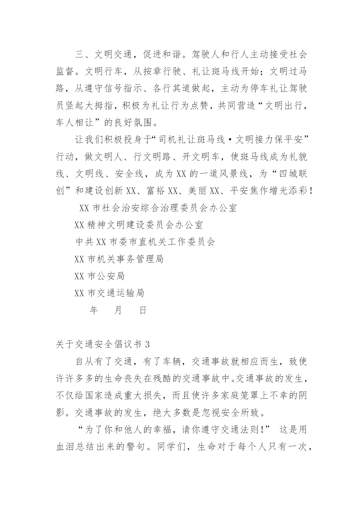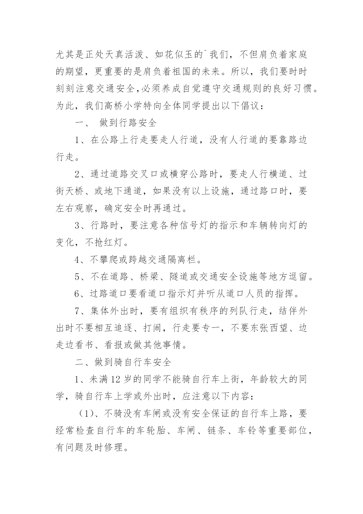 交通安全倡议书关于交通安全倡议书汇编15篇在现在社会,很多地方都会使用到倡议书,倡议书一般由标题、称呼、正文、结尾、落款五部分组成。那要怎么写好倡议书呢?以下是小编为大家收集的关于交通安全倡议书,仅供参考,希望能够帮助到大家。关于交通安全倡议书1驾驶员朋友们:一年一度的高考已来临。寒窗苦读多年的莘莘学子将迈出人生至关重要的一步,去绘制未来美好的人生蓝图。高考,牵动着无数的`家庭、牵动着无数人的心,也改变了众多人的人生轨迹,为考生助一臂之力,已经成为社会共同的愿望。然而,高考中一些不文明行为依然存在着,打着送考的旗号,不听从交警指挥、我行我素,造成考点道路拥堵,使考务通勤车辆、送考客车无法进入考点,给交通管理工作和考生应考带来很大不便。为了让考生出行更加畅通,感受来自社会各界的关爱,沙湾县公安局交警大队特此发出倡议——如果您是考生家长:考试当天根据路况安排好出行计划,留出富裕时间,防止路上遇到特殊情况耽误考试;为保证全体考生利益,驾车接送学生的家长请做到“即停即下即走”,听从交警指挥,在指定地点停车;考生家长尽量不要直接把孩子送到考点门口,可以提前让孩子下车步行至考场,以免发生拥堵;一旦遇到意外事件,请第一时间拨打110或求助附近的执勤交警。如果您是社会车辆驾驶人:高考期间,考场附近居民尽量不开车上路,减轻交通压力,如必须驾车出行,请尽量绕开考点行驶;行车过程中要礼让行考务通勤车辆和爱心送考车辆;遇考点周边道路临时限行,要给予理解和配合,服从交警指挥绕行;行驶时不抢道、不乱穿行、不人为制造堵塞,确保道路通畅和行车安全;在各考点周边500米以内限速、禁止鸣笛,不制造噪音,为广大考生营造良好的考试氛围;发扬中华民族传统美德,积极为广大考生提供力所能及的帮助。如果您是爱心送考车辆驾驶人:要礼让考务通勤车辆、送考客车;听从交警指挥,做到即停即走,不要长时间滞留在考点门口。xxxxx年xx月xx日关于交通安全倡议书2广大驾驶员朋友、市民朋友们:当前,我市上下正全力以赴创建全国文明城市提名城市、国家卫生城市、国家全域旅游示范市、国家水生态文明城市。为助力“四城联创”“让群众更满意”,全市政法综治系统率先在公交营运车辆、公务车辆、公职人员私家车范围启动礼让斑马线行动,逐步引导规范广大车主增强礼让斑马线意识。开展“司机礼让斑马线·文明接力保平安”活动,为树立我市文明形象、打造平安和谐软环境、提高城市综合竞争力有着十分重要的意义。作为焦作人,尤其是党政机关企事业单位的党员、干部、职工,我们更要坚决响应市委、市政府关于创建全国文明城市提名城市、“让群众更满意”的号召,理应成为文明交通的'实践者、参与者、支持者。为此,特发出如下倡议:一、文明驾车,礼让行人。车辆在行经斑马线路段时,主动减速行驶,不争道抢行;遇行人正在通过斑马线时,主动停车让行。要严格执行“三个必须”:必须提前减速,作好礼让准备;当有行人通过斑马线时,必须停车让行;当无行人通过斑马线时,必须低速通过。二、文明出行,遵章守法。行人通过路口或者横过道路,应当走斑马线,遵守交通信号灯指示,不跨越护栏;通过无交通信号灯斑马线时,要注意观察两边来车,确认机动车停车礼让时,应当快速通过,不在马路上追逐嬉戏、打闹、玩手机,主动营造“路畅人和”的出行环境。三、文明交通,促进和谐。驾驶人和行人主动接受社会监督。文明行车,从按章行驶、礼让斑马线开始;文明过马路,从遵守信号指示、各行其道做起,主动为停车礼让驾驶员竖起大拇指,积极为礼让行为点赞,共同营造“文明出行,车人相让”的良好氛围。让我们积极投身于“司机礼让斑马线·文明接力保平安”行动,做文明人、行文明路、开文明车,使斑马线成为礼貌线、文明线、安全线,成为XX的一道风景线,为“四城联创”和建设创新XX、富裕XX、美丽XX、平安焦作增光添彩!XX市社会治安综合治理委员会办公室XX精神文明建设委员会办公室中共XX市委市直机关工作委员会XX市机关事务管理局XX市公安局XX市交通运输局年月日关于交通安全倡议书3自从有了交通,有了车辆,交通事故就相应而生,致使许许多多的生命丧失在残酷的交通事故中。交通事故的发生,不仅给国家造成重大损失,而且使许多家庭笼罩上不幸的阴影。交通事故的发生,绝大多数是忽视安全所致。“为了你和他人的幸福,请你遵守交通法则!”这是用血泪总结出来的警句。同学们,生命对于每个人只有一次,尤其是正处天真活泼、如花似玉的`我们,不但肩负着家庭的期望,更重要的是肩负着祖国的未来。所以,我们要时时刻刻注意交通安全,必须养成自觉遵守交通规则的良好习惯。为此,我们高桥小学特向全体同学提出以下倡议:一、做到行路安全1、在公路上行走要走人行道,没有人行道的要靠路边行走。2、通过道路交叉口或横穿公路时,要走人行横道、过街天桥、或地下通道,如果没有以上设施,通过