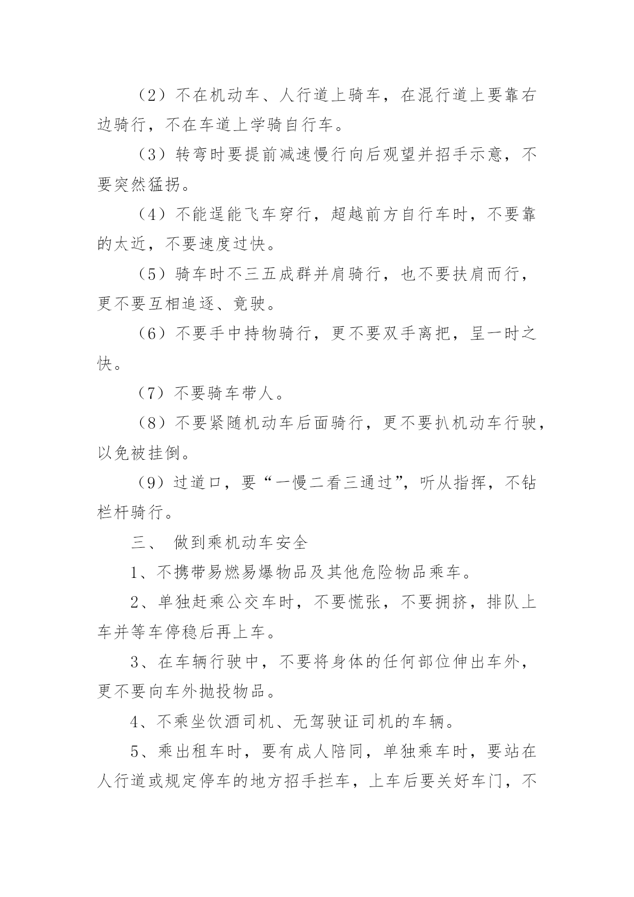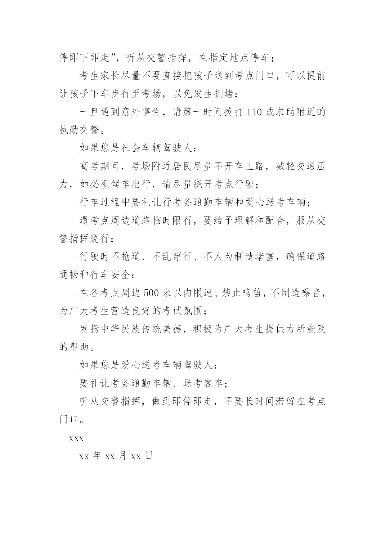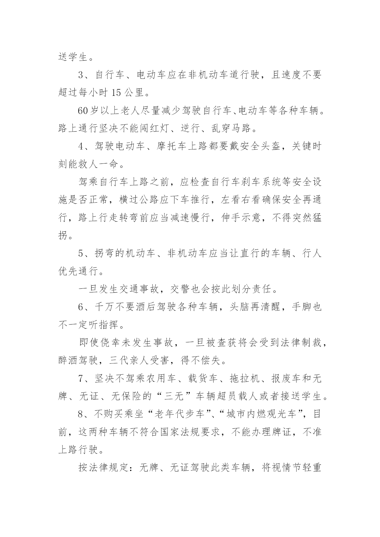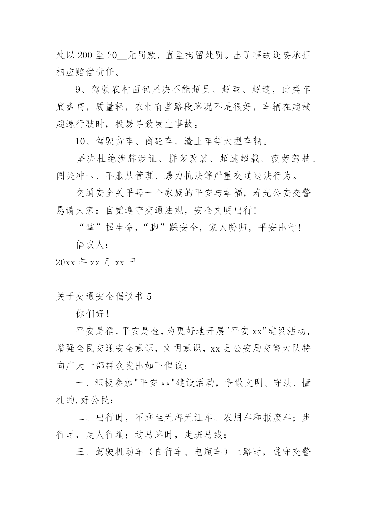交通安全倡议书关于交通安全倡议书汇编15篇在现在社会,很多地方都会使用到倡议书,倡议书一般由标题、称呼、正文、结尾、落款五部分组成。那要怎么写好倡议书呢?以下是小编为大家收集的关于交通安全倡议书,仅供参考,希望能够帮助到大家。关于交通安全倡议书1驾驶员朋友们:一年一度的高考已来临。寒窗苦读多年的莘莘学子将迈出人生至关重要的一步,去绘制未来美好的人生蓝图。高考,牵动着无数的`家庭、牵动着无数人的心,也改变了众多人的人生轨迹,为考生助一臂之力,已经成为社会共同的愿望。然而,高考中一些不文明行为依然存在着,打着送考的旗号,不听从交警指挥、我行我素,造成考点道路拥堵,使考务通勤车辆、送考客车无法进入考点,给交通管理工作和考生应考带来很大不便。为了让考生出行更加畅通,感受来自社会各界的关爱,沙湾县公安局交警大队特此发出倡议——如果您是考生家长:考试当天根据路况安排好出行计划,留出富裕时间,防止路上遇到特殊情况耽误考试;为保证全体考生利益,驾车接送学生的家长请做到“即停即下即走”,听从交警指挥,在指定地点停车;考生家长尽量不要直接把孩子送到考点门口,可以提前让孩子下车步行至考场,以免发生拥堵;一旦遇到意外事件,请第一时间拨打110或求助附近的执勤交警。如果您是社会车辆驾驶人:高考期间,考场附近居民尽量不开车上路,减轻交通压力,如必须驾车出行,请尽量绕开考点行驶;行车过程中要礼让行考务通勤车辆和爱心送考车辆;遇考点周边道路临时限行,要给予理解和配合,服从交警指挥绕行;行驶时不抢道、不乱穿行、不人为制造堵塞,确保道路通畅和行车安全;在各考点周边500米以内限速、禁止鸣笛,不制造噪音,为广大考生营造良好的考试氛围;发扬中华民族传统美德,积极为广大考生提供力所能及的帮助。如果您是爱心送考车辆驾驶人:要礼让考务通勤车辆、送考客车;听从交警指挥,做到即停即走,不要长时间滞留在考点门口。xxxxx年xx月xx日关于交通安全倡议书2广大驾驶员朋友、市民朋友们:当前,我市上下正全力以赴创建全国文明城市提名城市、国家卫生城市、国家全域旅游示范市、国家水生态文明城市。为助力“四城联创”“让群众更满意”,全市政法综治系统率先在公交营运车辆、公务车辆、公职人员私家车范围启动礼让斑马线行动,逐步引导规范广大车主增强礼让斑马线意识。开展“司机礼让斑马线·文明接力保平安”活动,为树立我市文明形象、打造平安和谐软环境、提高城市综合竞争力有着十分重要的意义。作为焦作人,尤其是党政机关企事业单位的党员、干部、职工,我们更要坚决响应市委、市政府关于创建全国文明城市提名城市、“让群众更满意”的号召,理应成为文明交通的'实践者、参与者、支持者。为此,特发出如下倡议:一、文明驾车,礼让行人。车辆在行经斑马线路段时,主动减速行驶,不争道抢行;遇行人正在通过斑马线时,主动停车让行。要严格执行“三个必须”:必须提前减速,作好礼让准备;当有行人通过斑马线时,必须停车让行;当无行人通过斑马线时,必须低速通过。二、文明出行,遵章守法。行人通过路口或者横过道路,应当走斑马线,遵守交通信号灯指示,不跨越护栏;通过无交通信号灯斑马线时,要注意观察两边来车,确认机动车停车礼让时,应当快速通过,不在马路上追逐嬉戏、打闹、玩手机,主动营造“路畅人和”的出行环境。三、文明交通,促进和谐。驾驶人和行人主动接受社会监督。文明行车,从按章行驶、礼让斑马线开始;文明过马路,从遵守信号指示、各行其道做起,主动为停车礼让驾驶员竖起大拇指,积极为礼让行为点赞,共同营造“文明出行,车人相让”的良好氛围。让我们积极投身于“司机礼让斑马线·文明接力保平安”行动,做文明人、行文明路、开文明车,使斑马线成为礼貌线、文明线、安全线,成为XX的一道风景线,为“四城联创”和建设创新XX、富裕XX、美丽XX、平安焦作增光添彩!XX市社会治安综合治理委员会办公室XX精神文明建设委员会办公室中共XX市委市直机关工作委员会XX市机关事务管理局XX市公安局XX市交通运输局年月日关于交通安全倡议书3自从有了交通,有了车辆,交通事故就相应而生,致使许许多多的生命丧失在残酷的交通事故中。交通事故的发生,不仅给国家造成重大损失,而且使许多家庭笼罩上不幸的阴影。交通事故的发生,绝大多数是忽视安全所致。“为了你和他人的幸福,请你遵守交通法则!”这是用血泪总结出来的警句。同学们,生命对于每个人只有一次,尤其是正处天真活泼、如花似玉的`我们,不但肩负着家庭的期望,更重要的是肩负着祖国的未来。所以,我们要时时刻刻注意交通安全,必须养成自觉遵守交通规则的良好习惯。为此,我们高桥小学特向全体同学提出以下倡议:一、做到行路安全1、在公路上行走要走人行道,没有人行道的要靠路边行走。2、通过道路交叉口或横穿公路时,要走人行横道、过街天桥、或地下通道,如果没有以上设施,通过