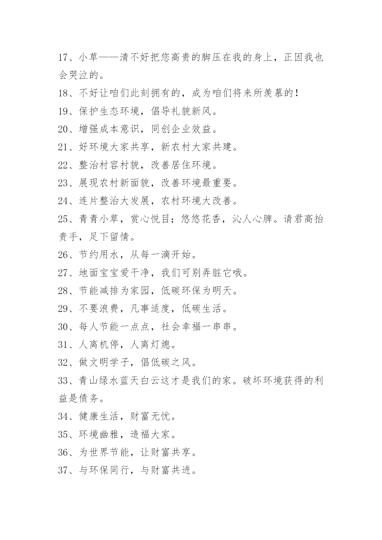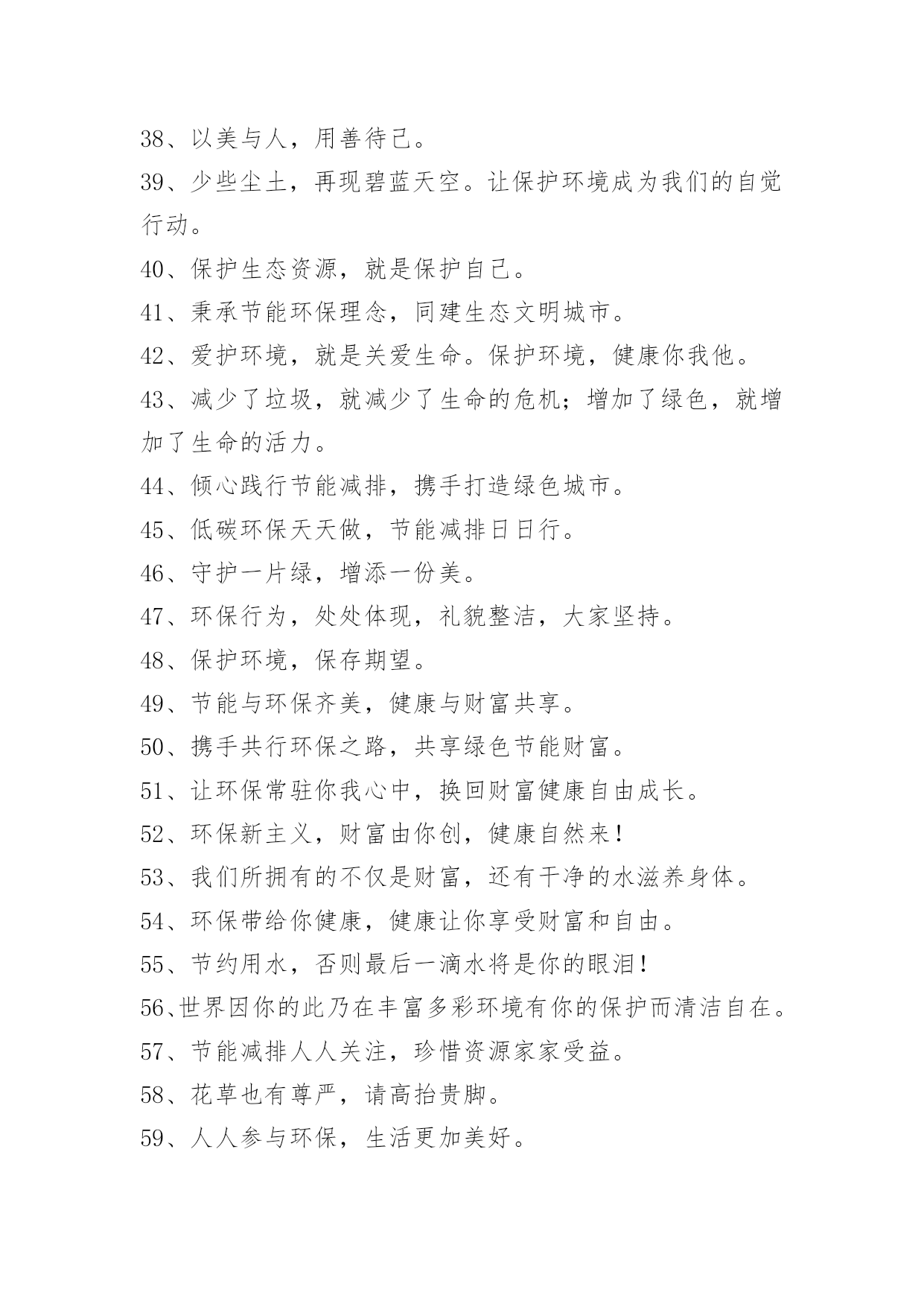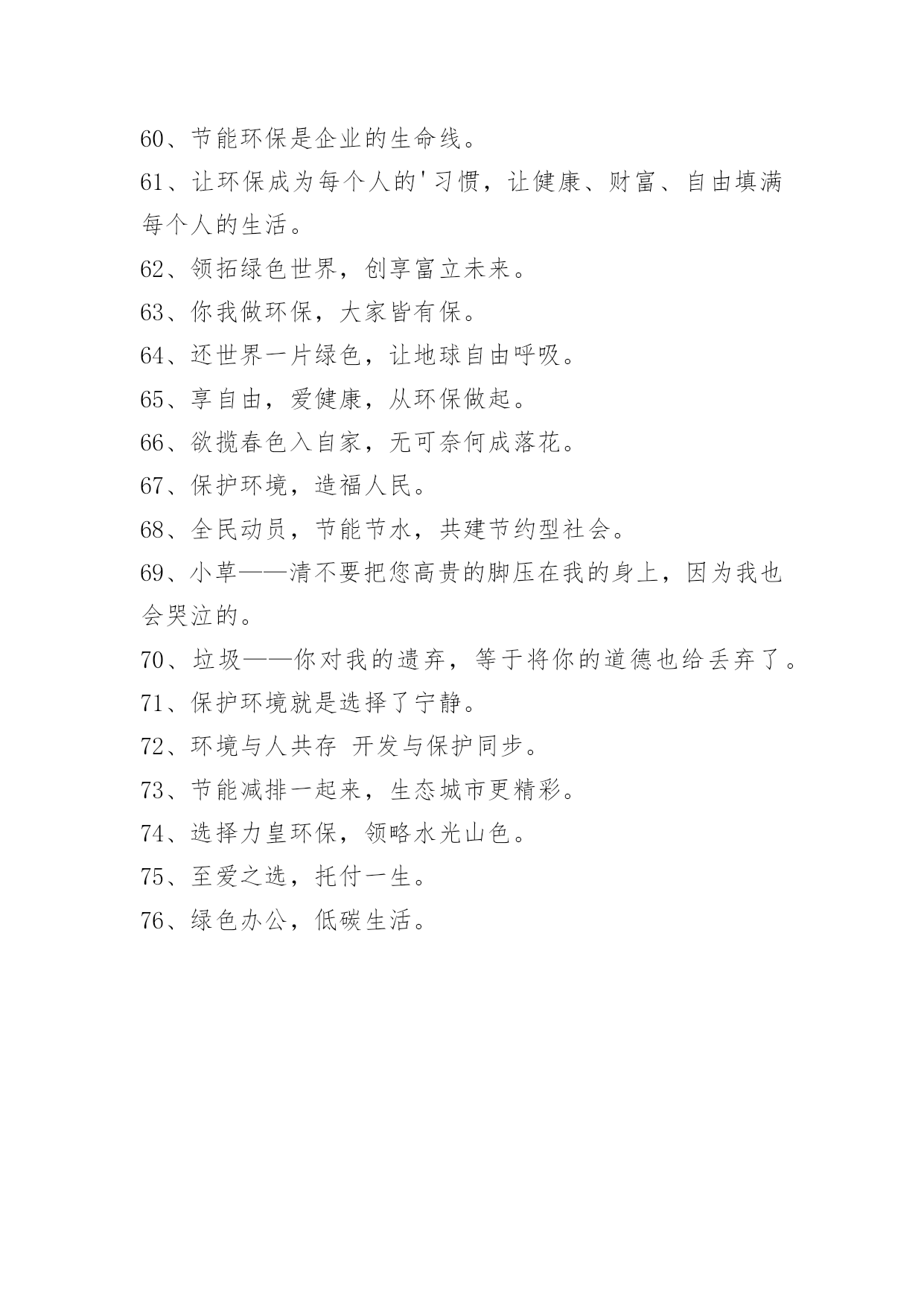 有个性的环保口号有个性的环保口号汇总76句关掉显示器比任何屏幕保护都省电。以下是小编搜索整理的有个性的环保口号76句,欢迎阅读,希望大家能够喜欢。1、杞人忧天,我忧地!——地球是我们唯一的家,像爱护生命一样爱护她。2、种一棵树,就像给校园一份礼物。3、这个世界真美好,到处都是树和草。保护环境很重要,我们大家要环保。4、好习惯要从小养成,好传统应自始至终。5、心随环境而变,为你打造心的空间。6、天更蓝、草更绿、花更艳。7、用我奔放情,饰你智慧心。8、你栽一棵树,我栽一棵树,我们共同为校园添绿。9、人类离不开花草,就像婴儿离不开母亲的怀抱。10、保护生态环境,共建美好遂昌。11、小草有生命,请君足留情。12、提高环境保护意识,爱护咱们共有家园。13、追求低碳生活,拥抱绿色时尚。14、你节能,我减排,秦岭母亲笑开怀。15、节能低碳大舞台,企业有你更精彩。16、用咱们的小手放飞绿色的期望。17、小草——清不好把您高贵的脚压在我的身上,正因我也会哭泣的。18、不好让咱们此刻拥有的,成为咱们将来所羡慕的!19、保护生态环境,倡导礼貌新风。20、增强成本意识,同创企业效益。21、好环境大家共享,新农村大家共建。22、整治村容村貌,改善居住环境。23、展现农村新面貌,改善环境最重要。24、连片整治大发展,农村环境大改善。25、青青小草,赏心悦目;悠悠花香,沁人心脾。请君高抬贵手,足下留情。26、节约用水,从每一滴开始。27、地面宝宝爱干净,我们可别弄脏它哦。28、节能减排为家园,低碳环保为明天。29、不要浪费,凡事适度,低碳生活。30、每人节能一点点,社会幸福一串串。31、人离机停,人离灯熄。32、做文明学子,倡低碳之风。33、青山绿水蓝天白云这才是我们的家。破坏环境获得的利益是债务。34、健康生活,财富无忧。35、环境幽雅,造福大家。36、为世界节能,让财富共享。37、与环保同行,与财富共进。38、以美与人,用善待己。39、少些尘土,再现碧蓝天空。让保护环境成为我们的自觉行动。40、保护生态资源,就是保护自己。41、秉承节能环保理念,同建生态文明城市。42、爱护环境,就是关爱生命。保护环境,健康你我他。43、减少了垃圾,就减少了生命的危机;增加了绿色,就增加了生命的活力。44、倾心践行节能减排,携手打造绿色城市。45、低碳环保天天做,节能减排日日行。46、守护一片绿,增添一份美。47、环保行为,处处体现,礼貌整洁,大家坚持。48、保护环境,保存期望。49、节能与环保齐美,健康与财富共享。50、携手共行环保之路,共享绿色节能财富。51、让环保常驻你我心中,换回财富健康自由成长。52、环保新主义,财富由你创,健康自然来!53、我们所拥有的不仅是财富,还有干净的水滋养身体。54、环保带给你健康,健康让你享受财富和自由。55、节约用水,否则最后一滴水将是你的眼泪!56、世界因你的此乃在丰富多彩环境有你的保护而清洁自在。57、节能减排人人关注,珍惜资源家家受益。58、花草也有尊严,请高抬贵脚。59、人人参与环保,生活更加美好。60、节能环保是企业的生命线。61、让环保成为每个人的'习惯,让健康、财富、自由填满每个人的生活。62、领拓绿色世界,创享富立未来。63、你我做环保,大家皆有保。64、还世界一片绿色,让地球自由呼吸。65、享自由,爱健康,从环保做起。66、欲揽春色入自家,无可奈何成落花。67、保护环境,造福人民。68、全民动员,节能节水,共建节约型社会。69、小草——清不要把您高贵的脚压在我的身上,因为我也会哭泣的。70、垃圾——你对我的遗弃,等于将你的道德也给丢弃了。71、保护环境就是选择了宁静。72、环境与人共存开发与保护同步。73、节能减排一起来,生态城市更精彩。74、选择力皇环保,领略水光山色。75、至爱之选,托付一生。76、绿色办公,低碳生活。