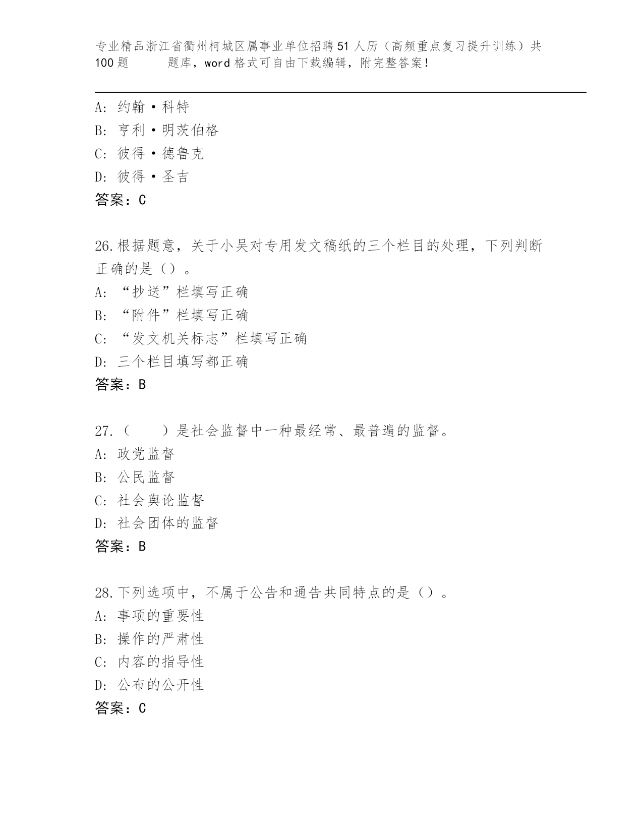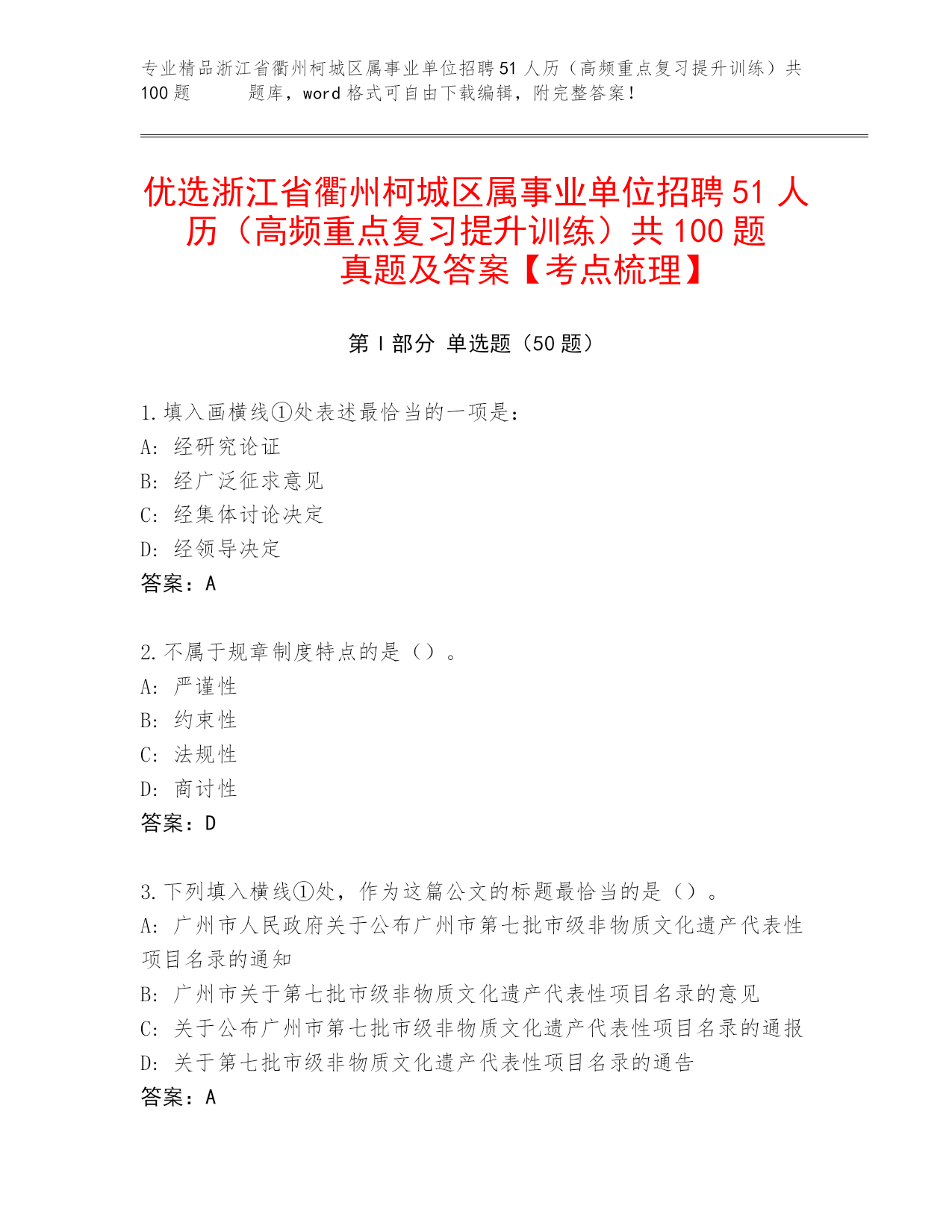 优选浙江省衢州柯城区属事业单位招聘51人历(高频重点复习提升训练)共100题 通用题库(名校卷)