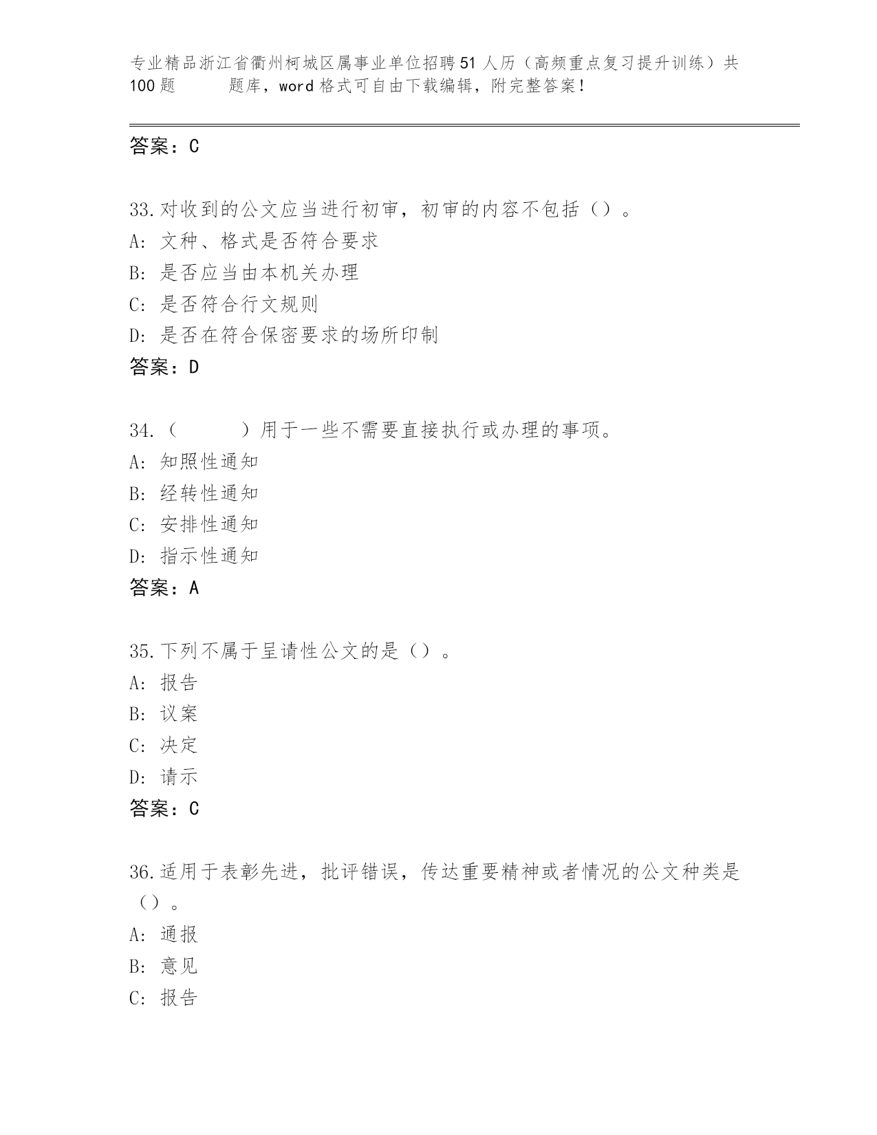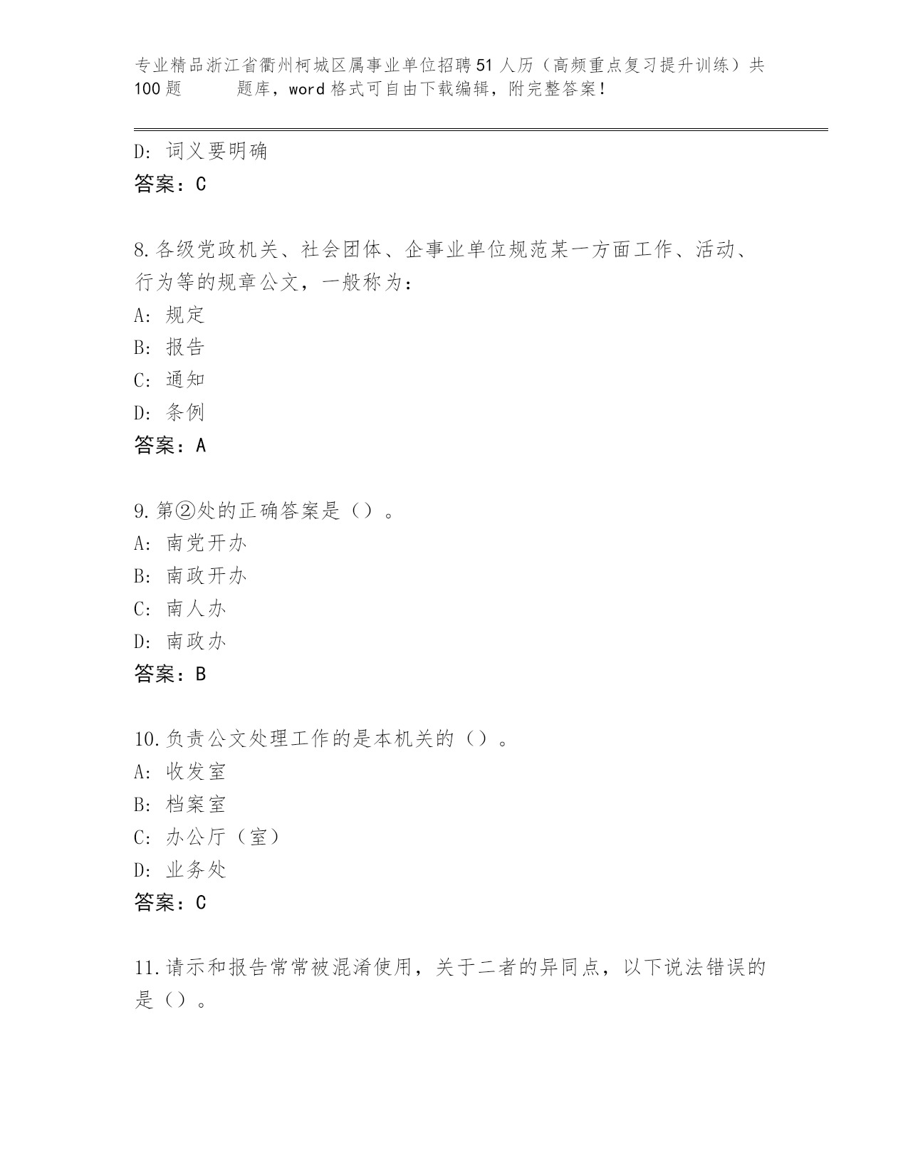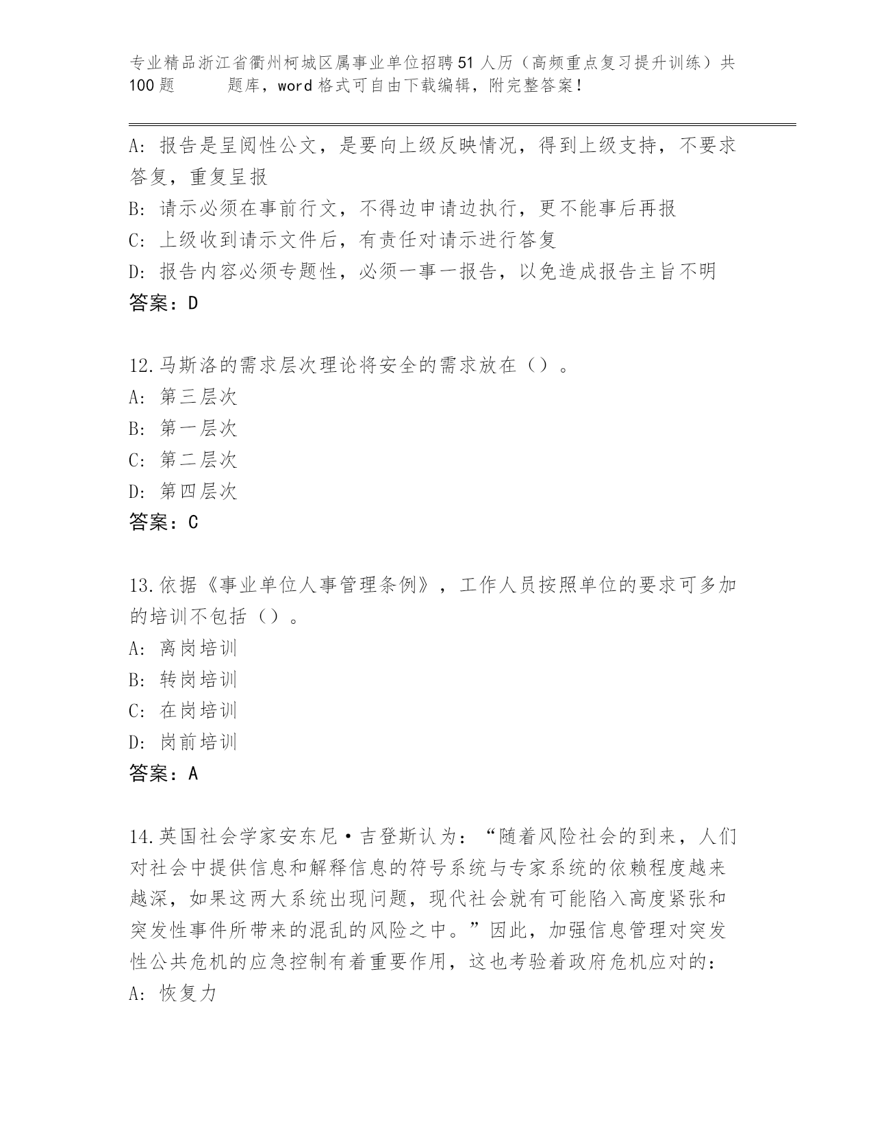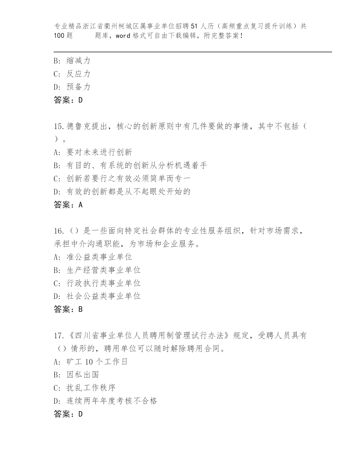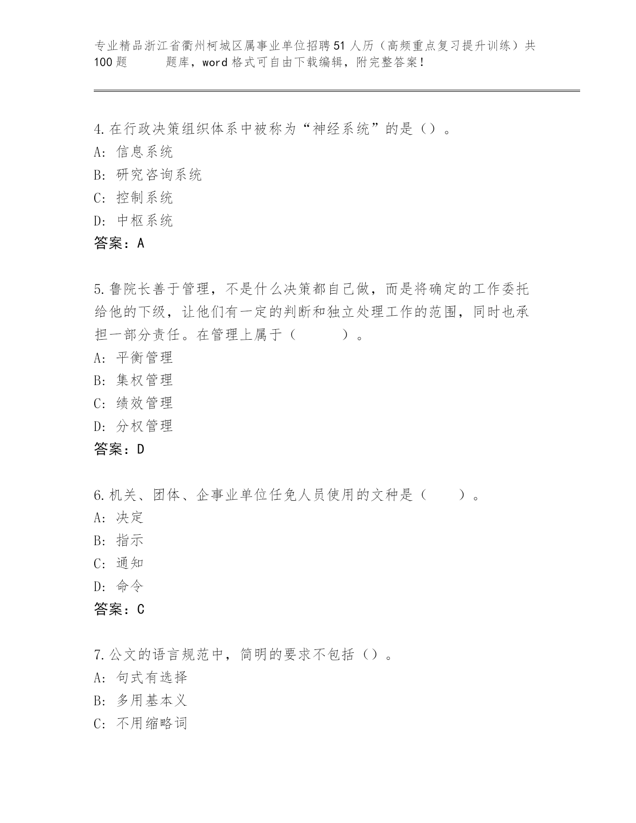 精编浙江省衢州柯城区属事业单位招聘51人历(高频重点复习提升训练)共100题 真题题库及答案免费下载