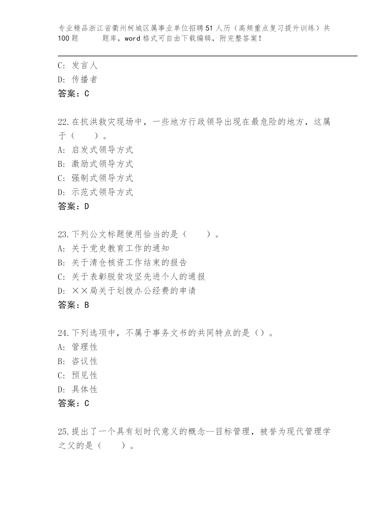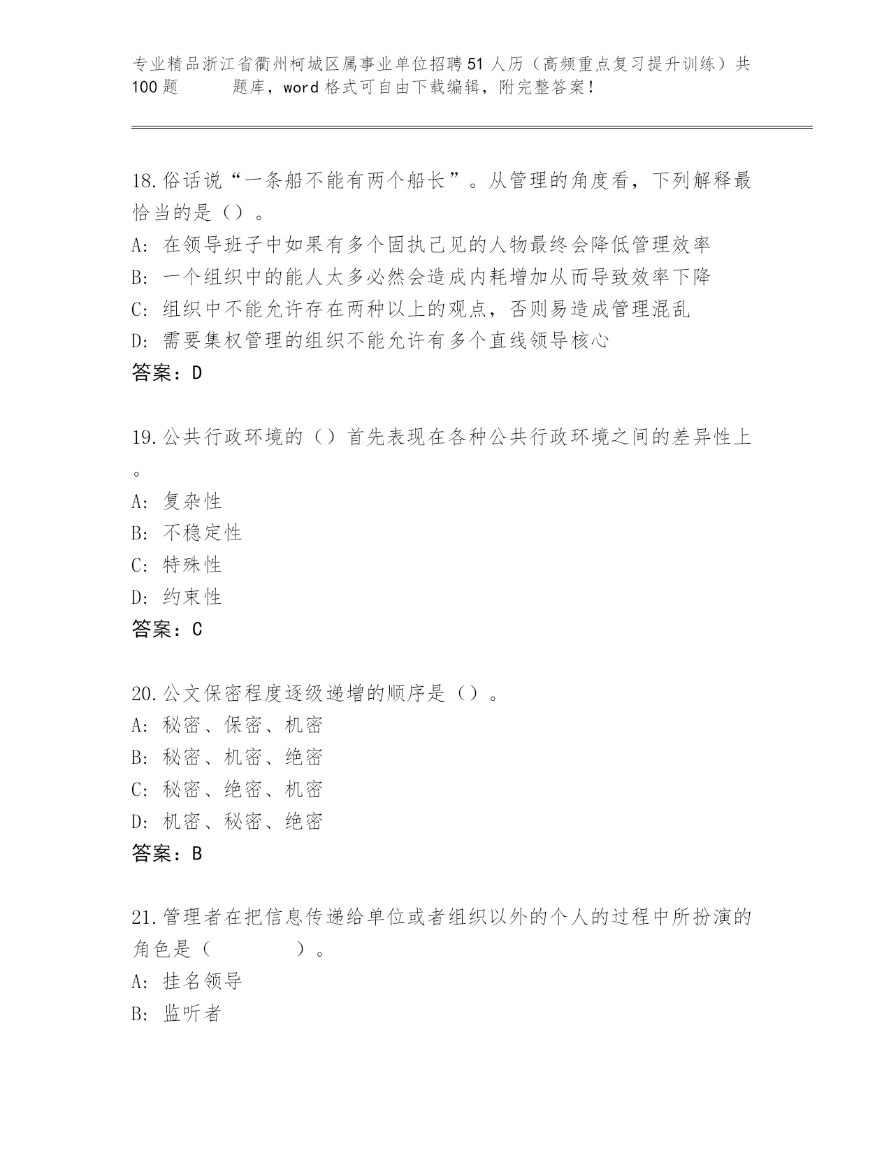 内部培训浙江省衢州柯城区属事业单位招聘51人历(高频重点复习提升训练)共100题 真题题库及答案(夺冠系列)