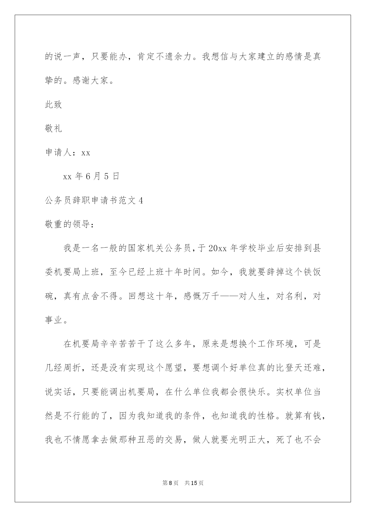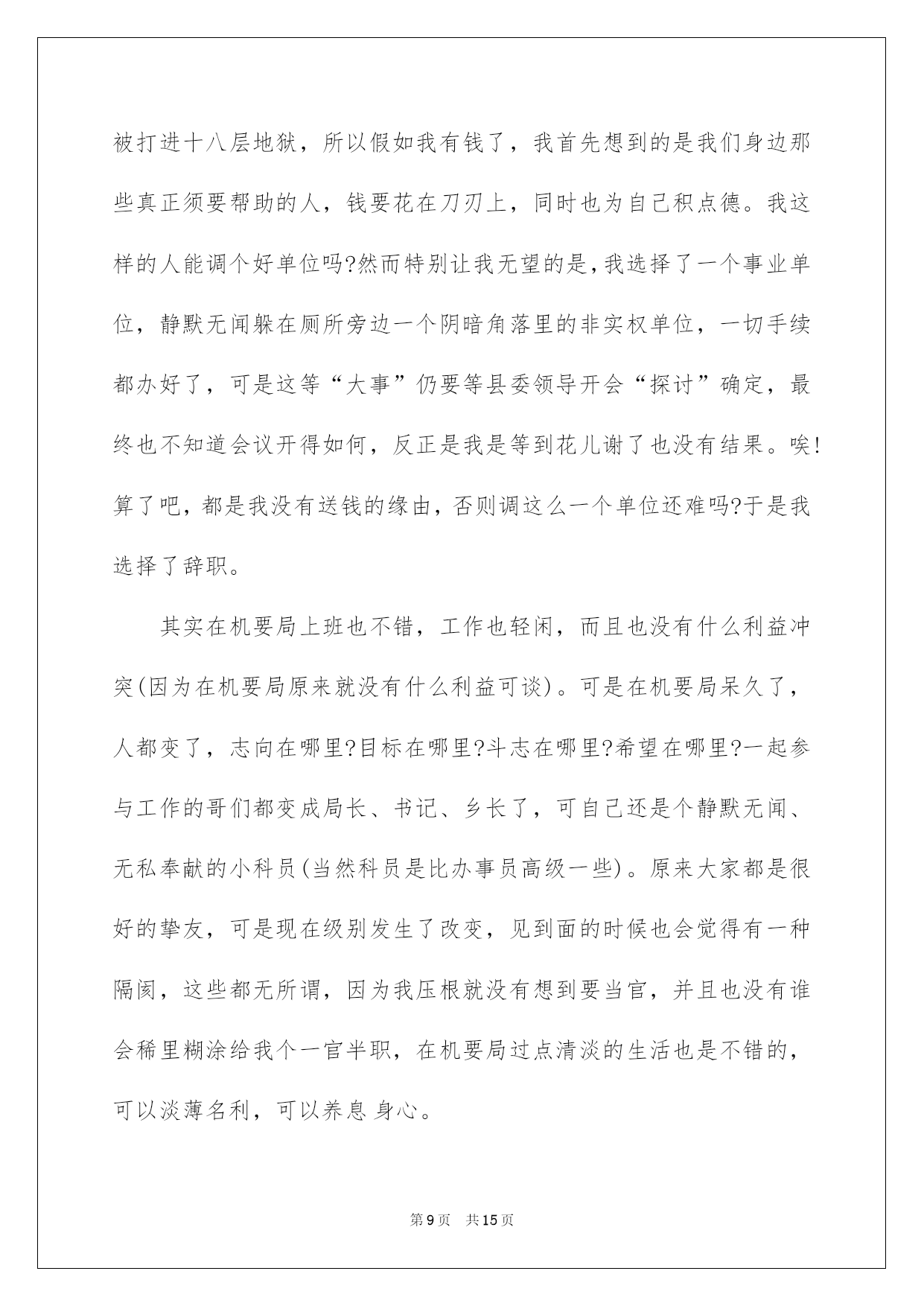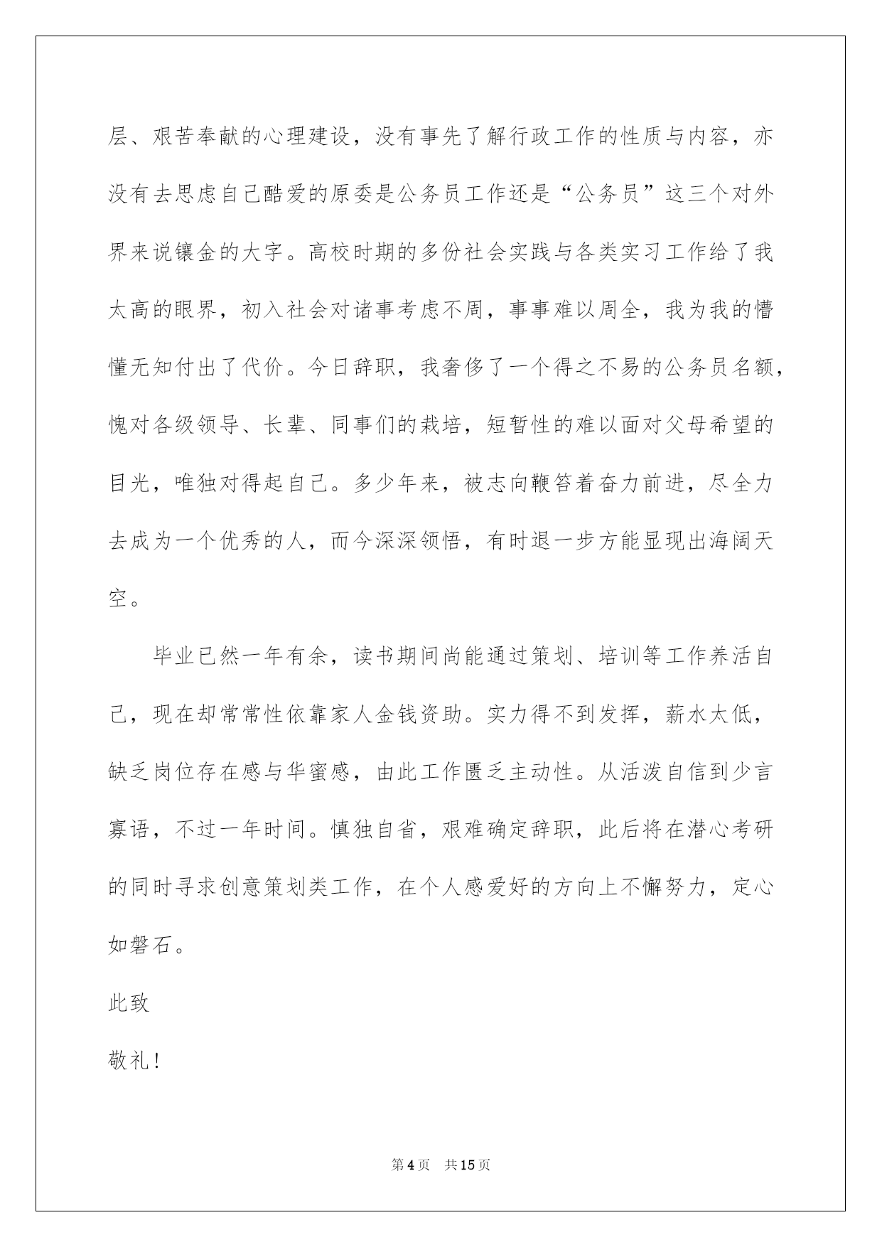 第PAGE\*Arabic\*MERGEFORMAT15页共NUMPAGES\*Arabic\*MERGEFORMAT15页第PAGE\*MERGEFORMAT15页共NUMPAGES\*MERGEFORMAT15页第PAGE\*MERGEFORMAT15页共NUMPAGES\*MERGEFORMAT15页第PAGE\*MERGEFORMAT15页共NUMPAGES\*MERGEFORMAT15页第PAGE\*MERGEFORMAT15页共NUMPAGES\*MERGEFORMAT15页第PAGE\*MERGEFORMAT15页共NUMPAGES\*MERGEFORMAT15页第PAGE\*MERGEFORMAT15页共NUMPAGES\*MERGEFORMAT15页第PAGE\*MERGEFORMAT15页共NUMPAGES\*MERGEFORMAT15页第PAGE\*MERGEFORMAT15页共NUMPAGES\*MERGEFORMAT15页第PAGE\*MERGEFORMAT15页共NUMPAGES\*MERGEFORMAT15页第PAGE\*MERGEFORMAT15页共NUMPAGES\*MERGEFORMAT15页2022公务员辞职申请书公务员辞职申请书范文6篇在人们物质精神需求不断增长的今日,申请书应用范围广泛,通过申请书,我们可以提出自己的恳求。为了让您在写申请书中更加简洁便利,下面是我为大家收集的公务员辞职申请书范文,欢迎阅读,希望大家能够喜爱。公务员辞职申请书范文1敬重的xxx领导:首先,我向各位领导提出辞职的恳求表示深深的歉意。从××年11月份来到市明办工作以来,至今有一年多时间,在这一年多的工作当中,有过面对困难时的彷徨和苦累,也有过胜利后的甘甜,是单位把我从一个还未迈出高校校门、不谙世事的学生培育成为一名综合素养较强的机关工作人员。在文明办工作的一年多来,我得到了各位领导无微不至的关怀和同事的热忱帮助,度过了一段开心、充溢的时间。一年多以来,由于自己所学专业的局限性,我在工作中深深感到自己相关学问的缺乏,虽然工作得到领导的认可和同事的好评,但仍旧感觉自己在工作上始终处于一个比较被动的局面,而作为我本身来讲,做一名优秀的法律人始终是我的幻想,因此,我更希望从事与法律专业相关的工工作。经过一再的思索之后,我确定调整一下自己目前的状态,打算把自己置身于与法律相关的事务性工作中加强专业学习的同时,迎接今年9月份的司法资格考试,以加强专业理论水平和提高实际工作实力,为实现志向奠定一个良好的基础。经过近段时间的考虑并向领导汇报状况之后,我确定辞去现在的工作到法律相关的职位上工作,边上班边复习打算司法资格考试,争取在今年能通过司法考试。在此,我感谢市委宣扬部和市文明办领导曾经供应给我一年多来的学习和成长时期,感谢领导和其他同事带给我欢乐的工作和学习的时间。在各位领导的关切和同事们的指导帮助下,我学会了许多做人、做事的道理,同时我在综合协调和文章写作等方面也有了很大的提高,这将是我一生受用不尽的珍贵财宝,在此我表示诚心的感谢。最终,我为我的辞职给单位带来的诸多不便深感愧疚,并请各位领导谅解我的境况,再一次致谢。辞职人:xx辞职时间:xx年xx月xx日公务员辞职申请书范文2敬重的领导:在不违反法律与道德的前提下,尽可能自由、简洁、纯粹、有意义地生活——这是促使我辞职的最本质因素。仅仅因为女性这一性别,便要背负来自家人、挚友、社会的三重“女孩子理应工作平稳”的有色定性,我不甘心更不欢乐。工作一年,我始终在找寻我在岗位上的存在感,我努力过,却一再找不到方向;我妥协过,内心深处却始终喧嚣;我抗争过,与母亲的争吵在这一年时间内几乎是我生活的主旋律,她不认可我的追求,认为那无谓、无趣且不顾虑将来,我不屑她的安定,我满心想要去更繁华的去处去接触更宽广的世界。世界这么大,人生如此短,我不情愿在最美妙的青春时代日复一日地枯坐办公室,倒水、换显示屏、间或打印复印——我努力读书那么些年肯定不是为了享受这般的“安逸”。不是全部的意外都令人惊喜。参与公务员考试是因为同流合污,但被录用上岗之时我也曾高兴且充溢期盼。然而,我没有做好扎根基层、艰苦奉献的心理建设,没有事先了解行政工作的性质与内容,亦没有去思虑自己酷爱的原委是公务员工作还是“公务员”这三个对外界来说镶金的大字。高校时期的多份社会实践与各类实习工作给了我太高的眼界,初入社会对诸事考虑不周,事事难以周全,我为我的懵懂无知付出了代价。今日辞职,我奢侈了一个得之不易的公务员名额,愧对各级领导、长辈、同事们的栽培,短暂性的难以面对父母希