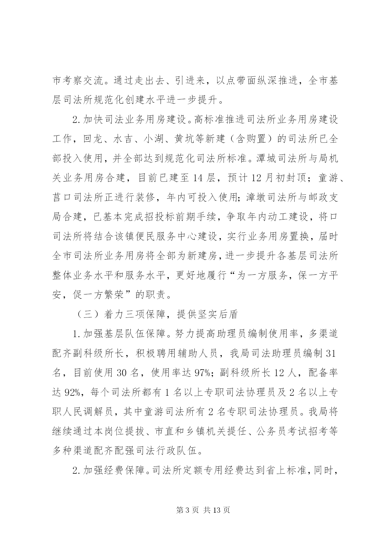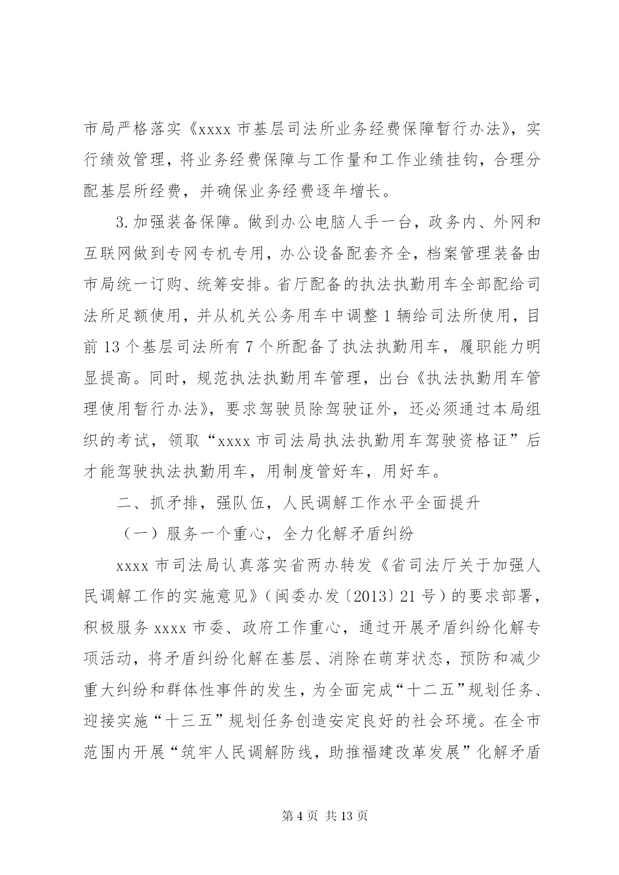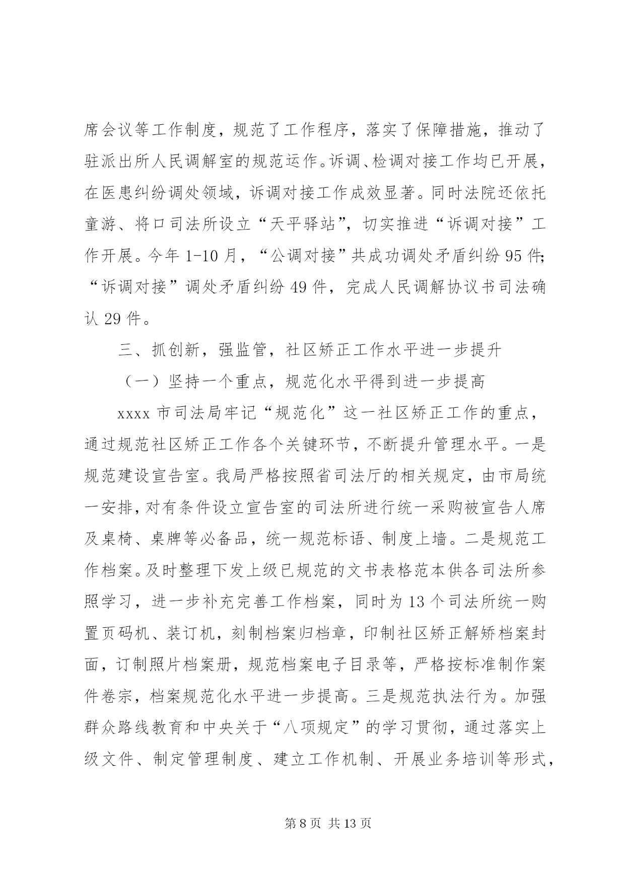 第PAGE\*Arabic\*MERGEFORMAT13页共NUMPAGES\*MERGEFORMAT13页司法局综治工作总结xxxx年来,在xxxx市委、市政府的正确领导下和省司法厅、XX市司法局的关心指导下,xxxx市司法局坚持以党的十八大和十八届三中全会精神为指导,深入开展党的群众路线教育实践活动,进一步开展“法律服务到一线,司法行政促发展”主题实践活动,围绕“基层基础,务实落实,创新创优”的目标要求,以服务武夷XX县区建设和xxxx科学发展、跨越发展为核心,夯实基础、服务大局、保障民生,充分发挥司法行政职能,各项工作都取得了明显成效。现将一年来综治工作情况汇报如下:一、抓规范,强保障,基层基础工作进一步夯实(一)围绕一个中心,全面开展司法行政工作xxxx市司法局整合法律服务资源,突出工作特色,不断推动司法行政工作服务武夷XX县区建设和xxxx经济社会和谐发展,提升人民群众对司法行政工作的认可度和满意度,提升我市司法行政工作服务市委、市政府中心工作的水平。一是在人手不足的情况下,我局坚决服从市委、政府安排,局机关抽调局长和两名副局长、基层司法所抽调两名所长,共计5名精干人员到武夷XX县区和市重点项目开展工作;二是积极配合武夷XX县区开展打击“两违”工作,参与打击“两违”行动共12人次,并安排公证处工作人员进行违章建筑拆除前的证据保全公证,确保打击“两违”工作法律服务到位;三是积极参与市委、政府“大接访”和“矛盾纠纷大调解”活动,安排3名律师和6位司法所长担任市政府专任信访评议员,指派律师和法律服务工作者参与接访、化解纠纷,全力支持信访维稳工作;四是组建征地拆迁法律服务组主动服务征迁工作。成立以局长为组长,分管领导任副组长,精干律师等为成员的征地拆迁法律服务组,排班进驻童游新村万达项目征迁现场,为XX县区建设提供法制宣传、矛盾纠纷调处和法律服务。自3月27日服务组成立以来,共解答拆迁法律咨询870余人次,调解矛盾纠纷92件,做到让群众带着疑惑而来,带着满意而归。其中一宗苏某福母子叔伯兄妹间当事主体25户、近百人的遗产分配与赡养纠纷,关系复杂、人数众多、涉及面广,法律服务组及时抽调优秀的调解员、律师和法律工作者,不分节假日连续“作战”,成功将案件调解,有效的维护了当事人利益,为征迁工作扫除了障碍,得到了相关领导的赞赏。(二)加快两个建设,夯实基层工作基础1.全面推进规范化司法所建设。严格按照省厅“六化”标准,进一步精心部署司法所规范化建设工作。2月19日,组织部分基层所长、助理员到XX县区司法局参观学习,在小湖、水吉和回龙三个司法所开展试点,推进全市基层司法所规范化创建活动。4月18日,xxxx市召开全市司法所规范化建设现场会,4月29日,XX市司法局在我市召开司法所规范化建设暨社区矫正工作现场推进会,5月,邵武、建瓯、武夷山、浦城等县市组队到我市考察交流。通过走出去、引进来,以点带面纵深推进,全市基层司法所规范化创建水平进一步提升。2.加快司法业务用房建设。高标准推进司法所业务用房建设工作,回龙、水吉、小湖、黄坑等新建(含购置)的司法所已全部投入使用,并全部达到规范化司法所标准。潭城司法所与局机关业务用房合建,目前已建至14层,预计12月初封顶;童游、莒口司法所正进行装修,年内可投入使用;漳墩司法所与邮政支局合建,已基本完成招投标前期手续,争取年内动工建设,将口司法所将结合该镇便民服务中心建设,实行业务用房置换,届时全市司法所业务用房将全部为新建房,进一步提升各基层司法所整体业务水平和服务水平,更好地履行“为一方服务,保一方平安,促一方繁荣”的职责。(三)着力三项保障,提供坚实后盾1.加强基层队伍保障。努力提高助理员编制使用率,多渠道配齐副科级所长,积极聘用辅助人员,我局司法助理员编制31名,目前使用30名,使用率达97%;副科级所长12人,配备率达92%,每个司法所都有1名以上专职司法协理员及2名以上专职人民调解员,其中童游司法所有2名专职司法协理员。我局将继续通过本岗位提拔、市直和乡镇机关提任、公务员考试招考等多种渠道配齐配强司法行政队伍。2.加强经费保障。司法所定额专用经费达到省上标准,同时,市局严格落实《xxxx市基层司法所业务经费保障暂行办法》,实行绩效管理,将业务经费保障与工作量和工作业绩挂钩,合理分配基层所经费,并确保业务经费逐年增长。3.加强装备保障。做到办公电脑人手一台,政务内、外网和互联网做到专网专机专用,办公设备配套齐全,档案管理装备由市局统一订购、统筹安排。省厅配备的执法执勤用车全部配给司法所足额使用,并从机关公务用车中调整1辆给司法所使用,目前13个基层司法所有7个所配备了执法执勤用车,履职能力明显提高。同时,规范执法执勤用车管理,出台《执法执勤用车管理使用暂行办法》,要