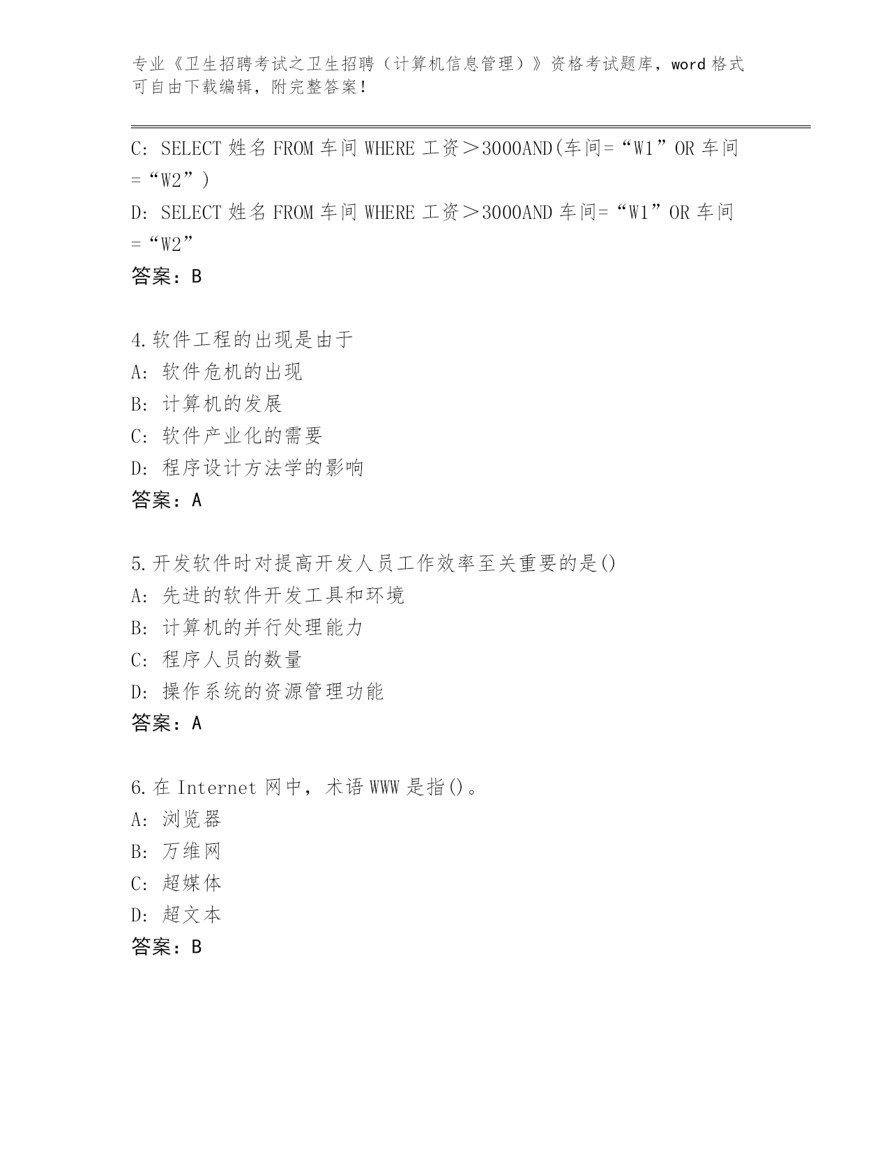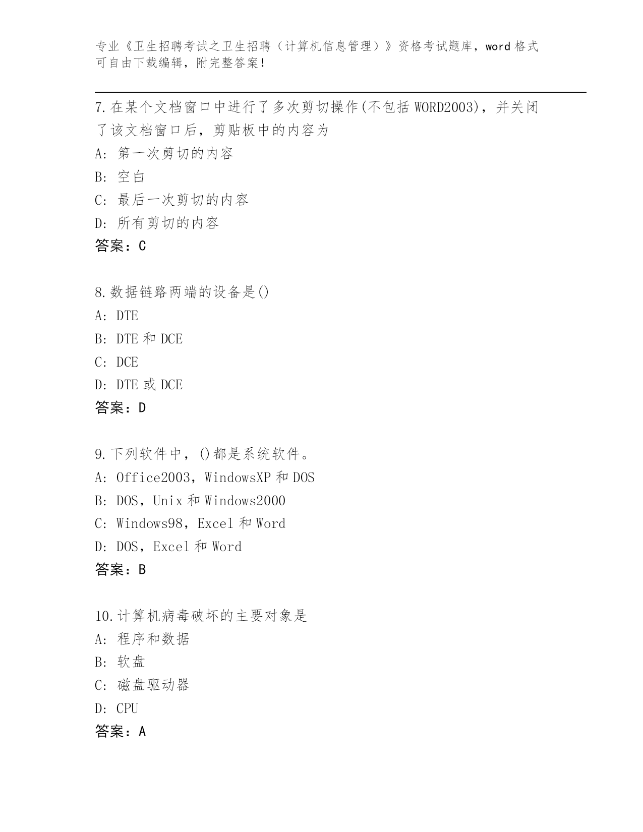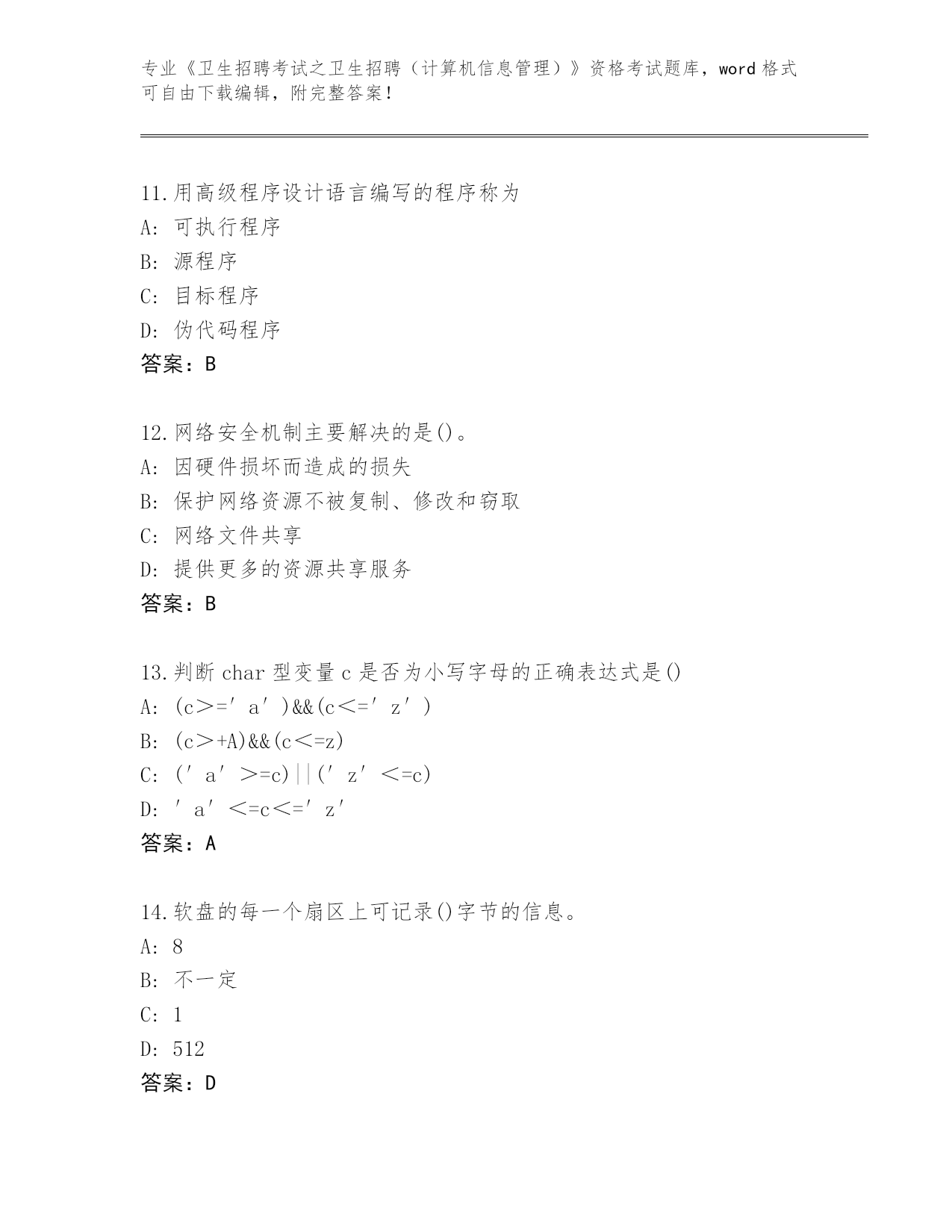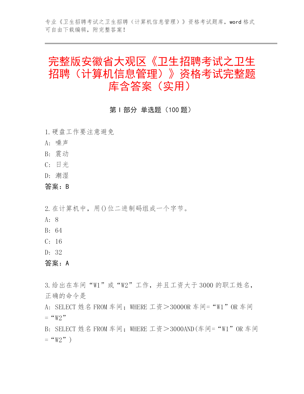 2024年安徽省大观区《卫生招聘考试之卫生招聘(计算机信息管理)》资格考试王牌题库含答案下载