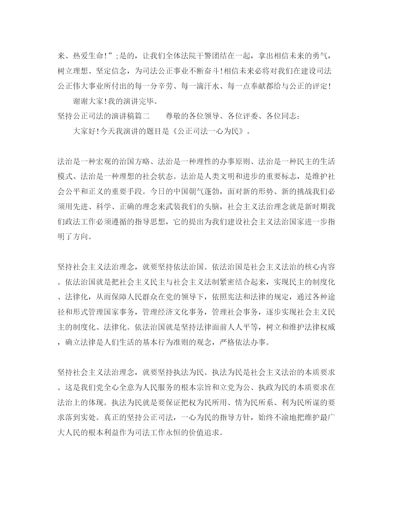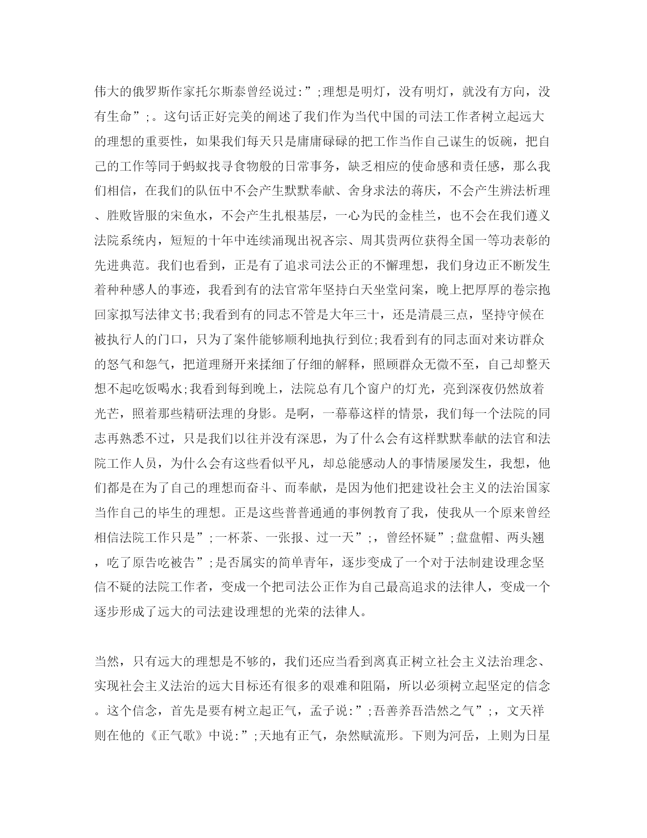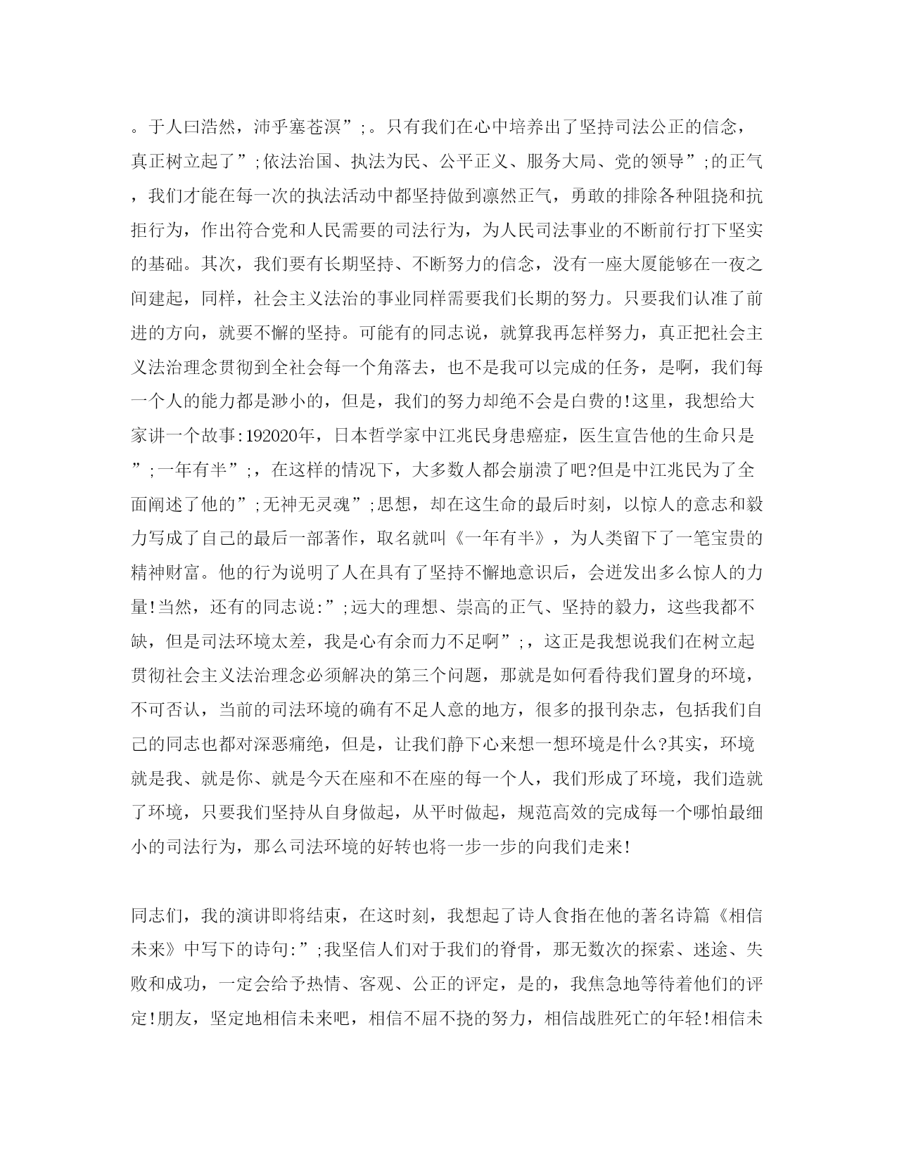 此资料由网络收集而来,如有侵权请告知上传者立即删除。资料共分享,我们负责传递知识。坚持公正司法的演讲稿演讲稿是演讲者为演讲活动撰写的文稿,其质量的高低直接影响着演讲的成败。下面是小编为你整理的几篇坚持公正司法的演讲稿,希望能帮到你哟。坚持公正司法的演讲稿篇一各位领导、各位同志:今天我演讲的题目是”;树立理想、坚定信念,为司法公正事业不断奋斗!”;今天在这里向大家演讲,我心中有很多感慨,就在短短的一年前,我还只是一名在社会上为了自己的前途努力奋斗的青年,而今天,我已经作为一名光荣的法院干警,胸前佩戴着光荣的天平标志,同大家一起探讨树立司法理念、维护司法公正这些宏大的命题,前后对比,感觉时间仿佛就像河流,我们每个人都在这不断流逝的河流中寻求符合我们自身的位置和立场,同时,我们每个人也应该不断的自觉寻求适合自己的位置和立场。经过在法院一年来的学习和实践,今天,我可以自豪的说,我已经找到了自己的位置和立场,那就是:”;时刻牢记自己是社会主义国家宪法和法律的执行者和实践者,牢固树立起社会主义的司法理念,不断完善自身的修养,为追求实现最大的公平正义而奋斗终身!”;。今年以来,全国政法系统都在开展”;树立社会主义法治理念”;教育活动,”;理念”;一词,其实是一个哲学名词,指在理性领域内的观念,简单的说,就是从实践中产生的超越了经验而形成的概念。从我自己的角度,我更加相信,社会主义法治理念就是我们每一个社会主义国家的执法者在执法活动中应当秉持的理想和信念,这个理想和信念,也就是党中央和中央政法委在这次社会主义法治理念中提出的必须树立起的”;依法治国、执法为民、公平正义、服务大局、党的领导”;理想和信念。这种理想和信念,对于我们达成”;公正与效率”;的人民法院世纪工作主题,具有十分重大的意义:伟大的俄罗斯作家托尔斯泰曾经说过:”;理想是明灯,没有明灯,就没有方向,没有生命”;。这句话正好完美的阐述了我们作为当代中国的司法工作者树立起远大的理想的重要性,如果我们每天只是庸庸碌碌的把工作当作自己谋生的饭碗,把自己的工作等同于蚂蚁找寻食物般的日常事务,缺乏相应的使命感和责任感,那么我们相信,在我们的队伍中不会产生默默奉献、舍身求法的蒋庆,不会产生辨法析理、胜败皆服的宋鱼水,不会产生扎根基层,一心为民的金桂兰,也不会在我们遵义法院系统内,短短的十年中连续涌现出祝吝宗、周其贵两位获得全国一等功表彰的先进典范。我们也看到,正是有了追求司法公正的不懈理想,我们身边正不断发生着种种感人的事迹,我看到有的法官常年坚持白天坐堂问案,晚上把厚厚的卷宗抱回家拟写法律文书;我看到有的同志不管是大年三十,还是清晨三点,坚持守候在被执行人的门口,只为了案件能够顺利地执行到位;我看到有的同志面对来访群众的怒气和怨气,把道理掰开来揉细了仔细的解释,照顾群众无微不至,自己却整天想不起吃饭喝水;我看到每到晚上,法院总有几个窗户的灯光,亮到深夜仍然放着光芒,照着那些精研法理的身影。是啊,一幕幕这样的情景,我们每一个法院的同志再熟悉不过,只是我们以往并没有深思,为了什么会有这样默默奉献的法官和法院工作人员,为什么会有这些看似平凡,却总能感动人的事情屡屡发生,我想,他们都是在为了自己的理想而奋斗、而奉献,是因为他们把建设社会主义的法治国家当作自己的毕生的理想。正是这些普普通通的事例教育了我,使我从一个原来曾经相信法院工作只是”;一杯茶、一张报、过一天”;,曾经怀疑”;盘盘帽、两头翘,吃了原告吃被告”;是否属实的简单青年,逐步变成了一个对于法制建设理念坚信不疑的法院工作者,变成一个把司法公正作为自己最高追求的法律人,变成一个逐步形成了远大的司法建设理想的光荣的法律人。当然,只有远大的理想是不够的,我们还应当看到离真正树立社会主义法治理念、实现社会主义法治的远大目标还有很多的艰难和阻隔,所以必须树立起坚定的信念。这个信念,首先是要有树立起正气,孟子说:”;吾善养吾浩然之气”;,文天祥则在他的《正气歌》中说:”;天地有正气,杂然赋流形。下则为河岳,上则为日星。于人曰浩然,沛乎塞苍溟”;。只有我们在心中培养出了坚持司法公正的信念,真正树立起了”;依法治国、执法为民、公平正义、服务大局、党的领导”;的正气,我们才能在每一次的执法活动中都坚持做到凛然正气,勇敢的排除各种阻挠和抗拒行为,作出符合党和人民需要的司法行为,为人民司法事业的不断前行打下坚实的基础。其次,我们要有长期坚持、不断努力的信念,没有一座大厦能够在一夜之间建起,同样,社会主义法治的事业同样需要我们长期的努力。只要我们认准了前进的方向,就要不懈的坚持。可能有的同志说,就算我再怎样努力,真正把社会主义法治理念贯彻到全社会每一个角落去,也不是我可以完成的任务,是啊,我们每一个人的能力都是渺小的,但是,我们的努力却绝不会是白费