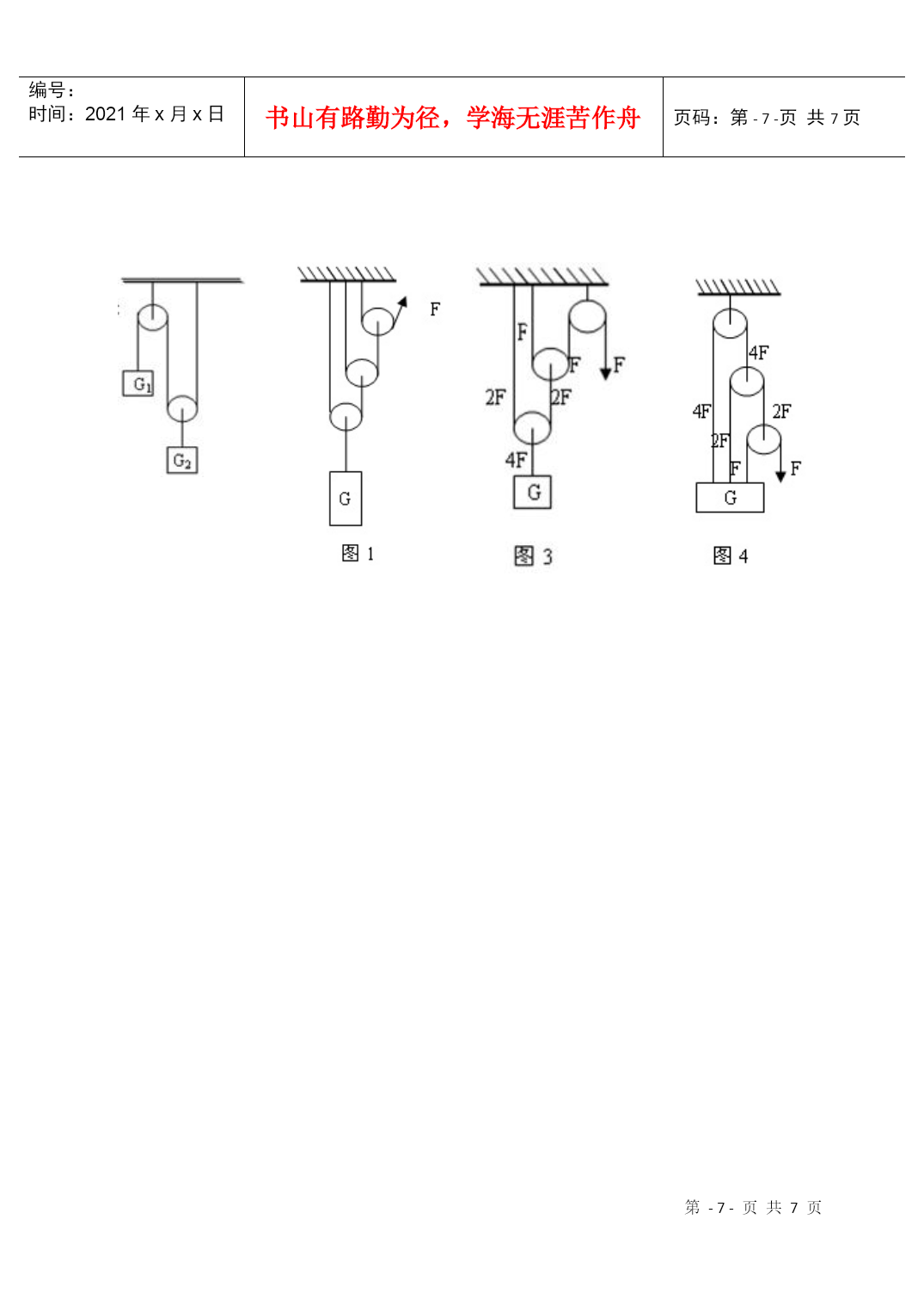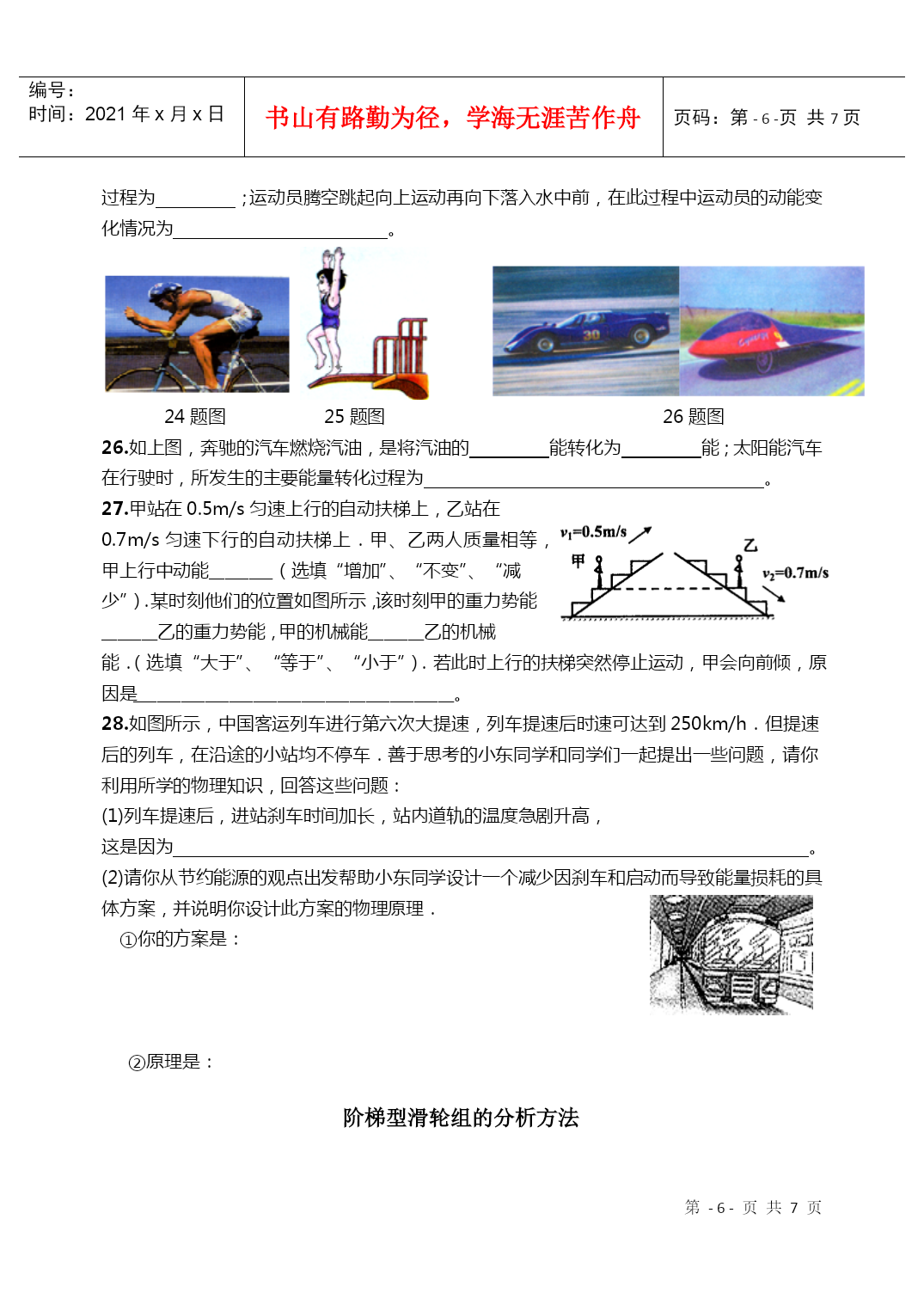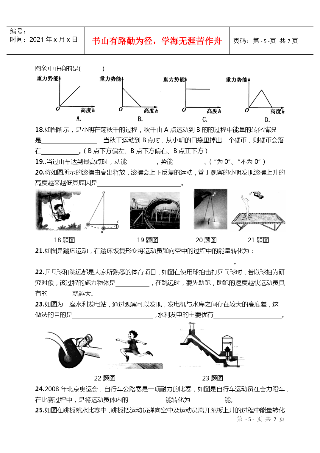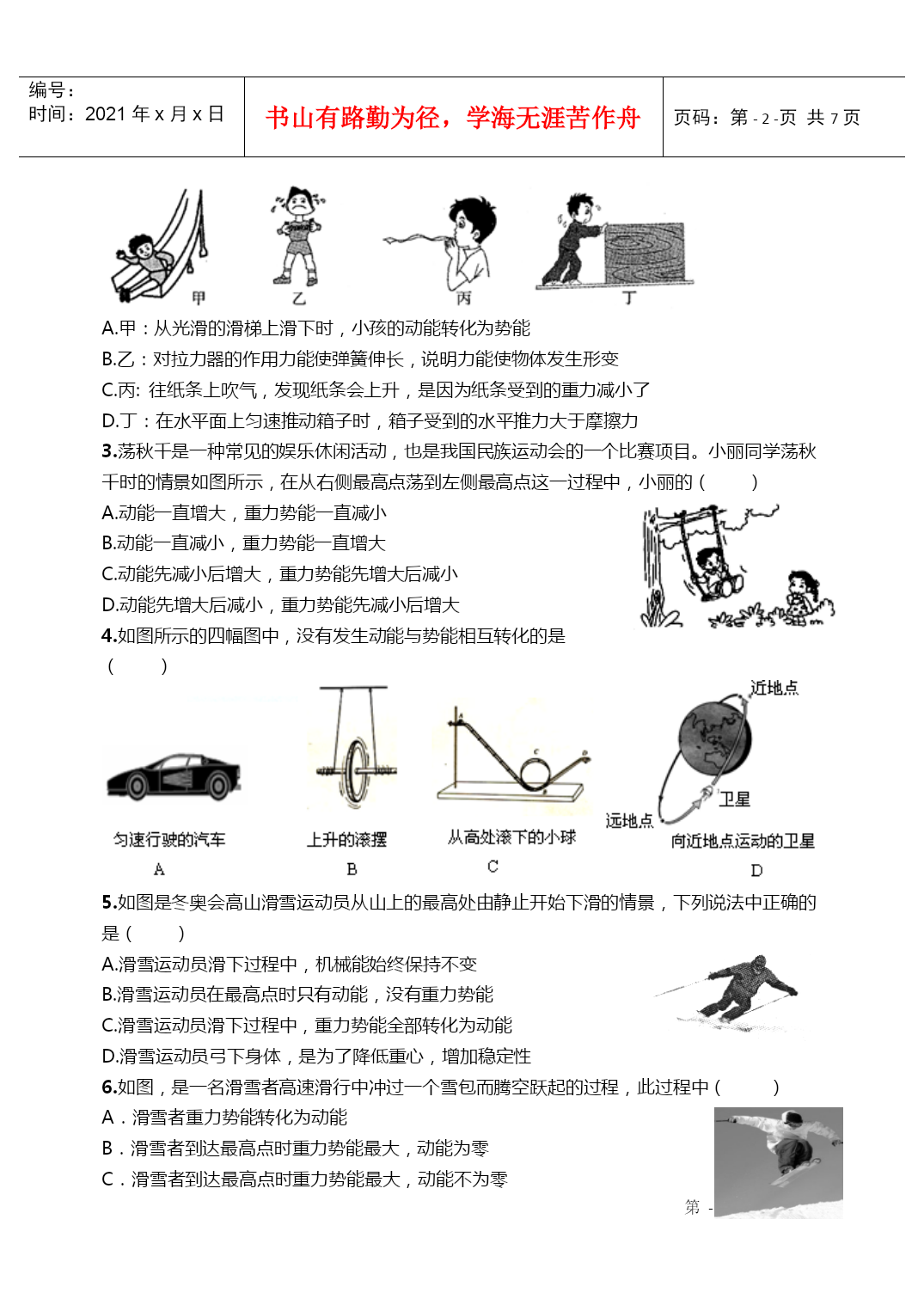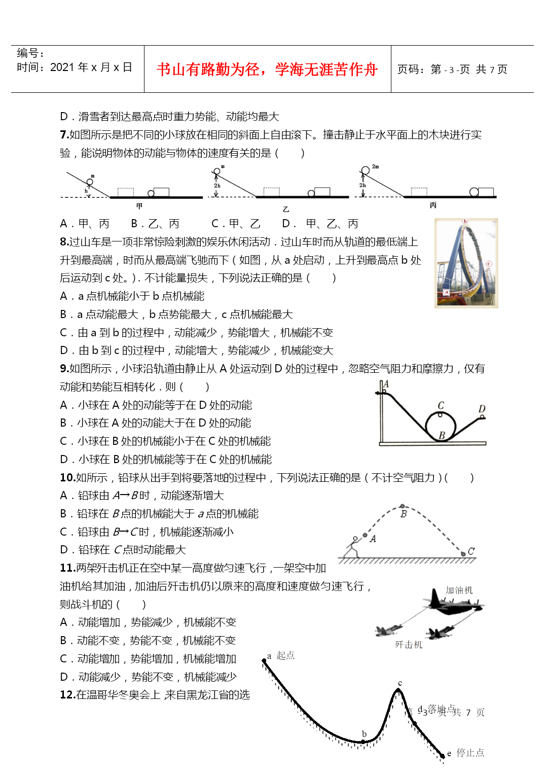 编号:时间:2021年x月x日书山有路勤为径,学海无涯苦作舟页码:第PAGE-7-页共NUMPAGES7页第PAGE\*MERGEFORMAT-7-页共NUMPAGES\*MERGEFORMAT7页机械能章节知识要点1.一个物体能够做功,这个物体就具有能(能量)。2.动能:物体由于运动而具有的能叫动能。3.运动物体的速度越大,质量越大,动能就越大。4.势能分为重力势能和弹性势能。5.重力势能:物体由于被举高而具有的能。6.物体质量越大,被举得越高,重力势能就越大。7.弹性势能:物体由于发生弹性形变而具的能。8.物体的弹性形变越大,它的弹性势能就越大。9.机械能:动能和势能的统称。(机械能=动能+势能)单位是:焦耳10,动能和势能之间可以互相转化的。方式有:动能重力势能;动能弹性势能。11.自然界中可供人类大量利用的机械能有风能和水能机械能专题1.下图是张博同学在运动场上看到的一些场景,他运用学过的物理知识进行分析,下列分析正确的是()A.王浩同学踢出去的足球在草地上滚动时慢慢停下来,是因为足球没有受到力的作用B.张红同学百米冲线后没有立即停下来,是因为受到惯性的作用C.张彦同学在做引体向上,当他在单杠上静止不动时,他对单杠的拉力和他的重力是一对平衡力D.李宁同学正在跳高,当他腾跃到最高点时,势能最大2.针对如图所示的情景,下列说法正确的是A.甲:从光滑的滑梯上滑下时,小孩的动能转化为势能B.乙:对拉力器的作用力能使弹簧伸长,说明力能使物体发生形变C.丙:往纸条上吹气,发现纸条会上升,是因为纸条受到的重力减小了D.丁:在水平面上匀速推动箱子时,箱子受到的水平推力大于摩擦力3.荡秋千是一种常见的娱乐休闲活动,也是我国民族运动会的一个比赛项目。小丽同学荡秋千时的情景如图所示,在从右侧最高点荡到左侧最高点这一过程中,小丽的()A.动能一直增大,重力势能一直减小B.动能一直减小,重力势能一直增大C.动能先减小后增大,重力势能先增大后减小D.动能先增大后减小,重力势能先减小后增大4.如图所示的四幅图中,没有发生动能与势能相互转化的是()5.如图是冬奥会高山滑雪运动员从山上的最高处由静止开始下滑的情景,下列说法中正确的是()A.滑雪运动员滑下过程中,机械能始终保持不变B.滑雪运动员在最高点时只有动能,没有重力势能C.滑雪运动员滑下过程中,重力势能全部转化为动能D.滑雪运动员弓下身体,是为了降低重心,增加稳定性6.如图,是一名滑雪者高速滑行中冲过一个雪包而腾空跃起的过程,此过程中()A.滑雪者重力势能转化为动能B.滑雪者到达最高点时重力势能最大,动能为零C.滑雪者到达最高点时重力势能最大,动能不为零D.滑雪者到达最高点时重力势能、动能均最大7.如图所示是把不同的小球放在相同的斜面上自由滚下。撞击静止于水平面上的木块进行实验,能说明物体的动能与物体的速度有关的是()A.甲、丙B.乙、丙C.甲、乙D.甲、乙、丙8.过山车是一项非常惊险刺激的娱乐休闲活动.过山车时而从轨道的最低端上升到最高端,时而从最高端飞驰而下(如图,从a处启动,上升到最高点b处后运动到c处。).不计能量损失,下列说法正确的是()A.a点机械能小于b点机械能B.a点动能最大,b点势能最大,c点机械能最大C.由a到b的过程中,动能减少,势能增大,机械能不变D.由b到c的过程中,动能增大,势能减少,机械能变大9.如图所示,小球沿轨道由静止从A处运动到D处的过程中,忽略空气阻力和摩擦力,仅有动能和势能互相转化.则()A.小球在A处的动能等于在D处的动能B.小球在A处的动能大于在D处的动能C.小球在B处的机械能小于在C处的机械能D.小球在B处的机械能等于在C处的机械能10.如所示,铅球从出手到将要落地的过程中,下列说法正确的是(不计空气阻力)()A.铅球由A→B时,动能逐渐增大B.铅球在B点的机械能大于a点的机械能C.铅球由B→C时,机械能逐渐减小D.铅球在C点时动能最大11.两架歼击机正在空中某一高度做匀速飞行,一架空中加油机给其加油,加油后歼击机仍以原来的高度和速度做匀速飞行,则战斗机的()A.动能增加,势能减少,机械能不变B.动能不变,势能不变,机械能不变C.动能增加,势能增加,机械能增加D.动能减少,势能不变,机械能减少a起点bcd落地点e停止点12.在温哥华冬奥会上,来自黑龙江省的选手李妮娜在自由式滑雪比赛中获得银牌。她在比赛过程中运动的轨迹如图所示,如果不计空气阻力,下列说法正确的是()A.从a点向b点运动过程中,重力势能全部转化为动能B.在a点和c点速度都为零,因此重力势能相等C.从c点