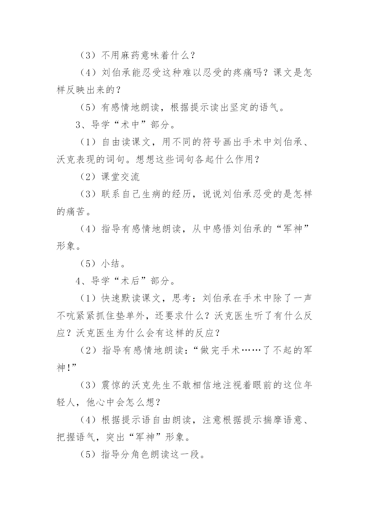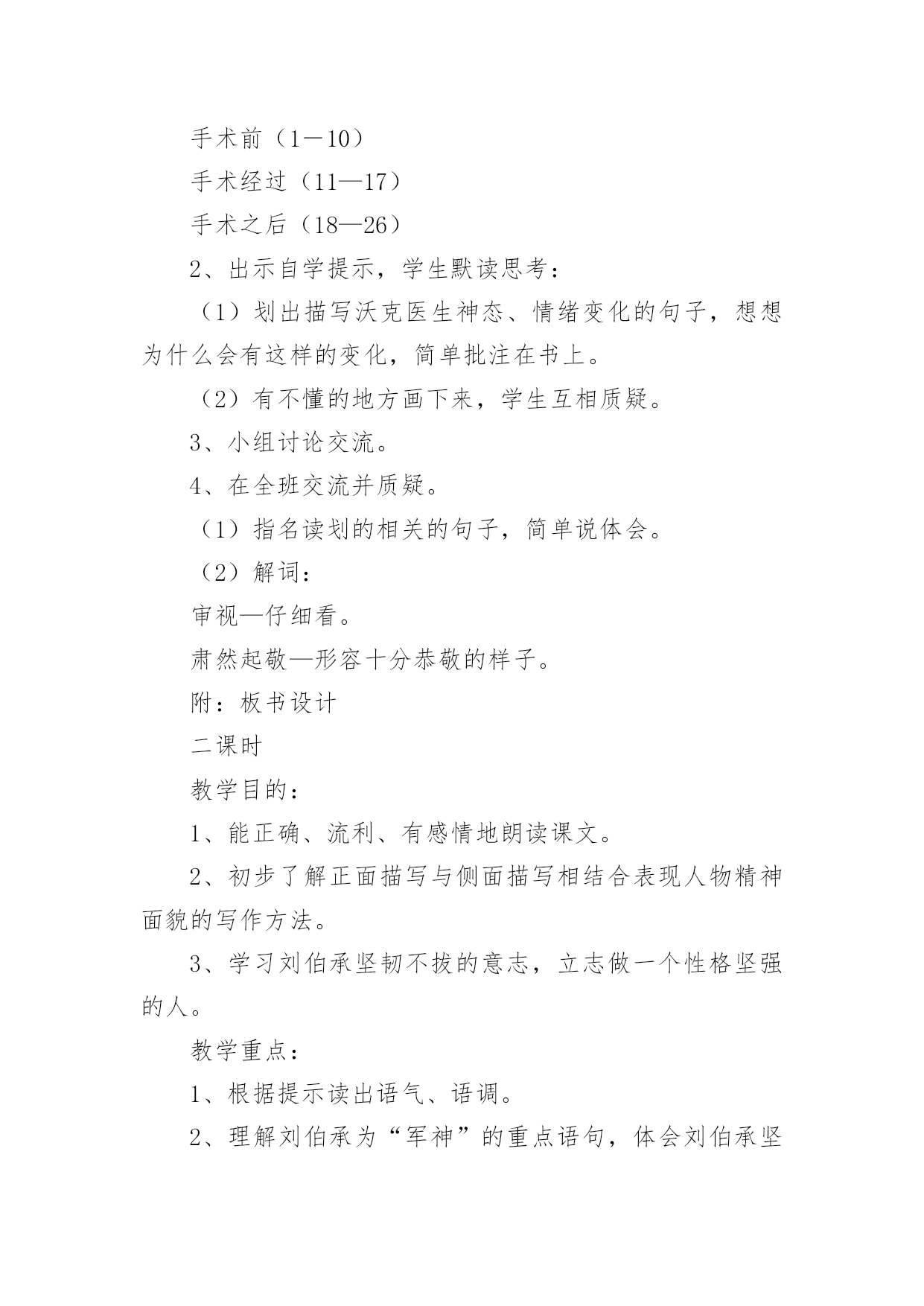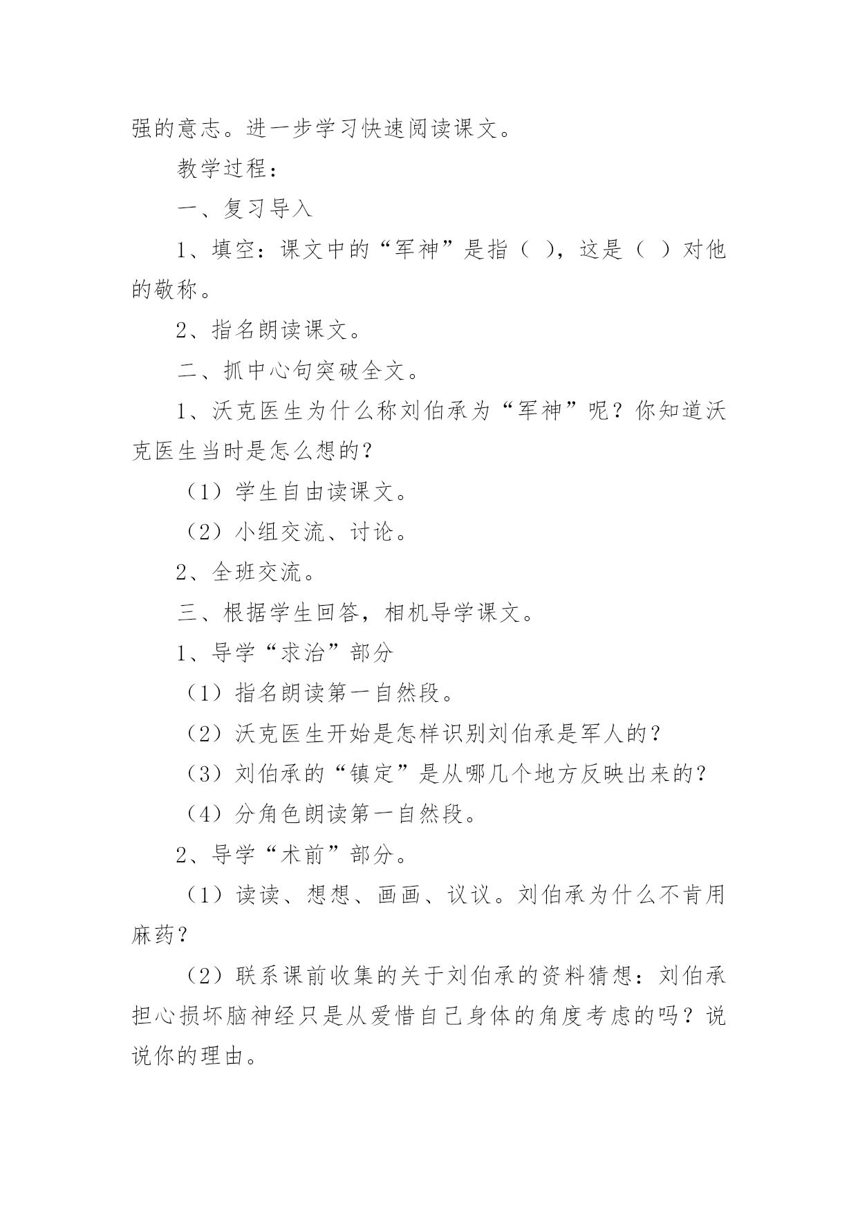 《军神》教学的设计第一课时教学目的:1、学会本课的13个生字,认识3个生字。能够正确读写下列词语:年龄、土匪、拒绝、麻醉剂、施行、勉强、过奖、诊所、惊疑、从容镇定、目光柔和、肃然起敬。2、用比较快的速度默读课文,培养良好的阅读习惯。教学重点:学会本课生字新词,用比较快的速度默读课文,理清文章思路。教学过程:一、检查预习1、出示本课生字,读一读,并组词。沃刘龄匪拒醉剂施哼晕勉堪承2、学生互相说说易错的字:容易少横的字:龄醉容易多横的字:哼注意字的笔顺:匪二、谈话导入新课军神,好响亮、好威风的称呼,为什么要称他为军神呢?用比较快的速度默读课文,想想课文讲了一件什么事?1、指名读课文,思考文章按怎样的顺序来叙述事情的?板书:手术前(1-10)手术经过(11—17)手术之后(18—26)2、出示自学提示,学生默读思考:(1)划出描写沃克医生神态、情绪变化的句子,想想为什么会有这样的变化,简单批注在书上。(2)有不懂的地方画下来,学生互相质疑。3、小组讨论交流。4、在全班交流并质疑。(1)指名读划的相关的句子,简单说体会。(2)解词:审视—仔细看。肃然起敬—形容十分恭敬的样子。附:板书设计二课时教学目的:1、能正确、流利、有感情地朗读课文。2、初步了解正面描写与侧面描写相结合表现人物精神面貌的写作方法。3、学习刘伯承坚韧不拔的意志,立志做一个性格坚强的人。教学重点:1、根据提示读出语气、语调。2、理解刘伯承为“军神”的重点语句,体会刘伯承坚强的意志。进一步学习快速阅读课文。教学过程:一、复习导入1、填空:课文中的“军神”是指(),这是()对他的敬称。2、指名朗读课文。二、抓中心句突破全文。1、沃克医生为什么称刘伯承为“军神”呢?你知道沃克医生当时是怎么想的?(1)学生自由读课文。(2)小组交流、讨论。2、全班交流。三、根据学生回答,相机导学课文。1、导学“求治”部分(1)指名朗读第一自然段。(2)沃克医生开始是怎样识别刘伯承是军人的?(3)刘伯承的“镇定”是从哪几个地方反映出来的?(4)分角色朗读第一自然段。2、导学“术前”部分。(1)读读、想想、画画、议议。刘伯承为什么不肯用麻药?(2)联系课前收集的关于刘伯承的资料猜想:刘伯承担心损坏脑神经只是从爱惜自己身体的角度考虑的吗?说说你的理由。(3)不用麻药意味着什么?(4)刘伯承能忍受这种难以忍受的疼痛吗?课文是怎样反映出来的?(5)有感情地朗读,根据提示读出坚定的语气。3、导学“术中”部分。(1)自由读课文,用不同的符号画出手术中刘伯承、沃克表现的词句。想想这些词句各起什么作用?(2)课堂交流(3)联系自己生病的经历,说说刘伯承忍受的是怎样的痛苦。(4)指导有感情地朗读,从中感悟刘伯承的“军神”形象。(5)小结。4、导学“术后”部分。(1)快速默读课文,思考:刘伯承在手术中除了一声不吭紧紧抓住垫单外,还要求什么?沃克医生听了有什么反应?沃克医生为什么会有这样的反应?(2)指导有感情地朗读:“做完手术……了不起的军神!”(3)震惊的沃克先生不敢相信地注视着眼前的这位年轻人,他心中会怎么想?(4)根据提示语自由朗读,注意根据提示揣摩语意、把握语气,突出“军神”形象。(5)指导分角色朗读这一段。