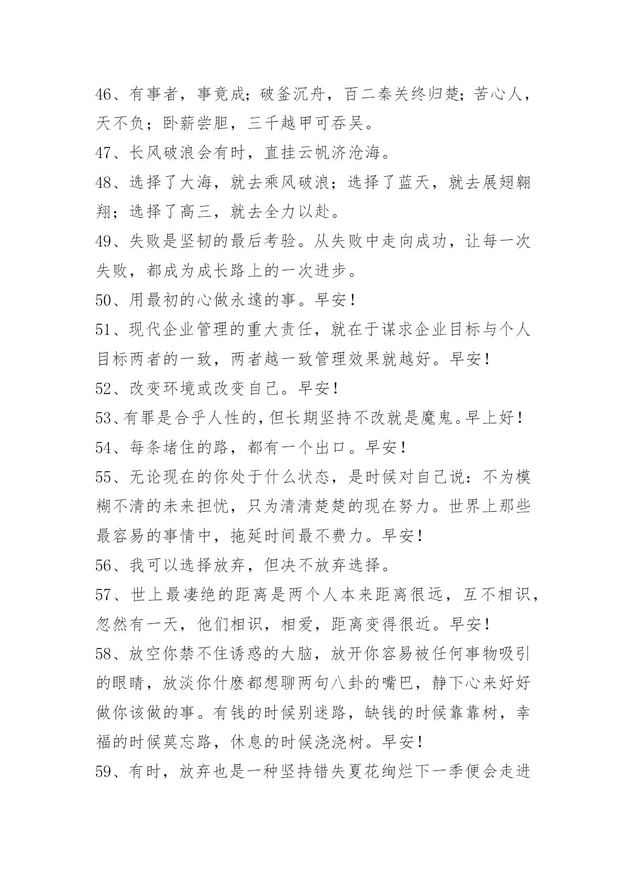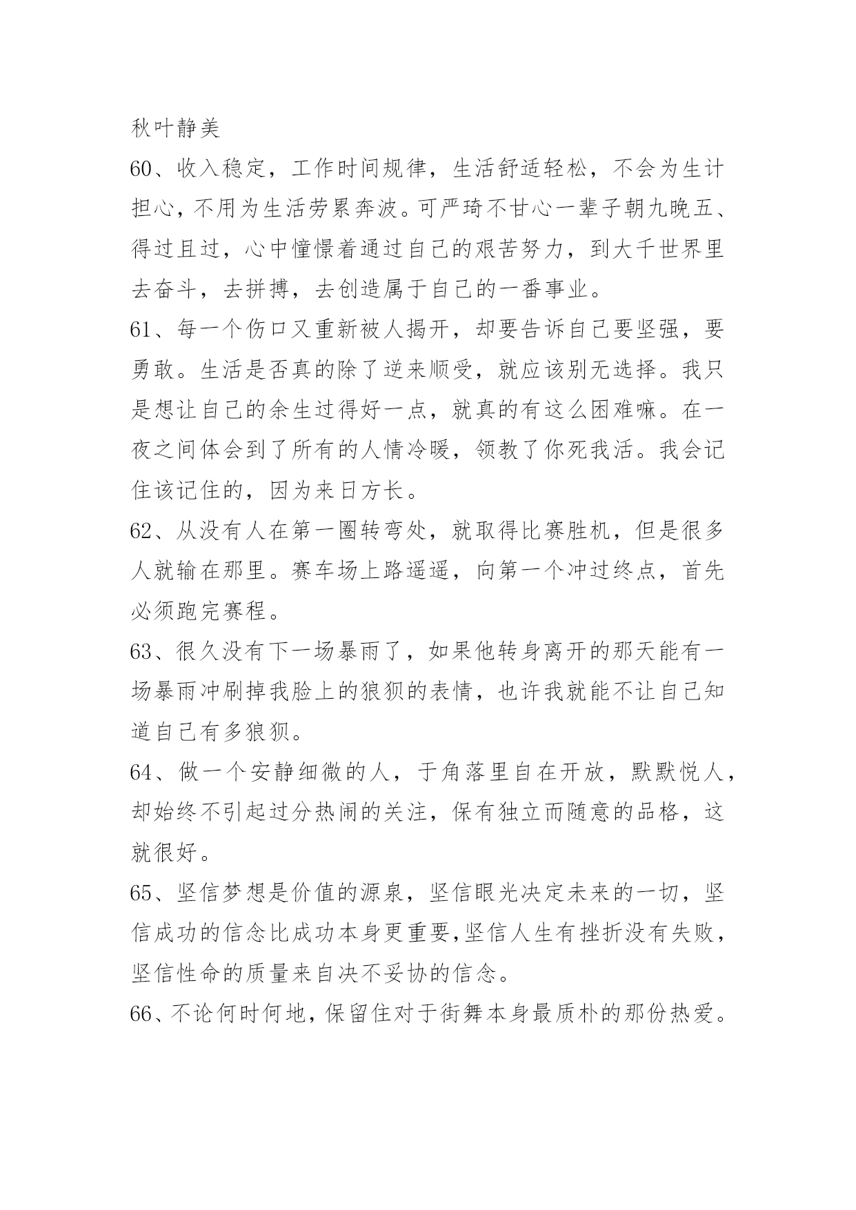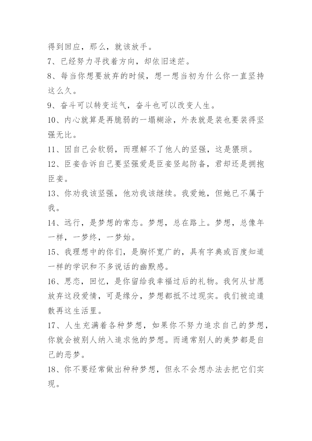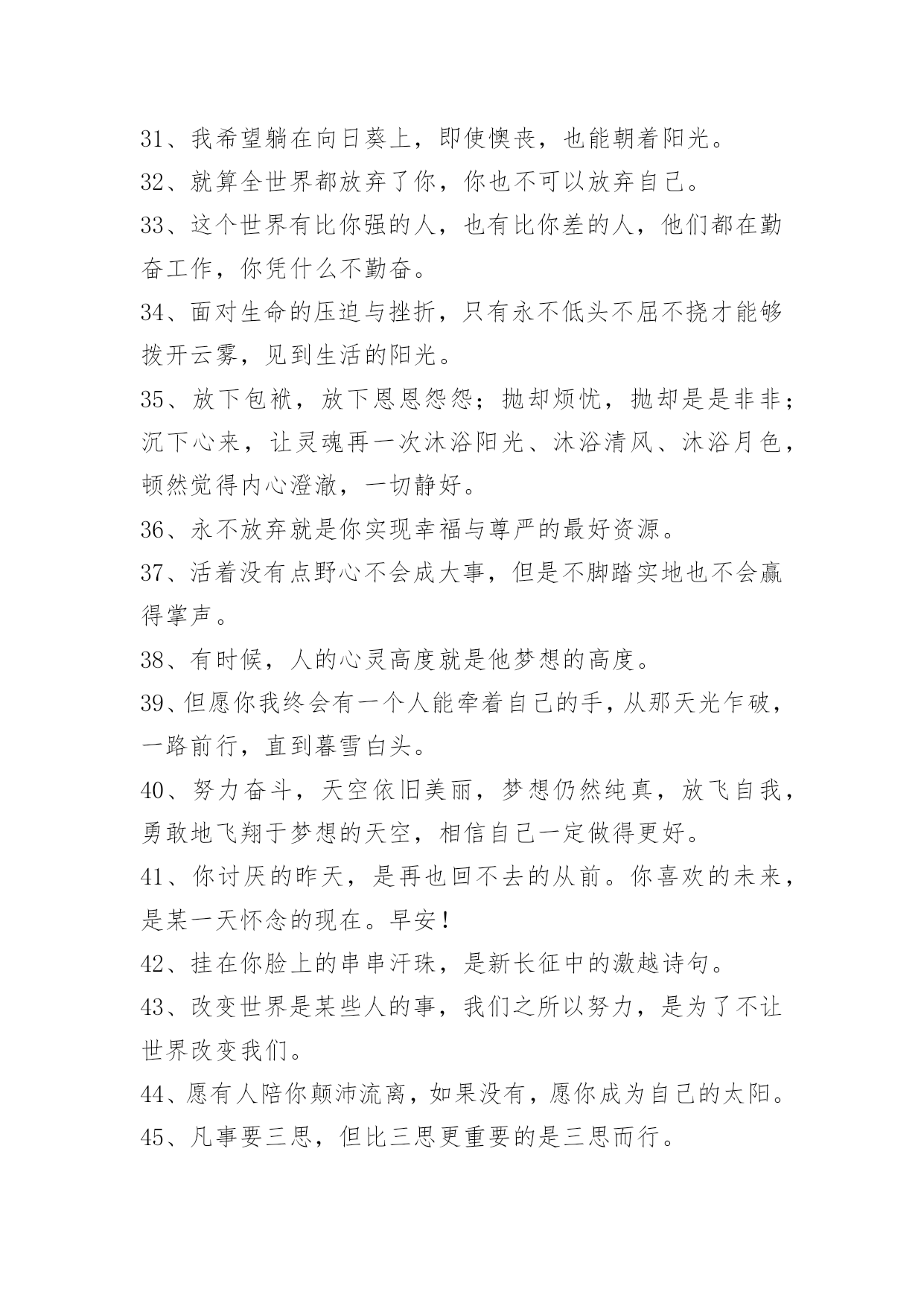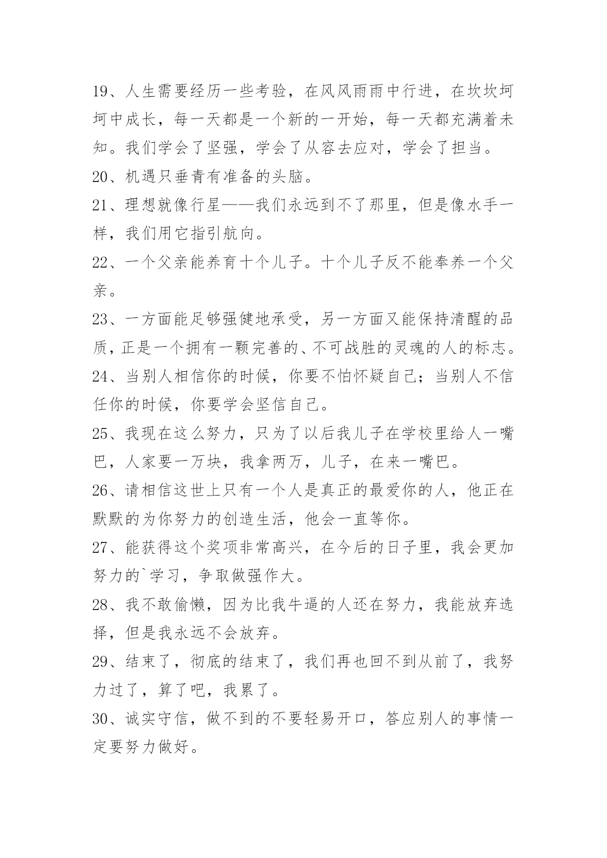 常用励志名句66条2022年常用励志名句汇总66条给自己定目标,一年,两年,五年,也许你出生不如别人好,透过努力,往往能够改变%的命运。破罐子破摔只能和懦弱做朋友。下面是小编为大家整理的励志名句66条,希望对大家有所帮助。1、不是每一次努力都会有收获。学会享受生活。人生就象是迷宫,上半生找找入口,下半生找找出口。人生像阳光,上半生如日出东方,冉冉上升光芒四射,后半生如夕阳西下,渐渐下落暗淡光芒。2、人生在世,短暂不过百年。无论有没有人爱,我们也要努力做一个可爱的人。不埋怨谁,不嘲笑谁,也不羡慕谁,阳光下灿烂,风雨中奔跑,做自己的梦,走自己的路。3、努力的寻找所谓的另一半,殊不知,另一半也在疯狂的找寻那一半。4、我和他就象是两条平行线,不管我多么努力地想靠近,都不可能会有交集。我一直拼命地想要靠近他,结果只是让我的这条线,走得歪七扭八而已。5、很多事,在我们总认为无法完成的时候就那么努力的被自信征服。6、所以不要把自己的执念看得那么重要,也不要把你单恋的人看得那么重要。当你尽自己最大的努力之后,依旧无法得到回应,那么,就该放手。7、已经努力寻找着方向,却依旧迷茫。8、每当你想要放弃的时候,想一想当初为什么你一直坚持这么久。9、奋斗可以转变运气,奋斗也可以改变人生。10、内心就算是再脆弱的一塌糊涂,外表就是装也要装得坚强无比。11、因自己会软弱,而理解不了他人的坚强,这是猥琐。12、臣妾告诉自己要坚强爱是臣妾竖起防备,君却还是拥抱臣妾。13、你劝我该坚强,他劝我该继续。我爱她,但她已不属于我。14、远行,是梦想的常态。梦想,总在路上。梦想,总像年一样,一梦终,一梦始。15、我理想中的你们,是胸怀宽广的,具有字典或百度知道一样的学识和不多说话的幽默感。16、思恋,回忆,是你留给我幸福过后的礼物。我何从甘愿放弃这段爱情,可是缘分,梦想都抵不过现实。我们被迫遣散再这生活里。17、人生充满着各种梦想,如果你不努力追求自己的梦想,你就会被别人纳入追求他的梦想。而通常别人的美梦都是自己的恶梦。18、你不要经常做出种种梦想,但永不会想办法去把它们实现。19、人生需要经历一些考验,在风风雨雨中行进,在坎坎坷坷中成长,每一天都是一个新的一开始,每一天都充满着未知。我们学会了坚强,学会了从容去应对,学会了担当。20、机遇只垂青有准备的头脑。21、理想就像行星——我们永远到不了那里,但是像水手一样,我们用它指引航向。22、一个父亲能养育十个儿子。十个儿子反不能奉养一个父亲。23、一方面能足够强健地承受,另一方面又能保持清醒的品质,正是一个拥有一颗完善的、不可战胜的灵魂的人的标志。24、当别人相信你的时候,你要不怕怀疑自己;当别人不信任你的时候,你要学会坚信自己。25、我现在这么努力,只为了以后我儿子在学校里给人一嘴巴,人家要一万块,我拿两万,儿子,在来一嘴巴。26、请相信这世上只有一个人是真正的最爱你的人,他正在默默的为你努力的创造生活,他会一直等你。27、能获得这个奖项非常高兴,在今后的日子里,我会更加努力的`学习,争取做强作大。28、我不敢偷懒,因为比我牛逼的人还在努力,我能放弃选择,但是我永远不会放弃。29、结束了,彻底的结束了,我们再也回不到从前了,我努力过了,算了吧,我累了。30、诚实守信,做不到的不要轻易开口,答应别人的事情一定要努力做好。31、我希望躺在向日葵上,即使懊丧,也能朝着阳光。32、就算全世界都放弃了你,你也不可以放弃自己。33、这个世界有比你强的人,也有比你差的人,他们都在勤奋工作,你凭什么不勤奋。34、面对生命的压迫与挫折,只有永不低头不屈不挠才能够拨开云雾,见到生活的阳光。35、放下包袱,放下恩恩怨怨;抛却烦忧,抛却是是非非;沉下心来,让灵魂再一次沐浴阳光、沐浴清风、沐浴月色,顿然觉得内心澄澈,一切静好。36、永不放弃就是你实现幸福与尊严的最好资源。37、活着没有点野心不会成大事,但是不脚踏实地也不会赢得掌声。38、有时候,人的心灵高度就是他梦想的高度。39、但愿你我终会有一个人能牵着自己的手,从那天光乍破,一路前行,直到暮雪白头。40、努力奋斗,天空依旧美丽,梦想仍然纯真,放飞自我,勇敢地飞翔于梦想的天空,相信自己一定做得更好。41、你讨厌的昨天,是再也回不去的从前。你喜欢的未来,是某一天怀念的现在。早安!42、挂在你脸上的串串汗珠,是新长征中的激越诗句。43、改变世界是某些人的事,我们之所以努力,是为了不让世界改变我们。44、愿有人陪你颠沛流离,如果没有,愿你成为自己的太阳。45、凡事要三思,但比三思更重要的是三思而行。46、有事者,事竟成;破釜沉舟,百二秦关终归楚;苦心人,天不负;卧薪尝胆,三千越甲可吞吴。47、长风破浪会有时,直挂云帆济沧海。48、选择了大海,就去乘风破浪;选择了蓝天,就去展翅翱翔;选择了高三,