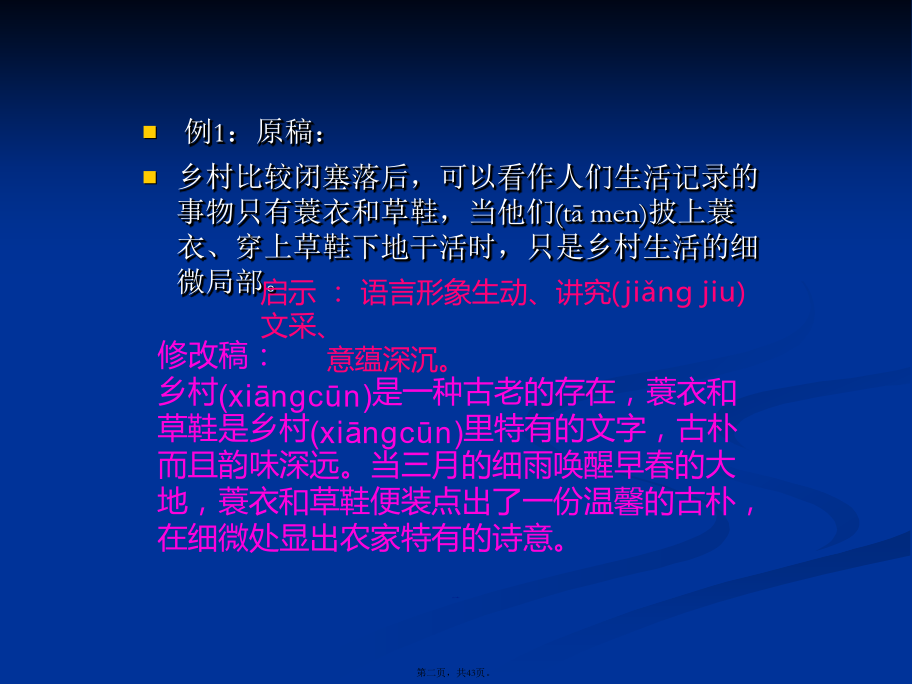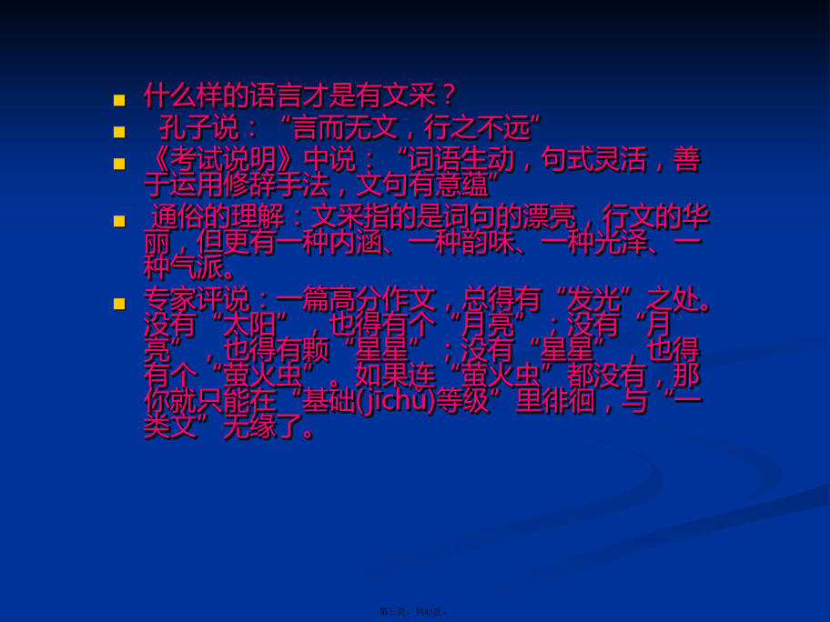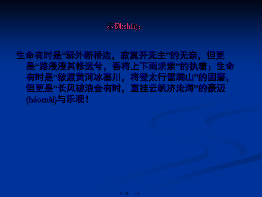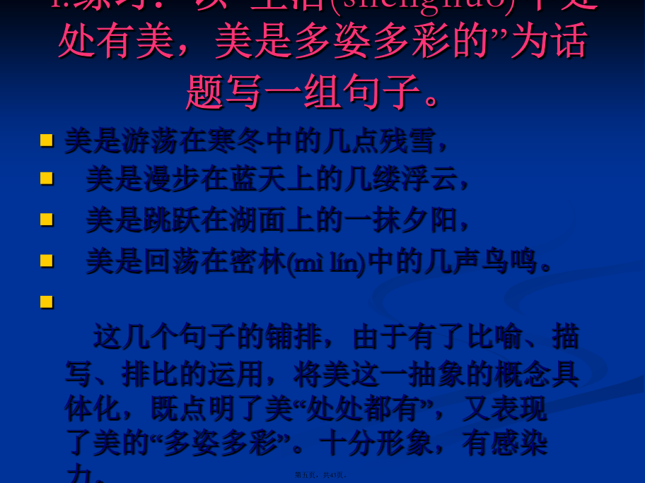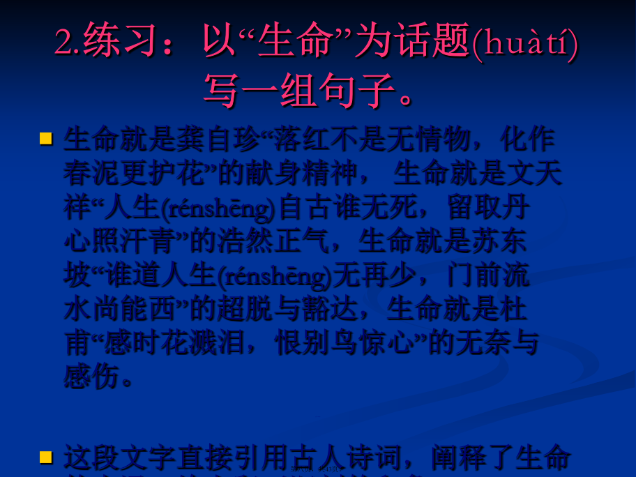 会计学1.练习:以“生活(shēnghuó)中处处有美,美是多姿多彩的”为话题写一组句子。示例(shìlì):2.练习:以“生命”为话题(huàtí)写一组句子。示例(shìlì):(2)名人(míngrén)+名言+名德。文学语言(wénxuéyǔyán)示例2.练习:以“亲情(qīnqínɡ)”为话题,引用古诗,写一组句子。2829303132三、文段升格(shēnggé)343536谢谢(xièxie)!