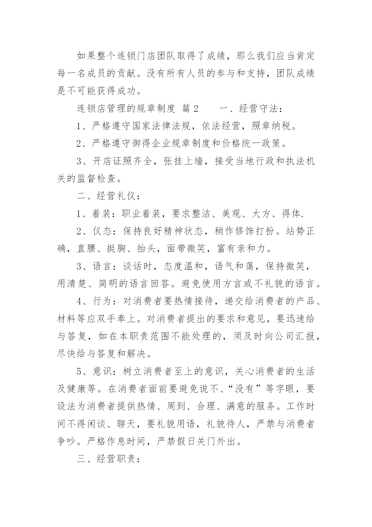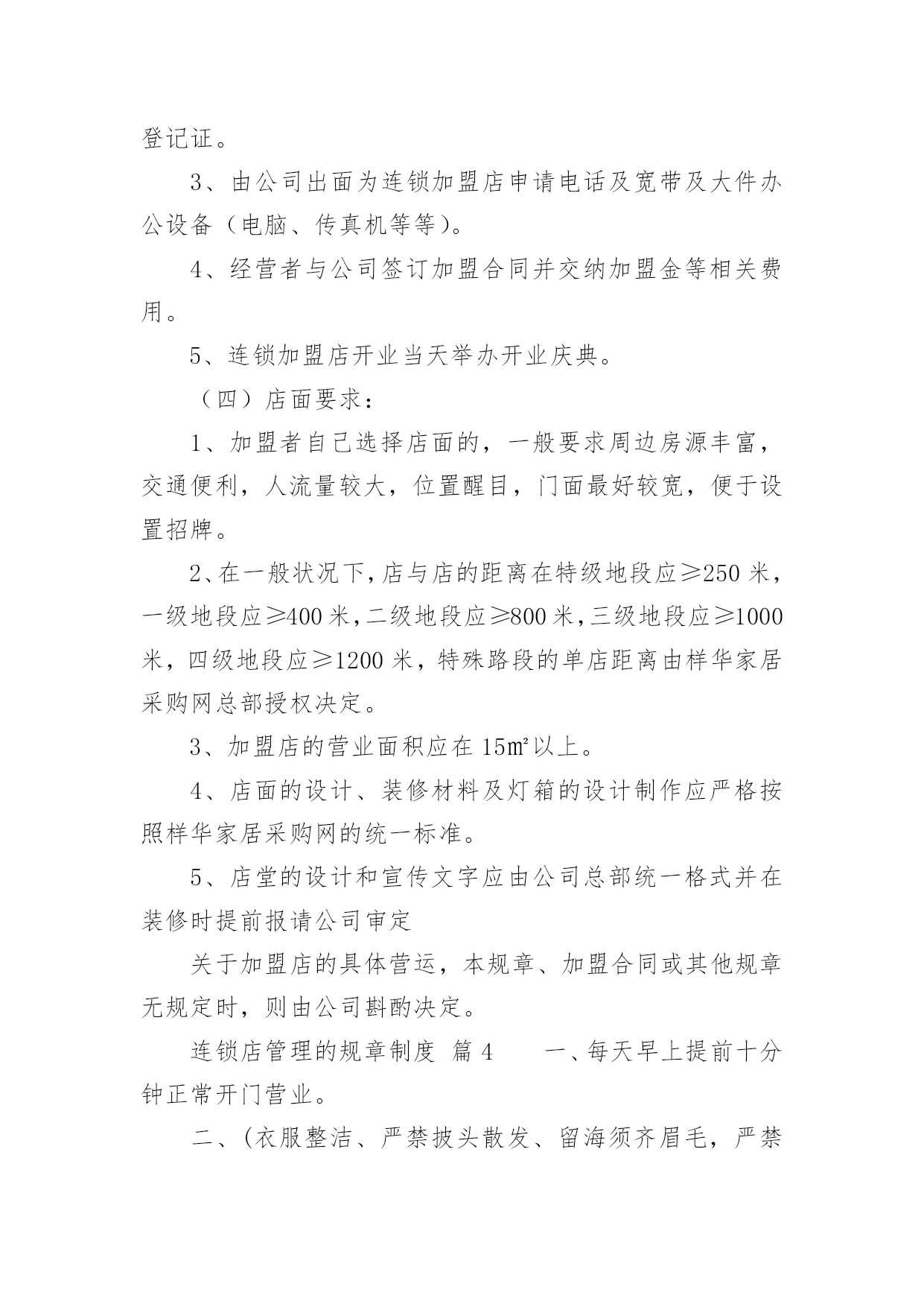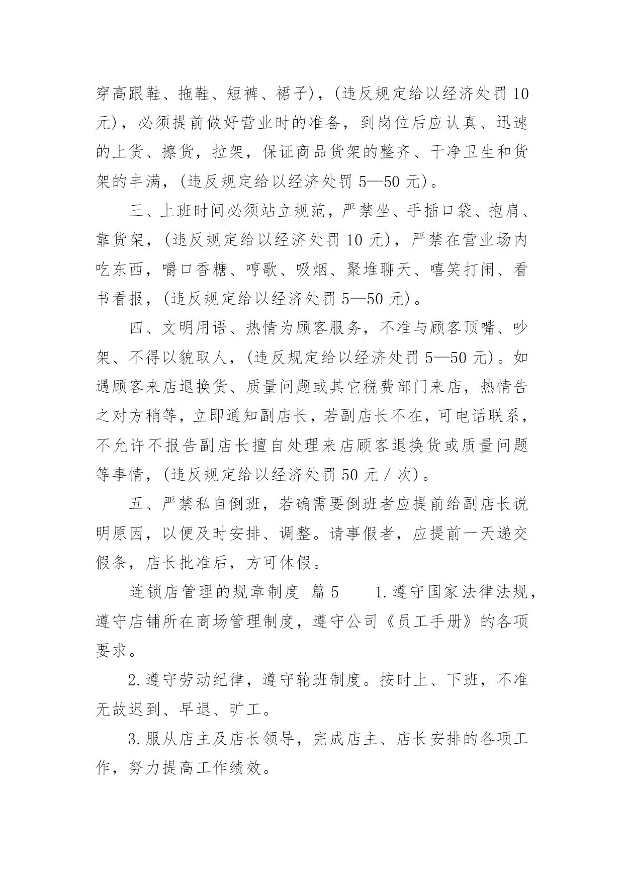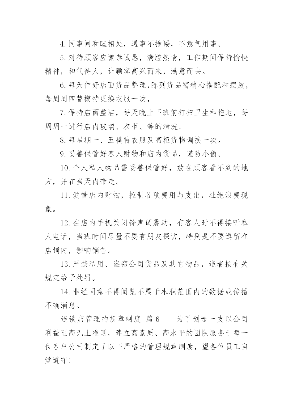 连锁店管理的规章制度连锁店管理的规章制度(通用10篇)在社会一步步向前发展的今天,制度的使用频率呈上升趋势,制度是国家法律、法令、政策的具体化,是人们行动的准则和依据。拟定制度需要注意哪些问题呢?以下是小编整理的连锁店管理的规章制度(通用11篇),希望对大家有所帮助。连锁店管理的规章制度篇1连锁门店的成功首先要具有规范的人员管理机制,从店长到店员,既职责分明,各司其职,工作井井有条,又需要像团队那样一起工作。一、门店组织结构。管理岗位可设店长、店长助理,店员可设导购员及收银员岗位。1、店长代表者——店长代表整个店铺的形象。店长是连锁公司管理门店的代理人,对外处理与主管部门、顾客等之间的关系;对内又是店员的代言人。经营者——指挥店员高效运作,对店铺的经营的各项数据进行分析,在满足顾客需求的同时创造一定的经营利润,并对各项工作作出正确决策。管理者——控制和运用店铺的相关资源,管理店内营业活动并实现营业目标。协调者——协调解决店铺出现的各种问题,使工作保持顺畅。培训者——培训店员的各种技能,提升员工整体素质,激励店员不断为店铺创造效益。2、导购员负责顾客接待、礼送,推荐门店商品,解答顾客疑问,整理维护商品,保持店面清洁等工作,是门店顾客服务的具体执行者。3、收银员负责收银、现金管理、账目管理工作及顾客咨询等服务工作。二、岗位着装识别连锁门店人员着装是连锁店重要的识别标志之一,也是规范经营,展示品牌形象的重要手段,因此,连锁体系各级员工都应该高度重视。为方便顾客识别,连锁店员工应统一着装颜色、款式。与此同时,各岗位人员应佩戴相应岗位标牌供顾客识别。三、人员管理制度无以规矩,不成方圆。作为连锁门店,必须制定规范的人员管理制度,并不折不扣的执行。包括门店人员出勤、外出规定,交接班、排班制度。同时,连锁门店实行统一的门店绩效管理、统一的薪酬福利管理及统一的岗位晋升管理。四、团队协作连锁门店人员管理的成功除了需要有规范的岗位分工、规范的着装、规范的制度之外,还需要员工像团队那样一起工作,从而超过现有成绩,达到更高的标准。1、注重全局,考虑整体当员工做每一件事情,服务每一位顾客时,都应考虑它会如何影响整个门店,以至整个公司的利益。例如,当员工为顾客提供热情、周到、专业的服务后,顾客就会认可该连锁门店以及公司,从而一再光临,并向周围宣传该连锁门店。2、集思广益,群策群力对于出现的问题,门店人员集思广益,提出新的看法和建议,共同解决问题。对于个人工作中遇到的问题,在其他人的帮助下,群策群力,共同解决。两个人的力量总是强于一个人,一个协作的团队的力量就更强大了。例如,每一名员工都可以提出更好的服务顾客的建议。每一位团队成员遇到困难时,其他成员都应及时提供帮助。3、积极沟通,尊重他人积极、有效的沟通可以明确表达自己的想法,并聆听他人意见,通过思想的碰撞产生创新的火花。每一位门店员工都应该与团队中的成员进行沟通。例如,在讨论顾客服务或销售导购技能时,通过聆听团队其他成员的意见,可以为员工带来新的思路。4、全力以赴,支持决定在每个成员都发表意见并聆听了他人的意见后,团队应该作出统一的决定,对决定,每一个成员都必须遵循并全力以赴的予以支持。请想象一下,如果在连锁门店中,员工就同一问题给顾客不同的答案,会造成什么样的混乱情景。作为团队,在形成一致决定后,就应像一个整体那样去执行。5、团队成绩,个人贡献如果整个连锁门店团队取得了成绩,那么我们应当肯定每一名成员的贡献。没有所有人员的参与和支持,团队成绩是不可能获得成功。连锁店管理的规章制度篇2一、经营守法:1、严格遵守国家法律法规,依法经营,照章纳税。2、严格遵守御得企业规章制度和价格统一政策。3、开店证照齐全,张挂上墙,接受当地行政和执法机关的监督检查。二、经营礼仪:1、着装:职业着装,要求整洁、美观、大方、得体.2、仪态:保持良好精神状态,稍作修饰打扮。站势正确,直腰、挺胸、抬头,面带微笑,富有亲和力。3、语言:谈话时,态度温和,语气和蔼,保持微笑,用清楚、简明的语言回答。避免使用方言或不礼貌的语言。4、行为:对消费者要热情接待,递交给消费者的产品、材料等应双手奉上。对消费者提出的要求和意见,要迅速给与答复,如在本职责范围不能处理的,须及时向公司汇报,尽快给与答复和解决。5、意识:树立消费者至上的意识,关心消费者的生活及健康等。在消费者面前要避免说不、“没有”等字眼,要设法为消费者提供热情、周到、合理、满意的服务。工作时间不得闲谈、聊天,要礼貌用语,礼貌待人,严禁与消费者争吵。严格作息时间,严禁假日关门外出。三、经营职责:1、维护、宣传公司形象,如实宣导公司产品,正确引导消费大众。合法经营。2、不以任何名义参与非法传銷、赌博和迷信活动。3、不搞大型会议活动。需要开展新产品发布或产品知识讲座等活动,必须先经