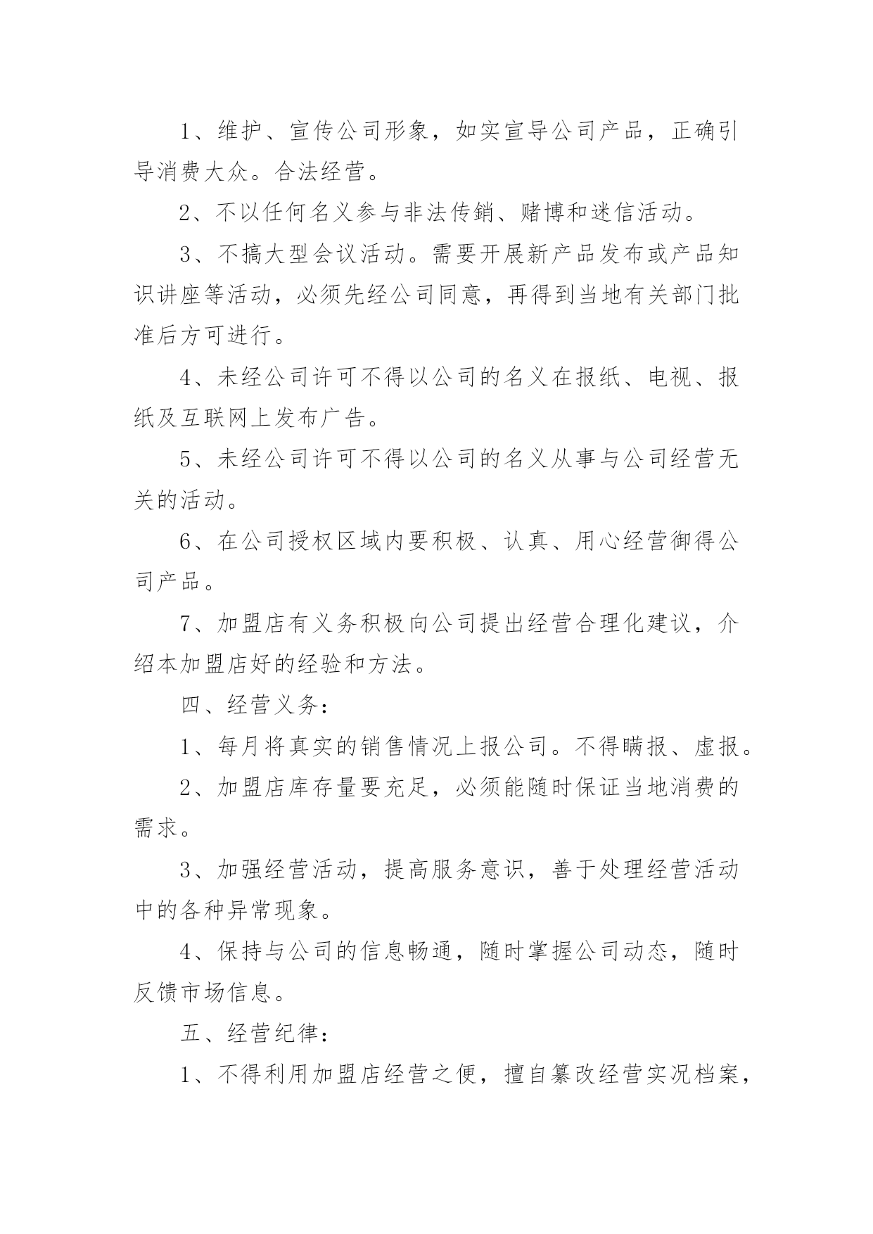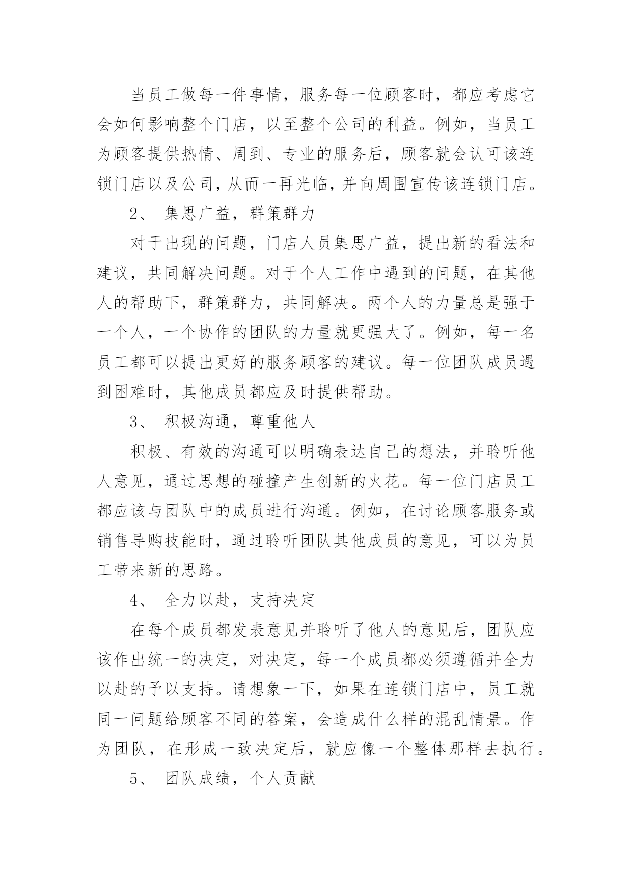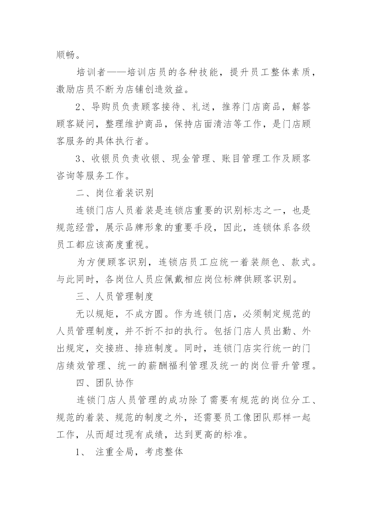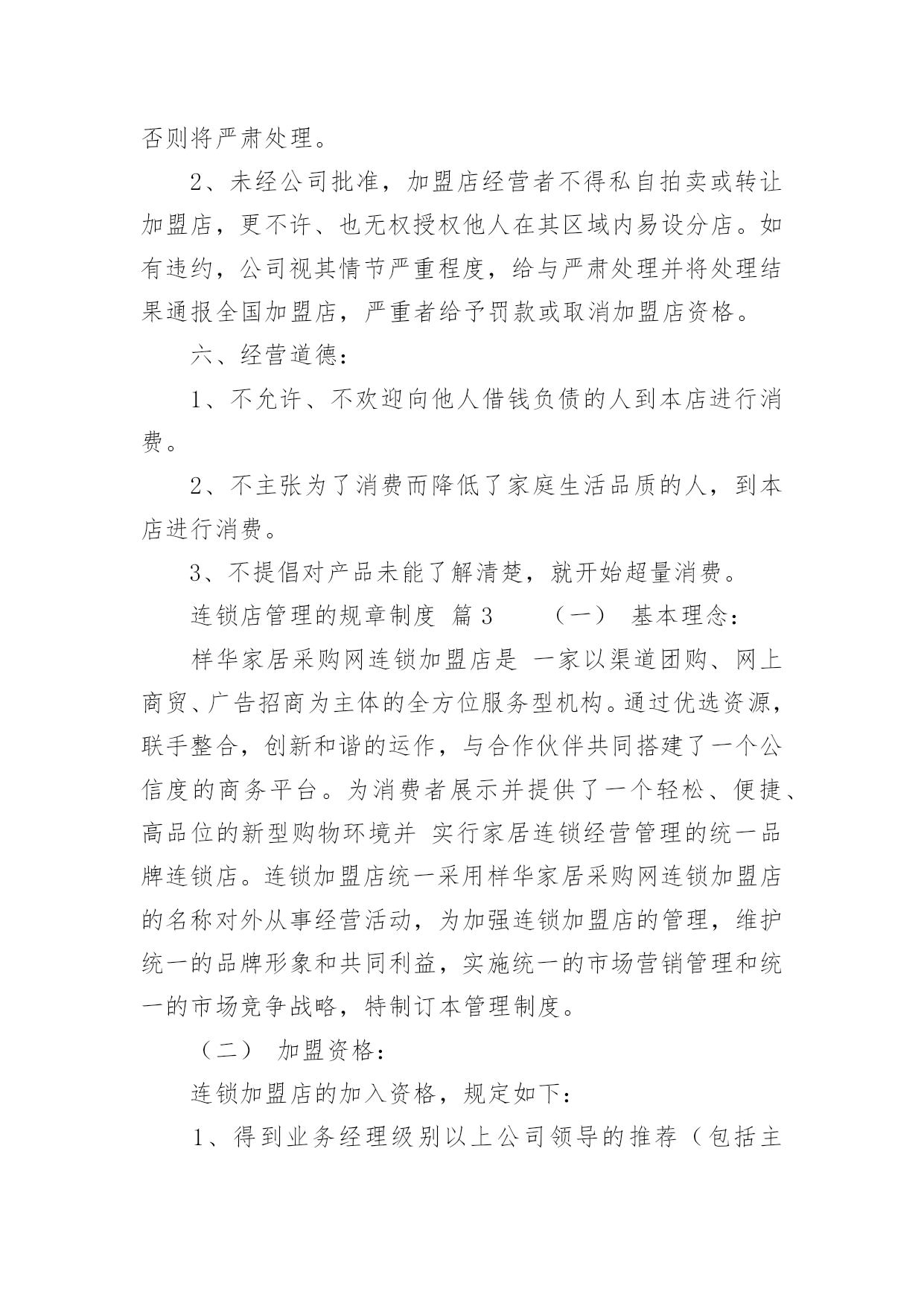 连锁店管理的规章制度连锁店管理的规章制度(通用10篇)在社会一步步向前发展的今天,制度的使用频率呈上升趋势,制度是国家法律、法令、政策的具体化,是人们行动的准则和依据。拟定制度需要注意哪些问题呢?以下是小编整理的连锁店管理的规章制度(通用11篇),希望对大家有所帮助。连锁店管理的规章制度篇1连锁门店的成功首先要具有规范的人员管理机制,从店长到店员,既职责分明,各司其职,工作井井有条,又需要像团队那样一起工作。一、门店组织结构。管理岗位可设店长、店长助理,店员可设导购员及收银员岗位。1、店长代表者——店长代表整个店铺的形象。店长是连锁公司管理门店的代理人,对外处理与主管部门、顾客等之间的关系;对内又是店员的代言人。经营者——指挥店员高效运作,对店铺的经营的各项数据进行分析,在满足顾客需求的同时创造一定的经营利润,并对各项工作作出正确决策。管理者——控制和运用店铺的相关资源,管理店内营业活动并实现营业目标。协调者——协调解决店铺出现的各种问题,使工作保持顺畅。培训者——培训店员的各种技能,提升员工整体素质,激励店员不断为店铺创造效益。2、导购员负责顾客接待、礼送,推荐门店商品,解答顾客疑问,整理维护商品,保持店面清洁等工作,是门店顾客服务的具体执行者。3、收银员负责收银、现金管理、账目管理工作及顾客咨询等服务工作。二、岗位着装识别连锁门店人员着装是连锁店重要的识别标志之一,也是规范经营,展示品牌形象的重要手段,因此,连锁体系各级员工都应该高度重视。为方便顾客识别,连锁店员工应统一着装颜色、款式。与此同时,各岗位人员应佩戴相应岗位标牌供顾客识别。三、人员管理制度无以规矩,不成方圆。作为连锁门店,必须制定规范的人员管理制度,并不折不扣的执行。包括门店人员出勤、外出规定,交接班、排班制度。同时,连锁门店实行统一的门店绩效管理、统一的薪酬福利管理及统一的岗位晋升管理。四、团队协作连锁门店人员管理的成功除了需要有规范的岗位分工、规范的着装、规范的制度之外,还需要员工像团队那样一起工作,从而超过现有成绩,达到更高的标准。1、注重全局,考虑整体当员工做每一件事情,服务每一位顾客时,都应考虑它会如何影响整个门店,以至整个公司的利益。例如,当员工为顾客提供热情、周到、专业的服务后,顾客就会认可该连锁门店以及公司,从而一再光临,并向周围宣传该连锁门店。2、集思广益,群策群力对于出现的问题,门店人员集思广益,提出新的看法和建议,共同解决问题。对于个人工作中遇到的问题,在其他人的帮助下,群策群力,共同解决。两个人的力量总是强于一个人,一个协作的团队的力量就更强大了。例如,每一名员工都可以提出更好的服务顾客的建议。每一位团队成员遇到困难时,其他成员都应及时提供帮助。3、积极沟通,尊重他人积极、有效的沟通可以明确表达自己的想法,并聆听他人意见,通过思想的碰撞产生创新的火花。每一位门店员工都应该与团队中的成员进行沟通。例如,在讨论顾客服务或销售导购技能时,通过聆听团队其他成员的意见,可以为员工带来新的思路。4、全力以赴,支持决定在每个成员都发表意见并聆听了他人的意见后,团队应该作出统一的决定,对决定,每一个成员都必须遵循并全力以赴的予以支持。请想象一下,如果在连锁门店中,员工就同一问题给顾客不同的答案,会造成什么样的混乱情景。作为团队,在形成一致决定后,就应像一个整体那样去执行。5、团队成绩,个人贡献如果整个连锁门店团队取得了成绩,那么我们应当肯定每一名成员的贡献。没有所有人员的参与和支持,团队成绩是不可能获得成功。连锁店管理的规章制度篇2一、经营守法:1、严格遵守国家法律法规,依法经营,照章纳税。2、严格遵守御得企业规章制度和价格统一政策。3、开店证照齐全,张挂上墙,接受当地行政和执法机关的监督检查。二、经营礼仪:1、着装:职业着装,要求整洁、美观、大方、得体.2、仪态:保持良好精神状态,稍作修饰打扮。站势正确,直腰、挺胸、抬头,面带微笑,富有亲和力。3、语言:谈话时,态度温和,语气和蔼,保持微笑,用清楚、简明的语言回答。避免使用方言或不礼貌的语言。4、行为:对消费者要热情接待,递交给消费者的产品、材料等应双手奉上。对消费者提出的要求和意见,要迅速给与答复,如在本职责范围不能处理的,须及时向公司汇报,尽快给与答复和解决。5、意识:树立消费者至上的意识,关心消费者的生活及健康等。在消费者面前要避免说不、“没有”等字眼,要设法为消费者提供热情、周到、合理、满意的服务。工作时间不得闲谈、聊天,要礼貌用语,礼貌待人,严禁与消费者争吵。严格作息时间,严禁假日关门外出。三、经营职责:1、维护、宣传公司形象,如实宣导公司产品,正确引导消费大众。合法经营。2、不以任何名义参与非法传銷、赌博和迷信活动。3、不搞大型会议活动。需要开展新产品发布或产品知识讲座等活动,必须先经