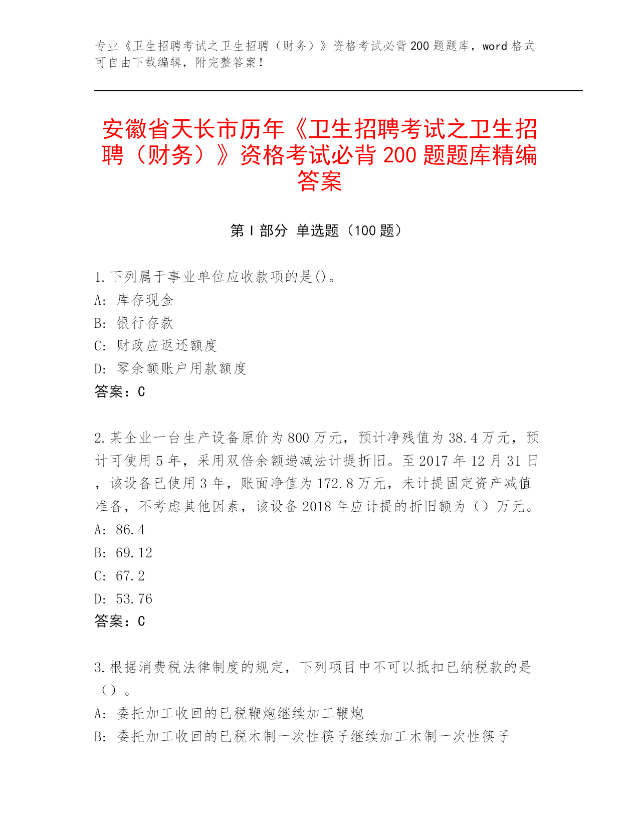 安徽省天长市历年《卫生招聘考试之卫生招聘(财务)》资格考试必背200题题库精编答案