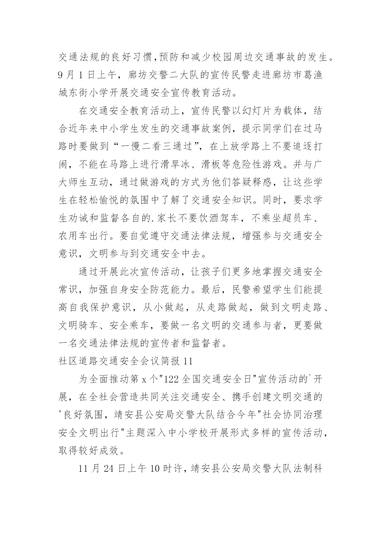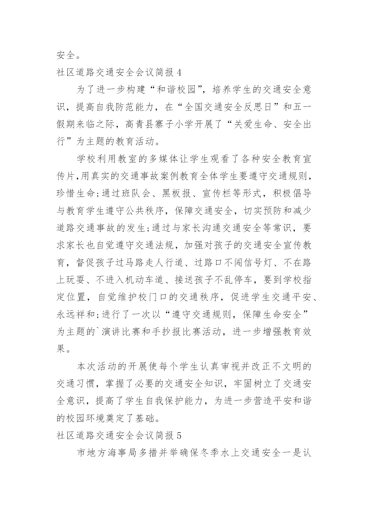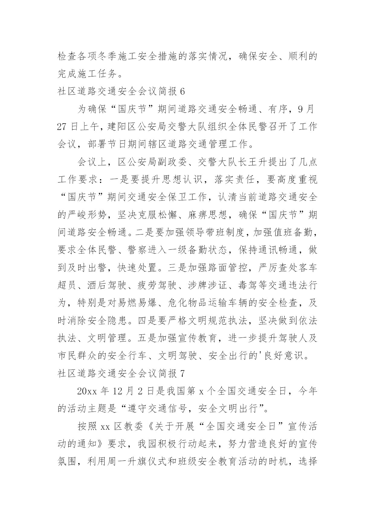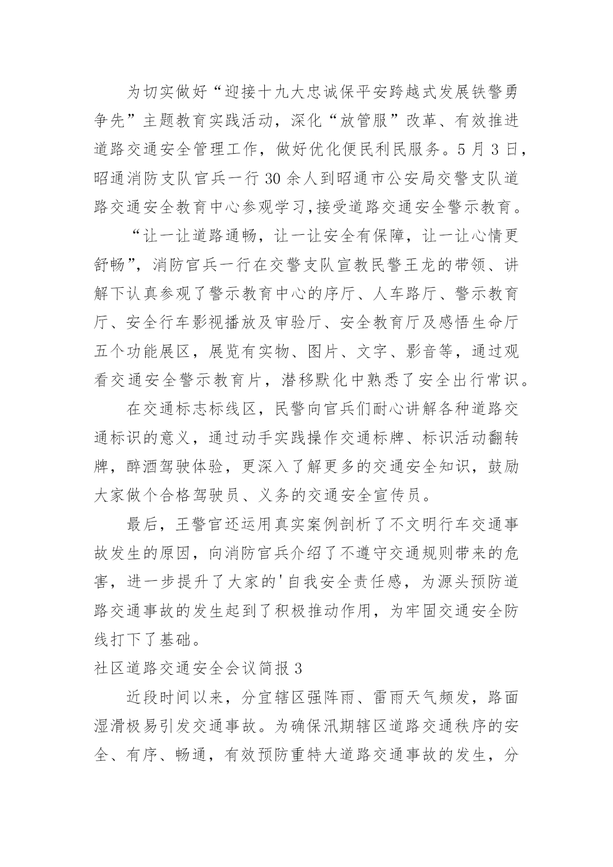 社区道路交通安全会议简报社区道路交通安全会议简报15篇在日常生活和工作中,简报使用的情况越来越多,简报又称“动态”“简讯”“要情”“摘报”“工作通讯”“情况反映”“情况交流”“内部参考”等。想学习拟定简报却不知道该请教谁?下面是小编收集整理的社区道路交通安全会议简报,希望对大家有所帮助。社区道路交通安全会议简报120xx年12月2日是我国第xx个全国交通安全日,按照xx区教委《关于开展“全国交通安全日”宣传活动的通知》要求,我园积极行动起来,努力营造良好的宣传氛围,利用周一升旗仪式和班级安全教育活动的时机,选择了一些适合3——6岁儿童认知特点的交通安全知识,向全园教师、幼儿宣传交通安全法律法规和常见知识,本次交通安全宣传活动讲解的`内容主要有:横穿马路行走安全;集体外出安全;乘车安全?怎样认识交通信号灯?怎样辨别各种常见的交通安全标志等等与幼儿生命安全息息相关、又浅显易懂的安全知识。通过这种有目的、有计划、有针对性的安全教育活动,大大增强了我园师生们对交通安全的重视和理解,丰富了安全知识,提高了安全防范能力,起到了良好的教育作用。社区道路交通安全会议简报2为切实做好“迎接十九大忠诚保平安跨越式发展铁警勇争先”主题教育实践活动,深化“放管服”改革、有效推进道路交通安全管理工作,做好优化便民利民服务。5月3日,昭通消防支队官兵一行30余人到昭通市公安局交警支队道路交通安全教育中心参观学习,接受道路交通安全警示教育。“让一让道路通畅,让一让安全有保障,让一让心情更舒畅”,消防官兵一行在交警支队宣教民警王龙的带领、讲解下认真参观了警示教育中心的序厅、人车路厅、警示教育厅、安全行车影视播放及审验厅、安全教育厅及感悟生命厅五个功能展区,展览有实物、图片、文字、影音等,通过观看交通安全警示教育片,潜移默化中熟悉了安全出行常识。在交通标志标线区,民警向官兵们耐心讲解各种道路交通标识的意义,通过动手实践操作交通标牌、标识活动翻转牌,醉酒驾驶体验,更深入了解更多的交通安全知识,鼓励大家做个合格驾驶员、义务的交通安全宣传员。最后,王警官还运用真实案例剖析了不文明行车交通事故发生的原因,向消防官兵介绍了不遵守交通规则带来的危害,进一步提升了大家的'自我安全责任感,为源头预防道路交通事故的发生起到了积极推动作用,为牢固交通安全防线打下了基础。社区道路交通安全会议简报3近段时间以来,分宜辖区强阵雨、雷雨天气频发,路面湿滑极易引发交通事故。为确保汛期辖区道路交通秩序的安全、有序、畅通,有效预防重特大道路交通事故的发生,分宜大队采取五个进一步举措,不断完善恶劣天气条件下的事故预防工作,全力保障辖区道路交通安全、畅通。一、进一步强化应急组织领导。进一步提高汛期道路交通事故预防工作认识,针对道路可能因恶劣天气造成的堵塞或中断等情况,制定完善了相应的交通疏导和绕行分流预案,避免因准备不充分和处置不当造成大量车辆和人员长时间滞留;同时,加强与气象部门、交通等部门联系,建立汛期信息预警通报机制,及时掌握气象变化信息。二、进一步强化路面巡逻管控。坚持以雨为令、降雨到岗,最大限度的组织警力上路执勤,全面加强城区各拥堵路段的指挥疏导,特别是加强对桥梁、高架路、涵洞以及易积水路段等重点路段的`管控,及时发现排除各类隐患、险情,并全力配合相关部门做好排水工作,必要时采取交通管制等措施,全力保障交通安全顺畅。三、进一步强化道路隐患排查。大队针对汛期交通特点,并结合辖区道路交通实际情况,立即对辖区道路进行一次全面、细致地摸底排查工作,准确掌握易发生积水的桥梁、坡路、弯路等交通安全隐患点段,按照交通安全隐患排查整改制度,在最短的时间内落实整改措施。对短时间内无法整改的,采取必要管控措施,确保安全。同时,做好道路施工现场的防汛工作,落实防汛责任和安全措施。特别是安排专门警力加强辖区道路施工现场的监督管理,注意发现因雨水浸泡、冲刷等原因而引发的路面塌陷等影响道路通行和安全的问题,及时采取应急措施,保证施工现场及沿线的道路通行安全。社区道路交通安全会议简报4为了进一步构建“和谐校园”,培养学生的交通安全意识,提高自我防范能力,在“全国交通安全反思日”和五一假期来临之际,高青县寨子小学开展了“关爱生命、安全出行”为主题的教育活动。学校利用教室的多媒体让学生观看了各种安全教育宣传片,用真实的交通事故案例教育全体学生要遵守交通规则,珍惜生命;通过班队会、黑板报、宣传栏等形式,积极倡导与教育学生遵守公共秩序,保障交通安全,切实预防和减少道路交通事故的发生;通过与家长沟通交通安全等常识,要求家长也自觉遵守交通法规,加强对孩子的交通安全宣传教育,督促孩子过马路走人行道、过路口不闯信号灯、不在路上玩耍、不进入机动车道、接送孩子不乱停车,要到学校指定位置,自觉维护校门口的交通秩序,促进学生交通平安、永