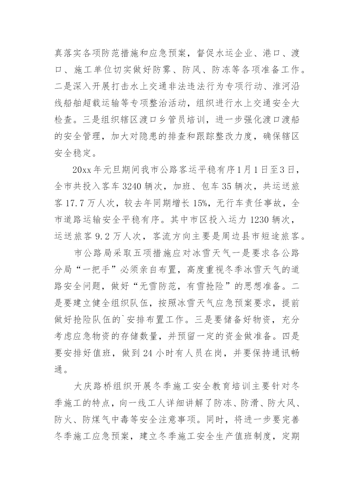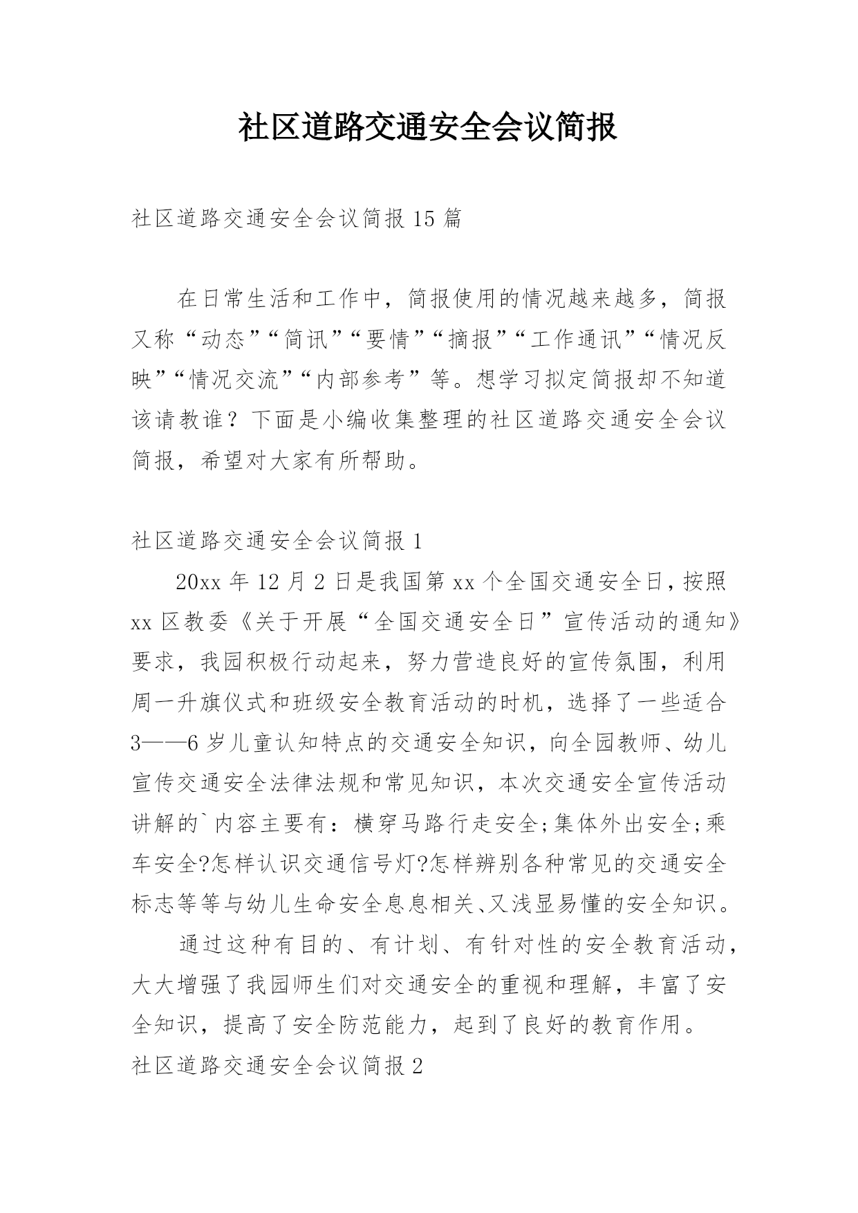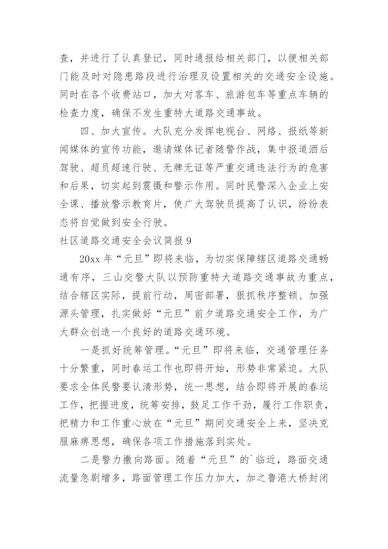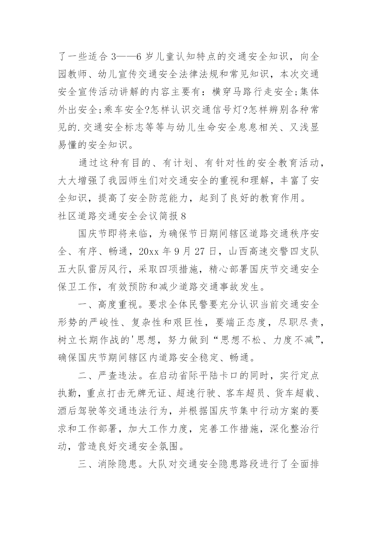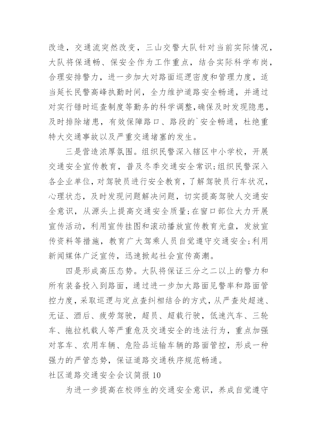社区道路交通安全会议简报社区道路交通安全会议简报15篇在日常生活和工作中,简报使用的情况越来越多,简报又称“动态”“简讯”“要情”“摘报”“工作通讯”“情况反映”“情况交流”“内部参考”等。想学习拟定简报却不知道该请教谁?下面是小编收集整理的社区道路交通安全会议简报,希望对大家有所帮助。社区道路交通安全会议简报120xx年12月2日是我国第xx个全国交通安全日,按照xx区教委《关于开展“全国交通安全日”宣传活动的通知》要求,我园积极行动起来,努力营造良好的宣传氛围,利用周一升旗仪式和班级安全教育活动的时机,选择了一些适合3——6岁儿童认知特点的交通安全知识,向全园教师、幼儿宣传交通安全法律法规和常见知识,本次交通安全宣传活动讲解的`内容主要有:横穿马路行走安全;集体外出安全;乘车安全?怎样认识交通信号灯?怎样辨别各种常见的交通安全标志等等与幼儿生命安全息息相关、又浅显易懂的安全知识。通过这种有目的、有计划、有针对性的安全教育活动,大大增强了我园师生们对交通安全的重视和理解,丰富了安全知识,提高了安全防范能力,起到了良好的教育作用。社区道路交通安全会议简报2为切实做好“迎接十九大忠诚保平安跨越式发展铁警勇争先”主题教育实践活动,深化“放管服”改革、有效推进道路交通安全管理工作,做好优化便民利民服务。5月3日,昭通消防支队官兵一行30余人到昭通市公安局交警支队道路交通安全教育中心参观学习,接受道路交通安全警示教育。“让一让道路通畅,让一让安全有保障,让一让心情更舒畅”,消防官兵一行在交警支队宣教民警王龙的带领、讲解下认真参观了警示教育中心的序厅、人车路厅、警示教育厅、安全行车影视播放及审验厅、安全教育厅及感悟生命厅五个功能展区,展览有实物、图片、文字、影音等,通过观看交通安全警示教育片,潜移默化中熟悉了安全出行常识。在交通标志标线区,民警向官兵们耐心讲解各种道路交通标识的意义,通过动手实践操作交通标牌、标识活动翻转牌,醉酒驾驶体验,更深入了解更多的交通安全知识,鼓励大家做个合格驾驶员、义务的交通安全宣传员。最后,王警官还运用真实案例剖析了不文明行车交通事故发生的原因,向消防官兵介绍了不遵守交通规则带来的危害,进一步提升了大家的'自我安全责任感,为源头预防道路交通事故的发生起到了积极推动作用,为牢固交通安全防线打下了基础。社区道路交通安全会议简报3近段时间以来,分宜辖区强阵雨、雷雨天气频发,路面湿滑极易引发交通事故。为确保汛期辖区道路交通秩序的安全、有序、畅通,有效预防重特大道路交通事故的发生,分宜大队采取五个进一步举措,不断完善恶劣天气条件下的事故预防工作,全力保障辖区道路交通安全、畅通。一、进一步强化应急组织领导。进一步提高汛期道路交通事故预防工作认识,针对道路可能因恶劣天气造成的堵塞或中断等情况,制定完善了相应的交通疏导和绕行分流预案,避免因准备不充分和处置不当造成大量车辆和人员长时间滞留;同时,加强与气象部门、交通等部门联系,建立汛期信息预警通报机制,及时掌握气象变化信息。二、进一步强化路面巡逻管控。坚持以雨为令、降雨到岗,最大限度的组织警力上路执勤,全面加强城区各拥堵路段的指挥疏导,特别是加强对桥梁、高架路、涵洞以及易积水路段等重点路段的`管控,及时发现排除各类隐患、险情,并全力配合相关部门做好排水工作,必要时采取交通管制等措施,全力保障交通安全顺畅。三、进一步强化道路隐患排查。大队针对汛期交通特点,并结合辖区道路交通实际情况,立即对辖区道路进行一次全面、细致地摸底排查工作,准确掌握易发生积水的桥梁、坡路、弯路等交通安全隐患点段,按照交通安全隐患排查整改制度,在最短的时间内落实整改措施。对短时间内无法整改的,采取必要管控措施,确保安全。同时,做好道路施工现场的防汛工作,落实防汛责任和安全措施。特别是安排专门警力加强辖区道路施工现场的监督管理,注意发现因雨水浸泡、冲刷等原因而引发的路面塌陷等影响道路通行和安全的问题,及时采取应急措施,保证施工现场及沿线的道路通行安全。社区道路交通安全会议简报4为了进一步构建“和谐校园”,培养学生的交通安全意识,提高自我防范能力,在“全国交通安全反思日”和五一假期来临之际,高青县寨子小学开展了“关爱生命、安全出行”为主题的教育活动。学校利用教室的多媒体让学生观看了各种安全教育宣传片,用真实的交通事故案例教育全体学生要遵守交通规则,珍惜生命;通过班队会、黑板报、宣传栏等形式,积极倡导与教育学生遵守公共秩序,保障交通安全,切实预防和减少道路交通事故的发生;通过与家长沟通交通安全等常识,要求家长也自觉遵守交通法规,加强对孩子的交通安全宣传教育,督促孩子过马路走人行道、过路口不闯信号灯、不在路上玩耍、不进入机动车道、接送孩子不乱停车,要到学校指定位置,自觉维护校门口的交通秩序,促进学生交通平安、永