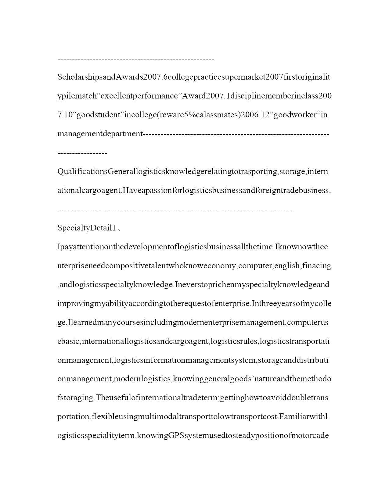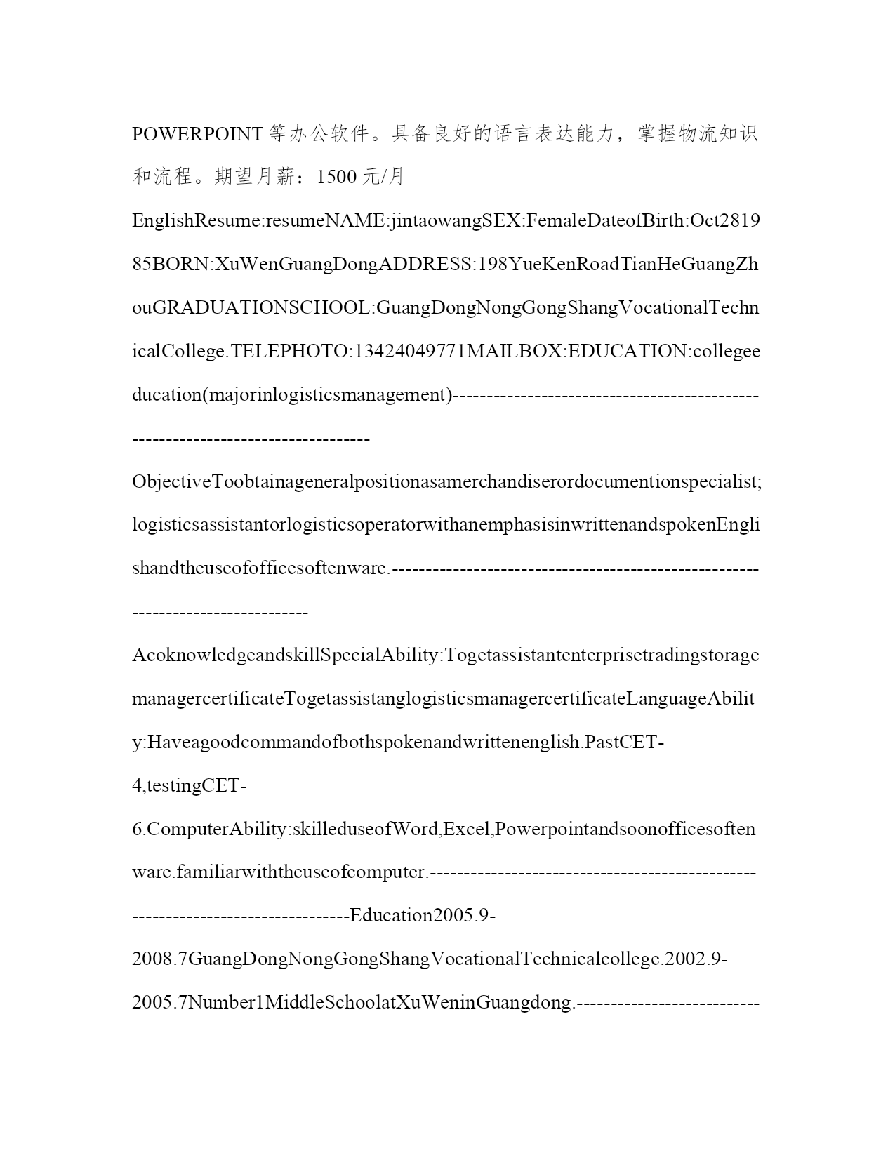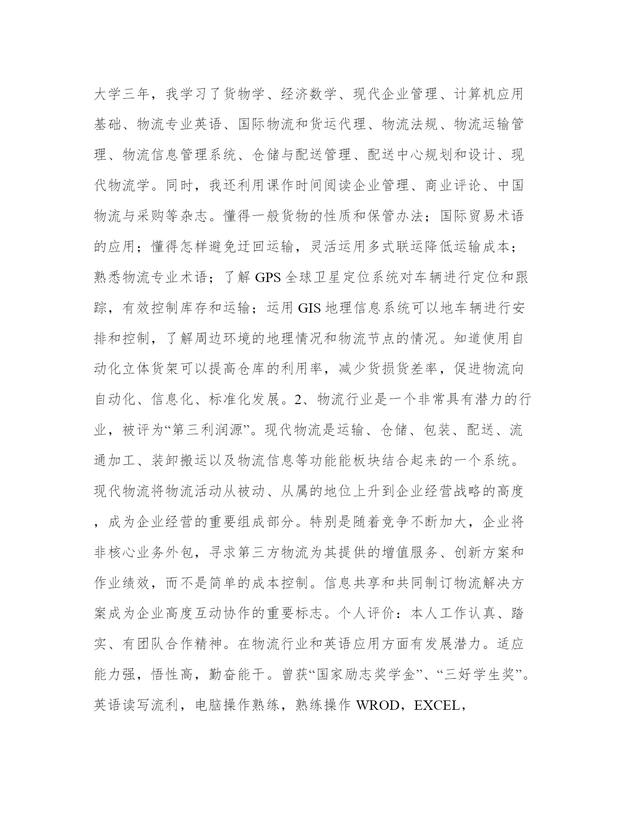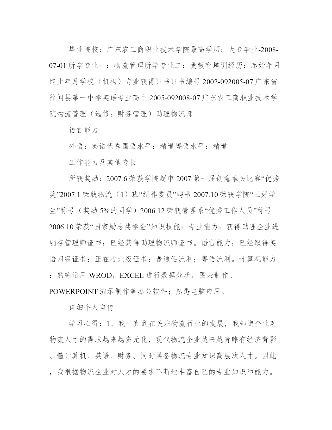 物流管理专业个人简历表格【中英文版】现代物流管理是建立在系统论、信息论和控制论上的专业学科。以下是小编整理的关于物流管理专业个人简历表格范文。欢迎大家参考。个人基本简历姓名:国籍:中国目前所在地:广州民族:汉族户口所在地:湛江身材:165cm51kg婚姻状况:未婚年龄:23岁培训认证:诚信徽章:求职意向及工作经历人才类型:普通求职应聘职位:物流类:物流助理、物流专员单证员单证文件操作外贸/贸易专员/助理外贸助理工作年限:1职称:无职称求职类型:全职可到职-随时月薪要求:1500--2000希望工作地区:广州广州广州个人工作经历:公司名称:学院实习超市起止年月:2006-09~2006-12公司性质:其它所属行业:其他担任职务:收银员兼销售员工作描述:负责收银与理货,掌握了POS系统操作,学会了商品销售和陈列。离职原因:实习期满公司名称:康佳集团起止年月:2005-05~2007-10公司性质:国有企业所属行业:电器,电子,通信设备担任职务:销售员工作描述:负责康佳彩电的销售。离职原因:兼职期满教育背景毕业院校:广东农工商职业技术学院最高学历:大专毕业-2008-07-01所学专业一:物流管理所学专业二:受教育培训经历:起始年月终止年月学校(机构)专业获得证书证书编号2002-092005-07广东省徐闻县第一中学英语专业高中2005-092008-07广东农工商职业技术学院物流管理(选修:财务管理)助理物流师语言能力外语:英语优秀国语水平:精通粤语水平:精通工作能力及其他专长所获奖励:2007.6荣获学院超市2007第一届创意堆头比赛“优秀奖”2007.1荣获物流(1)班“纪律委员”聘书2007.10荣获学院“三好学生”称号(奖励5%的同学)2006.12荣获管理系“优秀工作人员”称号2006.10荣获“国家励志奖学金”知识技能:专业能力:获得助理企业进销存管理师证书;已经获得助理物流师证书。语言能力:已经取得英语四级证书;正在考六级证书;普通话流利;粤语流利。计算机能力:熟练运用WROD,EXCEL进行数据分析,图表制作、POWERPOINT演示制作等办公软件;熟悉电脑应用。详细个人自传学习心得:1、我一直到在关注物流行业的发展,我知道企业对物流人才的需求越来越多元化,现代物流企业越来越青睐有经济背影、懂计算机、英语、财务、同时具备物流专业知识高层次人才。因此,我根据物流企业对人才的要求不断地丰富自己的专业知识和能力。大学三年,我学习了货物学、经济数学、现代企业管理、计算机应用基础、物流专业英语、国际物流和货运代理、物流法规、物流运输管理、物流信息管理系统、仓储与配送管理、配送中心规划和设计、现代物流学。同时,我还利用课作时间阅读企业管理、商业评论、中国物流与采购等杂志。懂得一般货物的性质和保管办法;国际贸易术语的应用;懂得怎样避免迂回运输,灵活运用多式联运降低运输成本;熟悉物流专业术语;了解GPS全球卫星定位系统对车辆进行定位和跟踪,有效控制库存和运输;运用GIS地理信息系统可以地车辆进行安排和控制,了解周边环境的地理情况和物流节点的情况。知道使用自动化立体货架可以提高仓库的利用率,减少货损货差率,促进物流向自动化、信息化、标准化发展。2、物流行业是一个非常具有潜力的行业,被评为“第三利润源”。现代物流是运输、仓储、包装、配送、流通加工、装卸搬运以及物流信息等功能能板块结合起来的一个系统。现代物流将物流活动从被动、从属的地位上升到企业经营战略的高度,成为企业经营的重要组成部分。特别是随着竞争不断加大,企业将非核心业务外包,寻求第三方物流为其提供的增值服务、创新方案和作业绩效,而不是简单的成本控制。信息共享和共同制订物流解决方案成为企业高度互动协作的重要标志。个人评价:本人工作认真、踏实、有团队合作精神。在物流行业和英语应用方面有发展潜力。适应能力强,悟性高,勤奋能干。曾获“国家励志奖学金”、“三好学生奖”。英语读写流利,电脑操作熟练,熟练操作WROD,EXCEL,POWERPOINT等办公软件。具备良好的语言表达能力,掌握物流知识和流程。期望月薪:1500元/月EnglishResume:resumeNAME:jintaowangSEX:FemaleDateofBirth:Oct281985BORN:XuWenGuangDongADDRESS:198YueKenRoadTianHeGuangZhouGRADUATIONSCHOOL:GuangDongNongGongShangVocationalTechnicalCollege.TELEPHOTO:13424049771MAILBOX:EDUCATION:collegeeducation(majorinlogisticsmanagement)--