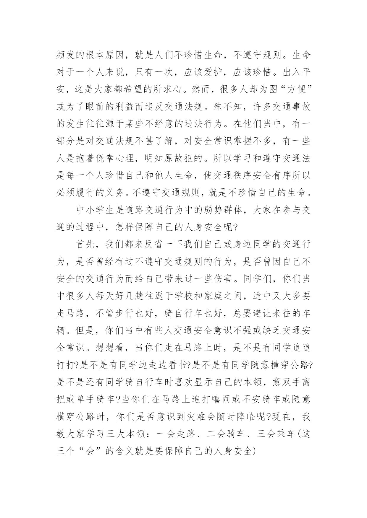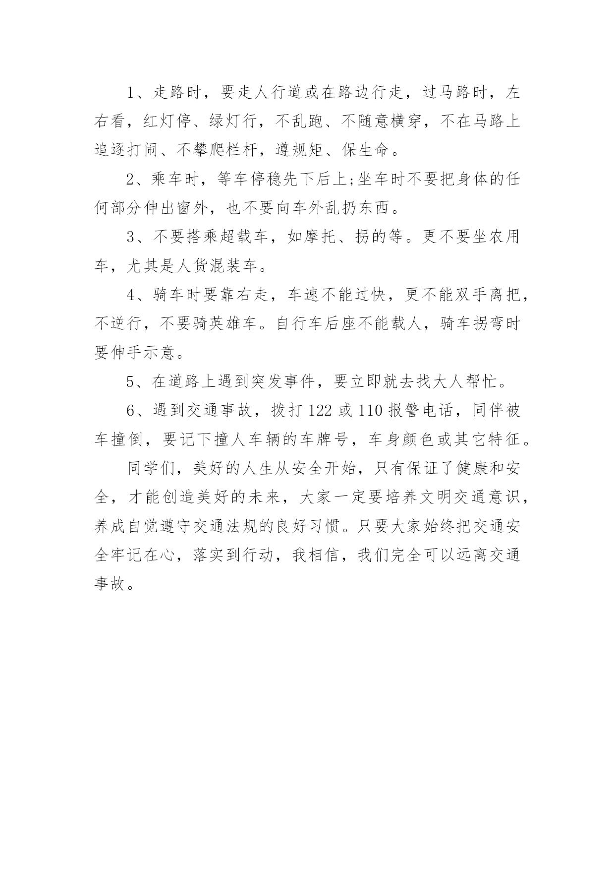 交通安全的广播稿[经典]关于交通安全的广播稿如果你是广播站的播音员,肯定会知道大家广播前一般都会提前做好广播稿,广播稿写得优秀才会有更好的广播效果,那么广播稿应该怎么写才合适呢?以下是小编整理的关于交通安全的广播稿,供大家参考借鉴,希望可以帮助到有需要的朋友。在这美丽的校园里,望着同学们一张张可爱的脸,看着同学们充满勃勃生机的身影,我们都会由衷地感叹:生命是多么美丽,世界是这样美好!今天,我广播的主题是:珍爱生命,安全出行。说起道路交通安全,我们便不能不提到道路交通事故。现在我向大家介绍一组数字:去年,世界交通事故死亡人数达50万人,其中中小学生占了10万多。而我国交通事故死亡人数则无法谦虚地排在了世界第一。我国每年交通事故死亡人数都在10万多人,平均每天死亡达300人,这真是一个比战争还要无情,还残酷的数字。在每一起交通事故背后,是一个个家庭失去了顶梁柱,是一个个白发人送走了黑发人,是一个个孩子与父母阴阳两隔。综观这么多起交通事故,我们不难发现,我国交通事故频发的根本原因,就是人们不珍惜生命,不遵守规则。生命对于一个人来说,只有一次,应该爱护,应该珍惜。出入平安,这是大家都希望的所求心。然而,很多人却为图“方便”或为了眼前的利益而违反交通法规。殊不知,许多交通事故的发生往往源于某些不经意的违法行为。在他们当中,有一部分是对交通法规不甚了解,对安全常识掌握不多,有一些人是抱着侥幸心理,明知原故犯的。所以学习和遵守交通法是每一个人珍惜自己和他人生命,使交通秩序安全有序所以必须履行的义务。不遵守交通规则,就是不珍惜自己的生命。中小学生是道路交通行为中的弱势群体,大家在参与交通的过程中,怎样保障自己的人身安全呢?首先,我们都来反省一下我们自己或身边同学的交通行为,是否曾经有过不遵守交通规则的行为,是否曾因自己不安全的交通行为而给自己带来过一些伤害。同学们,你们当中很多人每天好几趟往返于学校和家庭之间,途中又大多要走马路,不管步行也好,骑自行车也好,总要避让来往的车辆。但是,你们当中有些人交通安全意识不强或缺乏交通安全常识。想想看,当你们走在马路上时,是不是有同学追追打打?是不是有同学边走边看书?是不是有同学随意横穿公路?是不是还有同学骑自行车时喜欢显示自己的本领,意双手离把或单手骑车?当你们在马路上追打嘻闹或不安骑车或随意横穿公路时,你们是否意识到灾难会随时降临呢?现在,我教大家学习三大本领:一会走路、二会骑车、三会乘车(这三个“会”的含义就是要保障自己的人身安全)1、走路时,要走人行道或在路边行走,过马路时,左右看,红灯停、绿灯行,不乱跑、不随意横穿,不在马路上追逐打闹、不攀爬栏杆,遵规矩、保生命。2、乘车时,等车停稳先下后上;坐车时不要把身体的任何部分伸出窗外,也不要向车外乱扔东西。3、不要搭乘超载车,如摩托、拐的等。更不要坐农用车,尤其是人货混装车。4、骑车时要靠右走,车速不能过快,更不能双手离把,不逆行,不要骑英雄车。自行车后座不能载人,骑车拐弯时要伸手示意。5、在道路上遇到突发事件,要立即就去找大人帮忙。6、遇到交通事故,拨打122或110报警电话,同伴被车撞倒,要记下撞人车辆的车牌号,车身颜色或其它特征。同学们,美好的人生从安全开始,只有保证了健康和安全,才能创造美好的未来,大家一定要培养文明交通意识,养成自觉遵守交通法规的良好习惯。只要大家始终把交通安全牢记在心,落实到行动,我相信,我们完全可以远离交通事故。
