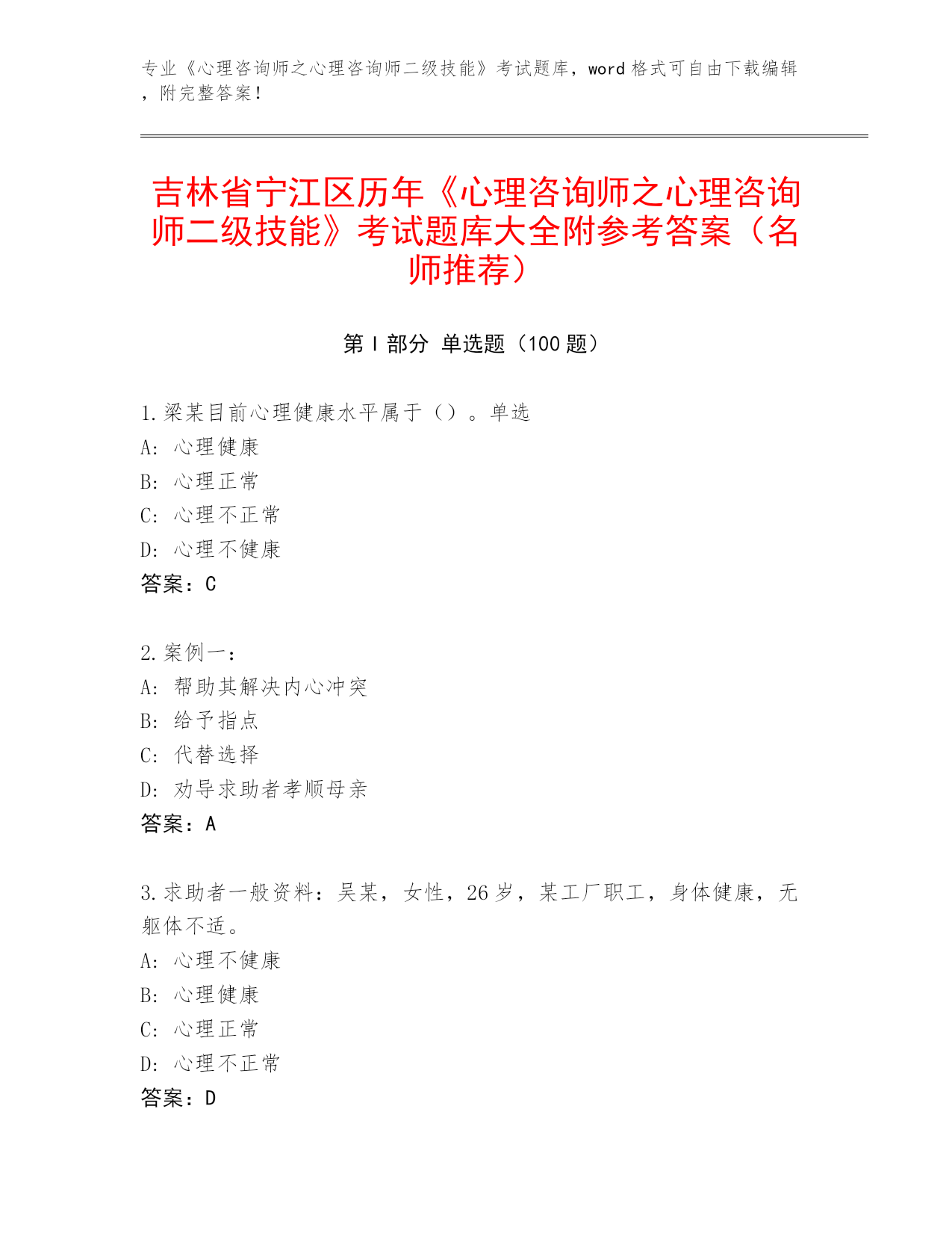 吉林省宁江区历年《心理咨询师之心理咨询师二级技能》考试题库大全附参考答案(名师推荐)