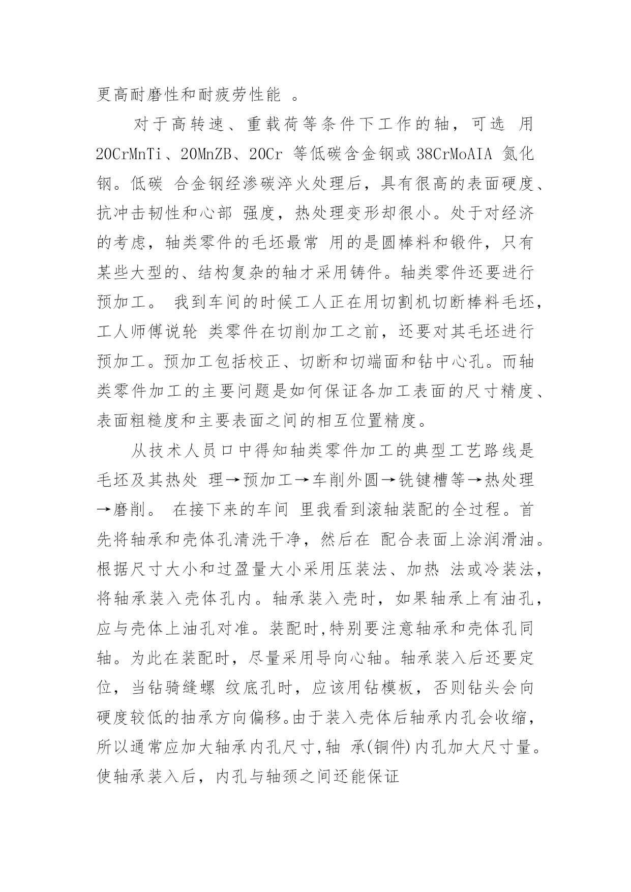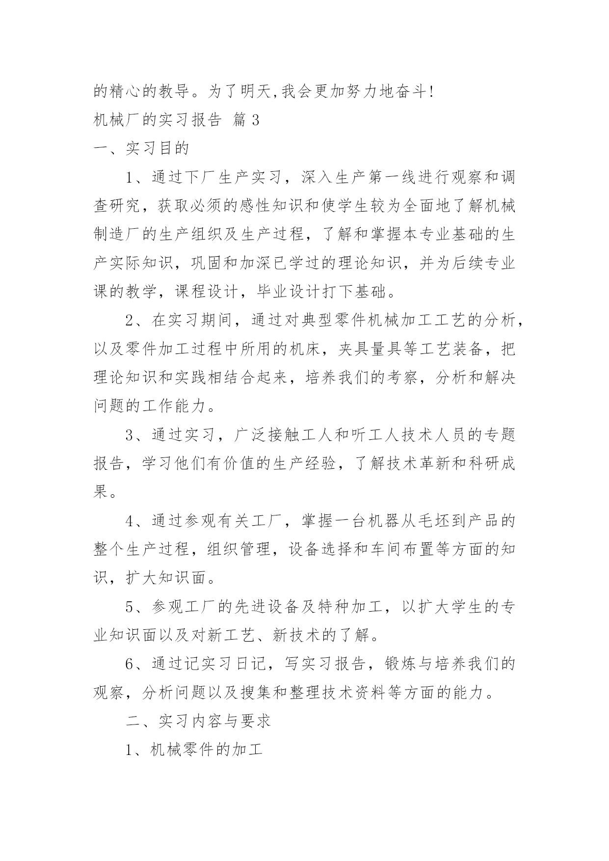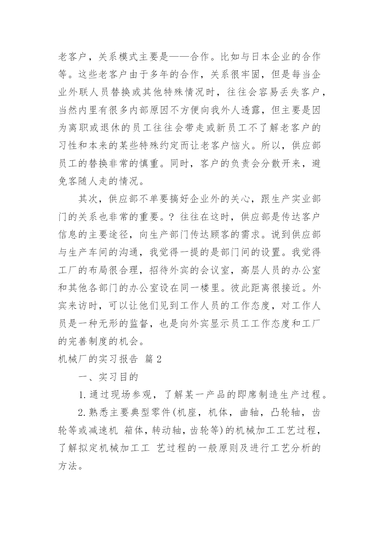 机械厂的实习报告机械厂的实习报告汇编5篇随着社会一步步向前发展,我们都不可避免地要接触到报告,不同的报告内容同样也是不同的。我们应当如何写报告呢?以下是小编为大家收集的机械厂的实习报告5篇,仅供参考,大家一起来看看吧。机械厂的实习报告篇1近几年来,大学生找工作不容易。寒假是我锻炼的一个机会,我找到了一家机械制造企业去锻炼自己,真是感到无名的兴奋和愉悦,体会到了大学生找工作的困难。我来到了恩华机械制造有限公司实习。虽然实习的时间短之又短,但是,获益良多。体会到作为一个工人的艰辛,还有了解到各个部门的协调工作的重要性。这是我人生经历的一部分啊。机械厂是两兄弟经历千辛万苦经营而来的,已经有二十多年的发展历史,以成为集研制、生产、销售、技术培训于一体,拥有高精度电脑控制机械加工中心等全套加工设备的大型专业包装设备制造厂。目前主要生产瓦楞纸箱机械,产品包括:自动和半自动轮转开槽切角机,全电脑高速水墨印刷开槽机、全电脑高速水墨印刷开槽模切机。还有与国际知名度高的企业日本机械株式会社合作生产高精度、高效率、先进的自动平压模切机等。该机械厂的组织机构设置很简练。主要是董事——秘书及会计——理管理各个部门。由于机械厂的设备很先进,在生产线上不会像往常的工厂那样满布工人,主要是某一两个人负责工作流程。这对我了解该工厂的生产流程提供了方便。该厂生产的纸箱机械的需求量很稳定,是属于定单供货型的生产。由于产品的质量要求和技术含量要求都很高,因此,生产周期也比较长,单次产品需求的数量也不大。同时,每台产品的价格非常昂贵,在万元以上。生产部门主要包括,采购,技术,生产,供应,销售。我被安排在供应部工作。但其工作并不是坐在办公室悠闲地写写东西,而是跟住部长随时跑,跑车间,甚至到外面去跑业务。实习期间,刚好该厂正赶货,生产进行得如火如荼。我在跟随供应部人员工作的时候,方才发现,供应这部门,在企业中极其重要。首先,供应部必须与往来企业打好交道。企业的供应部与下游企业的沟通好与坏,直接影响产品的最终销售。他直接影响企业生产运作系统运行,是“保证企业产品质量、价格、交货期和服务的关键因素之一”。公司的营销工作可以说是公司经营的核心内容,是各项工作的重中之重,营销工作的好坏,市场开发得成功与否直接关系到公司的存亡。我在实践过程中充分明白到了营销工作的重要性。恩华在xx年的营销工作有成绩,但不足也是明显的',其中的得失值得我去从思考。由于市场变化的剧烈程度远超出了公司的想象,对公司造成了严重的不利影响。我趁供应部的部长一有空,便向她问了很多很多的问题。她说,该厂的销售其实大部分由自家联系买家,不过主要是老客户,关系模式主要是——合作。比如与日本企业的合作等。这些老客户由于多年的合作,关系很牢固,但是每当企业外联人员替换或其他特殊情况时,往往会容易丢失客户,当然内里有很多内部原因不方便向我外人透露,但主要是因为离职或退休的员工往往会带走或新员工不了解老客户的习性和本来的某些特殊约定而让老客户恼火。所以,供应部员工的替换非常的慎重。同时,客户的负责会分散开来,避免客随人走的情况。其次,供应部不单要搞好企业外的关心,跟生产实业部门的关系也非常的重要。?往往在这时,供应部是传达客户信息的主要途径,向生产部门传达顾客的需求。说到供应部与生产车间的沟通,我觉得一提的是部门间的设置。我觉得工厂的布局很合理,招待外宾的会议室,高层人员的办公室和其他各部门的办公室设在同一楼里。彼此距离很接近。外宾来访时,可以让他们见到工作人员的工作态度,对工作人员是一种无形的监督,也是向外宾显示员工工作态度和工厂的完善制度的机会。机械厂的实习报告篇2一、实习目的1.通过现场参观,了解某一产品的即席制造生产过程。2.熟悉主要典型零件(机座,机体,曲轴,凸轮轴,齿轮等或减速机箱体,转动轴,齿轮等)的机械加工工艺过程,了解拟定机械加工工艺过程的一般原则及进行工艺分析的方法。3.了解典型零部件的装配工艺。4.了解一般刀、夹、量具的结构及使用方法。5.参观工厂计量室与车间检验,了解公差与测量技术在生产中的应用。6.参观工厂的先进设备及特种加工,以扩大学生的专业知识面以及对新工艺、新技术的了解。二、实习内容与要求1.机械制造的生产过程:了解该厂的主要机械设备的正个生产过程情况及生产中的主要工艺文件(如机械加工过程卡片、机械加工工序卡片等)。2.典型零件工艺1)箱体零件的加工:了解某机械设备机座、机体的机械加工方法,并纪录其工艺过程。分析箱体零件加工平面与孔系的主要加工方法。2)轴类零件的加工:了解轴类及其机械加工工艺并记录其工艺过程。了解某道工序的具体加工工艺(技术要求,刀、夹、量具,切削液等)。3)齿轮加工:了解一至两种齿轮的机械加工工艺,并记录其工艺过程,分析滚齿、插齿加工的运动及特点。结合工厂的参观,简述
