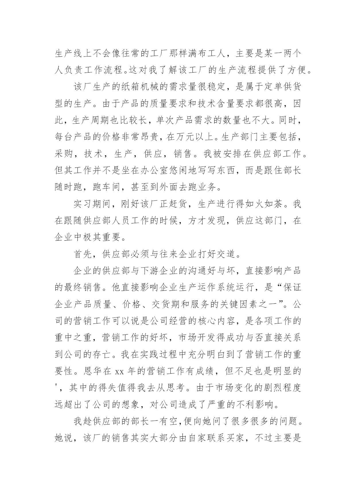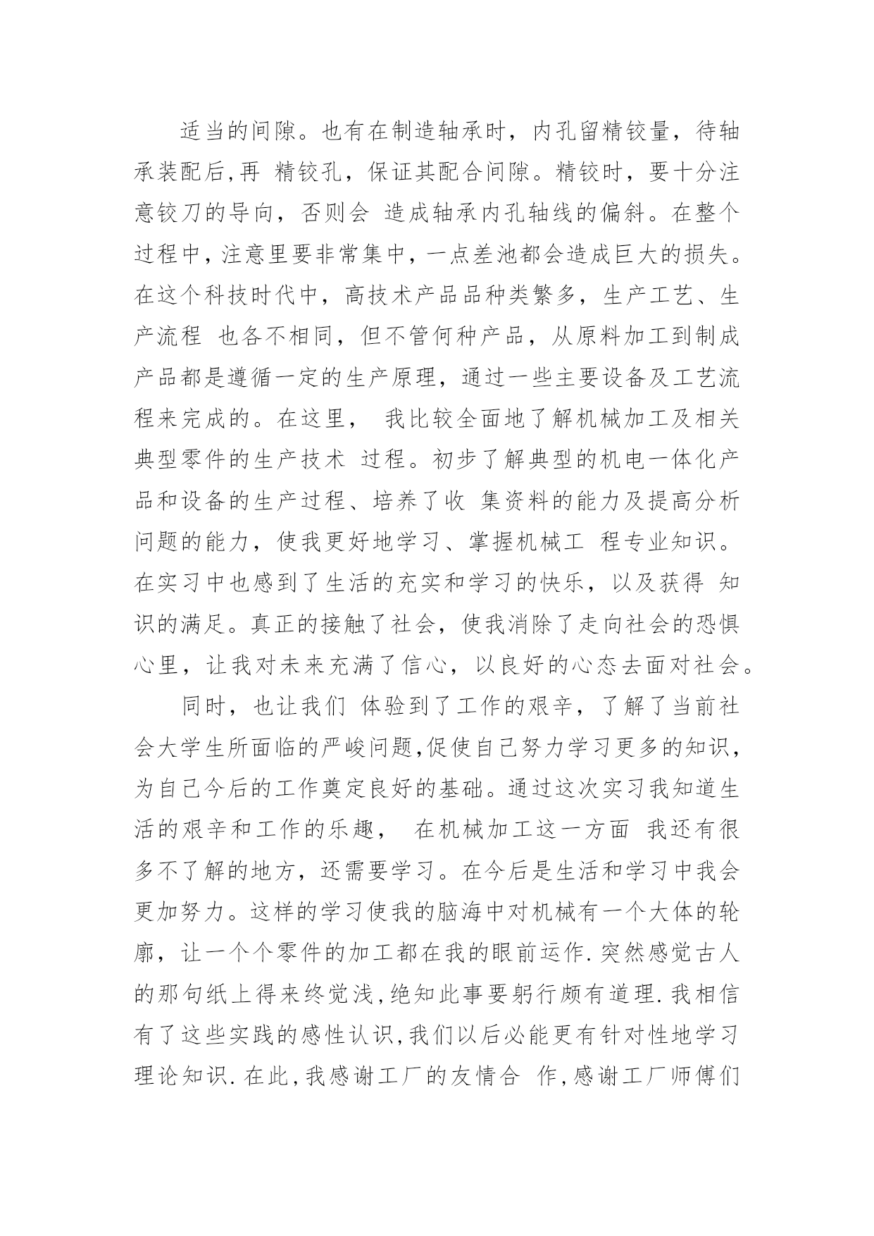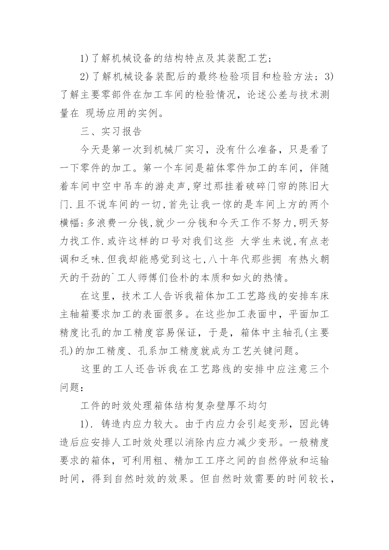 机械厂的实习报告机械厂的实习报告汇编5篇随着社会一步步向前发展,我们都不可避免地要接触到报告,不同的报告内容同样也是不同的。我们应当如何写报告呢?以下是小编为大家收集的机械厂的实习报告5篇,仅供参考,大家一起来看看吧。机械厂的实习报告篇1近几年来,大学生找工作不容易。寒假是我锻炼的一个机会,我找到了一家机械制造企业去锻炼自己,真是感到无名的兴奋和愉悦,体会到了大学生找工作的困难。我来到了恩华机械制造有限公司实习。虽然实习的时间短之又短,但是,获益良多。体会到作为一个工人的艰辛,还有了解到各个部门的协调工作的重要性。这是我人生经历的一部分啊。机械厂是两兄弟经历千辛万苦经营而来的,已经有二十多年的发展历史,以成为集研制、生产、销售、技术培训于一体,拥有高精度电脑控制机械加工中心等全套加工设备的大型专业包装设备制造厂。目前主要生产瓦楞纸箱机械,产品包括:自动和半自动轮转开槽切角机,全电脑高速水墨印刷开槽机、全电脑高速水墨印刷开槽模切机。还有与国际知名度高的企业日本机械株式会社合作生产高精度、高效率、先进的自动平压模切机等。该机械厂的组织机构设置很简练。主要是董事——秘书及会计——理管理各个部门。由于机械厂的设备很先进,在生产线上不会像往常的工厂那样满布工人,主要是某一两个人负责工作流程。这对我了解该工厂的生产流程提供了方便。该厂生产的纸箱机械的需求量很稳定,是属于定单供货型的生产。由于产品的质量要求和技术含量要求都很高,因此,生产周期也比较长,单次产品需求的数量也不大。同时,每台产品的价格非常昂贵,在万元以上。生产部门主要包括,采购,技术,生产,供应,销售。我被安排在供应部工作。但其工作并不是坐在办公室悠闲地写写东西,而是跟住部长随时跑,跑车间,甚至到外面去跑业务。实习期间,刚好该厂正赶货,生产进行得如火如荼。我在跟随供应部人员工作的时候,方才发现,供应这部门,在企业中极其重要。首先,供应部必须与往来企业打好交道。企业的供应部与下游企业的沟通好与坏,直接影响产品的最终销售。他直接影响企业生产运作系统运行,是“保证企业产品质量、价格、交货期和服务的关键因素之一”。公司的营销工作可以说是公司经营的核心内容,是各项工作的重中之重,营销工作的好坏,市场开发得成功与否直接关系到公司的存亡。我在实践过程中充分明白到了营销工作的重要性。恩华在xx年的营销工作有成绩,但不足也是明显的',其中的得失值得我去从思考。由于市场变化的剧烈程度远超出了公司的想象,对公司造成了严重的不利影响。我趁供应部的部长一有空,便向她问了很多很多的问题。她说,该厂的销售其实大部分由自家联系买家,不过主要是老客户,关系模式主要是——合作。比如与日本企业的合作等。这些老客户由于多年的合作,关系很牢固,但是每当企业外联人员替换或其他特殊情况时,往往会容易丢失客户,当然内里有很多内部原因不方便向我外人透露,但主要是因为离职或退休的员工往往会带走或新员工不了解老客户的习性和本来的某些特殊约定而让老客户恼火。所以,供应部员工的替换非常的慎重。同时,客户的负责会分散开来,避免客随人走的情况。其次,供应部不单要搞好企业外的关心,跟生产实业部门的关系也非常的重要。?往往在这时,供应部是传达客户信息的主要途径,向生产部门传达顾客的需求。说到供应部与生产车间的沟通,我觉得一提的是部门间的设置。我觉得工厂的布局很合理,招待外宾的会议室,高层人员的办公室和其他各部门的办公室设在同一楼里。彼此距离很接近。外宾来访时,可以让他们见到工作人员的工作态度,对工作人员是一种无形的监督,也是向外宾显示员工工作态度和工厂的完善制度的机会。机械厂的实习报告篇2一、实习目的1.通过现场参观,了解某一产品的即席制造生产过程。2.熟悉主要典型零件(机座,机体,曲轴,凸轮轴,齿轮等或减速机箱体,转动轴,齿轮等)的机械加工工艺过程,了解拟定机械加工工艺过程的一般原则及进行工艺分析的方法。3.了解典型零部件的装配工艺。4.了解一般刀、夹、量具的结构及使用方法。5.参观工厂计量室与车间检验,了解公差与测量技术在生产中的应用。6.参观工厂的先进设备及特种加工,以扩大学生的专业知识面以及对新工艺、新技术的了解。二、实习内容与要求1.机械制造的生产过程:了解该厂的主要机械设备的正个生产过程情况及生产中的主要工艺文件(如机械加工过程卡片、机械加工工序卡片等)。2.典型零件工艺1)箱体零件的加工:了解某机械设备机座、机体的机械加工方法,并纪录其工艺过程。分析箱体零件加工平面与孔系的主要加工方法。2)轴类零件的加工:了解轴类及其机械加工工艺并记录其工艺过程。了解某道工序的具体加工工艺(技术要求,刀、夹、量具,切削液等)。3)齿轮加工:了解一至两种齿轮的机械加工工艺,并记录其工艺过程,分析滚齿、插齿加工的运动及特点。结合工厂的参观,简述