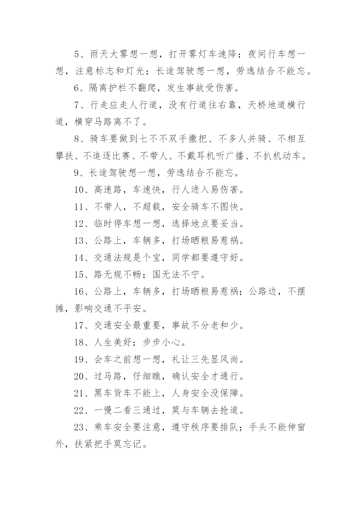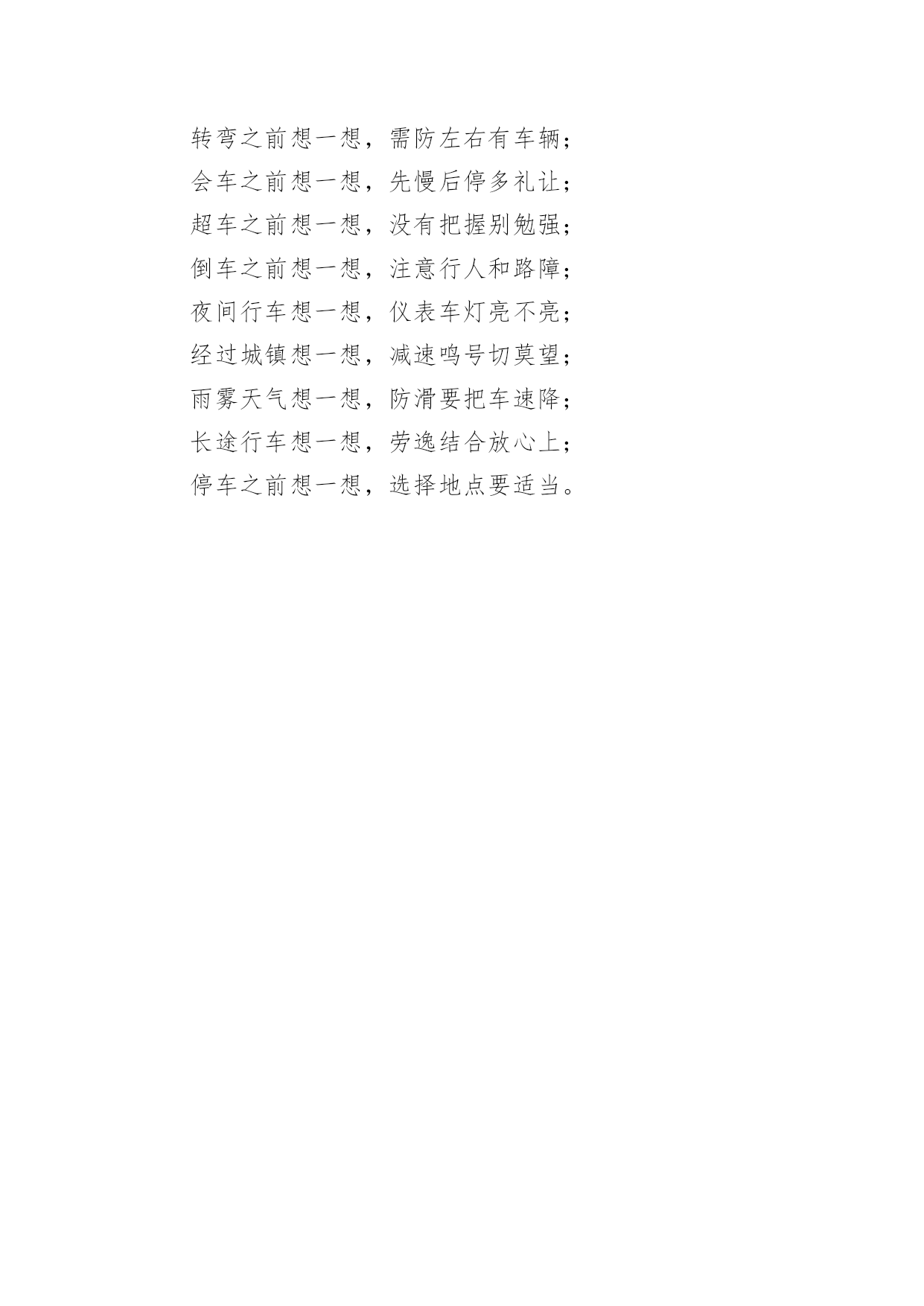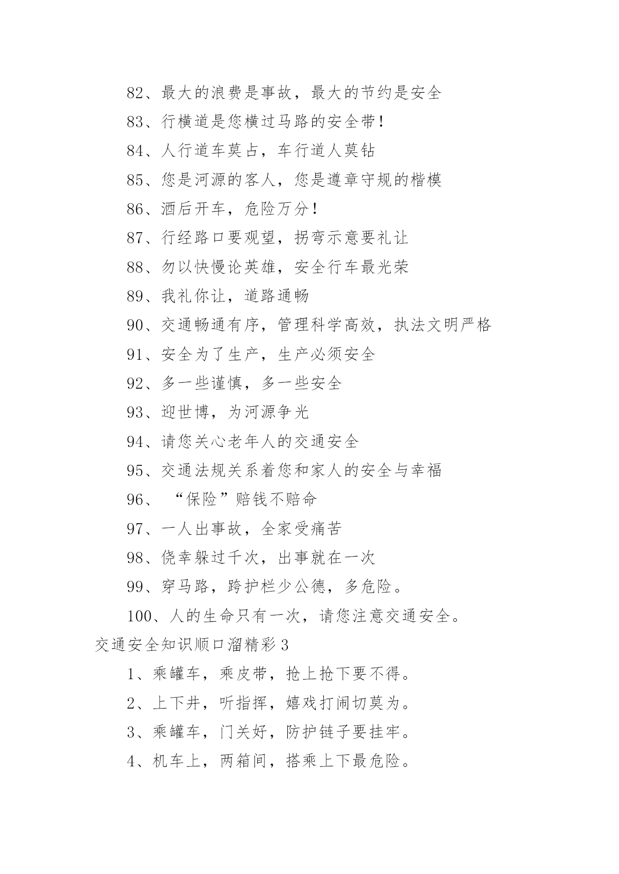 交通安全知识顺口溜精彩交通安全知识顺口溜精彩随着社会不断地进步,大家都接触过很多优秀的顺口溜吧,顺口溜使用得当甚至可以达到货卖清场的目的。那什么样的顺口溜才是大家都称赞的呢?以下是小编帮大家整理的交通安全知识顺口溜精彩,欢迎大家分享。交通安全知识顺口溜精彩11、铁马上路不带病,安全运输有保证;2、雨雾雪天上道口,了望好后再行走;3、各种车辆过道口,先看火车有没有;4、过道要等绿灯亮,行走必踏斑马线;5、开快车痛快一阵子,出事故后悔一辈子;6、酒后驾车,害人又害己;7、红灯亮,把车停,莫闯红灯保康平;8、黄灯亮,请注意,遵章守规要牢记;9、绿灯亮,请通行,安全行车座右铭;10、明天的安全,取决于今天的努力;交通安全知识顺口溜精彩21、乘车系好安全带,头手不伸车窗外。2、自行车应该经常检修,要保持铃响、闸灵。3、雨天大雾想一想,打开雾灯车速降。4、骑单车,看标志,切勿闯入汽车道。5、雨天大雾想一想,打开雾灯车速降;夜间行车想一想,注意标志和灯光;长途驾驶想一想,劳逸结合不能忘。6、隔离护栏不翻爬,发生事故受伤害。7、行走应走人行道,没有行道往右靠,天桥地道横行道,横穿马路离不了。8、骑车要做到七不不双手撒把、不多人并骑、不相互攀扶、不追逐比赛、不带人、不戴耳机听广播、不扒机动车。9、长途驾驶想一想,劳逸结合不能忘。10、高速路,车速快,行人进入易伤害。11、不带人,不超载,安全骑车不图快。12、临时停车想一想,选择地点要妥当。13、公路上,车辆多,打场晒粮易惹祸。14、交通法规是个宝,同学都要遵守好。15、路无规不畅;国无法不宁。16、公路上,车辆多,打场晒粮易惹祸;公路边,不摆摊,影响交通不平安。17、交通安全最重要,事故不分老和少。18、人生美好;步步小心。19、会车之前想一想,礼让三先显风尚。20、过马路,仔细瞧,确认安全才通行。21、黑车货车不能上,人身安全没保障。22、一慢二看三通过,莫与车辆去抢道。23、乘车安全要注意,遵守秩序要排队;手头不能伸窗外,扶紧把手莫忘记。24、会上、下车,会处理行车中的问题。25、过街要走横道线,或走天桥地下道;走路要走人行道,不在路上嬉戏闹。26、雨、雪、雾天骑车格外小心,要穿鲜艳的雨衣,要慢行。27、路口要看信号灯,红灯停止绿灯行。28、每天上学和离校,平平安安很重要。29、交通安全很重要,交通规则要牢记,从小养成好习惯,不在路上玩游戏。30、黑车货车不能上,人身安全没保障;无证驾驶违交法,购车要办车牌照;交通法规是个宝,走路行车要记牢;生命人人都珍惜,安全健康最重要。31、穿行闹市想一想,小心行人和车辆。32、骑自行车要在非机动车道上靠右边行驶。33、过街要走横道线,或走天桥地下道。34、出家门,路边走,交通法规要遵守。35、交通安全要记牢;路口要看信号灯,红灯停止绿灯行;过街要走斑马线,或走天桥地下道;走路要走人行道,骑车不进汽车道。36、拖拉机,低速车,只拉货物禁载客。37、候车要在站台上,文明乘车讲礼貌。38、金玉有值,生命无价,遵守交法,平安一生39、行走应走人行道,没有行道往右靠,天桥地道横行道,横穿马路不能做。40、交通安全最重要,事故不分老和少;路口要看信号灯,红灯停止绿灯行。41、拉客载货想一想,遵守规定不超量。42、行万里平安路;做百年长乐人。43、红灯停,绿灯行,交通信号要看清。44、站得稳步坐得好,紧急刹车危险少。45、夜间行车想一想,注意标志和灯光。46、超车之前想一想,没有把握不勉强。47、学交法,守交规,平安出行最安心。48、为了行车保安全,不与司机闲话聊。49、骑单车,看标志,切勿闯入汽车道;不带人,不超载,安全骑车不图快;出远门,乘汽车,不坐超员超载车。50、隔离护栏不翻爬,发生事故受伤害;候车要在站台上,骑车不进汽车道。51、出远门,乘汽车,不坐超员超载车。52、喝酒时候想一想,酒后驾车事故酿。53、牛马车,靠右走,交叉路口要牵行;赶牲口,放牛羊,上路行走不安全。54、开车之前想一想,交通法规记心上;交叉路口想一想,一看二慢三不抢;会车之前想一想,礼让三先显风尚;超车之前想一想,没有把握不勉强。55、创造良好交通环境。56、行人过马路不能斜穿也勿猛跑57、挣金山,挣银山,交通安全是靠山58、安全开车是大事,文明走路非小节59、骑车上路别着急,争超抢道不安全60、不开带病车上路61、行人一生平安,行车一路平安62、遵章守规连你我,道路畅通有保障63、交通法规是您生命之友!64、骑好车走好路安全伴您每一步65、遵守交通信号,遵守交通标志,遵守交通标线66、树立文明意识,搞好交通秩序67、违规是交通事故的祸根,侥幸是交通事故的隐患68、良药苦口利于病,交通规则利于行69、路好车好安全最好,慢行快行平安才行70、讲究交通公德,遵守交通法规71、车铃车闸齐