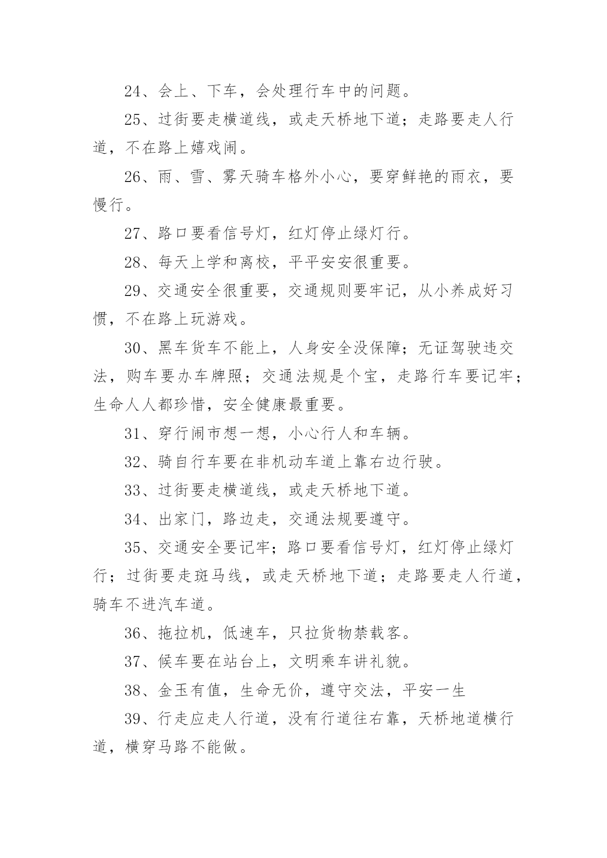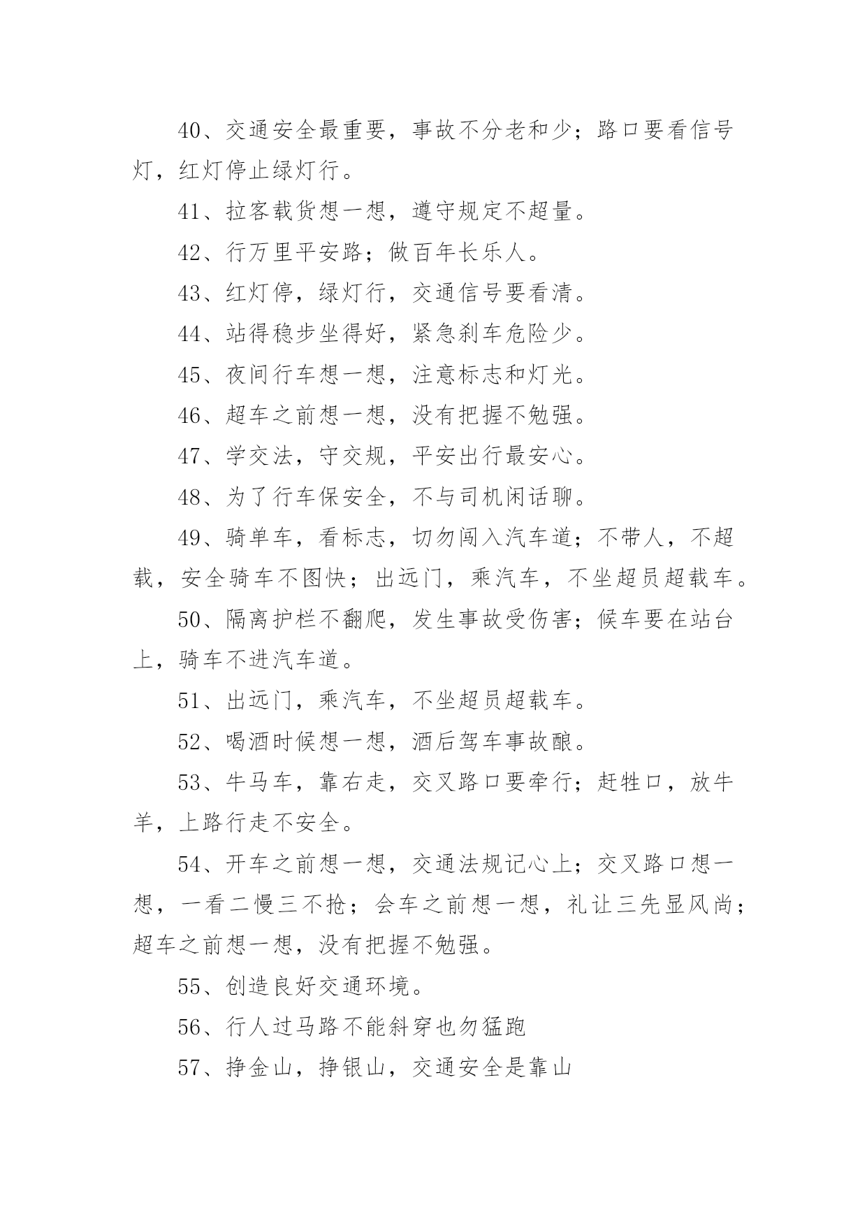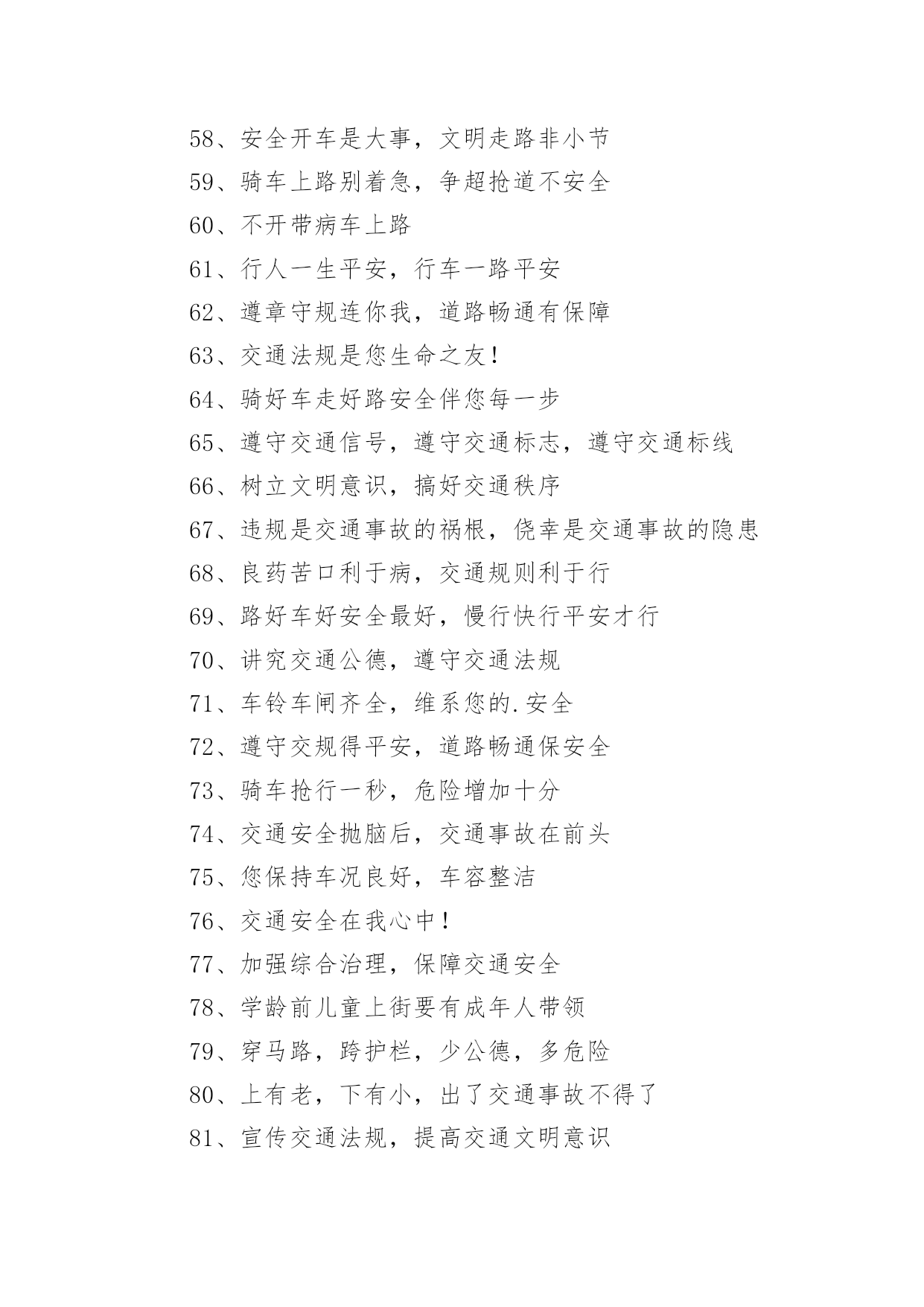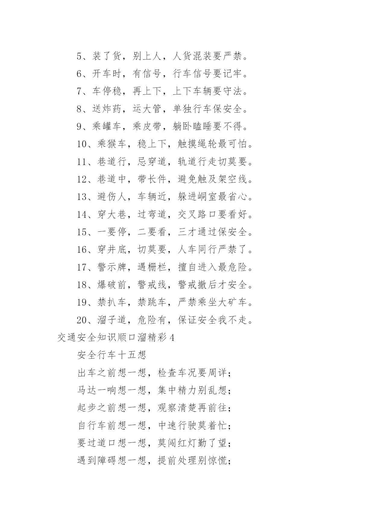 交通安全知识顺口溜精彩交通安全知识顺口溜精彩随着社会不断地进步,大家都接触过很多优秀的顺口溜吧,顺口溜使用得当甚至可以达到货卖清场的目的。那什么样的顺口溜才是大家都称赞的呢?以下是小编帮大家整理的交通安全知识顺口溜精彩,欢迎大家分享。交通安全知识顺口溜精彩11、铁马上路不带病,安全运输有保证;2、雨雾雪天上道口,了望好后再行走;3、各种车辆过道口,先看火车有没有;4、过道要等绿灯亮,行走必踏斑马线;5、开快车痛快一阵子,出事故后悔一辈子;6、酒后驾车,害人又害己;7、红灯亮,把车停,莫闯红灯保康平;8、黄灯亮,请注意,遵章守规要牢记;9、绿灯亮,请通行,安全行车座右铭;10、明天的安全,取决于今天的努力;交通安全知识顺口溜精彩21、乘车系好安全带,头手不伸车窗外。2、自行车应该经常检修,要保持铃响、闸灵。3、雨天大雾想一想,打开雾灯车速降。4、骑单车,看标志,切勿闯入汽车道。5、雨天大雾想一想,打开雾灯车速降;夜间行车想一想,注意标志和灯光;长途驾驶想一想,劳逸结合不能忘。6、隔离护栏不翻爬,发生事故受伤害。7、行走应走人行道,没有行道往右靠,天桥地道横行道,横穿马路离不了。8、骑车要做到七不不双手撒把、不多人并骑、不相互攀扶、不追逐比赛、不带人、不戴耳机听广播、不扒机动车。9、长途驾驶想一想,劳逸结合不能忘。10、高速路,车速快,行人进入易伤害。11、不带人,不超载,安全骑车不图快。12、临时停车想一想,选择地点要妥当。13、公路上,车辆多,打场晒粮易惹祸。14、交通法规是个宝,同学都要遵守好。15、路无规不畅;国无法不宁。16、公路上,车辆多,打场晒粮易惹祸;公路边,不摆摊,影响交通不平安。17、交通安全最重要,事故不分老和少。18、人生美好;步步小心。19、会车之前想一想,礼让三先显风尚。20、过马路,仔细瞧,确认安全才通行。21、黑车货车不能上,人身安全没保障。22、一慢二看三通过,莫与车辆去抢道。23、乘车安全要注意,遵守秩序要排队;手头不能伸窗外,扶紧把手莫忘记。24、会上、下车,会处理行车中的问题。25、过街要走横道线,或走天桥地下道;走路要走人行道,不在路上嬉戏闹。26、雨、雪、雾天骑车格外小心,要穿鲜艳的雨衣,要慢行。27、路口要看信号灯,红灯停止绿灯行。28、每天上学和离校,平平安安很重要。29、交通安全很重要,交通规则要牢记,从小养成好习惯,不在路上玩游戏。30、黑车货车不能上,人身安全没保障;无证驾驶违交法,购车要办车牌照;交通法规是个宝,走路行车要记牢;生命人人都珍惜,安全健康最重要。31、穿行闹市想一想,小心行人和车辆。32、骑自行车要在非机动车道上靠右边行驶。33、过街要走横道线,或走天桥地下道。34、出家门,路边走,交通法规要遵守。35、交通安全要记牢;路口要看信号灯,红灯停止绿灯行;过街要走斑马线,或走天桥地下道;走路要走人行道,骑车不进汽车道。36、拖拉机,低速车,只拉货物禁载客。37、候车要在站台上,文明乘车讲礼貌。38、金玉有值,生命无价,遵守交法,平安一生39、行走应走人行道,没有行道往右靠,天桥地道横行道,横穿马路不能做。40、交通安全最重要,事故不分老和少;路口要看信号灯,红灯停止绿灯行。41、拉客载货想一想,遵守规定不超量。42、行万里平安路;做百年长乐人。43、红灯停,绿灯行,交通信号要看清。44、站得稳步坐得好,紧急刹车危险少。45、夜间行车想一想,注意标志和灯光。46、超车之前想一想,没有把握不勉强。47、学交法,守交规,平安出行最安心。48、为了行车保安全,不与司机闲话聊。49、骑单车,看标志,切勿闯入汽车道;不带人,不超载,安全骑车不图快;出远门,乘汽车,不坐超员超载车。50、隔离护栏不翻爬,发生事故受伤害;候车要在站台上,骑车不进汽车道。51、出远门,乘汽车,不坐超员超载车。52、喝酒时候想一想,酒后驾车事故酿。53、牛马车,靠右走,交叉路口要牵行;赶牲口,放牛羊,上路行走不安全。54、开车之前想一想,交通法规记心上;交叉路口想一想,一看二慢三不抢;会车之前想一想,礼让三先显风尚;超车之前想一想,没有把握不勉强。55、创造良好交通环境。56、行人过马路不能斜穿也勿猛跑57、挣金山,挣银山,交通安全是靠山58、安全开车是大事,文明走路非小节59、骑车上路别着急,争超抢道不安全60、不开带病车上路61、行人一生平安,行车一路平安62、遵章守规连你我,道路畅通有保障63、交通法规是您生命之友!64、骑好车走好路安全伴您每一步65、遵守交通信号,遵守交通标志,遵守交通标线66、树立文明意识,搞好交通秩序67、违规是交通事故的祸根,侥幸是交通事故的隐患68、良药苦口利于病,交通规则利于行69、路好车好安全最好,慢行快行平安才行70、讲究交通公德,遵守交通法规71、车铃车闸齐