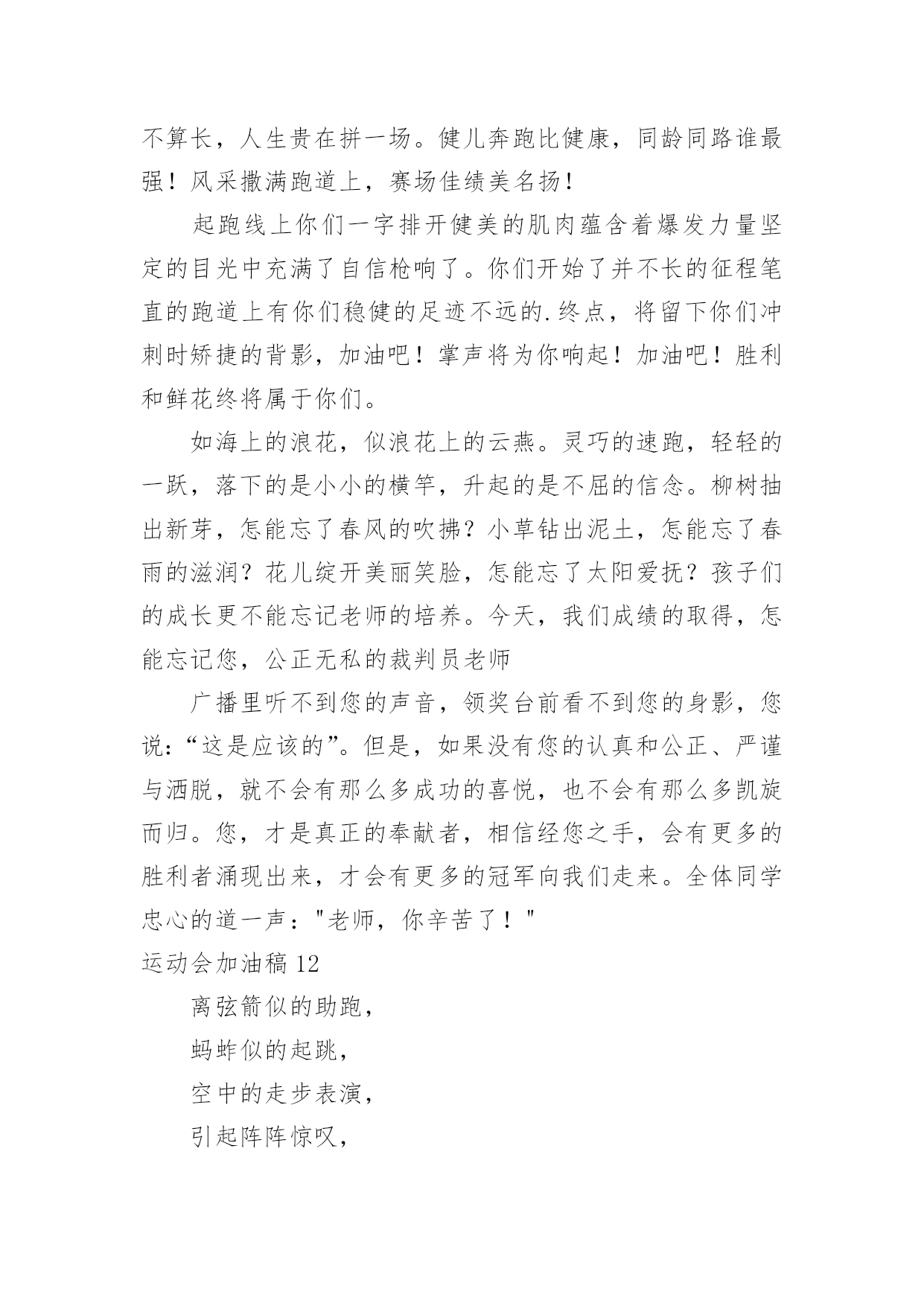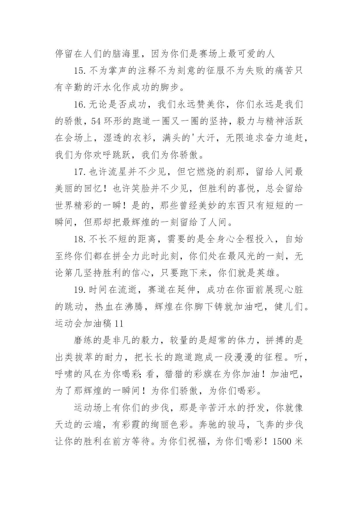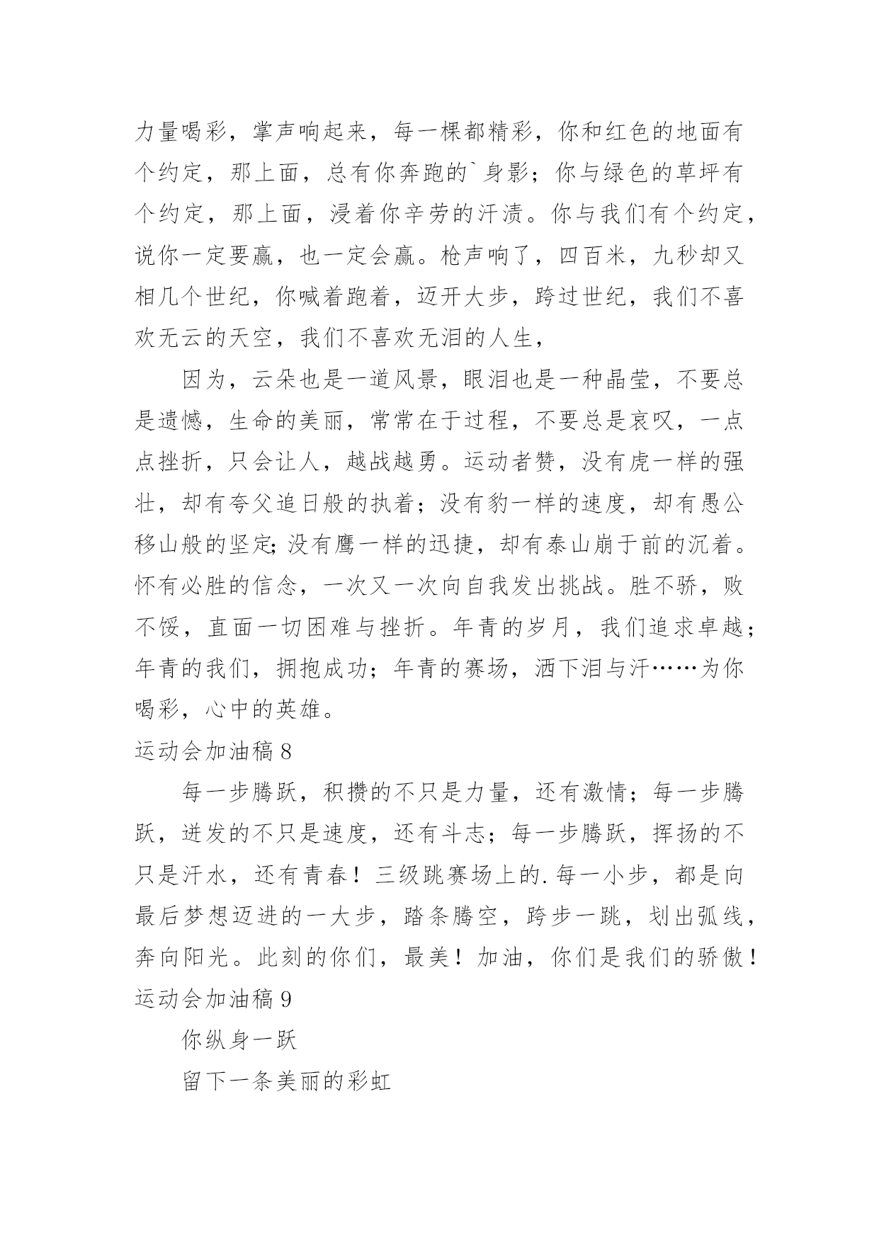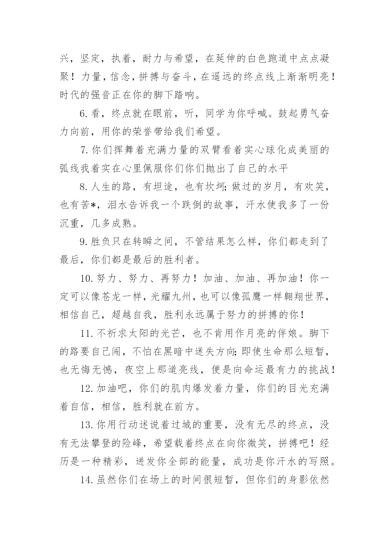 运动会加油稿运动会加油稿实用(15篇)在日常生活和工作中,很多情况下我们需要用到加油稿,借助加油稿可以更好地为他人加油打气。怎么写加油稿才能避免踩雷呢?以下是小编为大家收集的运动会加油稿,仅供参考,大家一起来看看吧。运动会加油稿1你和红色的地面有个约定,那上方,总有你奔跑的身影;你与绿色的草坪有个约定,那上方,浸着你辛劳的汗渍。你与我们有个约定,说你必须要赢,也必须会赢。你喊着跑着,迈开大步,跨过世纪。我们相信你——某某某。你是否感到,烈日的照射,那是烈日对你的祝福;你是否感到,彩旗的摇摆,那是彩旗对你的.呐喊;你是否感到人们的注视,那是人们对你的希望,祝福在你身边,呐喊在你耳边,希望在你心中。xx的健儿,愿你们一展雄风,勇夺桂冠!枪声响起,轻轻的一抬脚,便牵动了全场的目光,潇洒的挥挥手,便满足了那一份无言的等待。迎着朝阳,你们踏歌而去,背着希望,我们等待你们的归来。阳光不会永远灿烂,没有一成不变的幸福,磨难或许是上苍赐予我们的礼物,用来考验我们的意志,如果是这样,就让我们微笑着面对生活。你是体育宝座上的一颗灿烂夺目的珍珠,你是在蓝天中展翅飞翔的雏鹰。不要怕失败,不要怕冷落,无论何时,我们以你为荣。运动会加油稿2不长不短的距离,需要的是全身心全程投入,自始至终你们都在拼全力此时此刻,你们处在最风光的一刻,无论第几坚持胜利的信心,只要跑下来,你们就是英雄。青春的脚步,青春的速度,青春的.活力,青春的激情,将会在你们的身上尽情体现。迎接自我,挑战自我,战胜自我!我们相信你们一定能行,加油吧,运动员!终点就在眼前!汗水,泪水;笑声,歌声;我们尽情挥洒。开幕式上,运动场上,我们尽情展现,多少艰辛,多少困苦,我们勇敢承担。因为年轻,因为张扬,因为我们知道:用今天的汗水换来明天的微笑。运动会加油稿3加油吧,运动健儿们!阵阵有力的步伐,声声有劲的呐喊,运动场上洒下我们青春的点点滴滴。旗摇摇,鼓声声,这里挡不助的是青春活力;枪声响起,“预备起跑”,挡不助的是健儿们如火般的气势。英雄舍我其谁,胜利当仁不让,声声誓言浸透着健儿们的昂扬斗志。朋友们,为运动健儿们喝彩,为运动喝彩吧!场上精彩纷呈,空气里的每一个分子浸透着自信。高二(9)班的我要高喊一声:“这里无限精彩!”步子迈开,让我们飞驰在红色跑道上,用我们的'泪水和热血,更改历史的记录,起立吧,歌唱吧!为我们的勇士加油!致失败者倒下的时候,生命又怎能屹立!歪歪斜斜的身影,又怎耐的住风雨的洗礼。你若有一个不屈的灵魂,脚下才会有一方坚实的土地。昨天的失败已经过去,胜利不仅仅是一个美好的话题。运动会加油稿41、以勇求改,以改求变,以变求进。2、心中坚定的信念,脚下沉稳的步伐,你用行动告诉我们一个不变之理,没有走不完的路,没有过不了的山。3、青春的脚步,青春的速度,青春的活力,青春的活力,将会在你们的身上尽情体现。4、你的风姿,你的.呼吸还有你呼啸而过的飓风,今日注定是属于你的日子,今日你注定将要创造辉煌。5、不为掌声的诠释,不为刻意的征服。6、迎接自我,挑战自我,战胜自我!我们相信你们一定能行,加油吧,运动员!终点就在眼前!7、鸣奏青春旋律,抒写运动乐意!8、立志创新校记录,勇夺奥运第一枚。9、青春如火,超越自我,×年×班,奋勇拼搏。运动会加油稿5每一次腾空,都迸发出力量。每一次腾空,都孕育着成长。每一次腾空,都书写着激昂。让花季的心情挥洒一片绮丽的'彩霞,让青春的理想谱写出一段美妙的乐章。我们知道,你一直在拼搏,请你相信,撒一路汗水,将收获无尽希望。加油吧,运动员!运动会加油稿6当沙坑就要等你去征服的那一瞬间;时间停止,空气凝固,每一个人的嘴里、心里,都在竭力呐喊。这呐喊,成为这瞬间,最激动人心的呼声,最振奋人心的感动,相信自己,星光照耀下的是成功的喜悦,黯然退却的是失败的痛楚,挥之不去的是自责的泪水,垂首洒落的是一点一滴的心酸,就让一切在风中熏干,褪去的是灰暗的.记忆,回复的依然是——灿烂的理想。相信自己,天空中飞翔仍旧是无法挥去的期盼,健步腾飞,冲向终点之路不再遥远;英姿飒爽,诚挚欢呼之声因你嘹亮;奋勇冲刺,宽阔天空之美更加湛蓝。运动健儿们,我们为你欢呼,脚下红色的跑道是你驰骋的战场。每一个健美操步都倾泻激情,每一滴汗水都凝聚硕果,每一个动作都孕育完美。啊!激情澎湃,血液沸腾。释放心中积蓄的豪情,敞开钦慕的心扉,我们尽情欢呼。运动健将们,终点就在眼前,加油,加油!成功就在脚下。运动会加油稿7我只愿——致观看者,我只愿做一片落叶,去点缀金黄的秋天;我只愿做一颗恒星,去装饰耀眼的星河,我只愿做一棵小草,去充实五彩的世界,我只愿坐在场边,同你们分享喜悦,努力吧,拼搏吧,无论何时何地,都会有我在你的身边,观众席上掌声雷动,热热烈烈划破长空,他们的灵魂在叫,血在烧,都是渴望有无限的希望,掌声响起来为新