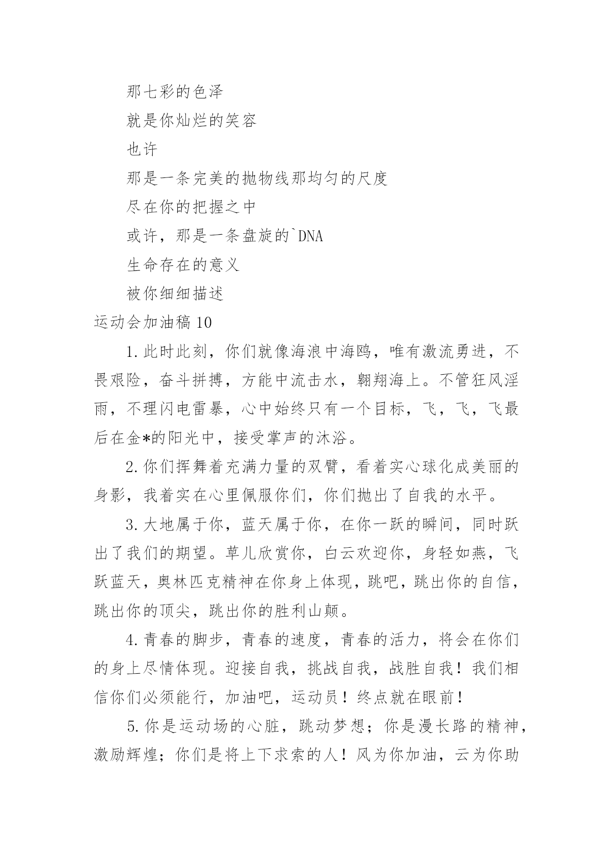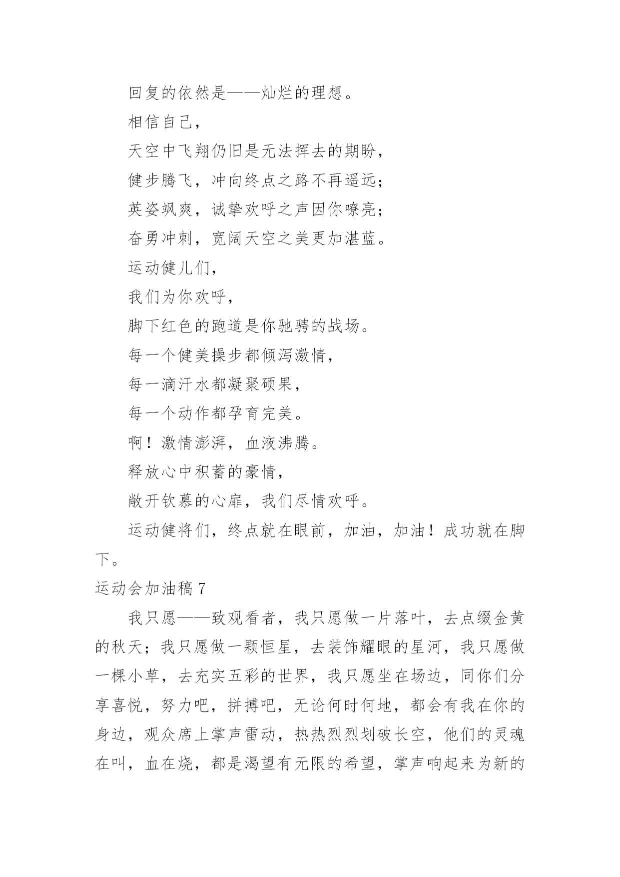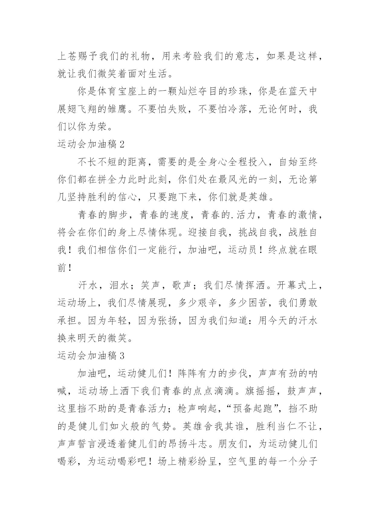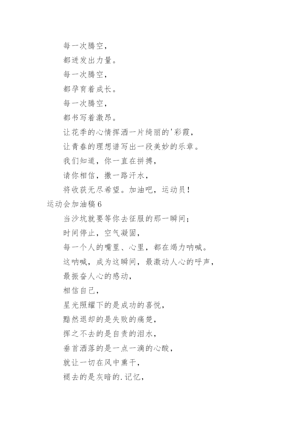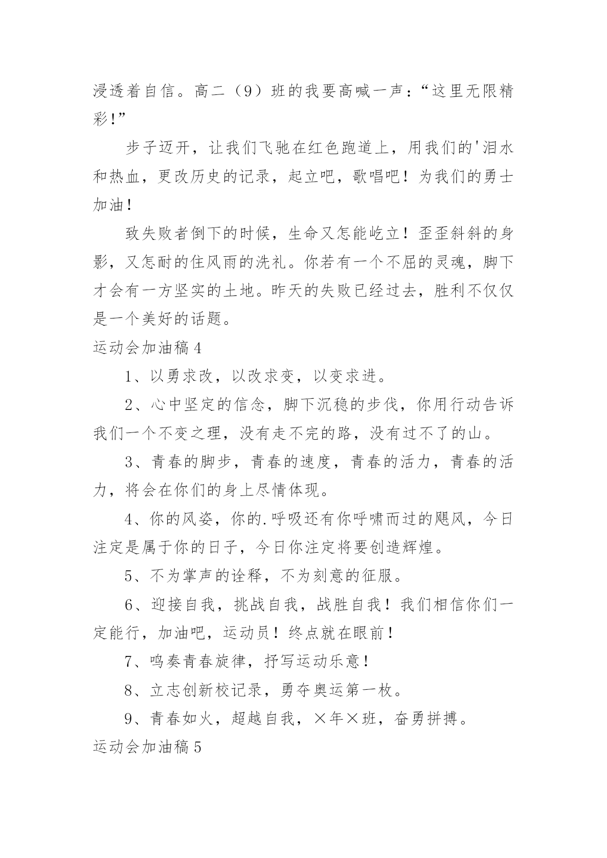 运动会加油稿运动会加油稿实用(15篇)在日常生活和工作中,很多情况下我们需要用到加油稿,借助加油稿可以更好地为他人加油打气。怎么写加油稿才能避免踩雷呢?以下是小编为大家收集的运动会加油稿,仅供参考,大家一起来看看吧。运动会加油稿1你和红色的地面有个约定,那上方,总有你奔跑的身影;你与绿色的草坪有个约定,那上方,浸着你辛劳的汗渍。你与我们有个约定,说你必须要赢,也必须会赢。你喊着跑着,迈开大步,跨过世纪。我们相信你——某某某。你是否感到,烈日的照射,那是烈日对你的祝福;你是否感到,彩旗的摇摆,那是彩旗对你的.呐喊;你是否感到人们的注视,那是人们对你的希望,祝福在你身边,呐喊在你耳边,希望在你心中。xx的健儿,愿你们一展雄风,勇夺桂冠!枪声响起,轻轻的一抬脚,便牵动了全场的目光,潇洒的挥挥手,便满足了那一份无言的等待。迎着朝阳,你们踏歌而去,背着希望,我们等待你们的归来。阳光不会永远灿烂,没有一成不变的幸福,磨难或许是上苍赐予我们的礼物,用来考验我们的意志,如果是这样,就让我们微笑着面对生活。你是体育宝座上的一颗灿烂夺目的珍珠,你是在蓝天中展翅飞翔的雏鹰。不要怕失败,不要怕冷落,无论何时,我们以你为荣。运动会加油稿2不长不短的距离,需要的是全身心全程投入,自始至终你们都在拼全力此时此刻,你们处在最风光的一刻,无论第几坚持胜利的信心,只要跑下来,你们就是英雄。青春的脚步,青春的速度,青春的.活力,青春的激情,将会在你们的身上尽情体现。迎接自我,挑战自我,战胜自我!我们相信你们一定能行,加油吧,运动员!终点就在眼前!汗水,泪水;笑声,歌声;我们尽情挥洒。开幕式上,运动场上,我们尽情展现,多少艰辛,多少困苦,我们勇敢承担。因为年轻,因为张扬,因为我们知道:用今天的汗水换来明天的微笑。运动会加油稿3加油吧,运动健儿们!阵阵有力的步伐,声声有劲的呐喊,运动场上洒下我们青春的点点滴滴。旗摇摇,鼓声声,这里挡不助的是青春活力;枪声响起,“预备起跑”,挡不助的是健儿们如火般的气势。英雄舍我其谁,胜利当仁不让,声声誓言浸透着健儿们的昂扬斗志。朋友们,为运动健儿们喝彩,为运动喝彩吧!场上精彩纷呈,空气里的每一个分子浸透着自信。高二(9)班的我要高喊一声:“这里无限精彩!”步子迈开,让我们飞驰在红色跑道上,用我们的'泪水和热血,更改历史的记录,起立吧,歌唱吧!为我们的勇士加油!致失败者倒下的时候,生命又怎能屹立!歪歪斜斜的身影,又怎耐的住风雨的洗礼。你若有一个不屈的灵魂,脚下才会有一方坚实的土地。昨天的失败已经过去,胜利不仅仅是一个美好的话题。运动会加油稿41、以勇求改,以改求变,以变求进。2、心中坚定的信念,脚下沉稳的步伐,你用行动告诉我们一个不变之理,没有走不完的路,没有过不了的山。3、青春的脚步,青春的速度,青春的活力,青春的活力,将会在你们的身上尽情体现。4、你的风姿,你的.呼吸还有你呼啸而过的飓风,今日注定是属于你的日子,今日你注定将要创造辉煌。5、不为掌声的诠释,不为刻意的征服。6、迎接自我,挑战自我,战胜自我!我们相信你们一定能行,加油吧,运动员!终点就在眼前!7、鸣奏青春旋律,抒写运动乐意!8、立志创新校记录,勇夺奥运第一枚。9、青春如火,超越自我,×年×班,奋勇拼搏。运动会加油稿5每一次腾空,都迸发出力量。每一次腾空,都孕育着成长。每一次腾空,都书写着激昂。让花季的心情挥洒一片绮丽的'彩霞,让青春的理想谱写出一段美妙的乐章。我们知道,你一直在拼搏,请你相信,撒一路汗水,将收获无尽希望。加油吧,运动员!运动会加油稿6当沙坑就要等你去征服的那一瞬间;时间停止,空气凝固,每一个人的嘴里、心里,都在竭力呐喊。这呐喊,成为这瞬间,最激动人心的呼声,最振奋人心的感动,相信自己,星光照耀下的是成功的喜悦,黯然退却的是失败的痛楚,挥之不去的是自责的泪水,垂首洒落的是一点一滴的心酸,就让一切在风中熏干,褪去的是灰暗的.记忆,回复的依然是——灿烂的理想。相信自己,天空中飞翔仍旧是无法挥去的期盼,健步腾飞,冲向终点之路不再遥远;英姿飒爽,诚挚欢呼之声因你嘹亮;奋勇冲刺,宽阔天空之美更加湛蓝。运动健儿们,我们为你欢呼,脚下红色的跑道是你驰骋的战场。每一个健美操步都倾泻激情,每一滴汗水都凝聚硕果,每一个动作都孕育完美。啊!激情澎湃,血液沸腾。释放心中积蓄的豪情,敞开钦慕的心扉,我们尽情欢呼。运动健将们,终点就在眼前,加油,加油!成功就在脚下。运动会加油稿7我只愿——致观看者,我只愿做一片落叶,去点缀金黄的秋天;我只愿做一颗恒星,去装饰耀眼的星河,我只愿做一棵小草,去充实五彩的世界,我只愿坐在场边,同你们分享喜悦,努力吧,拼搏吧,无论何时何地,都会有我在你的身边,观众席上掌声雷动,热热烈烈划破长空,他们的灵魂在叫,血在烧,都是渴望有无限的希望,掌声响起来为新
