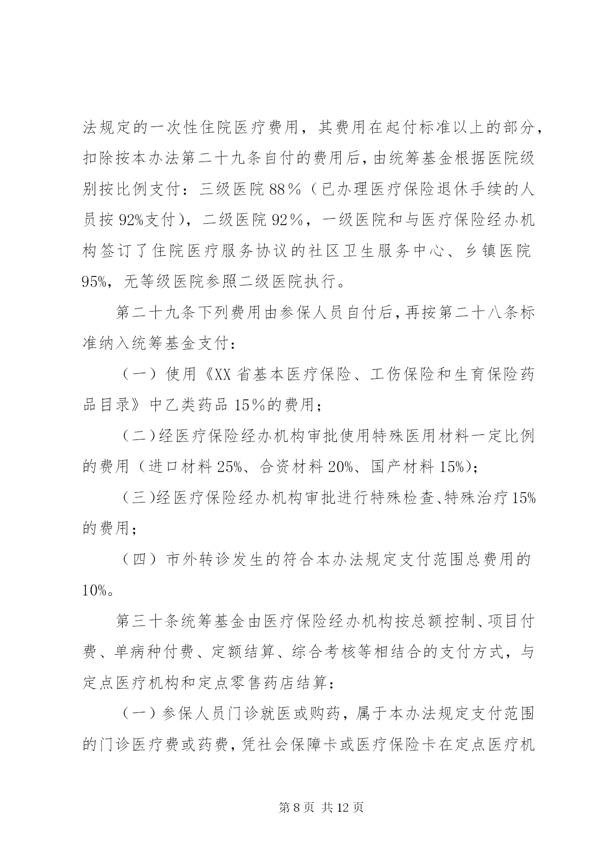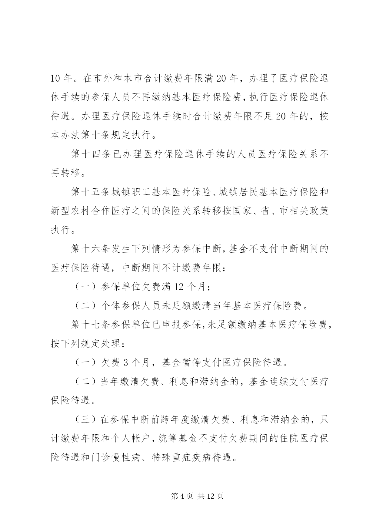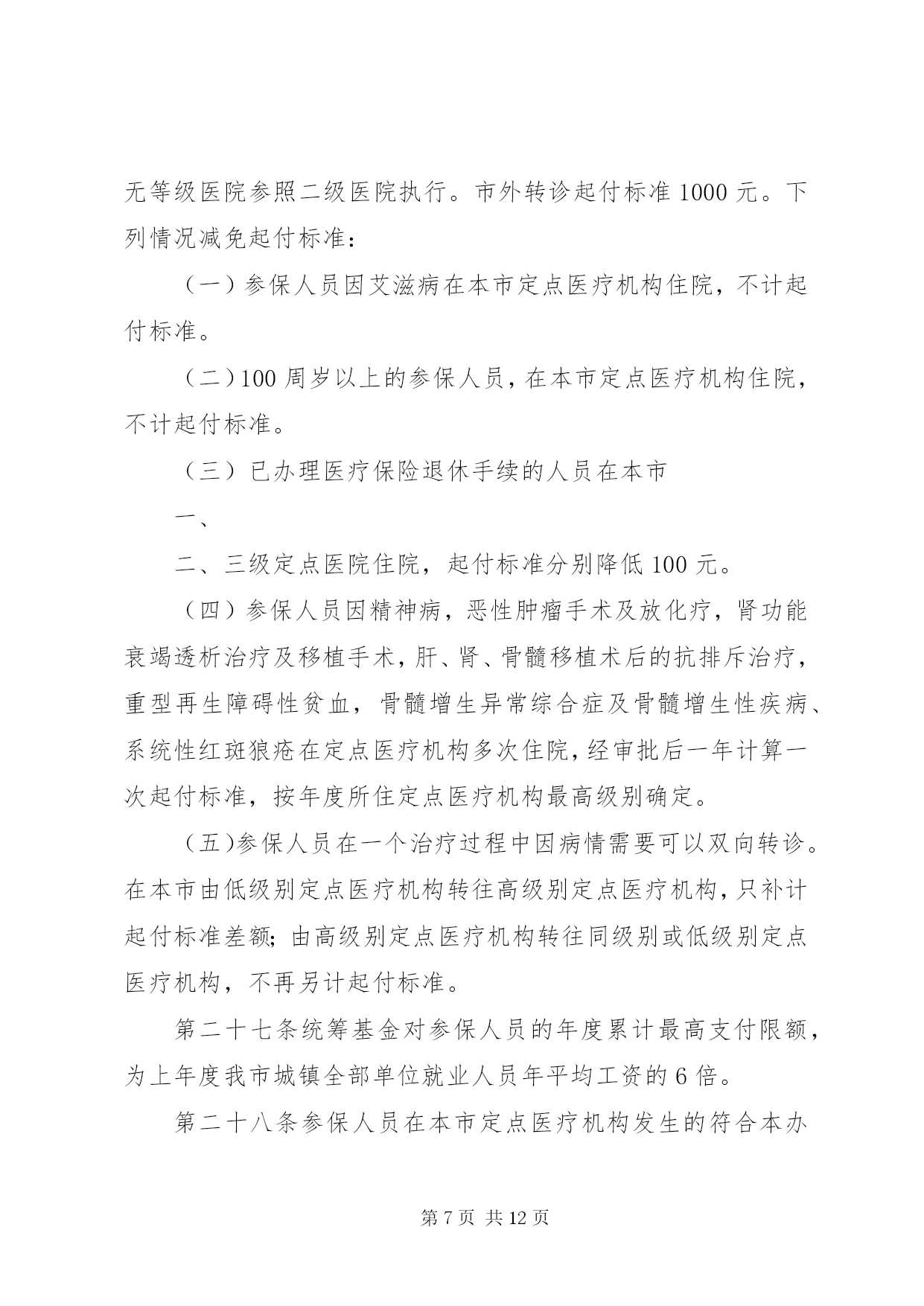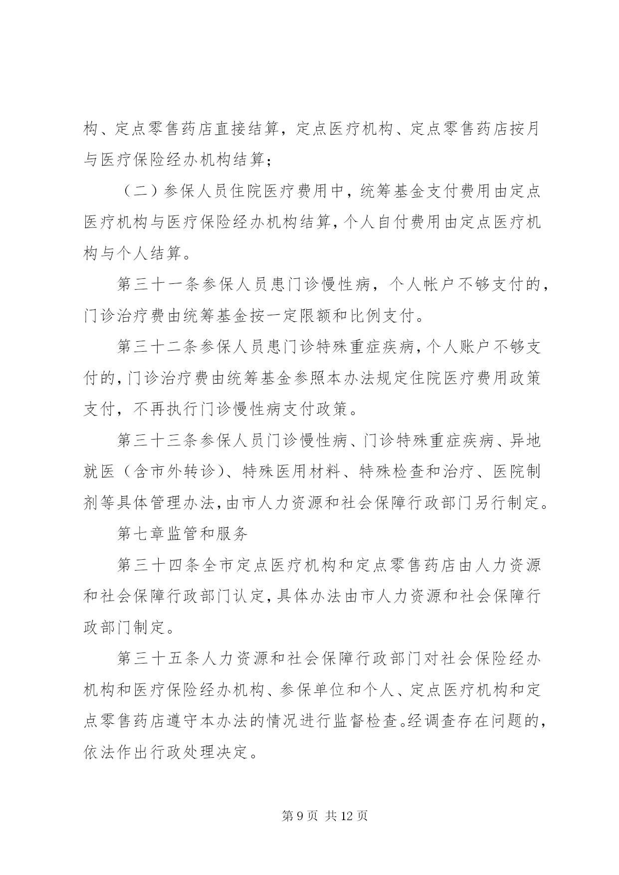 第PAGE\*Arabic\*MERGEFORMAT12页共NUMPAGES\*MERGEFORMAT12页中山基本医疗保险办法**市城镇职工基本医疗保险办法第一章总则第一条为保障城镇职工基本医疗需求,规范城镇职工基本医疗保险管理,根据《中华人民共和国社会保险法》、《国务院关于建立城镇职工基本医疗保险制度的决定》和《XX省贯彻的意见》,结合XX市实际,制定本办法。第二条遵循以下原则:(一)保险水平与社会经济发展水平相适应;(二)基金管理以收定支,收支平衡,略有节余;(三)效率与公平相统一。(四)全市统一参保范围、统一缴费标准、统一待遇水平、统一管理办法、统一信息系统。第三条市人力资源和社会保障行政部门负责全市城镇职工基本医疗保险行政管理工作。县市区人力资源和社会保障行政部门负责本行政区域内城镇职工基本医疗保险行政管理工作。市XX县区市区、园区社会保险经办机构、医疗保险经办机构依照各自职责办理城镇职工基本医疗保险业务。第四条本市行政区域内的下列单位和人员,应参加城镇职工基本医疗保险:(一)企业、机关、事业单位、社会团体、民办非企业单位及其职工、退休人员;(二)无雇工的个体工商户、非全日制从业人员以及其他灵活就业人员(以下简称个体参保人员);(三)法律、法规规定或经省、市政府批准的其他单位和人员。第二章基金管理第五条基本医疗保险基金纳入社会保障基金财政专户管理,任何单位和个人不得挪用。收支情况按同级财政行政部门和上级社会保险经办机构规定报送报表。社会保险经办机构、医疗保险经办机构用于医疗保险业务的工作经费由同级财政预算安排。人力资源和社会保障行政部门、财政行政部门对基金进行监督管理;审计行政部门定期对医疗保险基金收支和管理情况进行审计。第六条基本医疗保险基金由统筹基金和个人账户两部分组成,分别核算、互不挤占。个人帐户由职工个人缴纳费用和单位缴纳费用划转部分组成,单位其余缴纳费用划入统筹基金。第七条基本医疗保险基金出现超支,各级人力资源和社会保障行政部门、财政行政部门及时向同级政府报告,由政府采取措施予以解决。第八条统筹基金按政策计息,利息部分纳入统筹基金管理。第三章基金征缴第九条单位在职职工基本医疗保险费由单位和职工共同缴纳。缴费基数以上上年全市城镇非私营单位在岗职工年平均工资(以下简称上上年市平工资)为最低缴费基数据实缴纳,单位缴费率为7%;职工缴费率为2%,由所在单位代扣代缴。个体参保人员以上上年市平工资为缴费基数,缴费率为9%。第十条累计缴费年限满20年,办理了医疗保险退休手续的参保人员不再缴纳基本医疗保险费,执行医疗保险退休待遇。办理医疗保险退休手续时缴费不足20年的参保人员,以办理医疗保险退休手续当年缴费基数的7%为标准,由单位或个人一次性趸缴补足20年,不再缴纳基本医疗保险费,执行医疗保险退休待遇。不愿一次性趸缴的,经本人申请,经办机构审核后,不缴纳一次性趸缴费用,终止其城镇职工基本医疗保险关系。第十一条参保单位和职工按月缴纳基本医疗保险费。个体参保人员于每年6月30日前缴纳全年基本医疗保险费。第十二条参保人员在本市重复缴费的,退还其多缴费用。第四章关系转移、中断和欠费处理第十三条市内未办理医疗保险退休手续的参保人员医疗保险关系转移时,只转移参保关系和个人帐户,缴费年限互认。从市外转入本市的参保人员,只转移参保关系和个人帐户,其原参保地区的缴费年限可以接续,在本市必须实际足额缴费满10年。在市外和本市合计缴费年限满20年,办理了医疗保险退休手续的参保人员不再缴纳基本医疗保险费,执行医疗保险退休待遇。办理医疗保险退休手续时合计缴费年限不足20年的,按本办法第十条规定执行。第十四条已办理医疗保险退休手续的人员医疗保险关系不再转移。第十五条城镇职工基本医疗保险、城镇居民基本医疗保险和新型农村合作医疗之间的保险关系转移按国家、省、市相关政策执行。第十六条发生下列情形为参保中断,基金不支付中断期间的医疗保险待遇,中断期间不计缴费年限:(一)参保单位欠费满12个月;(二)个体参保人员未足额缴清当年基本医疗保险费。第十七条参保单位已申报参保,未足额缴纳基本医疗保险费,按下列规定处理:(一)欠费3个月,基金暂停支付医疗保险待遇。(二)当年缴清欠费、利息和滞纳金的,基金连续支付医疗保险待遇。(三)在参保中断前跨年度缴清欠费、利息和滞纳金的,只计缴费年限和个人帐户,统筹基金不支付欠费期间的住院医疗保险待遇和门诊慢性病、特殊重症疾病待遇。第十八条个体参保人员在规定期限未足额缴纳基本医疗保险费的,基金暂停支付医疗保险待遇。第十九条军队转业、复员退役到地方工作的人员,自办理安置手续之日起3个月内接续医疗保险关系,从在我市办理参保和缴费手续之日起支付医疗保险待遇;超过上述期限接续医疗保险关系的,视为参保中断。第二十条初次