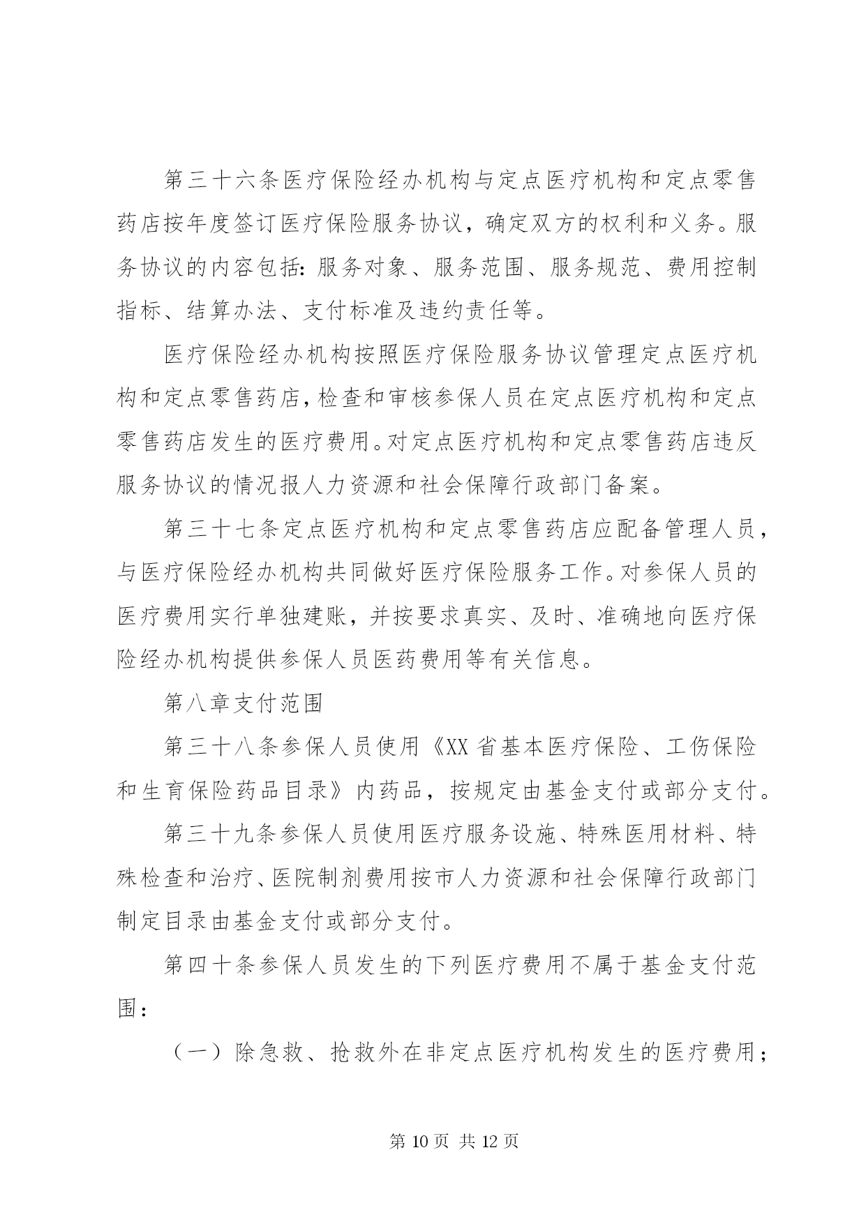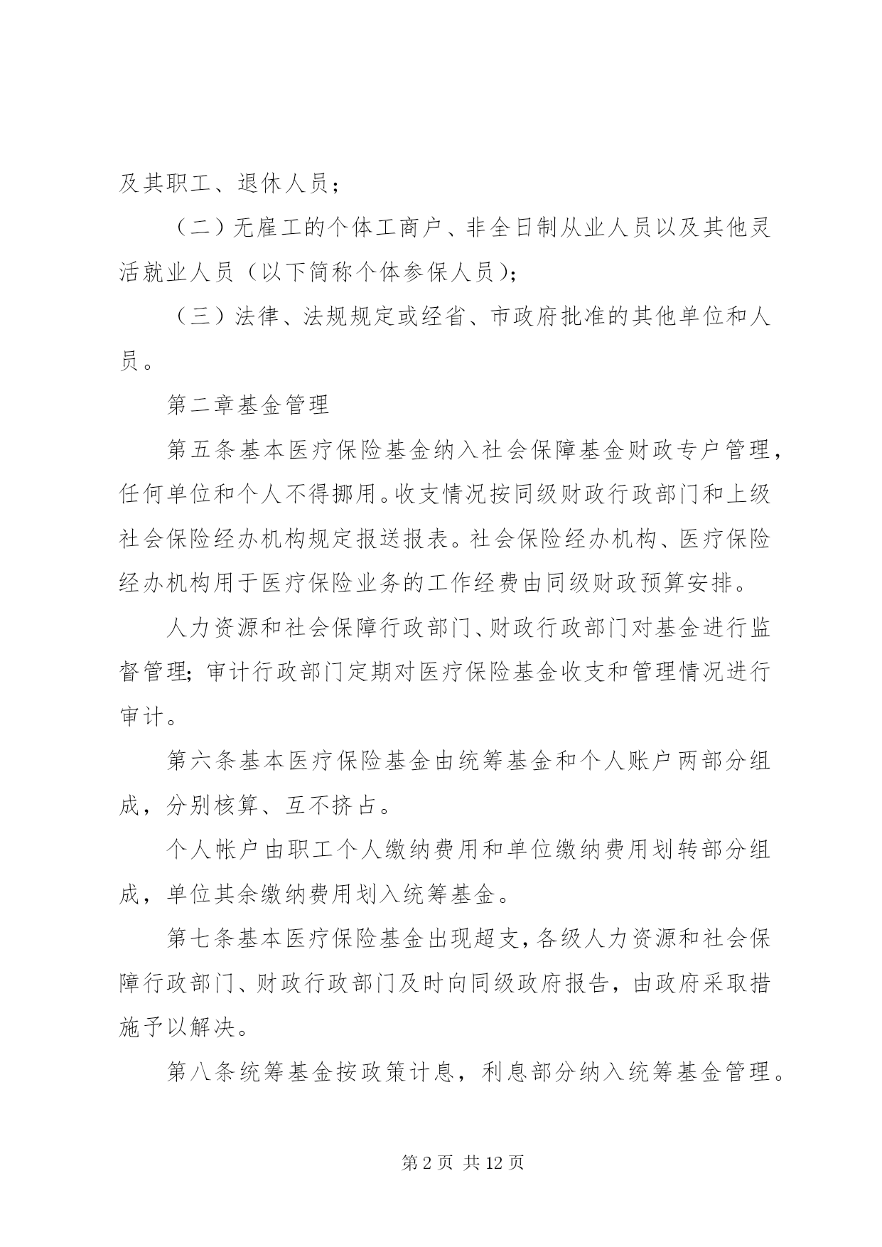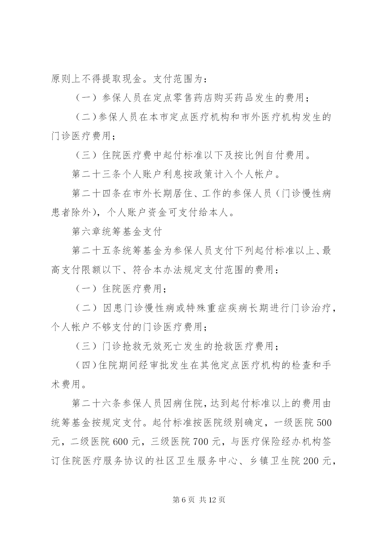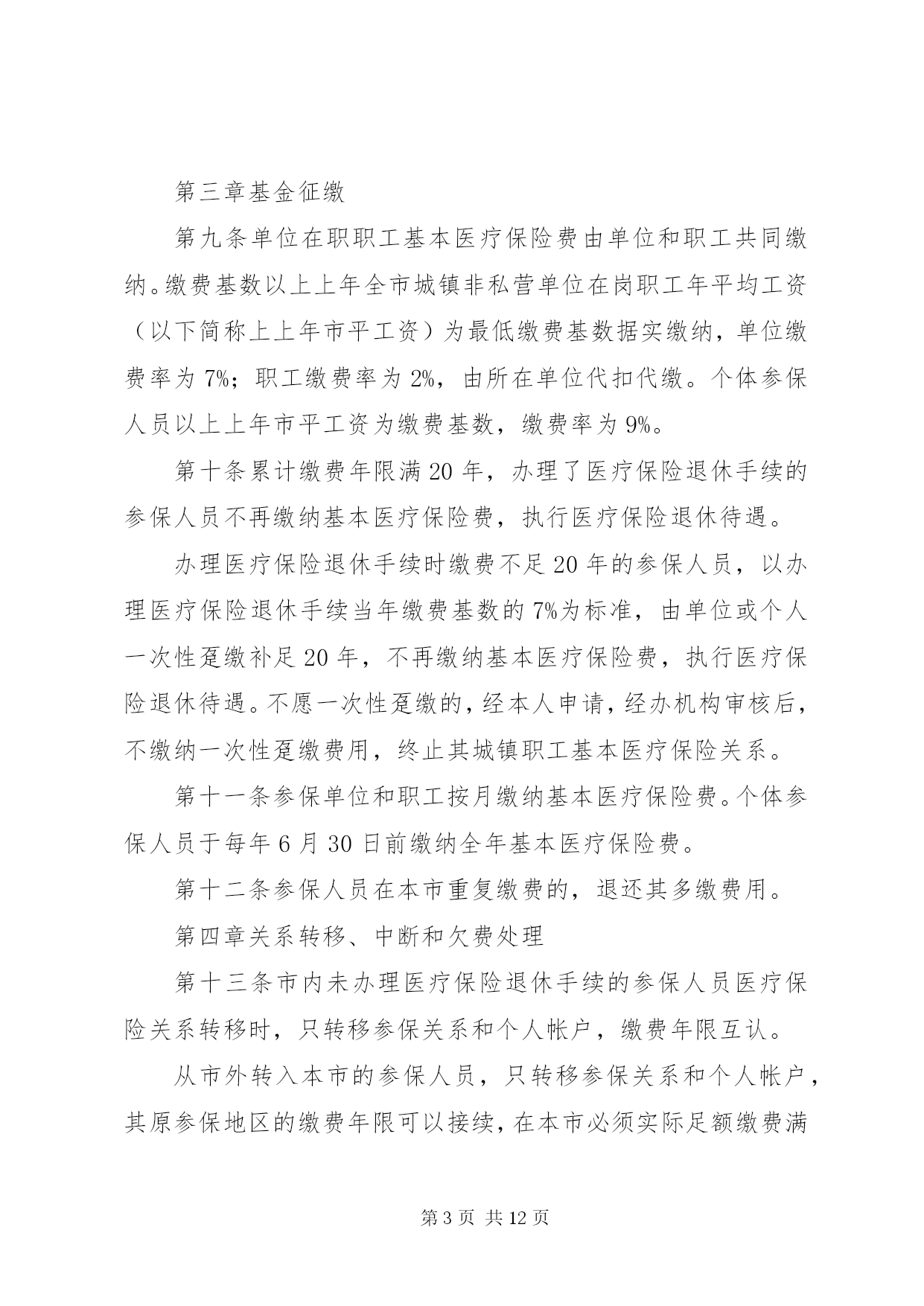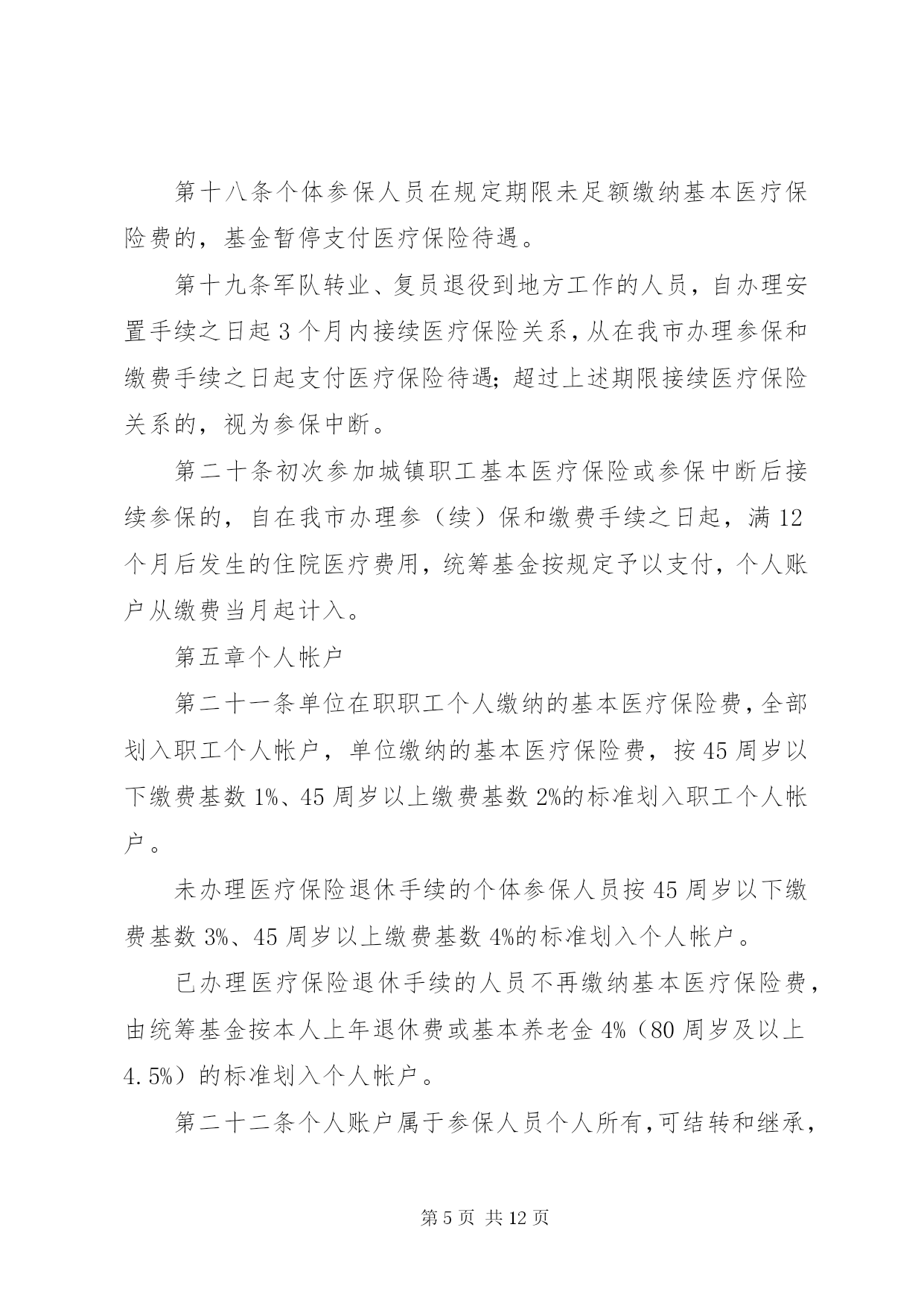 第PAGE\*Arabic\*MERGEFORMAT12页共NUMPAGES\*MERGEFORMAT12页中山基本医疗保险办法**市城镇职工基本医疗保险办法第一章总则第一条为保障城镇职工基本医疗需求,规范城镇职工基本医疗保险管理,根据《中华人民共和国社会保险法》、《国务院关于建立城镇职工基本医疗保险制度的决定》和《XX省贯彻的意见》,结合XX市实际,制定本办法。第二条遵循以下原则:(一)保险水平与社会经济发展水平相适应;(二)基金管理以收定支,收支平衡,略有节余;(三)效率与公平相统一。(四)全市统一参保范围、统一缴费标准、统一待遇水平、统一管理办法、统一信息系统。第三条市人力资源和社会保障行政部门负责全市城镇职工基本医疗保险行政管理工作。县市区人力资源和社会保障行政部门负责本行政区域内城镇职工基本医疗保险行政管理工作。市XX县区市区、园区社会保险经办机构、医疗保险经办机构依照各自职责办理城镇职工基本医疗保险业务。第四条本市行政区域内的下列单位和人员,应参加城镇职工基本医疗保险:(一)企业、机关、事业单位、社会团体、民办非企业单位及其职工、退休人员;(二)无雇工的个体工商户、非全日制从业人员以及其他灵活就业人员(以下简称个体参保人员);(三)法律、法规规定或经省、市政府批准的其他单位和人员。第二章基金管理第五条基本医疗保险基金纳入社会保障基金财政专户管理,任何单位和个人不得挪用。收支情况按同级财政行政部门和上级社会保险经办机构规定报送报表。社会保险经办机构、医疗保险经办机构用于医疗保险业务的工作经费由同级财政预算安排。人力资源和社会保障行政部门、财政行政部门对基金进行监督管理;审计行政部门定期对医疗保险基金收支和管理情况进行审计。第六条基本医疗保险基金由统筹基金和个人账户两部分组成,分别核算、互不挤占。个人帐户由职工个人缴纳费用和单位缴纳费用划转部分组成,单位其余缴纳费用划入统筹基金。第七条基本医疗保险基金出现超支,各级人力资源和社会保障行政部门、财政行政部门及时向同级政府报告,由政府采取措施予以解决。第八条统筹基金按政策计息,利息部分纳入统筹基金管理。第三章基金征缴第九条单位在职职工基本医疗保险费由单位和职工共同缴纳。缴费基数以上上年全市城镇非私营单位在岗职工年平均工资(以下简称上上年市平工资)为最低缴费基数据实缴纳,单位缴费率为7%;职工缴费率为2%,由所在单位代扣代缴。个体参保人员以上上年市平工资为缴费基数,缴费率为9%。第十条累计缴费年限满20年,办理了医疗保险退休手续的参保人员不再缴纳基本医疗保险费,执行医疗保险退休待遇。办理医疗保险退休手续时缴费不足20年的参保人员,以办理医疗保险退休手续当年缴费基数的7%为标准,由单位或个人一次性趸缴补足20年,不再缴纳基本医疗保险费,执行医疗保险退休待遇。不愿一次性趸缴的,经本人申请,经办机构审核后,不缴纳一次性趸缴费用,终止其城镇职工基本医疗保险关系。第十一条参保单位和职工按月缴纳基本医疗保险费。个体参保人员于每年6月30日前缴纳全年基本医疗保险费。第十二条参保人员在本市重复缴费的,退还其多缴费用。第四章关系转移、中断和欠费处理第十三条市内未办理医疗保险退休手续的参保人员医疗保险关系转移时,只转移参保关系和个人帐户,缴费年限互认。从市外转入本市的参保人员,只转移参保关系和个人帐户,其原参保地区的缴费年限可以接续,在本市必须实际足额缴费满10年。在市外和本市合计缴费年限满20年,办理了医疗保险退休手续的参保人员不再缴纳基本医疗保险费,执行医疗保险退休待遇。办理医疗保险退休手续时合计缴费年限不足20年的,按本办法第十条规定执行。第十四条已办理医疗保险退休手续的人员医疗保险关系不再转移。第十五条城镇职工基本医疗保险、城镇居民基本医疗保险和新型农村合作医疗之间的保险关系转移按国家、省、市相关政策执行。第十六条发生下列情形为参保中断,基金不支付中断期间的医疗保险待遇,中断期间不计缴费年限:(一)参保单位欠费满12个月;(二)个体参保人员未足额缴清当年基本医疗保险费。第十七条参保单位已申报参保,未足额缴纳基本医疗保险费,按下列规定处理:(一)欠费3个月,基金暂停支付医疗保险待遇。(二)当年缴清欠费、利息和滞纳金的,基金连续支付医疗保险待遇。(三)在参保中断前跨年度缴清欠费、利息和滞纳金的,只计缴费年限和个人帐户,统筹基金不支付欠费期间的住院医疗保险待遇和门诊慢性病、特殊重症疾病待遇。第十八条个体参保人员在规定期限未足额缴纳基本医疗保险费的,基金暂停支付医疗保险待遇。第十九条军队转业、复员退役到地方工作的人员,自办理安置手续之日起3个月内接续医疗保险关系,从在我市办理参保和缴费手续之日起支付医疗保险待遇;超过上述期限接续医疗保险关系的,视为参保中断。第二十条初次