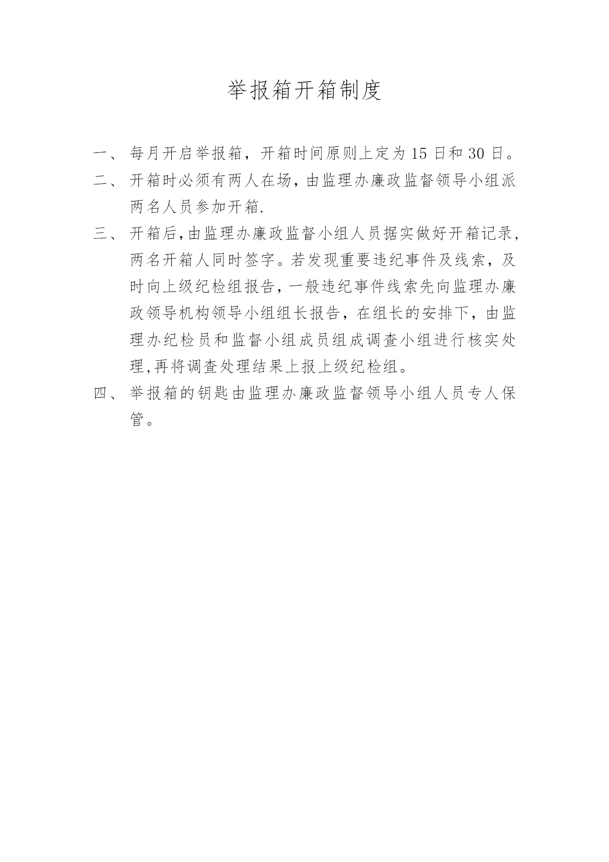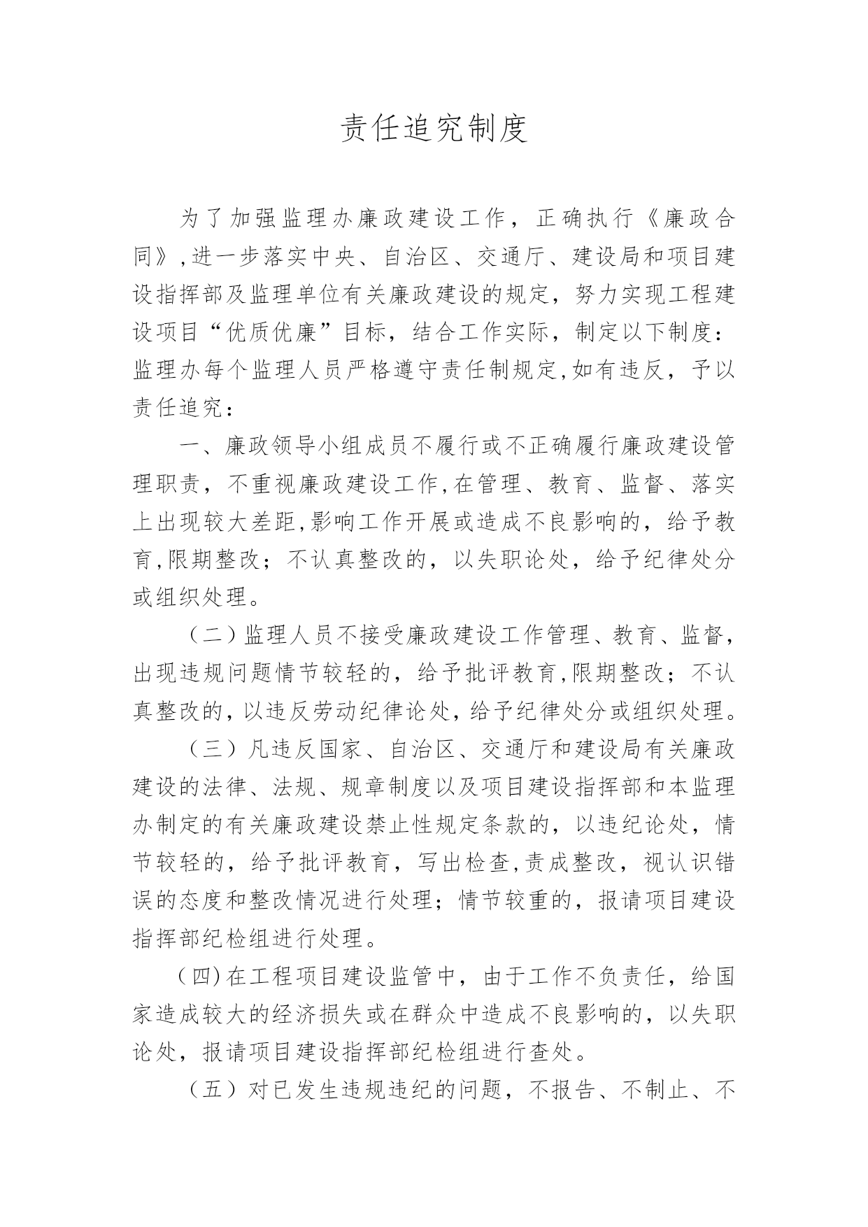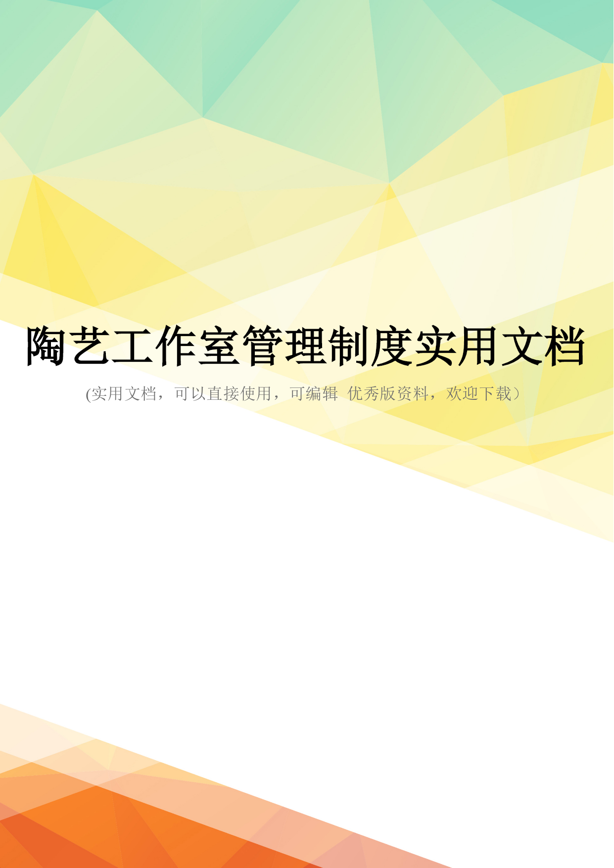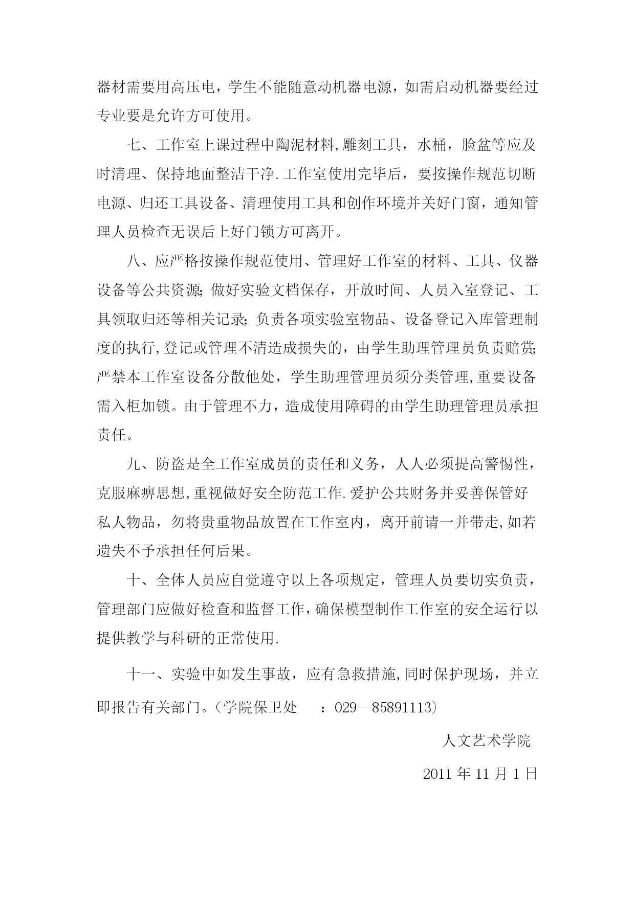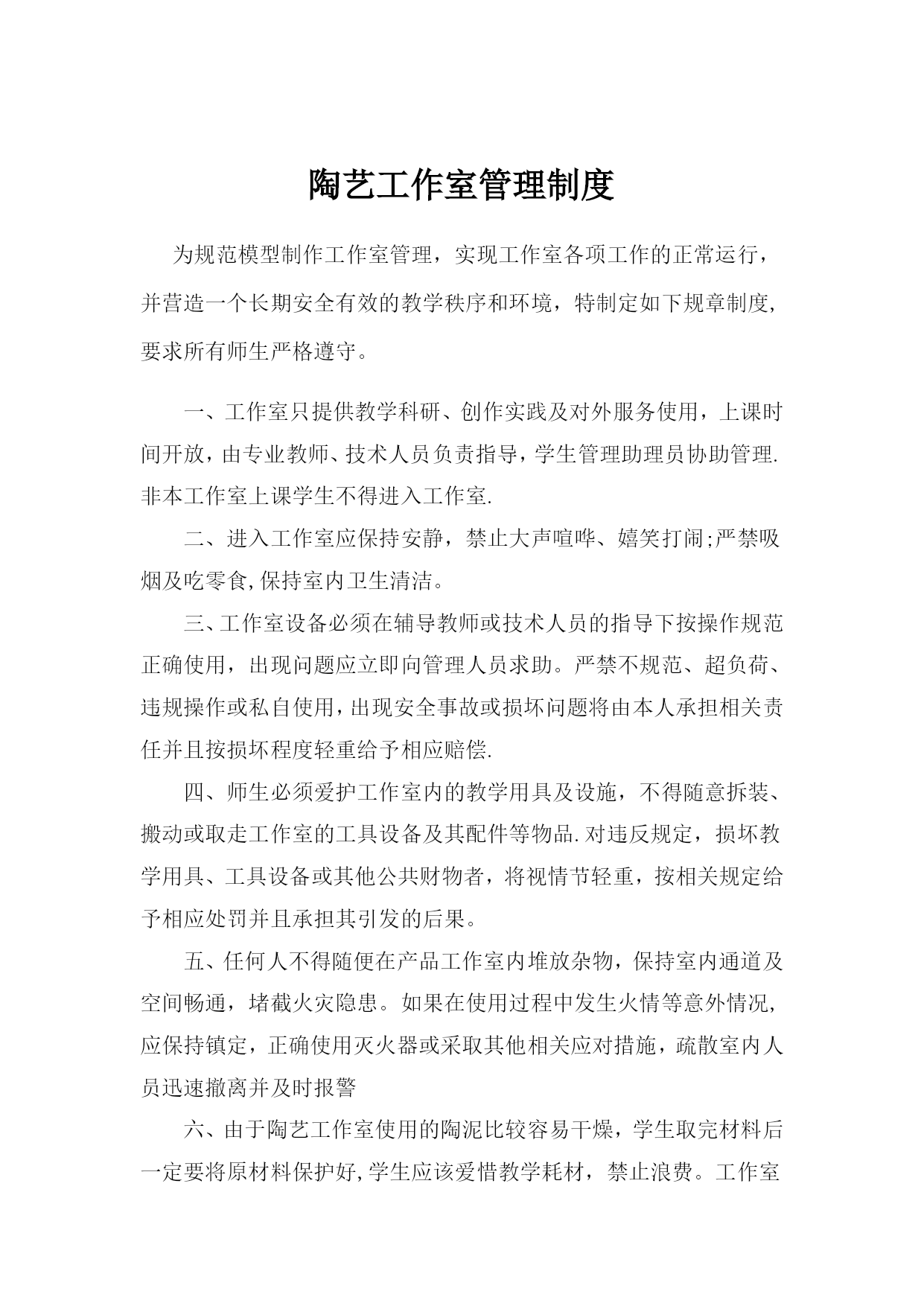 陶艺工作室管理制度实用文档(实用文档,可以直接使用,可编辑优秀版资料,欢迎下载)陶艺工作室管理制度为规范模型制作工作室管理,实现工作室各项工作的正常运行,并营造一个长期安全有效的教学秩序和环境,特制定如下规章制度,要求所有师生严格遵守。一、工作室只提供教学科研、创作实践及对外服务使用,上课时间开放,由专业教师、技术人员负责指导,学生管理助理员协助管理.非本工作室上课学生不得进入工作室.二、进入工作室应保持安静,禁止大声喧哗、嬉笑打闹;严禁吸烟及吃零食,保持室内卫生清洁。三、工作室设备必须在辅导教师或技术人员的指导下按操作规范正确使用,出现问题应立即向管理人员求助。严禁不规范、超负荷、违规操作或私自使用,出现安全事故或损坏问题将由本人承担相关责任并且按损坏程度轻重给予相应赔偿.四、师生必须爱护工作室内的教学用具及设施,不得随意拆装、搬动或取走工作室的工具设备及其配件等物品.对违反规定,损坏教学用具、工具设备或其他公共财物者,将视情节轻重,按相关规定给予相应处罚并且承担其引发的后果。五、任何人不得随便在产品工作室内堆放杂物,保持室内通道及空间畅通,堵截火灾隐患。如果在使用过程中发生火情等意外情况,应保持镇定,正确使用灭火器或采取其他相关应对措施,疏散室内人员迅速撤离并及时报警六、由于陶艺工作室使用的陶泥比较容易干燥,学生取完材料后一定要将原材料保护好,学生应该爱惜教学耗材,禁止浪费。工作室器材需要用高压电,学生不能随意动机器电源,如需启动机器要经过专业要是允许方可使用。七、工作室上课过程中陶泥材料,雕刻工具,水桶,脸盆等应及时清理、保持地面整洁干净.工作室使用完毕后,要按操作规范切断电源、归还工具设备、清理使用工具和创作环境并关好门窗,通知管理人员检查无误后上好门锁方可离开。八、应严格按操作规范使用、管理好工作室的材料、工具、仪器设备等公共资源;做好实验文档保存,开放时间、人员入室登记、工具领取归还等相关记录;负责各项实验室物品、设备登记入库管理制度的执行,登记或管理不清造成损失的,由学生助理管理员负责赔赏;严禁本工作室设备分散他处,学生助理管理员须分类管理,重要设备需入柜加锁。由于管理不力,造成使用障碍的由学生助理管理员承担责任。九、防盗是全工作室成员的责任和义务,人人必须提高警惕性,克服麻痹思想,重视做好安全防范工作.爱护公共财务并妥善保管好私人物品,勿将贵重物品放置在工作室内,离开前请一并带走,如若遗失不予承担任何后果。十、全体人员应自觉遵守以上各项规定,管理人员要切实负责,管理部门应做好检查和监督工作,确保模型制作工作室的安全运行以提供教学与科研的正常使用.十一、实验中如发生事故,应有急救措施,同时保护现场,并立即报告有关部门。(学院保卫处:029—85891113)人文艺术学院2011年11月1日目录35、责任追究制度……………………………………………………14661、廉政工作联席会议制度…………………………………………14862、举报箱开箱制度…………………………………………………15063、廉政建设定期考核制度…………………………………………15164、廉政宣传教育工作制度…………………………………………15465、廉政建设工作请示报告制度……………………………………15766、廉政谈话制度……………………………………………………159责任追究制度为了加强监理办廉政建设工作,正确执行《廉政合同》,进一步落实中央、自治区、交通厅、建设局和项目建设指挥部及监理单位有关廉政建设的规定,努力实现工程建设项目“优质优廉”目标,结合工作实际,制定以下制度:监理办每个监理人员严格遵守责任制规定,如有违反,予以责任追究:一、廉政领导小组成员不履行或不正确履行廉政建设管理职责,不重视廉政建设工作,在管理、教育、监督、落实上出现较大差距,影响工作开展或造成不良影响的,给予教育,限期整改;不认真整改的,以失职论处,给予纪律处分或组织处理。(二)监理人员不接受廉政建设工作管理、教育、监督,出现违规问题情节较轻的,给予批评教育,限期整改;不认真整改的,以违反劳动纪律论处,给予纪律处分或组织处理。(三)凡违反国家、自治区、交通厅和建设局有关廉政建设的法律、法规、规章制度以及项目建设指挥部和本监理办制定的有关廉政建设禁止性规定条款的,以违纪论处,情节较轻的,给予批评教育,写出检查,责成整改,视认识错误的态度和整改情况进行处理;情节较重的,报请项目建设指挥部纪检组进行处理。(四)在工程项目建设监管中,由于工作不负责任,给国家造成较大的经济损失或在群众中造成不良影响的,以失职论处,报请项目建设指挥部纪检组进行查处。(五)对已发生违规违纪的问题,不报告、不制