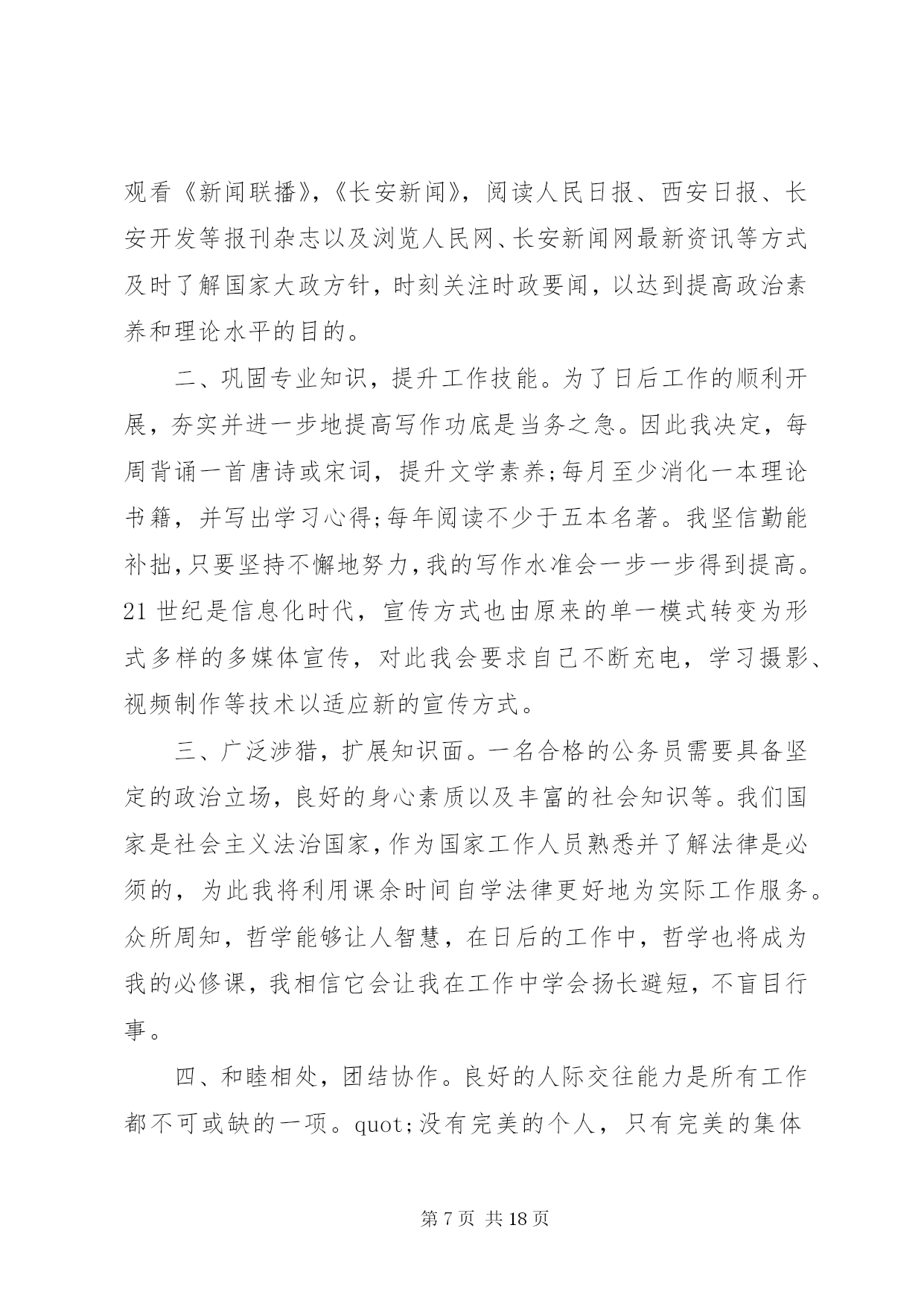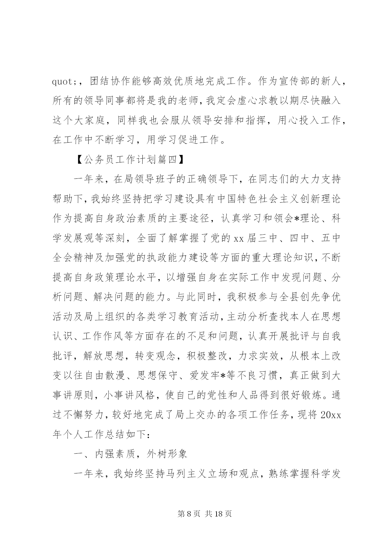 第PAGE\*Arabic\*MERGEFORMAT18页共NUMPAGES\*MERGEFORMAT18页公务员个人工作计划【六篇】【公务员工作计划篇一】一、近期目标今年是在新的工作岗位工作的第一年,是熟悉工作,积极参与,认真履职,探索方法,积累经验的一年,这一年中必须做到一个转变,一个明确,即转变工作角色,明确工作职责。转变工作角色。参加工作近十年了,但是自己从事的工作一直都相对单一,以至于对其他行业的工作所知甚少,以至陌生,县政府办公室作为全县的核心机构,工作涉及到全县各行各业,对此,在思考问题以及做事情的时候,必须跳出以前在部门的思维方式,摆正自己的位置,树立全局意识,切实转变工作角色。明确工作职责。按照办公室对自己工作安排,尽快熟悉自己的工作和职责,一是熟悉县政府办公室的各项规章制度,明确工作要求;二是熟悉县政府办公室总体工作及相关业务年初工作目标,明确工作任务;三虚心听取办公室其他同志的指导,善于学习,不断的提高自己的业务水平,明确工作的运行和处理问题的程序;四要认真与科室其他同志总结前期工作,明确工作努力方向。二、中期目标在明确工作职责、工作任务,熟悉工作方的前提下,明年,必须进一步加强自身锤炼,做到政治素质、业务能力、工作绩效三个提升。提升政治素质。一是要善于从政治角度看问题。无论面临的情况多么复杂,要坚持从政治角度分析判断问题,保持清醒头脑。二要保持政治敏锐性。密切关注时事、了解时事,通过网络、报刊、电视等,敏锐把握各项方针政策动向,保持工作的主动性。提升业务能力。一是提升写作能力。加强理论学习,注重平时公文写作中的锻炼,注意办公室其他同志撰写材料的学习,能较好完成交办的新文件拟稿任务。二是提升语言表达能力。加强说话训练,做到汇报工作准确、简洁、清楚。提升工作绩效。虚心听取领导、同志、部门等对自己工作的意见和建议,总结经验教训,提高工作效率,优质的完成各项工作。认真做好调研、信息报送等工作,能超额完成办公室下达的工作目标。三、远期目标加强学习,确保思想上的先进和作风上的优良;加强锻炼,促进服务意识和业务水平进一步的提高。服从组织、领导安排,善于思考、积极创新,能独立且出色完成各项工作。四、工作措施1、加强学习。学习是历史使命,选择学习就是选择进步,忽视学习就是忽视进步,放弃学习就是放弃进步,要把学习作为终身任务和长期实践的行为,要通过学习达到身强体健。在工作中积极学习,并且善于不断的总结经验,与自己的实际相结合,把自己的工作做到。2、踏实工作。只有踏实工作,才能创造业绩,只有艰苦奋斗,工作才会不是一句空话。坚持两个务必是一个党员的根本作风,无论在任何时候都要坚持艰苦奋斗,都要坚持谦虚、谨慎、不骄、不躁。在工作中一定要充满热情和*。3、善于调研。调研是保证自己头脑清醒,认识超前,工作进步的有效途径。在繁忙的事务工作中,自己应合理安排,抽出时间对自己所从事的工作进行调查研究,从不同的途径了解自己的工作情况,针对实际工作中存在的薄弱环节,改进工作方法。4、勇于创新。创新,是民族进步的灵魂、事业发展的动力;创新,使人始终充满活力与朝气。作为一名党员、一名办公室工作人员,在方针政策、规章法纪、制度程序范围内,为提高工作效率、工作质量,更应在工作方法等方面积极作出新的探索,在自己的工作岗位上创造性地开展工作。新的工作、新的挑战,新的起点、新的机遇。我相信,在新的一年工作中,在单位领导的指导和同时们的帮助下,通过自己不断的努力,一定会成为一名新形势下合格的办公室工作人员。【公务员工作计划篇二】为了响应党中央建设quot;学习型政府quot;的要求,也为了不断完善自我,适应当前工作的需要,更新自己的知识层次和政治理论水平,与时俱进,努力提高自己的综合素质,做一名学习型的组工干部,特制订学习计划如下:一、学习目标提高自身政治理论水平,增强政治敏锐性;加强组工业务知识的学习,提高工作能力和效率,在写作上更进一步。二、学习时间1、周一至周五,上班时在不影响业务工作的情况下,利用一切可利用的时间学习。每天晚上7:00-8:00,学习1个小时。2、周六、周日,学习5个小时。4、每星期利用网络资源,上网学习个2小时。5、每天用半个小时阅读当天报纸、杂志,了解国内外的重大新闻、政策形势,提高自己的政策理论水平。三、学习任务1、政治理论。通过观看新闻联播,阅读黄冈日报、湖北日报、*、党员生活等报刊杂志,学习马列主义、*思想、*理论和quot;三个代表quot;重要思想及其一系列重要论述,和这些理论在各地方的实际应用,深刻领会其精神实质,用先进的理论指导自己的工作实践。quot;好记性不如烂笔头quot;,坚持边看边想,边想边写。每月完成读书笔记字数不少于5000字。2、业务知识。充分利用组织部的资源,学习《党章》、