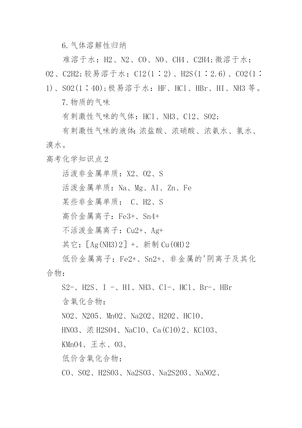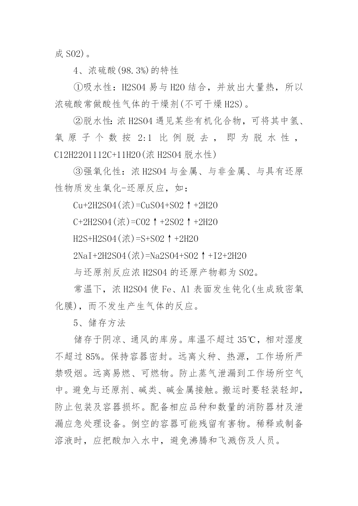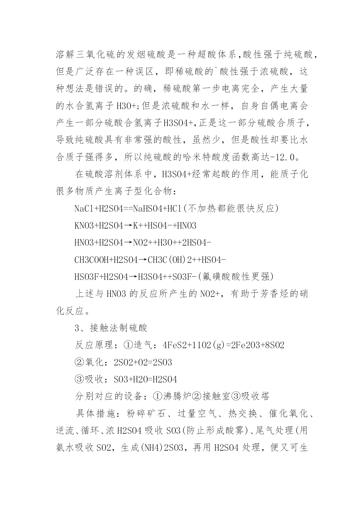 高考化学知识点高考化学知识点(通用15篇)在日常过程学习中,相信大家一定都接触过知识点吧!知识点就是学习的重点。哪些才是我们真正需要的知识点呢?下面是小编为大家整理的高考化学知识点,仅供参考,欢迎大家阅读。高考化学知识点1特殊的物理性质1.易液化的物质常压下SO2(-10℃)、NH3(-33.5℃)、Cl2(-34.6℃)2.SO3熔点和沸点都很低,标准状况下是一种无色晶体。3.H2SO4硫酸是一种无色透明、黏稠的'油状液体,常用的浓硫酸的质量分数为98.3%,密度为1.84g·cm-3(物质的量浓度为18.4mol·L-1),属高沸点、难挥发性酸。浓硫酸具有强腐蚀性,若浓硫酸不慎溅到衣服或皮肤上,应先用湿布擦去,然后用大量的水冲洗,再用3%~5%的碳酸氢钠溶液冲洗。4.单质溴易挥发,单质碘易升华5.易潮解的物质NaOH、MgCl2、CaCl2。6.气体溶解性归纳难溶于水:H2、N2、CO、NO、CH4、C2H4;微溶于水:O2、C2H2;较易溶于水:Cl2(1∶2)、H2S(1∶2.6)、CO2(1∶1)、SO2(1∶40);极易溶于水:HF、HCl、HBr、HI、NH3等。7.物质的气味有刺激性气味的气体:HCl、NH3、Cl2、SO2;有刺激性气味的液体:浓盐酸、浓硝酸、浓氨水、氯水、溴水。高考化学知识点2活泼非金属单质:X2、O2、S活泼金属单质:Na、Mg、Al、Zn、Fe某些非金属单质:C、H2、S高价金属离子:Fe3+、Sn4+不活泼金属离子:Cu2+、Ag+其它:[Ag(NH3)2]+、新制Cu(OH)2低价金属离子:Fe2+、Sn2+、非金属的'阴离子及其化合物:S2-、H2S、I-、HI、NH3、Cl-、HCl、Br-、HBr含氧化合物:NO2、N2O5、MnO2、Na2O2、H2O2、HClO、HNO3、浓H2SO4、NaClO、Ca(ClO)2、KClO3、KMnO4、王水、O3、低价含氧化合物:CO、SO2、H2SO3、Na2SO3、Na2S2O3、NaNO2、H2C2O4、含-CHO的有机物:醛、甲酸、甲酸盐、甲酸某酯、葡萄糖、麦芽糖等既可作氧化剂又可作还原剂的有:S、SO32-、HSO3-、H2SO3、SO2、NO2-、Fe2+等,及含-CHO的有机物(还原性为主)高考化学知识点31、硫酸(化学式:H?SO?),硫的最重要的含氧酸。无水硫酸为无色油状液体,10.36℃时结晶,通常使用的是它的各种不同浓度的水溶液,用塔式法和接触法制取。前者所得为粗制稀硫酸,质量分数一般在75%左右;后者可得质量分数98.3%的纯浓硫酸,沸点338℃,相对密度1.84。硫酸是一种最活泼的二元无机强酸,能和许多金属发生反应。高浓度的硫酸有强烈吸水性,可用作脱水剂,碳化木材、纸张、棉麻织物及生物皮肉等含碳水化合物的物质。与水混合时,亦会放出大量热能。其具有强烈的腐蚀性和氧化性,故需谨慎使用。是一种重要的工业原料,可用于制造肥料、药物、炸药、颜料、洗涤剂、蓄电池等,也广泛应用于净化石油、金属冶炼以及染料等工业中。常用作化学试剂,在有机合成中可用作脱水剂和磺化剂。2、化学性质腐蚀性纯硫酸加热至290℃分解放出部分三氧化硫,直至酸的浓度降到98.3%为止,这时硫酸为恒沸溶液,沸点为338°C。无水硫酸体现酸性是给出质子的能力,纯硫酸仍然具有很强的酸性,98%硫酸与纯硫酸的酸性基本上没有差别,而溶解三氧化硫的发烟硫酸是一种超酸体系,酸性强于纯硫酸,但是广泛存在一种误区,即稀硫酸的`酸性强于浓硫酸,这种想法是错误的。的确,稀硫酸第一步电离完全,产生大量的水合氢离子H3O+;但是浓硫酸和水一样,自身自偶电离会产生一部分硫酸合氢离子H3SO4+,正是这一部分硫酸合质子,导致纯硫酸具有非常强的酸性,虽然少,但是酸性却要比水合质子强得多,所以纯硫酸的哈米特酸度函数高达-12.0。在硫酸溶剂体系中,H3SO4+经常起酸的作用,能质子化很多物质产生离子型化合物:NaCl+H2SO4==NaHSO4+HCl(不加热都能很快反应)KNO3+H2SO4→K++HSO4-+HNO3HNO3+H2SO4→NO2++H3O++2HSO4-CH3COOH+H2SO4→CH3C(OH)2++HSO4-HSO3F+H2SO4→H3SO4++SO3F-(氟磺酸酸性更强)上述与HNO3的反应所产生的NO2+,有助于芳香烃的硝化反应。3、接触法制硫酸反应原理:①造气:4FeS2+11O2(g)=2Fe2O3+8SO2②氧化:2SO2+O2=2SO3③吸收:SO3+H2O=H2SO4分别对应的设备:①沸腾炉②接触室③吸收塔具体措施:粉碎矿石、过量空气、热交换、催化氧化、逆流、循环、浓H2SO4吸收SO3(防止形成酸雾)、尾气处理(用氨水吸收SO2,生成(NH4)2