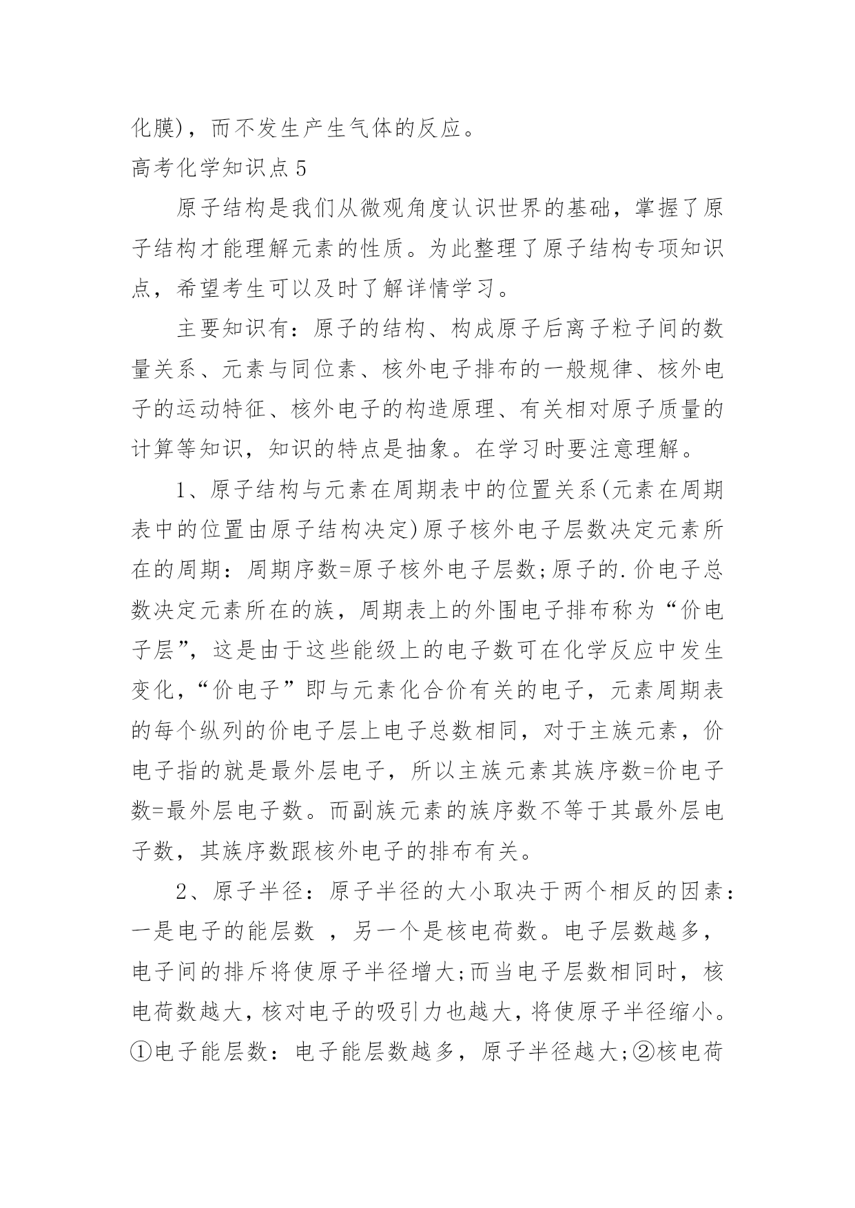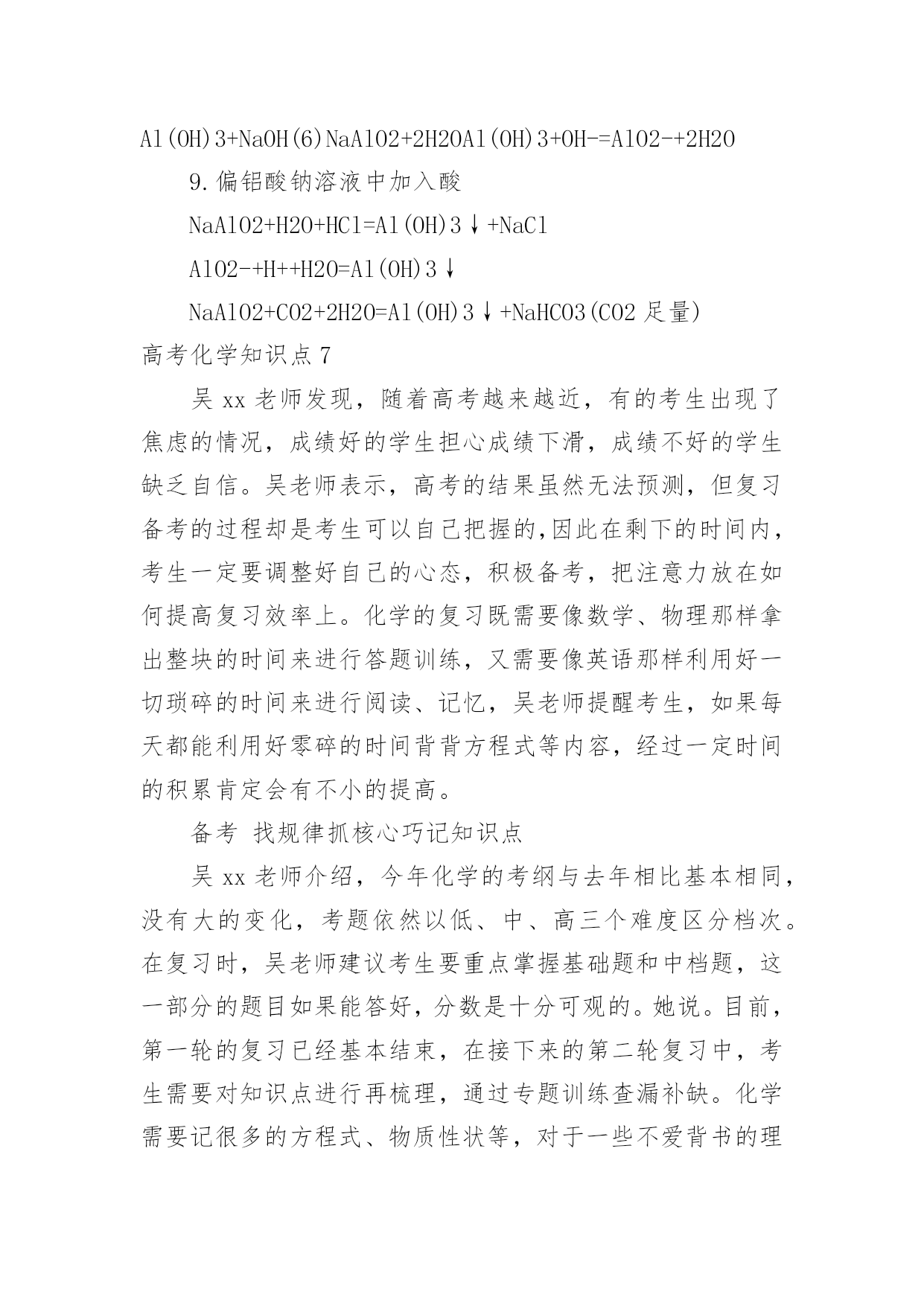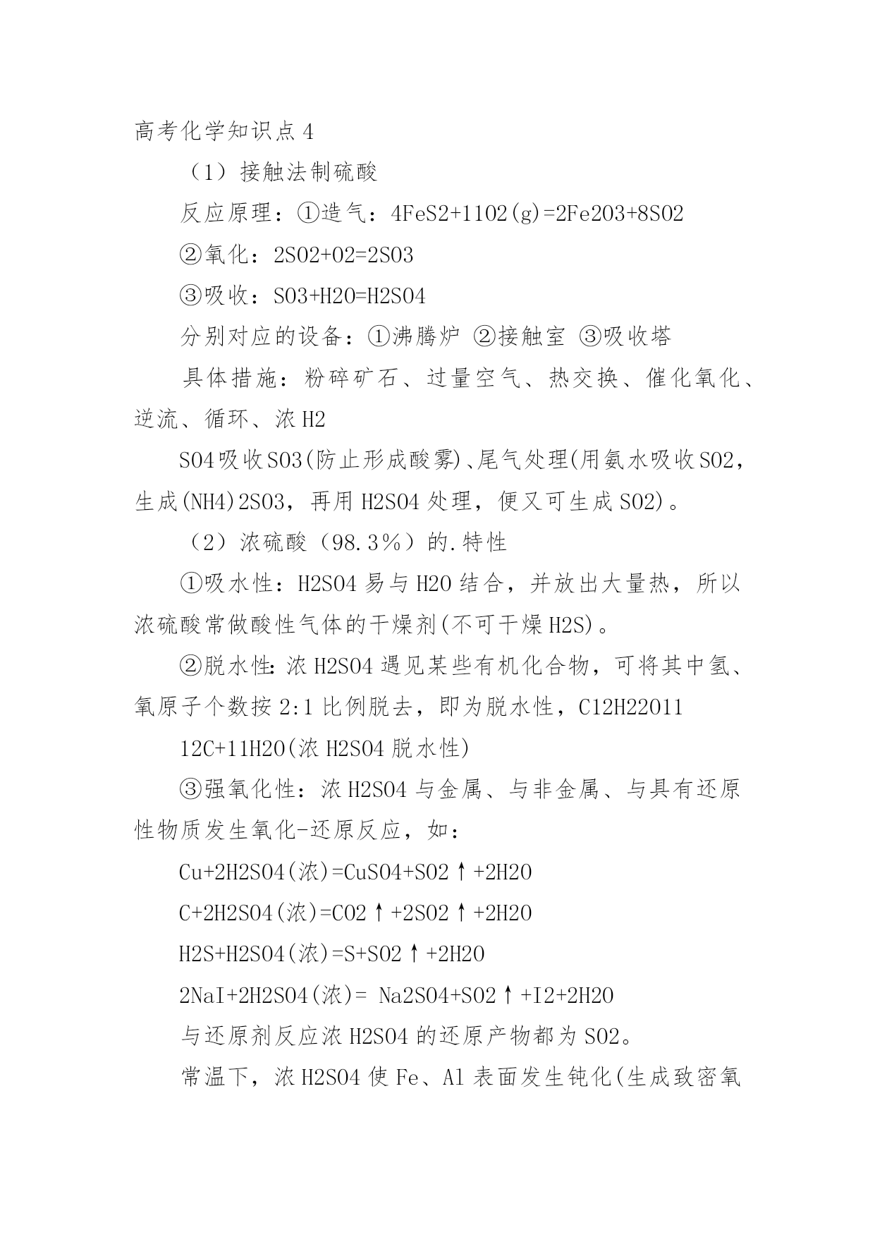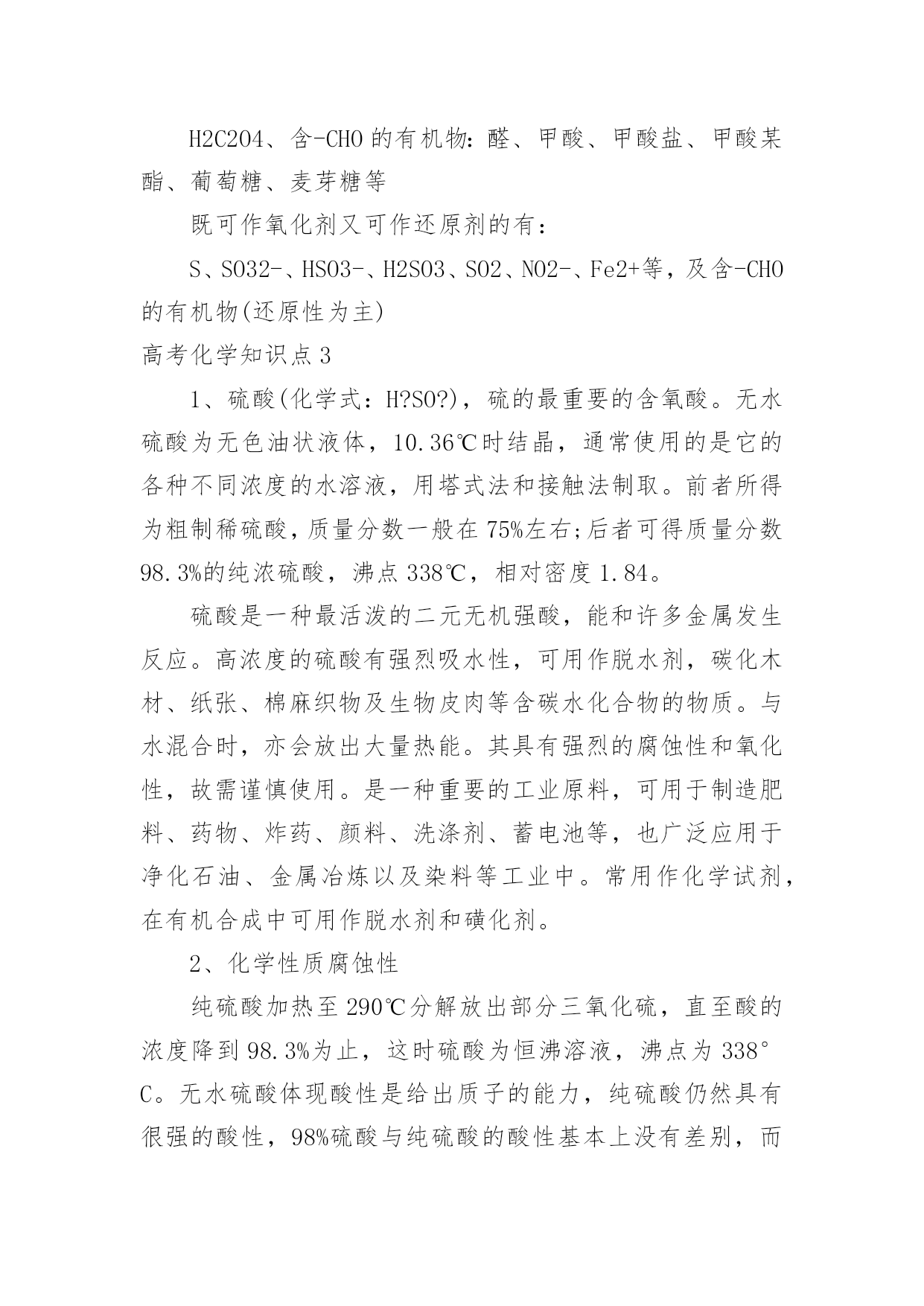 高考化学知识点高考化学知识点(通用15篇)在日常过程学习中,相信大家一定都接触过知识点吧!知识点就是学习的重点。哪些才是我们真正需要的知识点呢?下面是小编为大家整理的高考化学知识点,仅供参考,欢迎大家阅读。高考化学知识点1特殊的物理性质1.易液化的物质常压下SO2(-10℃)、NH3(-33.5℃)、Cl2(-34.6℃)2.SO3熔点和沸点都很低,标准状况下是一种无色晶体。3.H2SO4硫酸是一种无色透明、黏稠的'油状液体,常用的浓硫酸的质量分数为98.3%,密度为1.84g·cm-3(物质的量浓度为18.4mol·L-1),属高沸点、难挥发性酸。浓硫酸具有强腐蚀性,若浓硫酸不慎溅到衣服或皮肤上,应先用湿布擦去,然后用大量的水冲洗,再用3%~5%的碳酸氢钠溶液冲洗。4.单质溴易挥发,单质碘易升华5.易潮解的物质NaOH、MgCl2、CaCl2。6.气体溶解性归纳难溶于水:H2、N2、CO、NO、CH4、C2H4;微溶于水:O2、C2H2;较易溶于水:Cl2(1∶2)、H2S(1∶2.6)、CO2(1∶1)、SO2(1∶40);极易溶于水:HF、HCl、HBr、HI、NH3等。7.物质的气味有刺激性气味的气体:HCl、NH3、Cl2、SO2;有刺激性气味的液体:浓盐酸、浓硝酸、浓氨水、氯水、溴水。高考化学知识点2活泼非金属单质:X2、O2、S活泼金属单质:Na、Mg、Al、Zn、Fe某些非金属单质:C、H2、S高价金属离子:Fe3+、Sn4+不活泼金属离子:Cu2+、Ag+其它:[Ag(NH3)2]+、新制Cu(OH)2低价金属离子:Fe2+、Sn2+、非金属的'阴离子及其化合物:S2-、H2S、I-、HI、NH3、Cl-、HCl、Br-、HBr含氧化合物:NO2、N2O5、MnO2、Na2O2、H2O2、HClO、HNO3、浓H2SO4、NaClO、Ca(ClO)2、KClO3、KMnO4、王水、O3、低价含氧化合物:CO、SO2、H2SO3、Na2SO3、Na2S2O3、NaNO2、H2C2O4、含-CHO的有机物:醛、甲酸、甲酸盐、甲酸某酯、葡萄糖、麦芽糖等既可作氧化剂又可作还原剂的有:S、SO32-、HSO3-、H2SO3、SO2、NO2-、Fe2+等,及含-CHO的有机物(还原性为主)高考化学知识点31、硫酸(化学式:H?SO?),硫的最重要的含氧酸。无水硫酸为无色油状液体,10.36℃时结晶,通常使用的是它的各种不同浓度的水溶液,用塔式法和接触法制取。前者所得为粗制稀硫酸,质量分数一般在75%左右;后者可得质量分数98.3%的纯浓硫酸,沸点338℃,相对密度1.84。硫酸是一种最活泼的二元无机强酸,能和许多金属发生反应。高浓度的硫酸有强烈吸水性,可用作脱水剂,碳化木材、纸张、棉麻织物及生物皮肉等含碳水化合物的物质。与水混合时,亦会放出大量热能。其具有强烈的腐蚀性和氧化性,故需谨慎使用。是一种重要的工业原料,可用于制造肥料、药物、炸药、颜料、洗涤剂、蓄电池等,也广泛应用于净化石油、金属冶炼以及染料等工业中。常用作化学试剂,在有机合成中可用作脱水剂和磺化剂。2、化学性质腐蚀性纯硫酸加热至290℃分解放出部分三氧化硫,直至酸的浓度降到98.3%为止,这时硫酸为恒沸溶液,沸点为338°C。无水硫酸体现酸性是给出质子的能力,纯硫酸仍然具有很强的酸性,98%硫酸与纯硫酸的酸性基本上没有差别,而溶解三氧化硫的发烟硫酸是一种超酸体系,酸性强于纯硫酸,但是广泛存在一种误区,即稀硫酸的`酸性强于浓硫酸,这种想法是错误的。的确,稀硫酸第一步电离完全,产生大量的水合氢离子H3O+;但是浓硫酸和水一样,自身自偶电离会产生一部分硫酸合氢离子H3SO4+,正是这一部分硫酸合质子,导致纯硫酸具有非常强的酸性,虽然少,但是酸性却要比水合质子强得多,所以纯硫酸的哈米特酸度函数高达-12.0。在硫酸溶剂体系中,H3SO4+经常起酸的作用,能质子化很多物质产生离子型化合物:NaCl+H2SO4==NaHSO4+HCl(不加热都能很快反应)KNO3+H2SO4→K++HSO4-+HNO3HNO3+H2SO4→NO2++H3O++2HSO4-CH3COOH+H2SO4→CH3C(OH)2++HSO4-HSO3F+H2SO4→H3SO4++SO3F-(氟磺酸酸性更强)上述与HNO3的反应所产生的NO2+,有助于芳香烃的硝化反应。3、接触法制硫酸反应原理:①造气:4FeS2+11O2(g)=2Fe2O3+8SO2②氧化:2SO2+O2=2SO3③吸收:SO3+H2O=H2SO4分别对应的设备:①沸腾炉②接触室③吸收塔具体措施:粉碎矿石、过量空气、热交换、催化氧化、逆流、循环、浓H2SO4吸收SO3(防止形成酸雾)、尾气处理(用氨水吸收SO2,生成(NH4)2