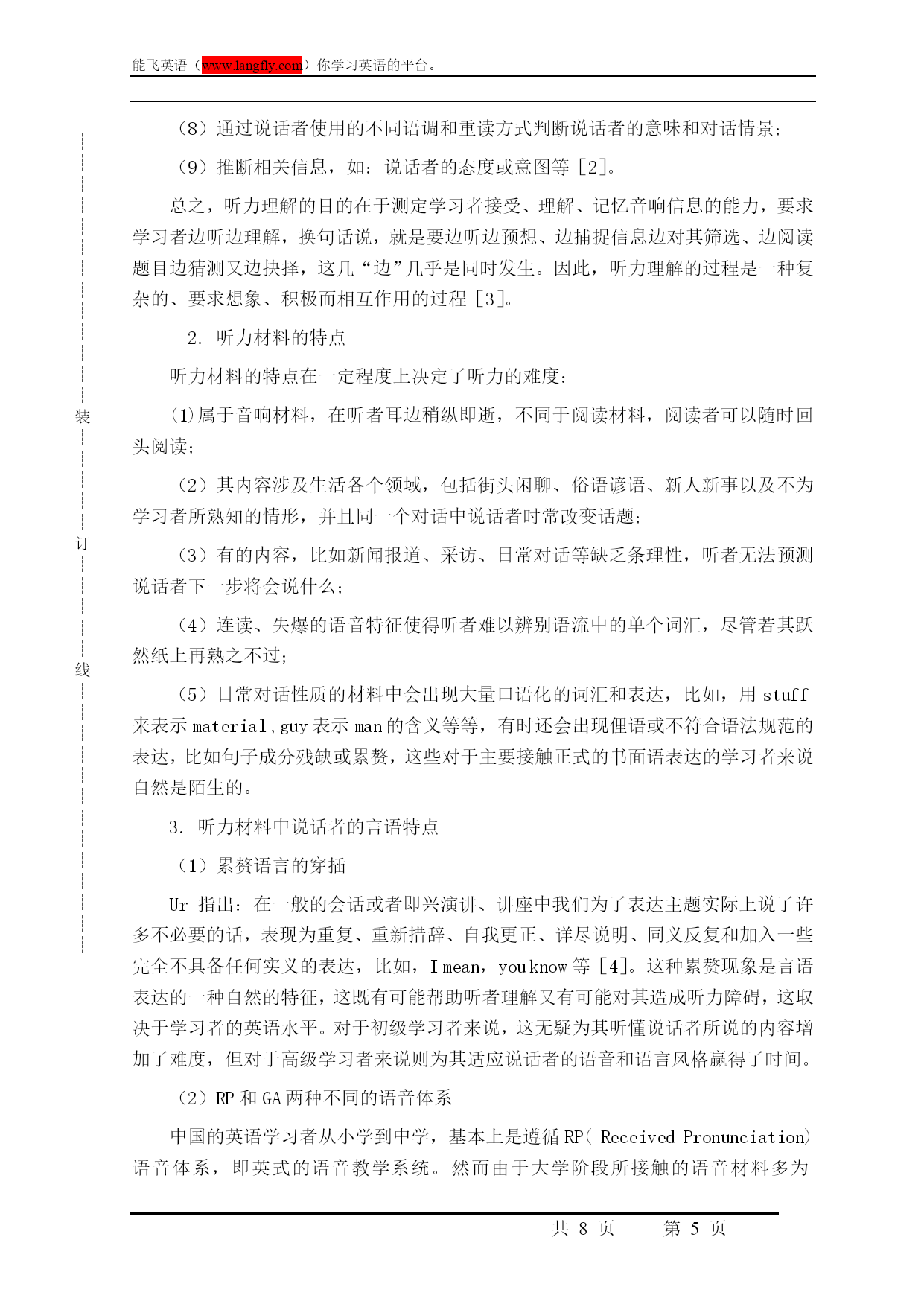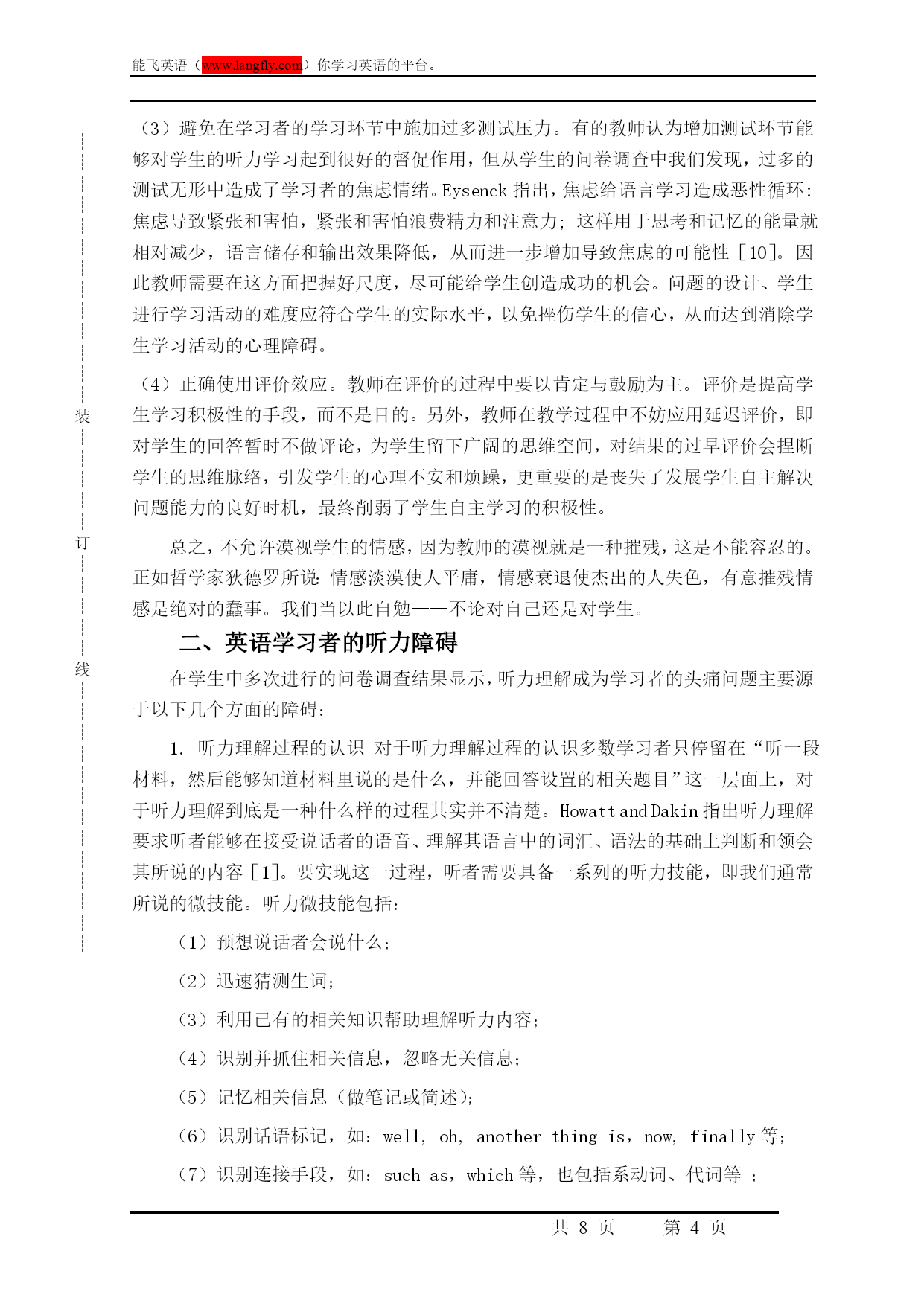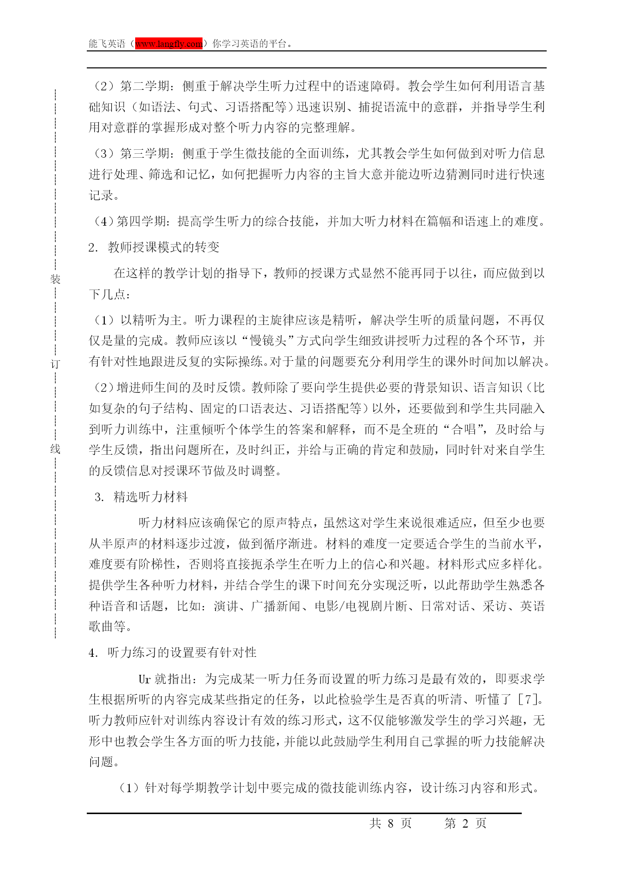 ┊┊┊┊┊┊┊┊┊┊┊┊┊装┊┊┊┊┊订┊┊┊┊┊线┊┊┊┊┊┊┊┊┊┊┊┊┊能飞英语(www.langfly.com)你学习英语的平台。第PAGE8页高考英语听力指导引言听力理解一直是中国英语学习者在英语学习方面比较头痛的一个问题。随着大学英语教学改革的不断深入,听力理解题目在大学英语测试中所占的比例已达到35%。然而学生的听力课时仍然极其有限,通常平均每周为1-2节。无疑,教师面临着如何在有限的课时内进行有效的听力教学的严峻挑战。传统的听力教学模式中,教师很少去教学生怎样听,而更多的只是将大量的视听材料“灌”给学生,认为学生在接触过大量的听力内容之后便会自然而然地获得听力方面的技能,无需向学生讲授如何去听。教学中,多数教师遵循着同一种固定的模式——打开课本,讲解生词,播放磁带或光盘,提问/回答问题,给出答案。长此以往,学生会发现这种教学模式远远没有解决自己听力上的问题,进而对这种单调的教学模式失去兴趣,而学习者学习兴趣的丧失便成为了英语听力学习中最大的障碍。因此,作为教师很有必要在如何讲授听力课程方面寻找新的思路。一、听力教学中如何帮助学生解决听力障碍通过以上对学习者听力障碍的分析,我们已经不难得出结论:大学英语听力教学的有效模式应该是在有限的听力讲授中,立足于解决学生听力学习过程中的障碍问题,教会学生如何去听。大学英语听力教学应在以下几个方面实现突破:1.制定循序渐进的教学计划传统的听力教学中并没有强调制定四个学期间的教学计划的重要性,基本上只是局限于完成听力课本上几个单元的听力内容与练习,如有可能适时地添加一些与课本内容相关的课外材料。事实上,若要从根本上解决学生的听力障碍,必须有一个完整的、循序渐进的教学计划为指导。教学计划的制定应着眼于连续四个学期间的听力教学,每个学期设置不同的教学重心:(1)第一学期:侧重于解决学生语音方面的障碍。通过大量的示范与练习使学生熟知英语语言中的连读、失去爆破、重读、弱读、语调、英式美式英语的差异等,训练学生的模仿跟读能力。(2)第二学期:侧重于解决学生听力过程中的语速障碍。教会学生如何利用语言基础知识(如语法、句式、习语搭配等)迅速识别、捕捉语流中的意群,并指导学生利用对意群的掌握形成对整个听力内容的完整理解。(3)第三学期:侧重于学生微技能的全面训练,尤其教会学生如何做到对听力信息进行处理、筛选和记忆,如何把握听力内容的主旨大意并能边听边猜测同时进行快速记录。(4)第四学期:提高学生听力的综合技能,并加大听力材料在篇幅和语速上的难度。2.教师授课模式的转变在这样的教学计划的指导下,教师的授课方式显然不能再同于以往,而应做到以下几点:(1)以精听为主。听力课程的主旋律应该是精听,解决学生听的质量问题,不再仅仅是量的完成。教师应该以“慢镜头”方式向学生细致讲授听力过程的各个环节,并有针对性地跟进反复的实际操练。对于量的问题要充分利用学生的课外时间加以解决。(2)增进师生间的及时反馈。教师除了要向学生提供必要的背景知识、语言知识(比如复杂的句子结构、固定的口语表达、习语搭配等)以外,还要做到和学生共同融入到听力训练中,注重倾听个体学生的答案和解释,而不是全班的“合唱”,及时给与学生反馈,指出问题所在,及时纠正,并给与正确的肯定和鼓励,同时针对来自学生的反馈信息对授课环节做及时调整。3.精选听力材料听力材料应该确保它的原声特点,虽然这对学生来说很难适应,但至少也要从半原声的材料逐步过渡,做到循序渐进。材料的难度一定要适合学生的当前水平,难度要有阶梯性,否则将直接扼杀学生在听力上的信心和兴趣。材料形式应多样化。提供学生各种听力材料,并结合学生的课下时间充分实现泛听,以此帮助学生熟悉各种语音和话题,比如:演讲、广播新闻、电影/电视剧片断、日常对话、采访、英语歌曲等。4.听力练习的设置要有针对性Ur就指出:为完成某一听力任务而设置的听力练习是最有效的,即要求学生根据所听的内容完成某些指定的任务,以此检验学生是否真的听清、听懂了[7]。听力教师应针对训练内容设计有效的练习形式,这不仅能够激发学生的学习兴趣,无形中也教会学生各方面的听力技能,并能以此鼓励学生利用自己掌握的听力技能解决问题。(1)针对每学期教学计划中要完成的微技能训练内容,设计练习内容和形式。如:若解决学生语音方面的障碍,则可根据听力材料中说话者的语音特点以及学生在听该材料的过程中有可能出现的语音障碍,就此设置练习,其宗旨是要学生熟知各种语音现象,并能在听力实践中从容应对。(2)针对材料内容的特点设计不同形式的练习。听力练习不一定非要拘泥于多项选择的形式,应根据听力材料所涉及的内容特点以