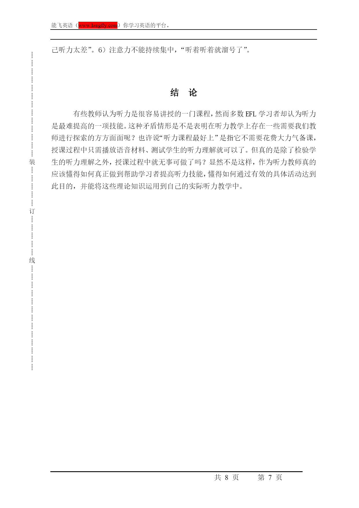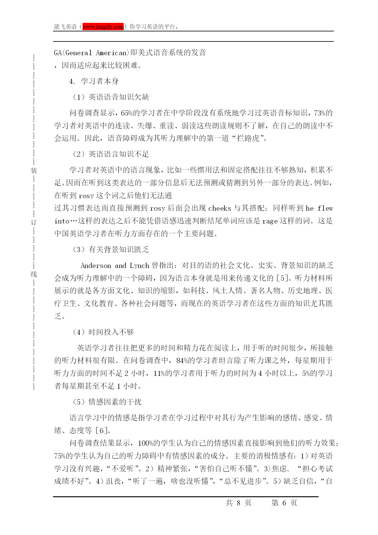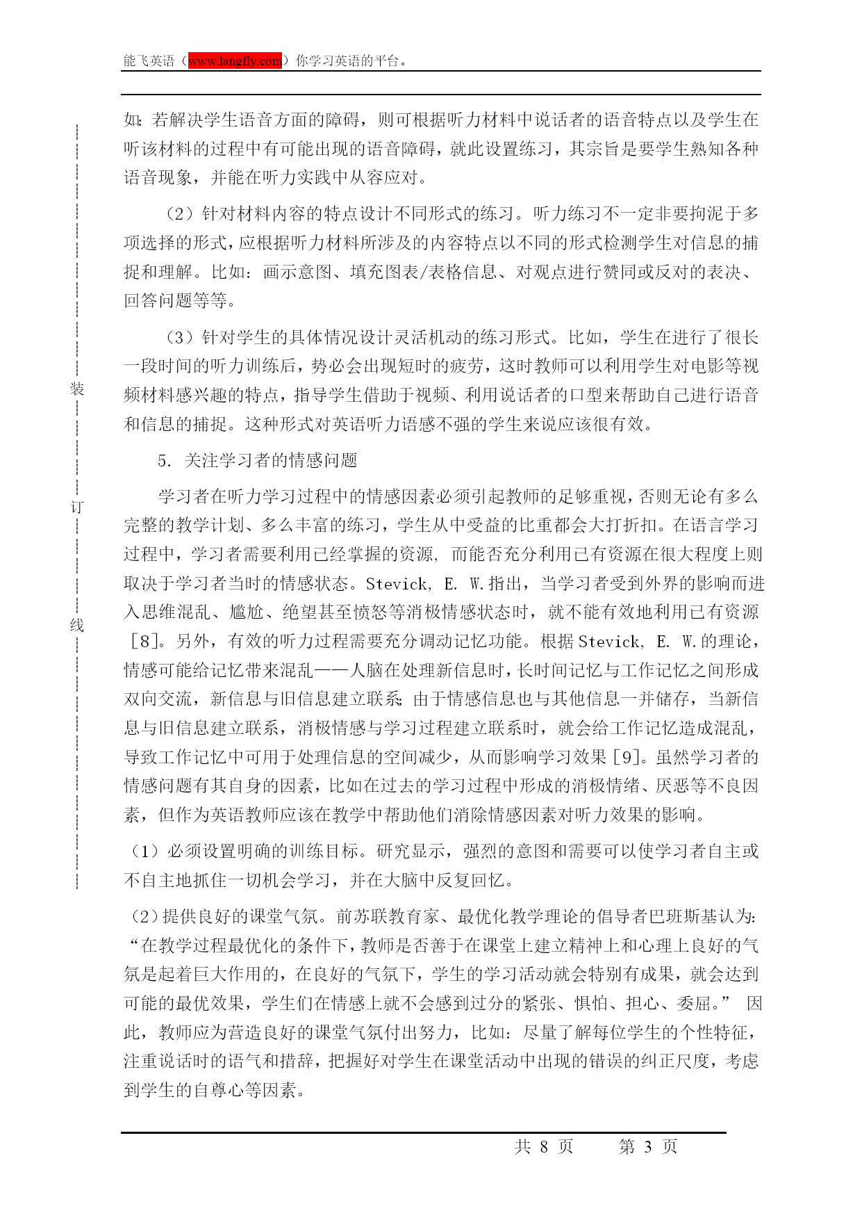 ┊┊┊┊┊┊┊┊┊┊┊┊┊装┊┊┊┊┊订┊┊┊┊┊线┊┊┊┊┊┊┊┊┊┊┊┊┊能飞英语(www.langfly.com)你学习英语的平台。第PAGE8页高考英语听力指导引言听力理解一直是中国英语学习者在英语学习方面比较头痛的一个问题。随着大学英语教学改革的不断深入,听力理解题目在大学英语测试中所占的比例已达到35%。然而学生的听力课时仍然极其有限,通常平均每周为1-2节。无疑,教师面临着如何在有限的课时内进行有效的听力教学的严峻挑战。传统的听力教学模式中,教师很少去教学生怎样听,而更多的只是将大量的视听材料“灌”给学生,认为学生在接触过大量的听力内容之后便会自然而然地获得听力方面的技能,无需向学生讲授如何去听。教学中,多数教师遵循着同一种固定的模式——打开课本,讲解生词,播放磁带或光盘,提问/回答问题,给出答案。长此以往,学生会发现这种教学模式远远没有解决自己听力上的问题,进而对这种单调的教学模式失去兴趣,而学习者学习兴趣的丧失便成为了英语听力学习中最大的障碍。因此,作为教师很有必要在如何讲授听力课程方面寻找新的思路。一、听力教学中如何帮助学生解决听力障碍通过以上对学习者听力障碍的分析,我们已经不难得出结论:大学英语听力教学的有效模式应该是在有限的听力讲授中,立足于解决学生听力学习过程中的障碍问题,教会学生如何去听。大学英语听力教学应在以下几个方面实现突破:1.制定循序渐进的教学计划传统的听力教学中并没有强调制定四个学期间的教学计划的重要性,基本上只是局限于完成听力课本上几个单元的听力内容与练习,如有可能适时地添加一些与课本内容相关的课外材料。事实上,若要从根本上解决学生的听力障碍,必须有一个完整的、循序渐进的教学计划为指导。教学计划的制定应着眼于连续四个学期间的听力教学,每个学期设置不同的教学重心:(1)第一学期:侧重于解决学生语音方面的障碍。通过大量的示范与练习使学生熟知英语语言中的连读、失去爆破、重读、弱读、语调、英式美式英语的差异等,训练学生的模仿跟读能力。(2)第二学期:侧重于解决学生听力过程中的语速障碍。教会学生如何利用语言基础知识(如语法、句式、习语搭配等)迅速识别、捕捉语流中的意群,并指导学生利用对意群的掌握形成对整个听力内容的完整理解。(3)第三学期:侧重于学生微技能的全面训练,尤其教会学生如何做到对听力信息进行处理、筛选和记忆,如何把握听力内容的主旨大意并能边听边猜测同时进行快速记录。(4)第四学期:提高学生听力的综合技能,并加大听力材料在篇幅和语速上的难度。2.教师授课模式的转变在这样的教学计划的指导下,教师的授课方式显然不能再同于以往,而应做到以下几点:(1)以精听为主。听力课程的主旋律应该是精听,解决学生听的质量问题,不再仅仅是量的完成。教师应该以“慢镜头”方式向学生细致讲授听力过程的各个环节,并有针对性地跟进反复的实际操练。对于量的问题要充分利用学生的课外时间加以解决。(2)增进师生间的及时反馈。教师除了要向学生提供必要的背景知识、语言知识(比如复杂的句子结构、固定的口语表达、习语搭配等)以外,还要做到和学生共同融入到听力训练中,注重倾听个体学生的答案和解释,而不是全班的“合唱”,及时给与学生反馈,指出问题所在,及时纠正,并给与正确的肯定和鼓励,同时针对来自学生的反馈信息对授课环节做及时调整。3.精选听力材料听力材料应该确保它的原声特点,虽然这对学生来说很难适应,但至少也要从半原声的材料逐步过渡,做到循序渐进。材料的难度一定要适合学生的当前水平,难度要有阶梯性,否则将直接扼杀学生在听力上的信心和兴趣。材料形式应多样化。提供学生各种听力材料,并结合学生的课下时间充分实现泛听,以此帮助学生熟悉各种语音和话题,比如:演讲、广播新闻、电影/电视剧片断、日常对话、采访、英语歌曲等。4.听力练习的设置要有针对性Ur就指出:为完成某一听力任务而设置的听力练习是最有效的,即要求学生根据所听的内容完成某些指定的任务,以此检验学生是否真的听清、听懂了[7]。听力教师应针对训练内容设计有效的练习形式,这不仅能够激发学生的学习兴趣,无形中也教会学生各方面的听力技能,并能以此鼓励学生利用自己掌握的听力技能解决问题。(1)针对每学期教学计划中要完成的微技能训练内容,设计练习内容和形式。如:若解决学生语音方面的障碍,则可根据听力材料中说话者的语音特点以及学生在听该材料的过程中有可能出现的语音障碍,就此设置练习,其宗旨是要学生熟知各种语音现象,并能在听力实践中从容应对。(2)针对材料内容的特点设计不同形式的练习。听力练习不一定非要拘泥于多项选择的形式,应根据听力材料所涉及的内容特点以