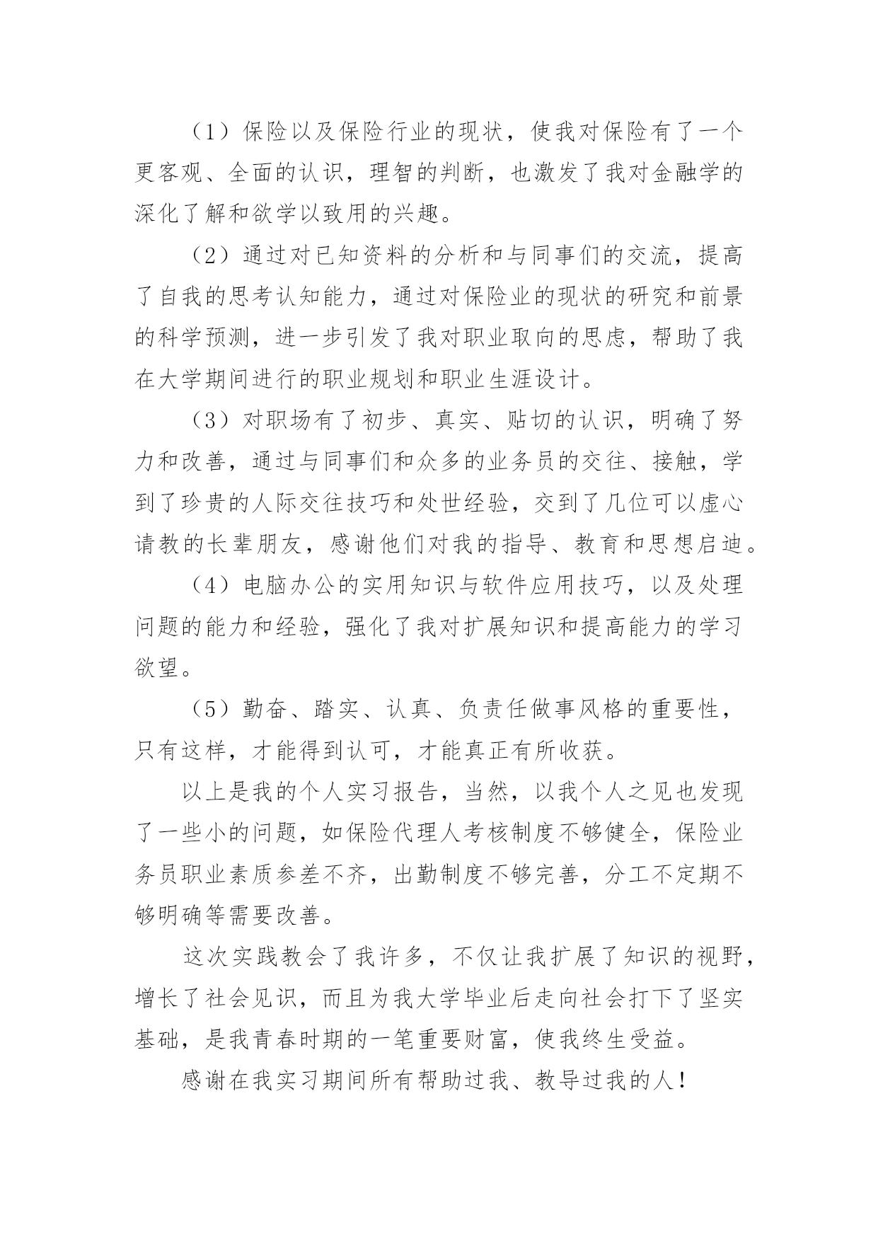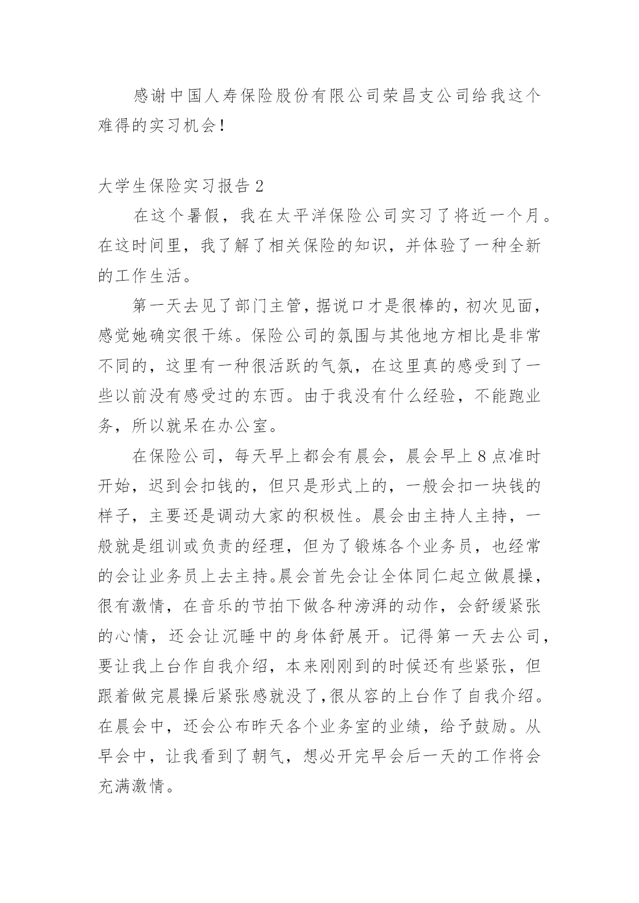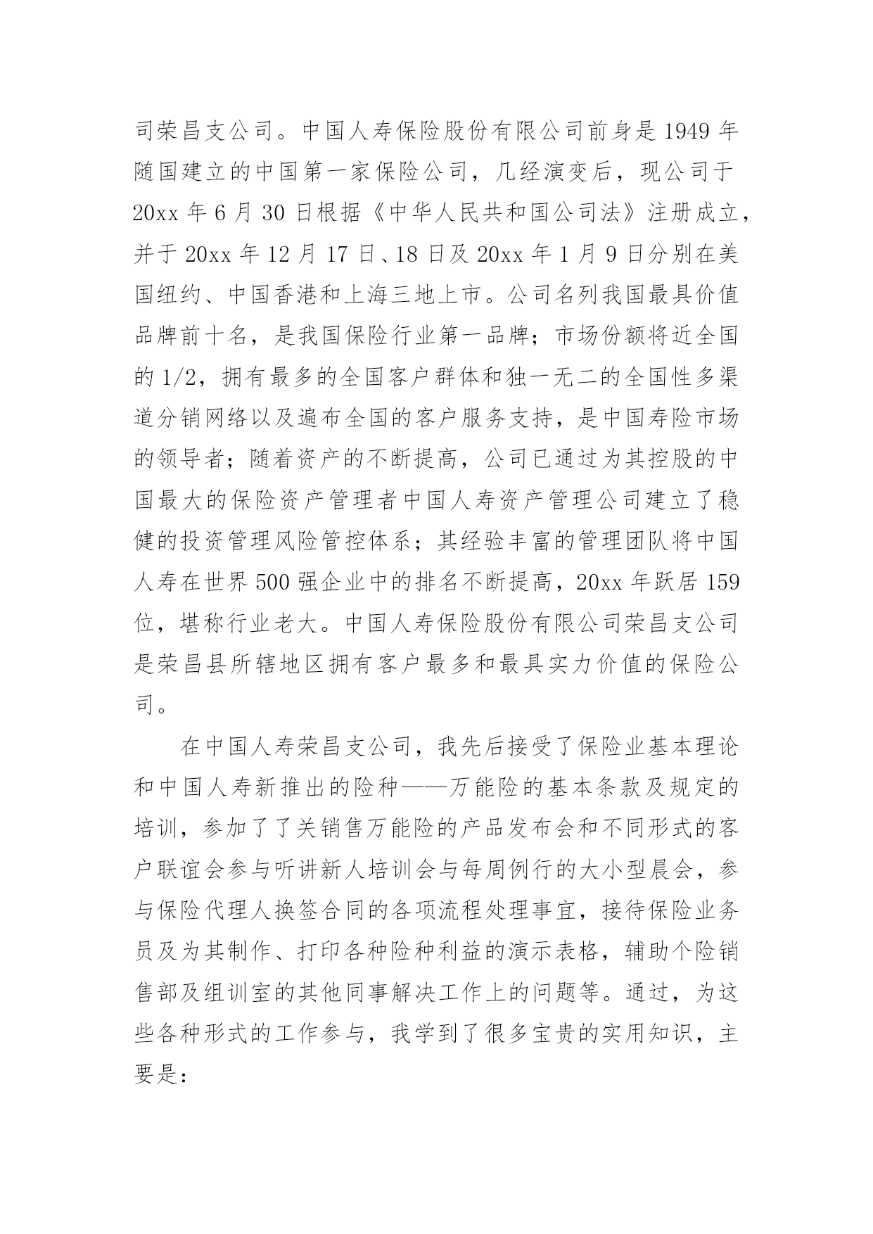 大学生保险实习报告随着社会一步步向前发展,报告的适用范围越来越广泛,我们在写报告的时候要注意语言要准确、简洁。一听到写报告就拖延症懒癌齐复发?以下是小编帮大家整理的大学生保险实习报告,希望能够帮助到大家。大学生保险实习报告1基本情况:办公实习实习目的:通过办公实习了解保险行业及其营销运作状况,在此基础上把所学的商务和营销理论知识与工作实践紧密结合起来,培养实际工作操作能力与分析思考能力,以达到学以致用,并积累一定的社会处世经验。实习时间:实习地点:中国人寿保险股份有限公司荣昌支公司实习工作总结报告:今年暑假,我有幸到中国人寿保险股份有限公司荣昌支公司进行了为期40天的实习,在这一个多月的实习中我学到了很多在课堂上和书本上根本就学不到的知识,受益匪浅。现在我就对这40天的实习做一个工作小结。首先介绍一下我的实习单位:中国人寿保险股份有限公司荣昌支公司。中国人寿保险股份有限公司前身是1949年随国建立的中国第一家保险公司,几经演变后,现公司于20xx年6月30日根据《中华人民共和国公司法》注册成立,并于20xx年12月17日、18日及20xx年1月9日分别在美国纽约、中国香港和上海三地上市。公司名列我国最具价值品牌前十名,是我国保险行业第一品牌;市场份额将近全国的1/2,拥有最多的全国客户群体和独一无二的全国性多渠道分销网络以及遍布全国的客户服务支持,是中国寿险市场的领导者;随着资产的不断提高,公司已通过为其控股的中国最大的保险资产管理者中国人寿资产管理公司建立了稳健的投资管理风险管控体系;其经验丰富的管理团队将中国人寿在世界500强企业中的排名不断提高,20xx年跃居159位,堪称行业老大。中国人寿保险股份有限公司荣昌支公司是荣昌县所辖地区拥有客户最多和最具实力价值的保险公司。在中国人寿荣昌支公司,我先后接受了保险业基本理论和中国人寿新推出的险种——万能险的基本条款及规定的培训,参加了了关销售万能险的产品发布会和不同形式的客户联谊会参与听讲新人培训会与每周例行的大小型晨会,参与保险代理人换签合同的各项流程处理事宜,接待保险业务员及为其制作、打印各种险种利益的演示表格,辅助个险销售部及组训室的其他同事解决工作上的问题等。通过,为这些各种形式的工作参与,我学到了很多宝贵的实用知识,主要是:(1)保险以及保险行业的现状,使我对保险有了一个更客观、全面的认识,理智的判断,也激发了我对金融学的深化了解和欲学以致用的兴趣。(2)通过对已知资料的分析和与同事们的交流,提高了自我的思考认知能力,通过对保险业的现状的研究和前景的科学预测,进一步引发了我对职业取向的思虑,帮助了我在大学期间进行的职业规划和职业生涯设计。(3)对职场有了初步、真实、贴切的认识,明确了努力和改善,通过与同事们和众多的业务员的交往、接触,学到了珍贵的人际交往技巧和处世经验,交到了几位可以虚心请教的长辈朋友,感谢他们对我的指导、教育和思想启迪。(4)电脑办公的实用知识与软件应用技巧,以及处理问题的能力和经验,强化了我对扩展知识和提高能力的学习欲望。(5)勤奋、踏实、认真、负责任做事风格的重要性,只有这样,才能得到认可,才能真正有所收获。以上是我的个人实习报告,当然,以我个人之见也发现了一些小的问题,如保险代理人考核制度不够健全,保险业务员职业素质参差不齐,出勤制度不够完善,分工不定期不够明确等需要改善。这次实践教会了我许多,不仅让我扩展了知识的视野,增长了社会见识,而且为我大学毕业后走向社会打下了坚实基础,是我青春时期的一笔重要财富,使我终生受益。感谢在我实习期间所有帮助过我、教导过我的人!感谢中国人寿保险股份有限公司荣昌支公司给我这个难得的实习机会!大学生保险实习报告2在这个暑假,我在太平洋保险公司实习了将近一个月。在这时间里,我了解了相关保险的知识,并体验了一种全新的工作生活。第一天去见了部门主管,据说口才是很棒的,初次见面,感觉她确实很干练。保险公司的氛围与其他地方相比是非常不同的,这里有一种很活跃的气氛,在这里真的感受到了一些以前没有感受过的东西。由于我没有什么经验,不能跑业务,所以就呆在办公室。在保险公司,每天早上都会有晨会,晨会早上8点准时开始,迟到会扣钱的,但只是形式上的,一般会扣一块钱的样子,主要还是调动大家的积极性。晨会由主持人主持,一般就是组训或负责的经理,但为了锻炼各个业务员,也经常的会让业务员上去主持。晨会首先会让全体同仁起立做晨操,很有激情,在音乐的节拍下做各种滂湃的动作,会舒缓紧张的心情,还会让沉睡中的身体舒展开。记得第一天去公司,要让我上台作自我介绍,本来刚刚到的时候还有些紧张,但跟着做完晨操后紧张感就没了,很从容的上台作了自我介绍。在晨会中,还会公布昨天各个业务室的业绩,给予鼓励。从早会中,让我看到了朝气,想必开完早会后一天的工作将会充满