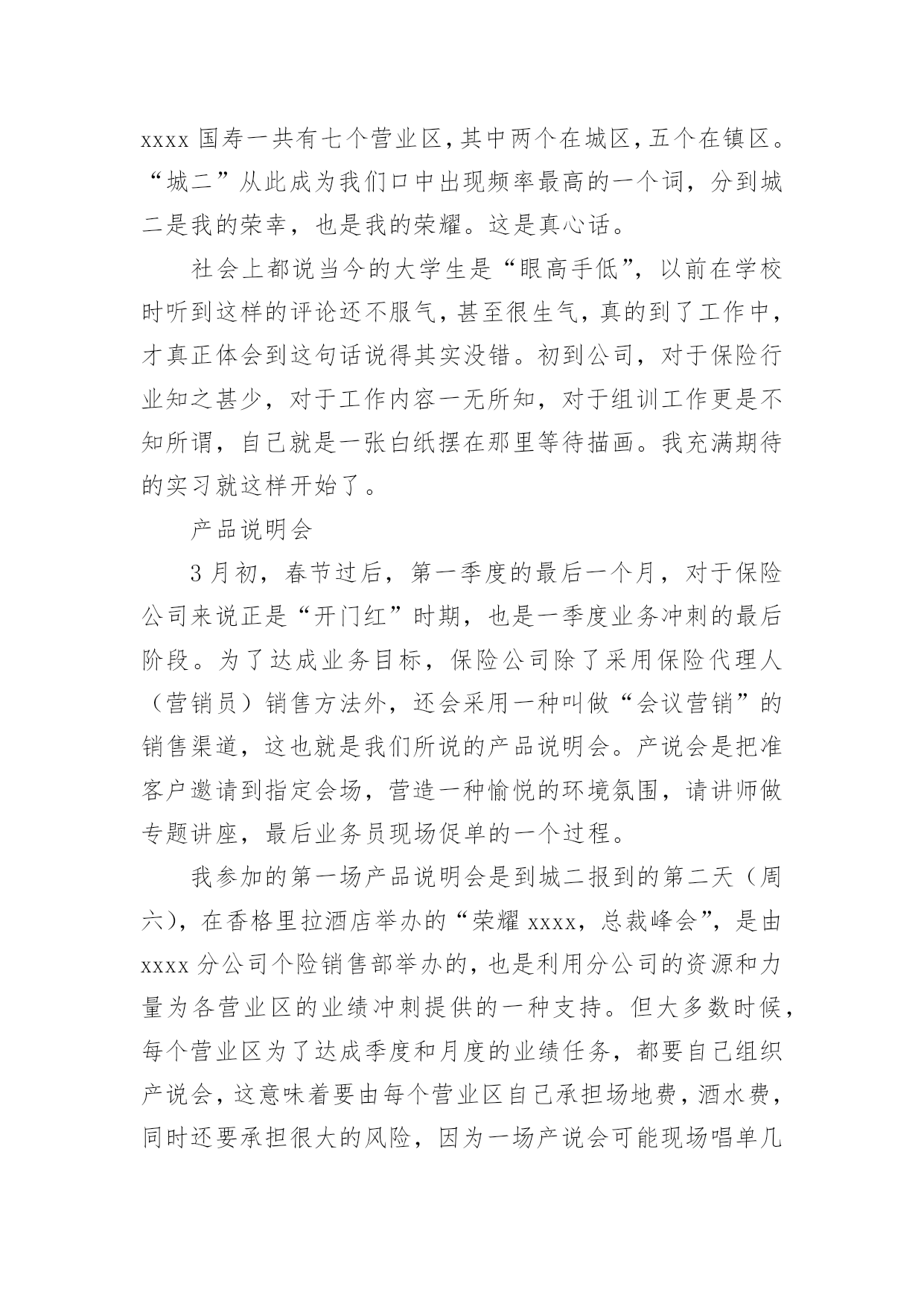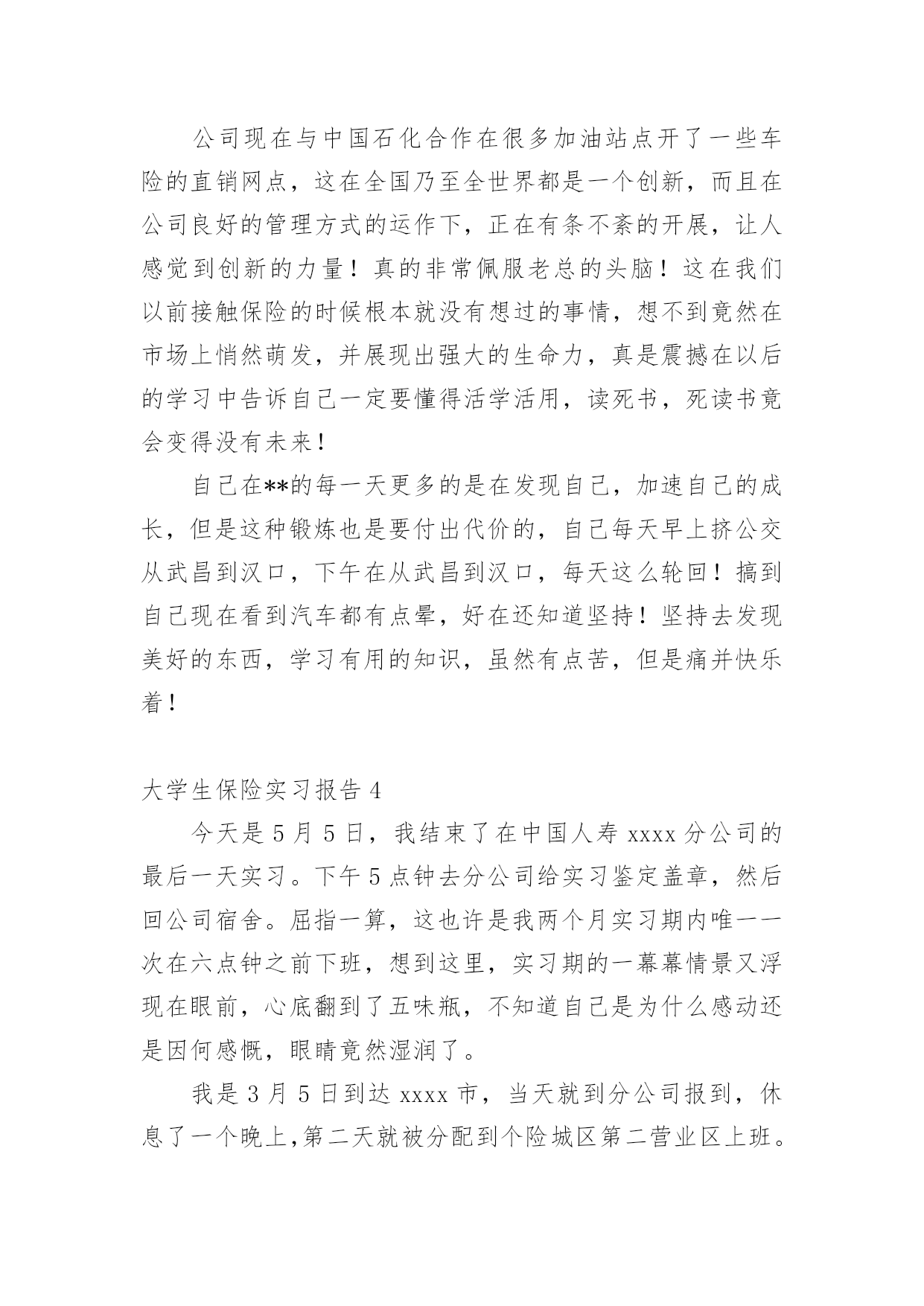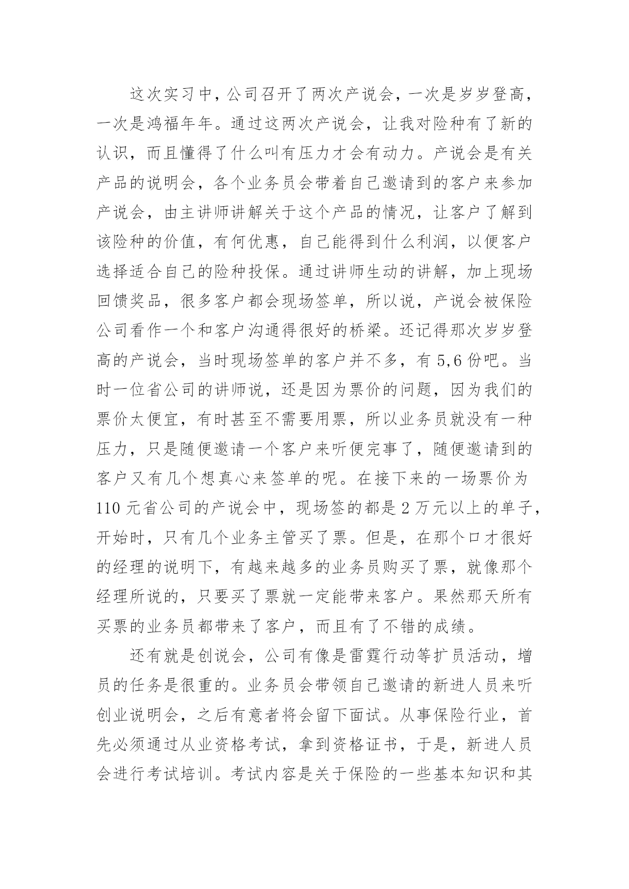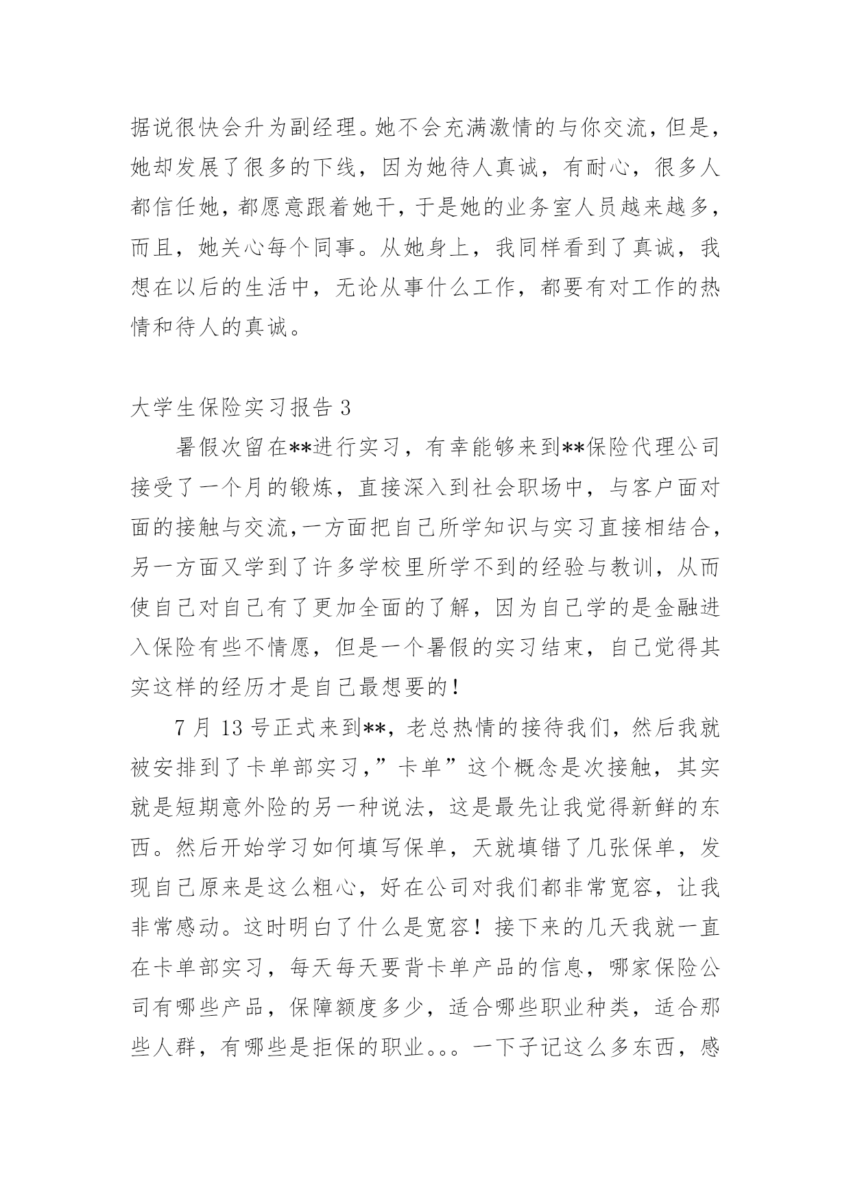 大学生保险实习报告随着社会一步步向前发展,报告的适用范围越来越广泛,我们在写报告的时候要注意语言要准确、简洁。一听到写报告就拖延症懒癌齐复发?以下是小编帮大家整理的大学生保险实习报告,希望能够帮助到大家。大学生保险实习报告1基本情况:办公实习实习目的:通过办公实习了解保险行业及其营销运作状况,在此基础上把所学的商务和营销理论知识与工作实践紧密结合起来,培养实际工作操作能力与分析思考能力,以达到学以致用,并积累一定的社会处世经验。实习时间:实习地点:中国人寿保险股份有限公司荣昌支公司实习工作总结报告:今年暑假,我有幸到中国人寿保险股份有限公司荣昌支公司进行了为期40天的实习,在这一个多月的实习中我学到了很多在课堂上和书本上根本就学不到的知识,受益匪浅。现在我就对这40天的实习做一个工作小结。首先介绍一下我的实习单位:中国人寿保险股份有限公司荣昌支公司。中国人寿保险股份有限公司前身是1949年随国建立的中国第一家保险公司,几经演变后,现公司于20xx年6月30日根据《中华人民共和国公司法》注册成立,并于20xx年12月17日、18日及20xx年1月9日分别在美国纽约、中国香港和上海三地上市。公司名列我国最具价值品牌前十名,是我国保险行业第一品牌;市场份额将近全国的1/2,拥有最多的全国客户群体和独一无二的全国性多渠道分销网络以及遍布全国的客户服务支持,是中国寿险市场的领导者;随着资产的不断提高,公司已通过为其控股的中国最大的保险资产管理者中国人寿资产管理公司建立了稳健的投资管理风险管控体系;其经验丰富的管理团队将中国人寿在世界500强企业中的排名不断提高,20xx年跃居159位,堪称行业老大。中国人寿保险股份有限公司荣昌支公司是荣昌县所辖地区拥有客户最多和最具实力价值的保险公司。在中国人寿荣昌支公司,我先后接受了保险业基本理论和中国人寿新推出的险种——万能险的基本条款及规定的培训,参加了了关销售万能险的产品发布会和不同形式的客户联谊会参与听讲新人培训会与每周例行的大小型晨会,参与保险代理人换签合同的各项流程处理事宜,接待保险业务员及为其制作、打印各种险种利益的演示表格,辅助个险销售部及组训室的其他同事解决工作上的问题等。通过,为这些各种形式的工作参与,我学到了很多宝贵的实用知识,主要是:(1)保险以及保险行业的现状,使我对保险有了一个更客观、全面的认识,理智的判断,也激发了我对金融学的深化了解和欲学以致用的兴趣。(2)通过对已知资料的分析和与同事们的交流,提高了自我的思考认知能力,通过对保险业的现状的研究和前景的科学预测,进一步引发了我对职业取向的思虑,帮助了我在大学期间进行的职业规划和职业生涯设计。(3)对职场有了初步、真实、贴切的认识,明确了努力和改善,通过与同事们和众多的业务员的交往、接触,学到了珍贵的人际交往技巧和处世经验,交到了几位可以虚心请教的长辈朋友,感谢他们对我的指导、教育和思想启迪。(4)电脑办公的实用知识与软件应用技巧,以及处理问题的能力和经验,强化了我对扩展知识和提高能力的学习欲望。(5)勤奋、踏实、认真、负责任做事风格的重要性,只有这样,才能得到认可,才能真正有所收获。以上是我的个人实习报告,当然,以我个人之见也发现了一些小的问题,如保险代理人考核制度不够健全,保险业务员职业素质参差不齐,出勤制度不够完善,分工不定期不够明确等需要改善。这次实践教会了我许多,不仅让我扩展了知识的视野,增长了社会见识,而且为我大学毕业后走向社会打下了坚实基础,是我青春时期的一笔重要财富,使我终生受益。感谢在我实习期间所有帮助过我、教导过我的人!感谢中国人寿保险股份有限公司荣昌支公司给我这个难得的实习机会!大学生保险实习报告2在这个暑假,我在太平洋保险公司实习了将近一个月。在这时间里,我了解了相关保险的知识,并体验了一种全新的工作生活。第一天去见了部门主管,据说口才是很棒的,初次见面,感觉她确实很干练。保险公司的氛围与其他地方相比是非常不同的,这里有一种很活跃的气氛,在这里真的感受到了一些以前没有感受过的东西。由于我没有什么经验,不能跑业务,所以就呆在办公室。在保险公司,每天早上都会有晨会,晨会早上8点准时开始,迟到会扣钱的,但只是形式上的,一般会扣一块钱的样子,主要还是调动大家的积极性。晨会由主持人主持,一般就是组训或负责的经理,但为了锻炼各个业务员,也经常的会让业务员上去主持。晨会首先会让全体同仁起立做晨操,很有激情,在音乐的节拍下做各种滂湃的动作,会舒缓紧张的心情,还会让沉睡中的身体舒展开。记得第一天去公司,要让我上台作自我介绍,本来刚刚到的时候还有些紧张,但跟着做完晨操后紧张感就没了,很从容的上台作了自我介绍。在晨会中,还会公布昨天各个业务室的业绩,给予鼓励。从早会中,让我看到了朝气,想必开完早会后一天的工作将会充满