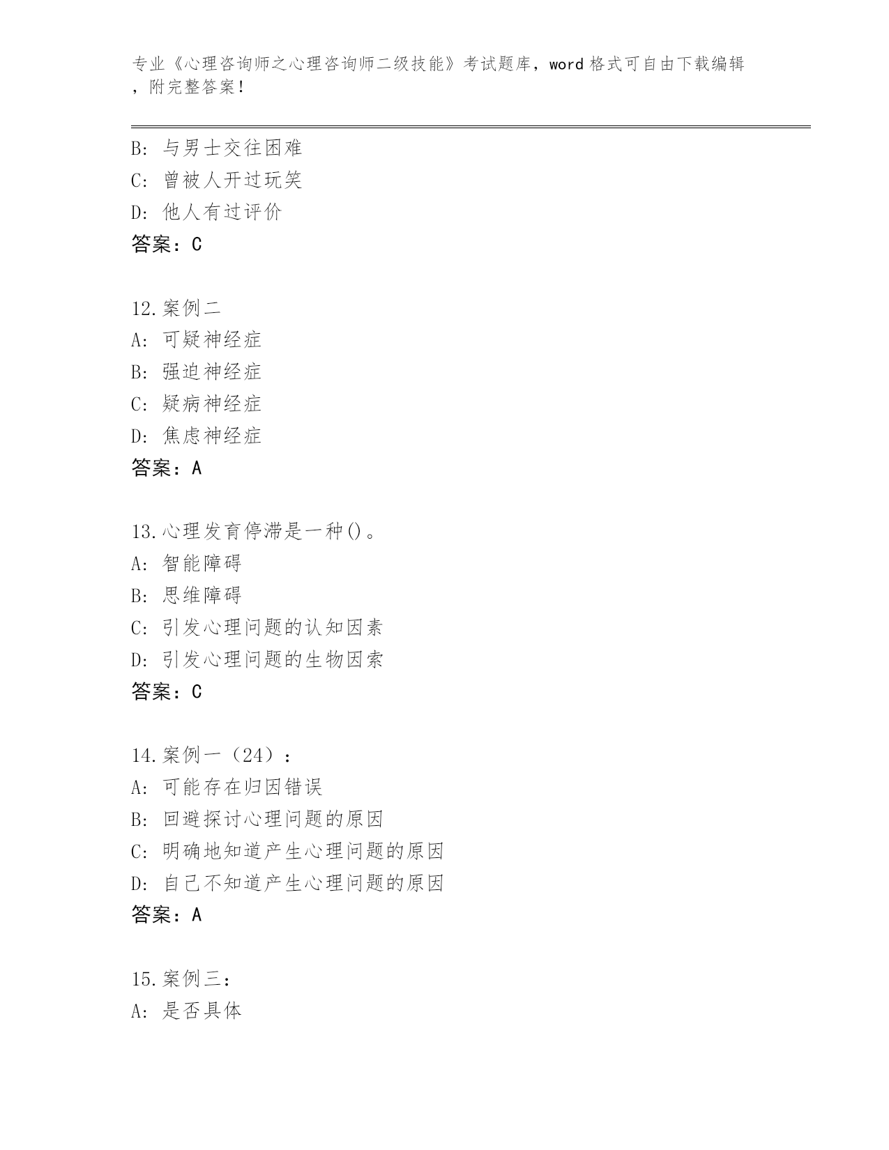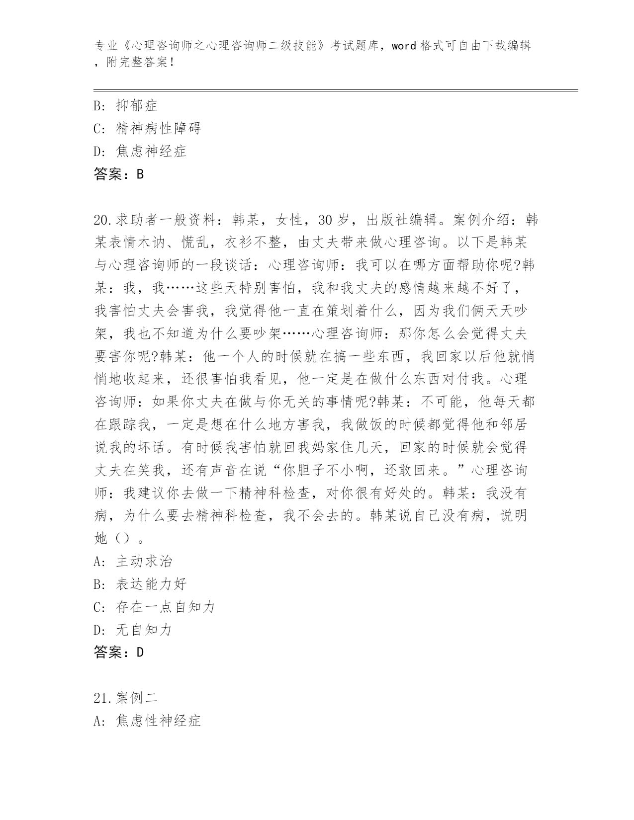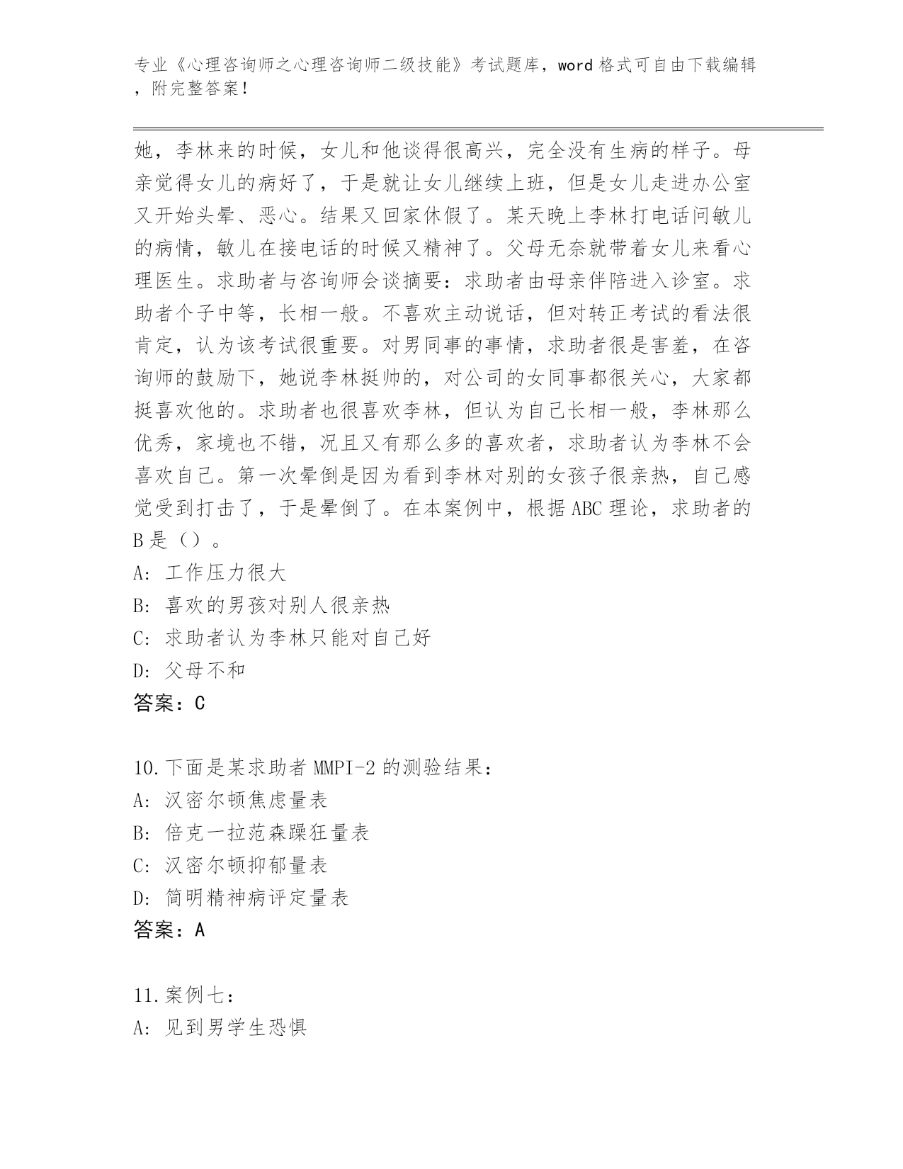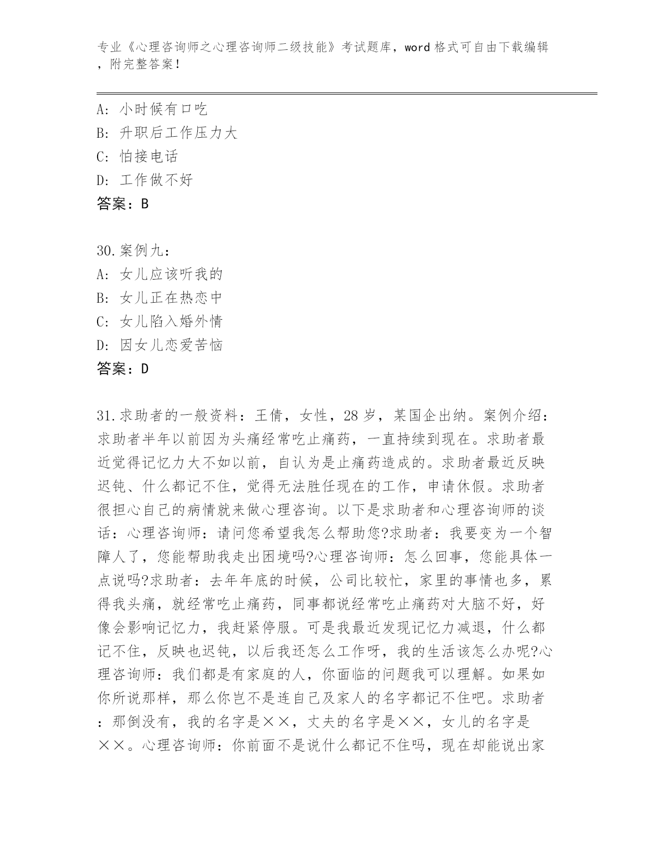 云南省2024《心理咨询师之心理咨询师二级技能》考试题库大全带答案(完整版)