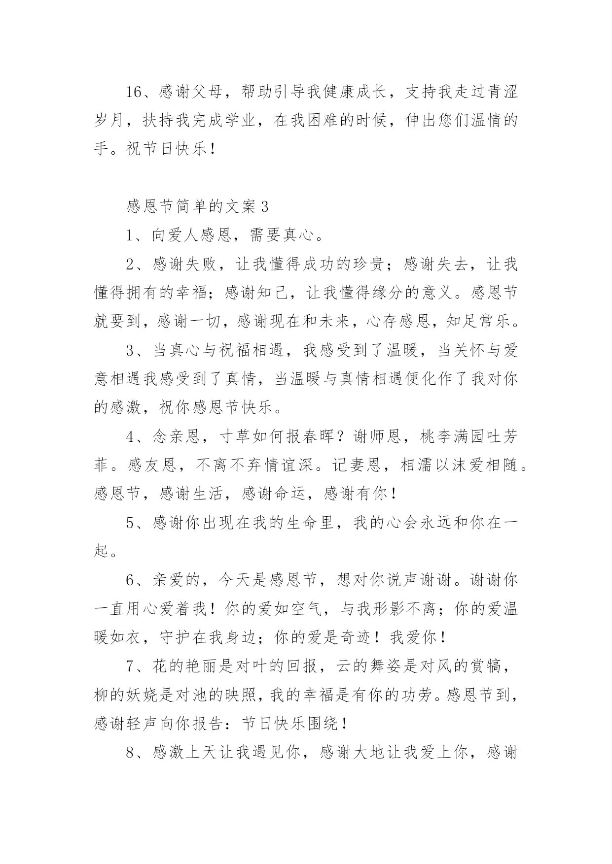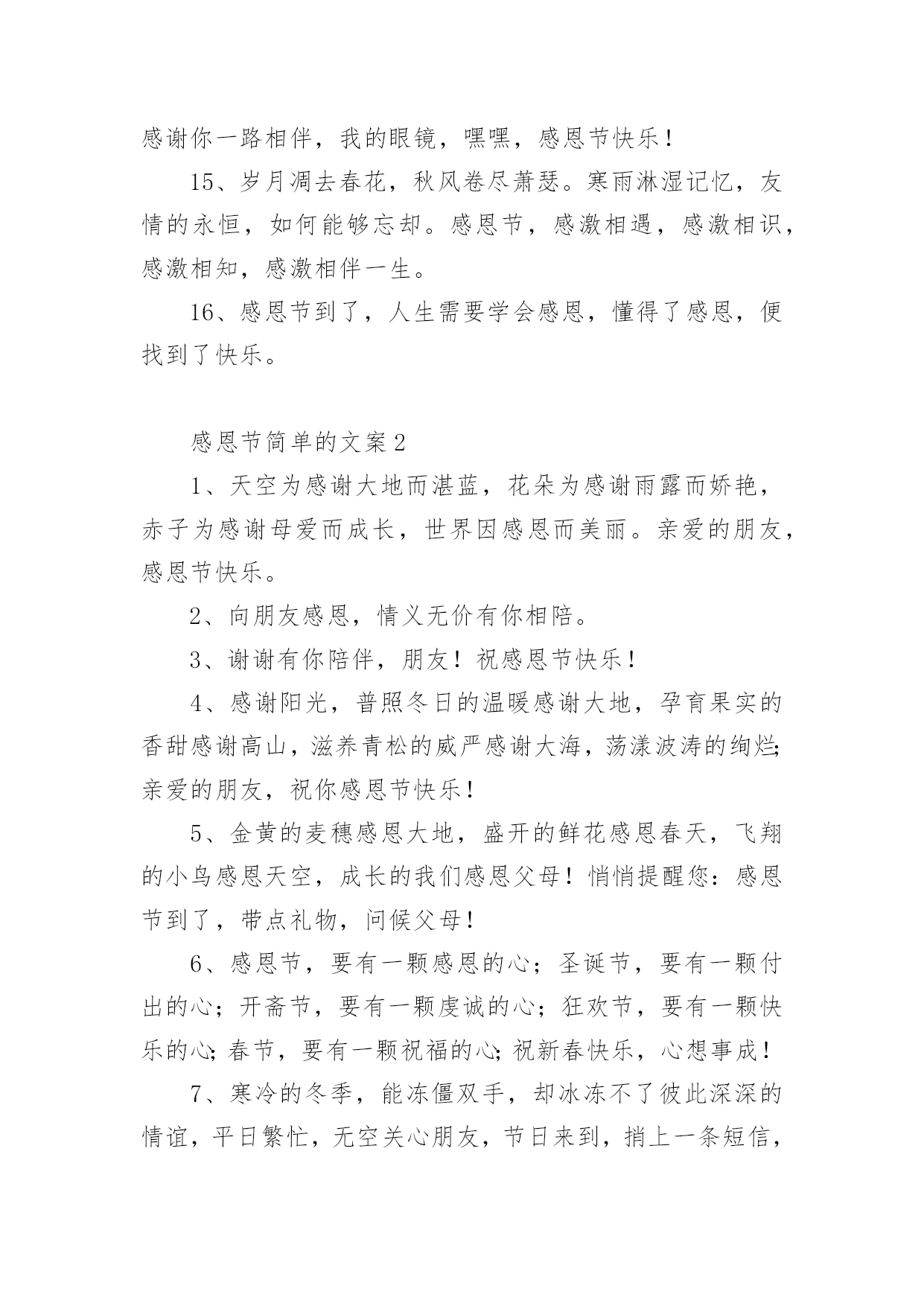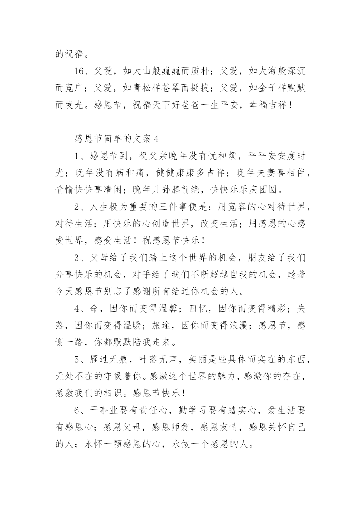 感恩节简单的文案2021感恩节简单的文案在日常的学习、工作、生活中,大家肯定对各类文案都很熟悉吧,文案用于分享快乐,宣泄伤感。那发什么样的文案才不会烂大街呢?下面是小编帮大家整理的2021感恩节简单的文案,欢迎阅读与收藏。感恩节简单的文案11、感谢天,带来阳光的温暖;感谢地,带来收获的丰满;感谢山,带来攀登的伟岸;感谢海,带来碧波的浪漫;感谢你,带来友情的温暖。祝感恩节快乐!2、感恩节到,衷心祝愿你亲朋常相伴,关爱记心间;幸福常相随,走过不后悔;快乐围绕你,好运不离弃;福气年年把你笼罩,祝福天天把你拥抱!3、感恩节到了,各国重量级人物向你问好:希腊的爱神祝你爱情甜蜜;埃及的法老祝你健康长寿;中国的财神爷祝你财源滚滚;还有本人祝你一切如意。4、天上飘散的雨露滋润了干枯的大地,人间流转的关爱温热了无数的心灵,人海中你让我懂得了什么是爱,在这感恩的日子里祝你开心快乐。5、人生旅程上,您丰富我的心灵,开发我的智力,为我点燃了希望的光芒。谢谢您,老师!6、没有利益,没有纷争,没有硝烟,没有怀疑,你永远是我最真的朋友。患难与共,真情永在,感恩节之际,送你一套茶具,闲时一起品茶细数生活的甜蜜。7、感谢你为我做的一切,你是我最想要感谢的朋友,在这个特殊的日子里请允许我真心的说一声谢谢你,祝你永远开心。8、感恩节到了,把鲜花送给老师,是老师教了我知识。我把友谊送给同事,是他们让我快乐。我把祝福送给您,希望它越来越好!9、风吹不散的关怀,雨冲不走的问候,都化作对你永遥不变的问候,在感恩节里真心地希望你快乐到永遥。10、抛开手中的工作,放松自己的心情,想起远方的爸妈,拨出手中的电话,熟悉的声音,万语千言只有一句话:“感恩节到啦!感谢老爸老妈”11、一件小小的事,父爱浮现,一声小小的祝福,爸爸的温柔都会摆在眼前,请你相信,即使再严格再苛刻的爸爸,肯定是爱你的,他也有温柔的一面。让我们一起“感悟父爱”吧!12、你是一个好人,拥有美丽灵魂,你用一往情深,抚平我的伤痕,为你打开心门,感谢大德大恩。感恩节快乐。13、呼叫火鸡,呼叫火鸡,你在哪里?感恩节马上就要到来了,不要再躲起来啦,快跟我联络,让我们怀着感激的心情,一起来过这个节日吧!14、人生旅途不凄凉,只因你我有希望;生活漂泊举不定,但求你我有梦想;事业艰难险重重,唯有你我共坚强;感谢你一路相伴,我的眼镜,嘿嘿,感恩节快乐!15、岁月凋去春花,秋风卷尽萧瑟。寒雨淋湿记忆,友情的永恒,如何能够忘却。感恩节,感激相遇,感激相识,感激相知,感激相伴一生。16、感恩节到了,人生需要学会感恩,懂得了感恩,便找到了快乐。感恩节简单的文案21、天空为感谢大地而湛蓝,花朵为感谢雨露而娇艳,赤子为感谢母爱而成长,世界因感恩而美丽。亲爱的朋友,感恩节快乐。2、向朋友感恩,情义无价有你相陪。3、谢谢有你陪伴,朋友!祝感恩节快乐!4、感谢阳光,普照冬日的温暖感谢大地,孕育果实的香甜感谢高山,滋养青松的威严感谢大海,荡漾波涛的绚烂;亲爱的朋友,祝你感恩节快乐!5、金黄的麦穗感恩大地,盛开的鲜花感恩春天,飞翔的小鸟感恩天空,成长的我们感恩父母!悄悄提醒您:感恩节到了,带点礼物,问候父母!6、感恩节,要有一颗感恩的心;圣诞节,要有一颗付出的心;开斋节,要有一颗虔诚的心;狂欢节,要有一颗快乐的心;春节,要有一颗祝福的心;祝新春快乐,心想事成!7、寒冷的冬季,能冻僵双手,却冰冻不了彼此深深的情谊,平日繁忙,无空关心朋友,节日来到,捎上一条短信,祝你感恩节快乐!8、亲爱的妈妈:您曾用您坚实的臂弯为我撑起一片蓝天;而今,我也要用我日益丰满的羽翼为您遮挡风雨。妈妈,我永远爱您!祝您节日快乐!9、感恩节到了,送你三块巧克力:第一块德芙,望你得到天下所有的幸福;第二块金帝,祝你在金色年华过着帝王的生活;第三块吉百利,祝你吉年百十顺利。10、感恩节到,你是我应该感谢人,谢谢你一直的陪伴与鼓励,让我在风雨面前不再退缩,谢谢你给我的快乐,让我不再忧伤;祝愿你幸福健康!开心快乐!11、感谢天感谢地,感谢阳光,让我有你这样的知己。感恩节,向朋友真诚说声:谢谢,我将永远铭记珍惜友谊。感恩节快乐!12、一个微笑,是对生活感恩;一句保重,是对自己感恩;一句没关系,是对失败感恩;一声问候,是对朋友感恩。心怀感恩,善待自己,预祝你感恩节快乐!13、我把快乐送你,愿你无忧,请收藏;我把平安送你,愿你无事,请收藏;我把健康送你,愿你无痛,请收藏;我把祝福送你,愿你喜欢;敬爱的x先生,值感恩节,请收藏:感恩节快乐!14、父爱如山,挺拔的身姿顶起家;父爱如海,宽广的胸怀包容家;父爱如川,涓涓细流滋润着家。感恩节到了,祝父亲感恩节快乐。15、感恩节到了,感恩人生,愿你幸福!16、感谢父母,帮助引导我健康成长,支持我走过青涩岁月,扶持我完成学业,在我困难的时候,伸出您们温情