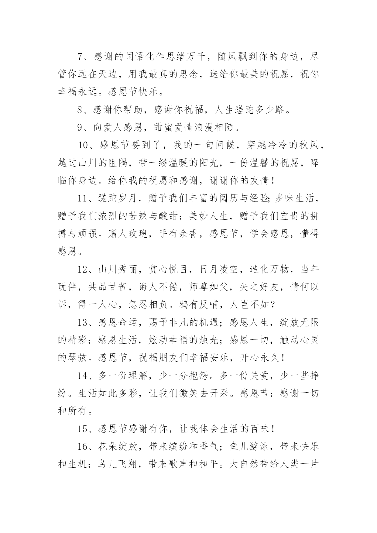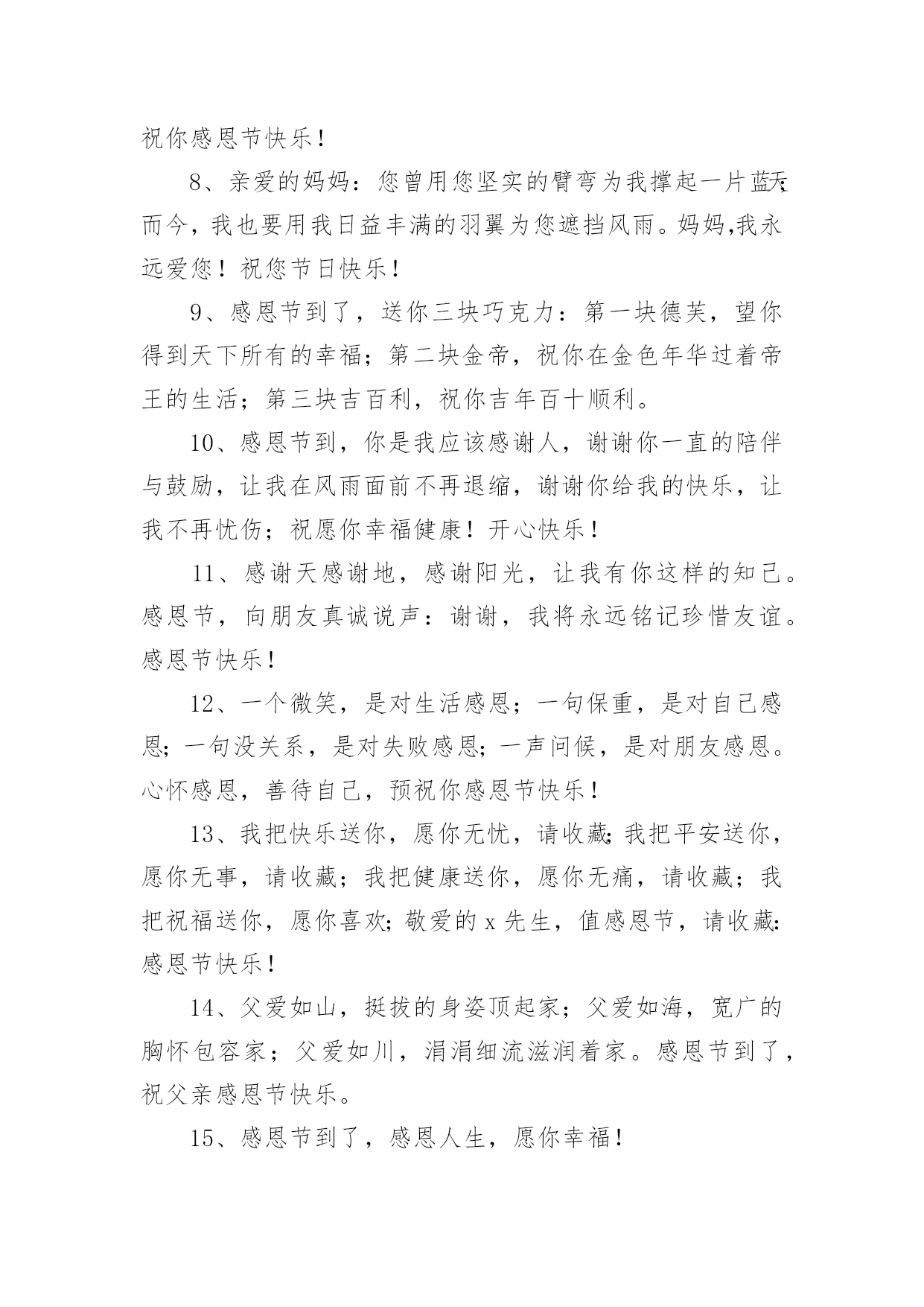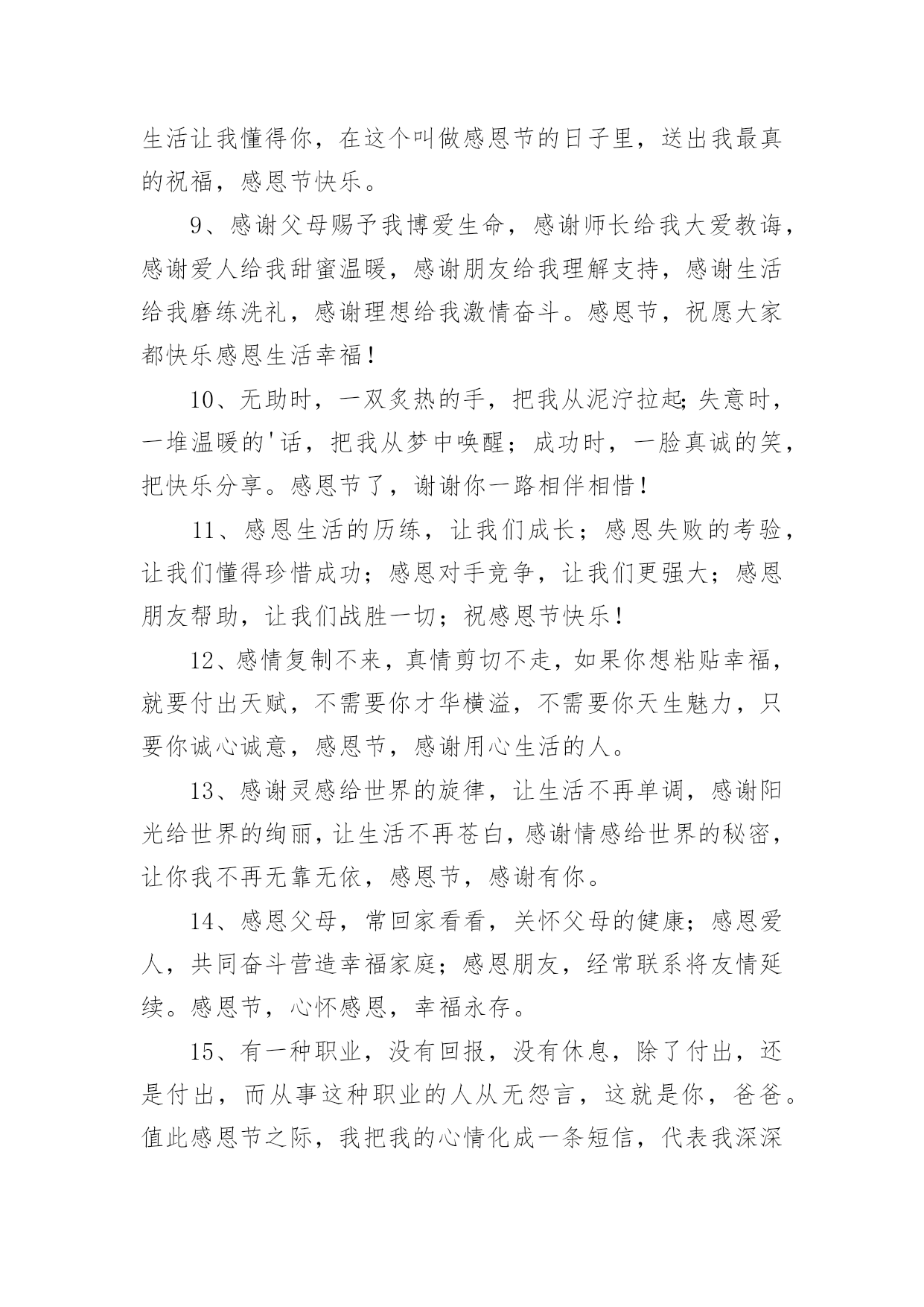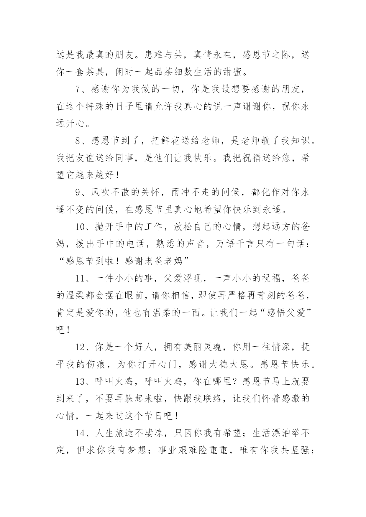 感恩节简单的文案2021感恩节简单的文案在日常的学习、工作、生活中,大家肯定对各类文案都很熟悉吧,文案用于分享快乐,宣泄伤感。那发什么样的文案才不会烂大街呢?下面是小编帮大家整理的2021感恩节简单的文案,欢迎阅读与收藏。感恩节简单的文案11、感谢天,带来阳光的温暖;感谢地,带来收获的丰满;感谢山,带来攀登的伟岸;感谢海,带来碧波的浪漫;感谢你,带来友情的温暖。祝感恩节快乐!2、感恩节到,衷心祝愿你亲朋常相伴,关爱记心间;幸福常相随,走过不后悔;快乐围绕你,好运不离弃;福气年年把你笼罩,祝福天天把你拥抱!3、感恩节到了,各国重量级人物向你问好:希腊的爱神祝你爱情甜蜜;埃及的法老祝你健康长寿;中国的财神爷祝你财源滚滚;还有本人祝你一切如意。4、天上飘散的雨露滋润了干枯的大地,人间流转的关爱温热了无数的心灵,人海中你让我懂得了什么是爱,在这感恩的日子里祝你开心快乐。5、人生旅程上,您丰富我的心灵,开发我的智力,为我点燃了希望的光芒。谢谢您,老师!6、没有利益,没有纷争,没有硝烟,没有怀疑,你永远是我最真的朋友。患难与共,真情永在,感恩节之际,送你一套茶具,闲时一起品茶细数生活的甜蜜。7、感谢你为我做的一切,你是我最想要感谢的朋友,在这个特殊的日子里请允许我真心的说一声谢谢你,祝你永远开心。8、感恩节到了,把鲜花送给老师,是老师教了我知识。我把友谊送给同事,是他们让我快乐。我把祝福送给您,希望它越来越好!9、风吹不散的关怀,雨冲不走的问候,都化作对你永遥不变的问候,在感恩节里真心地希望你快乐到永遥。10、抛开手中的工作,放松自己的心情,想起远方的爸妈,拨出手中的电话,熟悉的声音,万语千言只有一句话:“感恩节到啦!感谢老爸老妈”11、一件小小的事,父爱浮现,一声小小的祝福,爸爸的温柔都会摆在眼前,请你相信,即使再严格再苛刻的爸爸,肯定是爱你的,他也有温柔的一面。让我们一起“感悟父爱”吧!12、你是一个好人,拥有美丽灵魂,你用一往情深,抚平我的伤痕,为你打开心门,感谢大德大恩。感恩节快乐。13、呼叫火鸡,呼叫火鸡,你在哪里?感恩节马上就要到来了,不要再躲起来啦,快跟我联络,让我们怀着感激的心情,一起来过这个节日吧!14、人生旅途不凄凉,只因你我有希望;生活漂泊举不定,但求你我有梦想;事业艰难险重重,唯有你我共坚强;感谢你一路相伴,我的眼镜,嘿嘿,感恩节快乐!15、岁月凋去春花,秋风卷尽萧瑟。寒雨淋湿记忆,友情的永恒,如何能够忘却。感恩节,感激相遇,感激相识,感激相知,感激相伴一生。16、感恩节到了,人生需要学会感恩,懂得了感恩,便找到了快乐。感恩节简单的文案21、天空为感谢大地而湛蓝,花朵为感谢雨露而娇艳,赤子为感谢母爱而成长,世界因感恩而美丽。亲爱的朋友,感恩节快乐。2、向朋友感恩,情义无价有你相陪。3、谢谢有你陪伴,朋友!祝感恩节快乐!4、感谢阳光,普照冬日的温暖感谢大地,孕育果实的香甜感谢高山,滋养青松的威严感谢大海,荡漾波涛的绚烂;亲爱的朋友,祝你感恩节快乐!5、金黄的麦穗感恩大地,盛开的鲜花感恩春天,飞翔的小鸟感恩天空,成长的我们感恩父母!悄悄提醒您:感恩节到了,带点礼物,问候父母!6、感恩节,要有一颗感恩的心;圣诞节,要有一颗付出的心;开斋节,要有一颗虔诚的心;狂欢节,要有一颗快乐的心;春节,要有一颗祝福的心;祝新春快乐,心想事成!7、寒冷的冬季,能冻僵双手,却冰冻不了彼此深深的情谊,平日繁忙,无空关心朋友,节日来到,捎上一条短信,祝你感恩节快乐!8、亲爱的妈妈:您曾用您坚实的臂弯为我撑起一片蓝天;而今,我也要用我日益丰满的羽翼为您遮挡风雨。妈妈,我永远爱您!祝您节日快乐!9、感恩节到了,送你三块巧克力:第一块德芙,望你得到天下所有的幸福;第二块金帝,祝你在金色年华过着帝王的生活;第三块吉百利,祝你吉年百十顺利。10、感恩节到,你是我应该感谢人,谢谢你一直的陪伴与鼓励,让我在风雨面前不再退缩,谢谢你给我的快乐,让我不再忧伤;祝愿你幸福健康!开心快乐!11、感谢天感谢地,感谢阳光,让我有你这样的知己。感恩节,向朋友真诚说声:谢谢,我将永远铭记珍惜友谊。感恩节快乐!12、一个微笑,是对生活感恩;一句保重,是对自己感恩;一句没关系,是对失败感恩;一声问候,是对朋友感恩。心怀感恩,善待自己,预祝你感恩节快乐!13、我把快乐送你,愿你无忧,请收藏;我把平安送你,愿你无事,请收藏;我把健康送你,愿你无痛,请收藏;我把祝福送你,愿你喜欢;敬爱的x先生,值感恩节,请收藏:感恩节快乐!14、父爱如山,挺拔的身姿顶起家;父爱如海,宽广的胸怀包容家;父爱如川,涓涓细流滋润着家。感恩节到了,祝父亲感恩节快乐。15、感恩节到了,感恩人生,愿你幸福!16、感谢父母,帮助引导我健康成长,支持我走过青涩岁月,扶持我完成学业,在我困难的时候,伸出您们温情