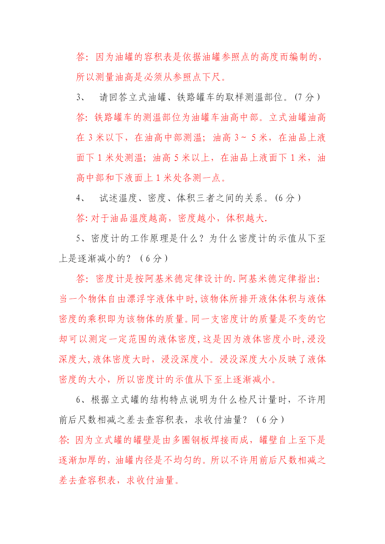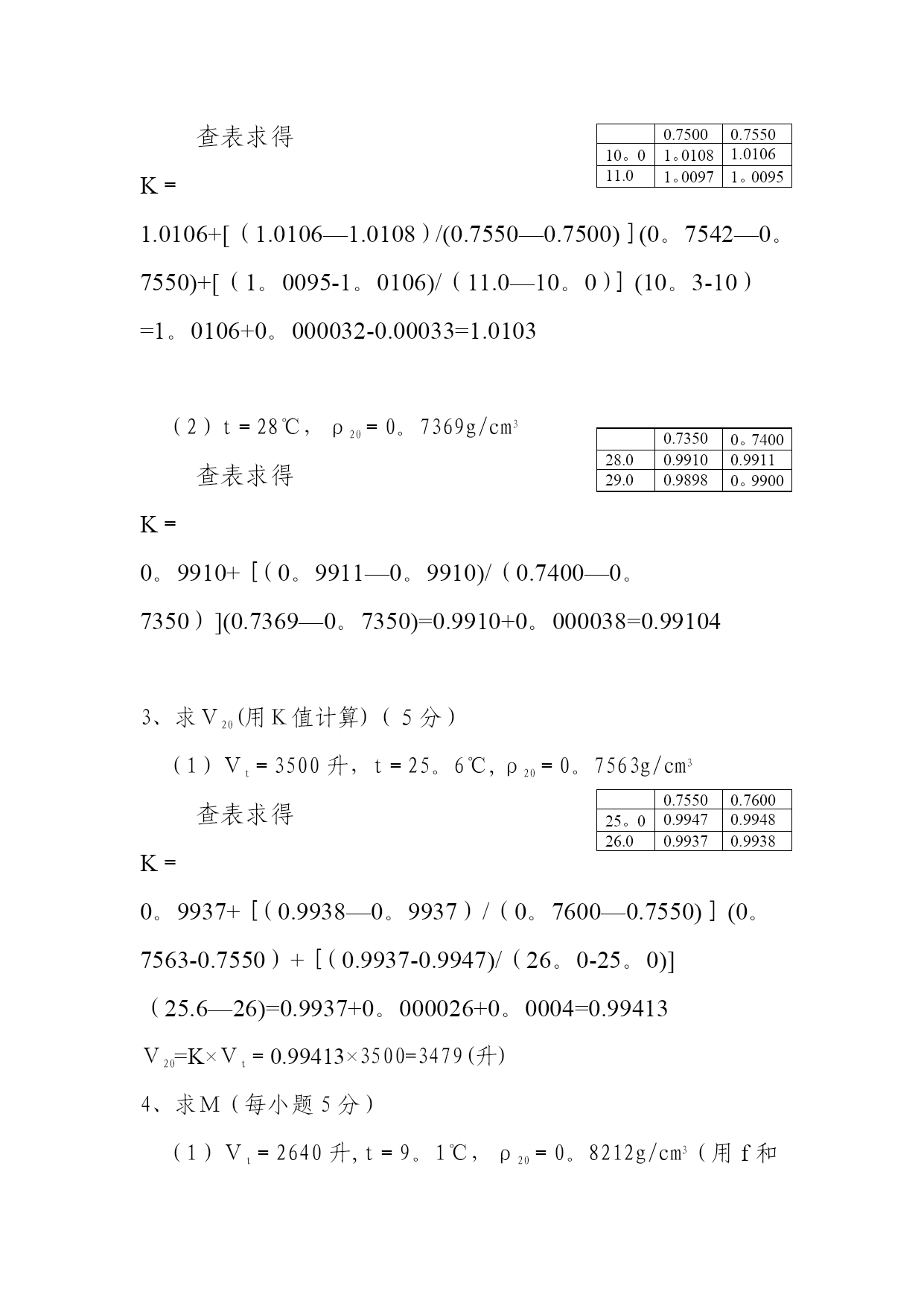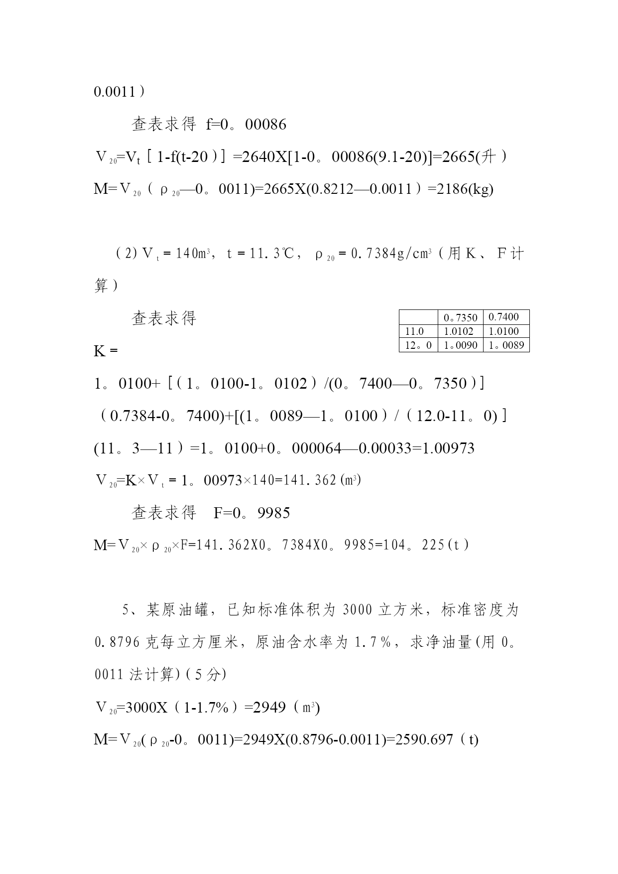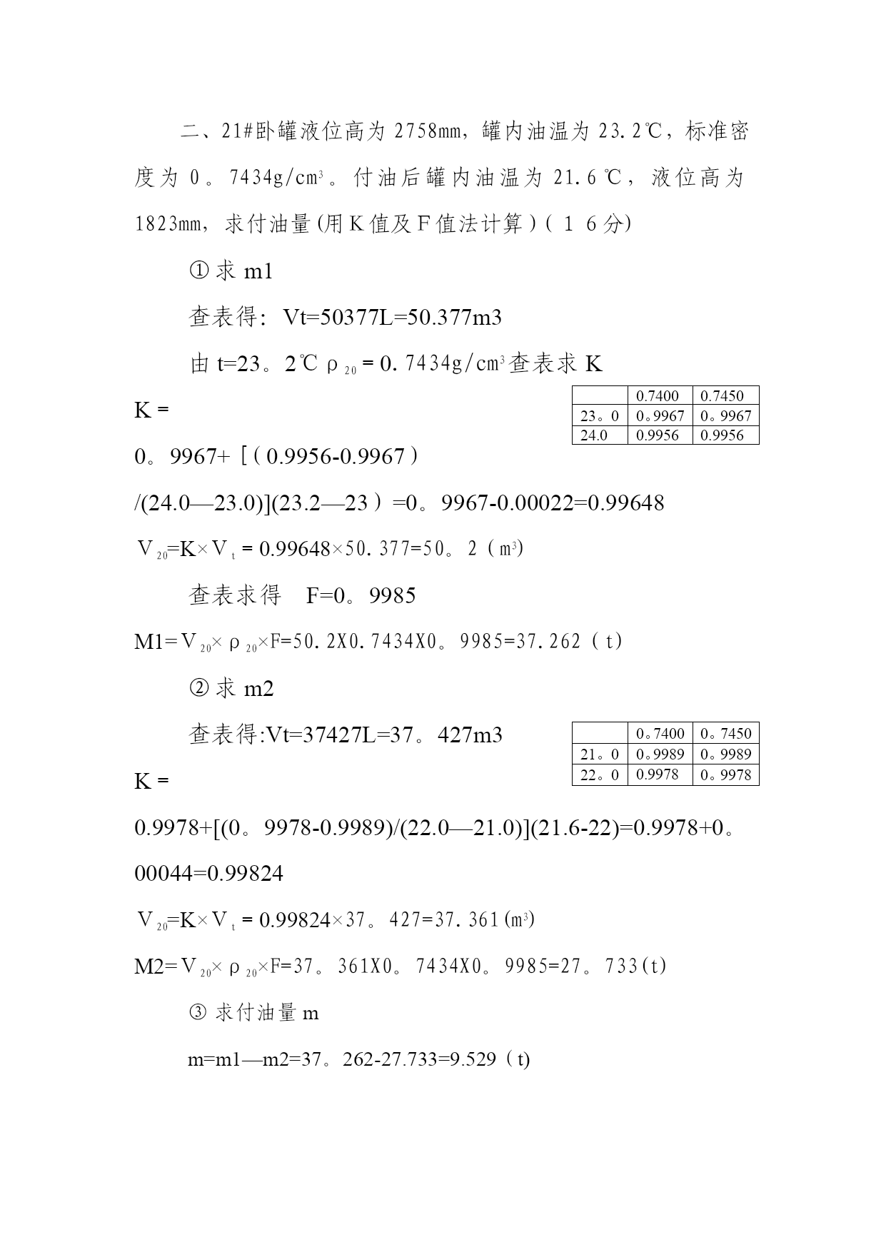 石油计量员培训考核理论试题及答案实用文档(实用文档,可以直接使用,可编辑优秀版资料,欢迎下载)石油计量员培训考核理论试题姓名:单位:分数:一、填空:(每空0。5分,共25分)1、按油品储运的环节,将损耗分为保管损耗、运输损耗、零售损耗等三大类。2、量是由数值和计量单位两部分构成.3、用加修正值的方法可消除系统误差;当无限次地增加测量次数时,可消除随机误差。4、油罐机械呼吸阀的作用是减少油品损耗、保证油罐安全。5、正确度表示测量结果中系统误差大小的程度,精确度是测量结果系统误差与随机误差综合的反映。6、在测量轻质油品油高时应连续测量2次,它们之间的读数误差不大于1mm,否则必须重新检尺,最后结果取小的读数为准。7、汽油的牌号根据辛烷值来划分的,根据其大小,一般可分为90#、93#、95#.8、某汽油罐的液高为9.530m,则测温需取3点,测温停留时间为5min。9、在测量油高时,立式金属罐收油后稳油时间轻质油为2h,重质粘油为3h.铁路罐车轻油液面稳定时间为15min。10、用汽油发动机的车辆排气管冒黑烟是汽油的辛烷值低,用柴油发动机的车辆排气管冒黑烟是柴油的十六烷值低.11、成品油通常可分为汽油、煤油、柴油、溶剂油和润滑油五大类.12、在GB/T1885-1998《石油计量表》中,标准体积的计算公式为V20=Vt×VCF20,油品重量的计算公式为m=V20×(ρ20-1.1)。13、运输损耗的处理原则是:收货方负担定额损耗,发货方承受溢余,责任方负担超耗,确系由于承运方责任造成超耗时由承运方承担。14、写出下列计量器具的检定周期:流量计为半年,密度计为1年,立式油罐为4年,温度计为1年,量油尺为半年。15、单位换算:1m3=1000升0。8340g/cm3=0。8340kg/dm3=0。8340t/m3=834.0kg/m316、《中华人民共和国计量法》是1985年9月6日由第六届全国人民代表大会常务委员会第十二次会议通过的。于1986年7月1日起施行.二、选择题:(每小题2分,共18分)1、测量结果中反映随机误差大小的是测量的C。A、准确度B、正确度C、精密度2、石油产品的危险度等级是按C划分的。A、易产生静电性B、易挥发性C、闪点的高低3、大呼吸损耗通常是在B时发生。A、温度变化时B、收发油作业时C、自然通风时4、计算石油产品的运输超耗量的方法是C.A、超耗量=实收量-原发量-运输定额损耗量-互不找补量B、超耗量=原发量-实收量-运输定额损耗量-互不找补量C、超耗量=原发量-(实收量+运输定额损耗量)5、0。7100g/cm3的正确读法是B。A、每立方厘米0。7100克B、0。7100克每立方厘米C、0.7100每立方厘米克6、下列说法正确的是B。A、量油尺是强检计量器具B、铁路罐车是强检计量器具C、油罐是强检计量器具7、灌装损耗量应由A承担。A、发货方B、收货方C、承运方8、降低液体石油产品蒸发损耗的措施可以采用C。A、将油罐密封B、增大呼吸阀盘重量C、喷淋降温9、外贸交接时,油重的计算公式应采用C.A、m=Vt·GtB、m=Vt·K·ρ20·FC、m=V20·(ρ20-1。1)三、判断题:(每小题2分,共20分)1、小王身高一米六五,体重65公斤。(×)2、随机误差又叫偶然误差,可以通过增加测量次数来消除它。(√)3、给内部加油站送油的汽车罐车属强检计量器具。(×)4、参照高度是从检尺口到基准点的距离(√).5、粗大误差可通过加修正值的方法消除。(×)6、收货人必须于同批油品全部到达后十天内提出索赔资料(以邮戳为准)。(√)7、用同一支密度计测量密度,液体密度小时,浸没深度大,液体密度大时,浸没深度小。(√)8、取样是为了测量油品的密度及油温。(×)9、绝对误差与误差的绝对值是两个相同的概念。(×)10、石油小呼吸损耗随油罐空容量的增大而增大。(√)四、问答题:(37分)油品质量管理的措施有哪些?(6分)答:1、减少轻组分蒸发和延缓氧化变质.2、防止混入水杂造成油品变质.3、防止混油和容器污染变质。在测量油高时为什么要从参照点下尺?(6分)答:因为油罐的容积表是依据油罐参照点的高度而编制的,所以测量油高是必须从参照点下尺。请回答立式油罐、铁路罐车的取样测温部位。(7分)答:铁路罐车的测温部位为油罐车油高中部。立式油罐油高在3米以下,在油高中部测温;油高3~5米,在油品上液面下1米处测温;油高5米以上,在油品上液面下1米,油高中部和下液面上1米处各测一点。试述温度、密度、体积三者之间的关系。(6分)答:对于油品温度越高,密度越小,体积越大.5、密度计的工作原理是什么?为什么密