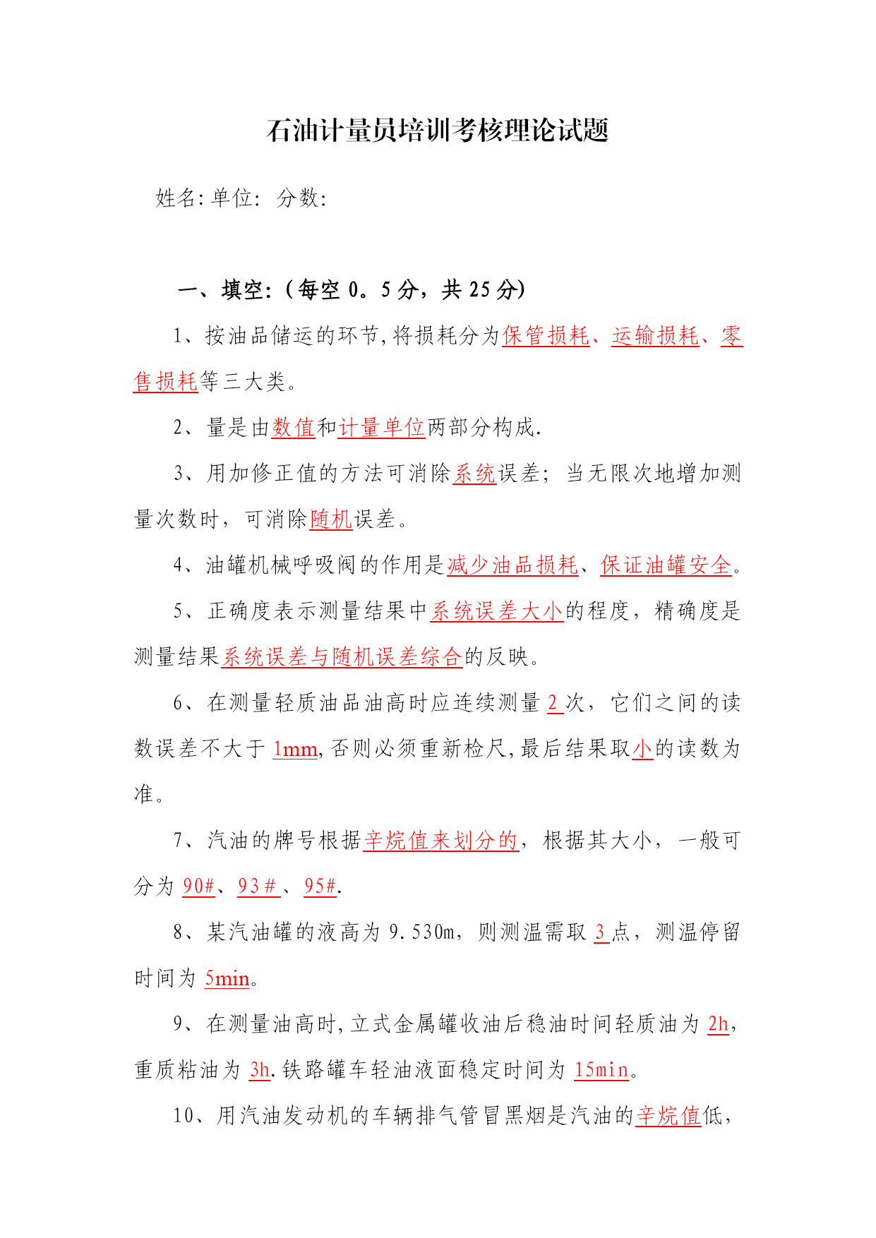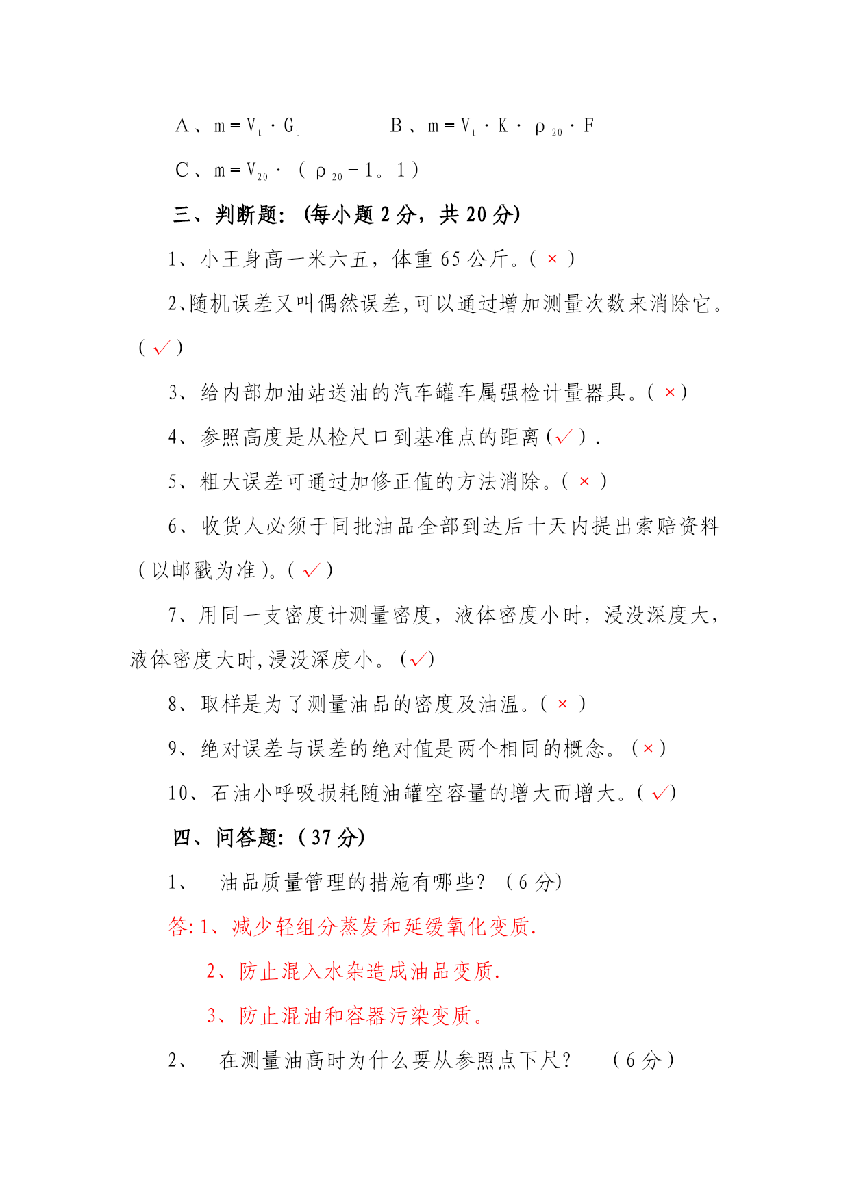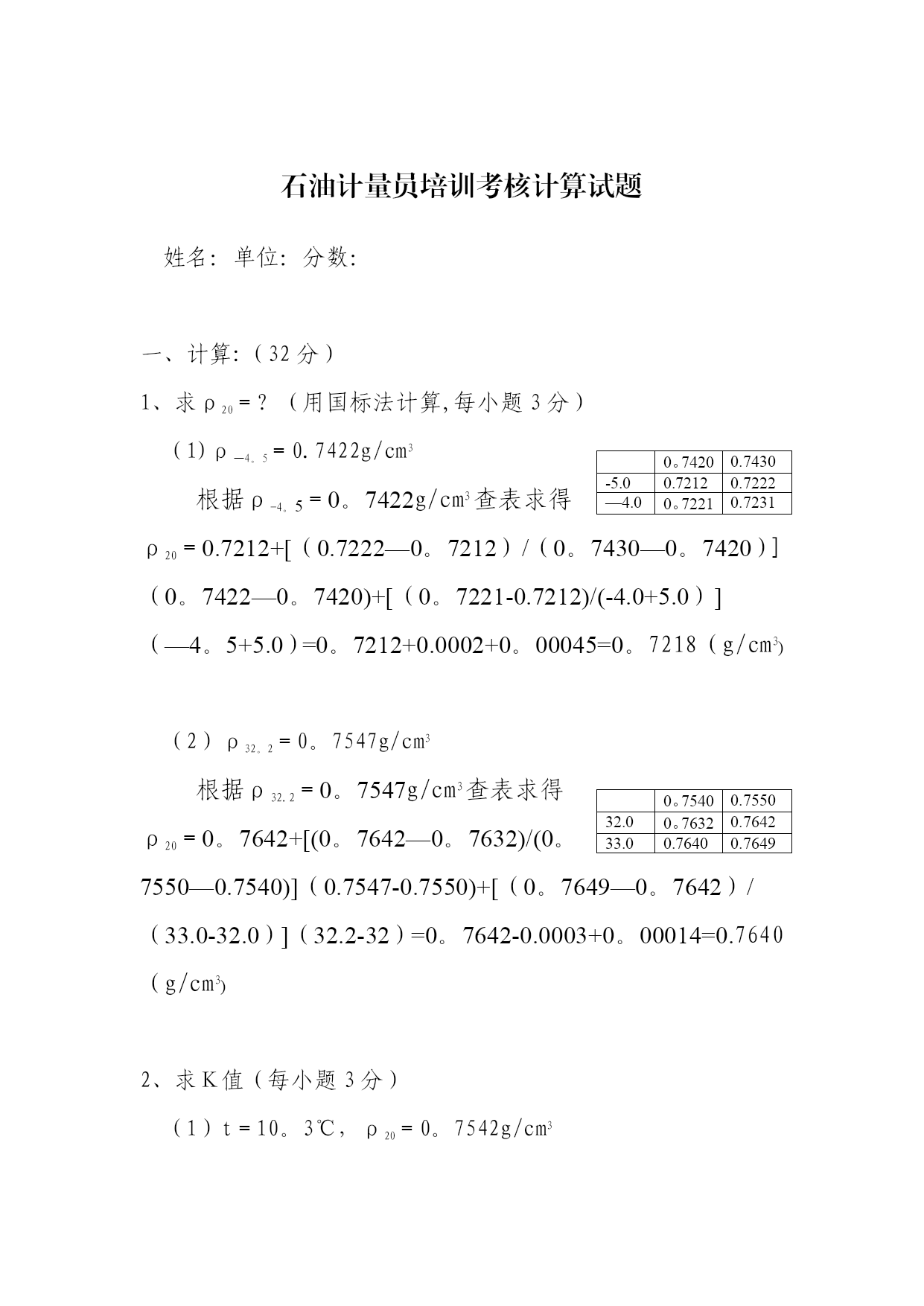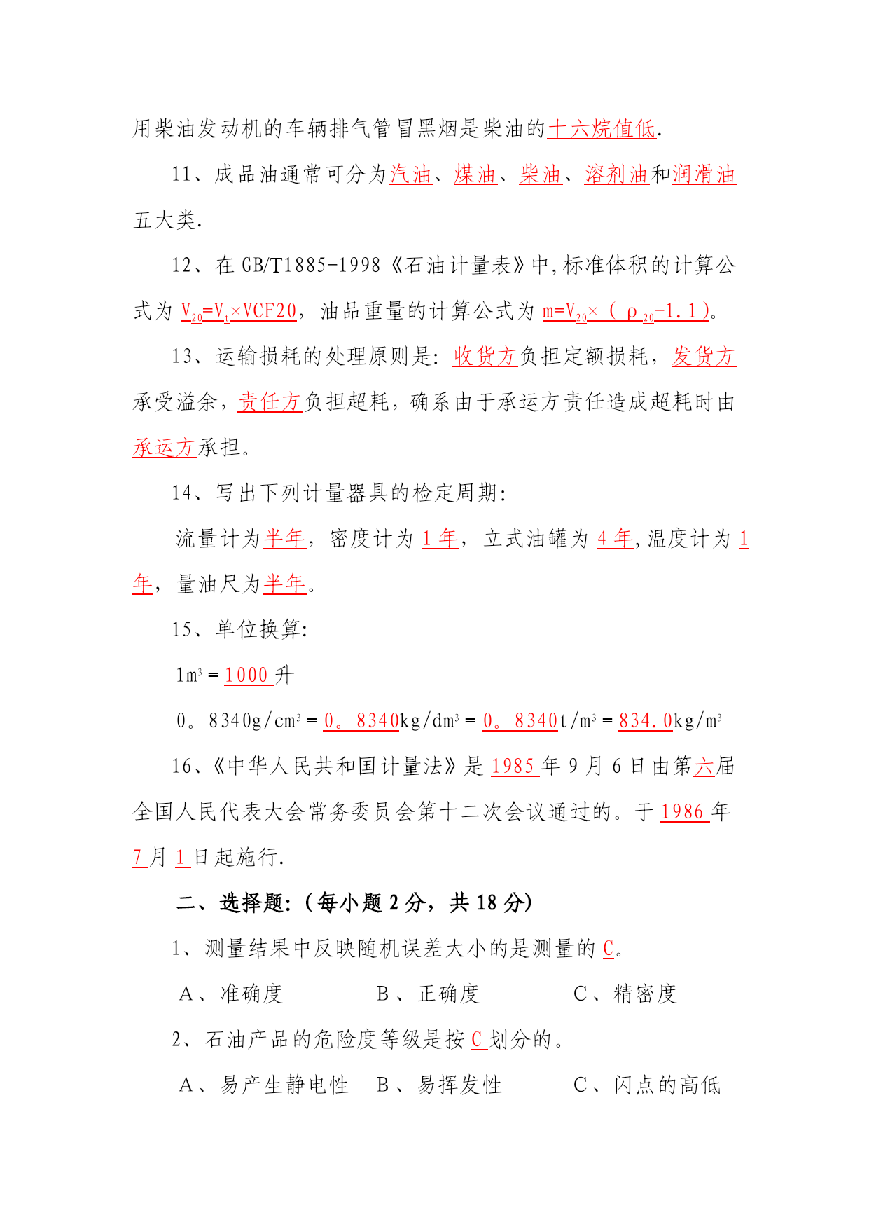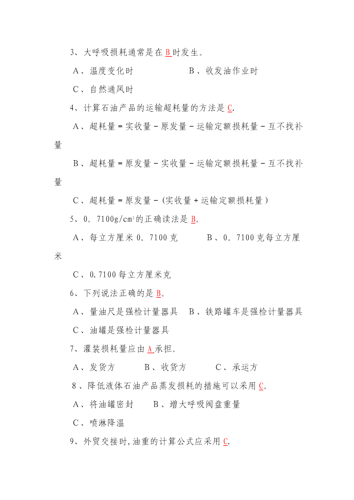 石油计量员培训考核理论试题及答案实用文档(实用文档,可以直接使用,可编辑优秀版资料,欢迎下载)石油计量员培训考核理论试题姓名:单位:分数:一、填空:(每空0。5分,共25分)1、按油品储运的环节,将损耗分为保管损耗、运输损耗、零售损耗等三大类。2、量是由数值和计量单位两部分构成.3、用加修正值的方法可消除系统误差;当无限次地增加测量次数时,可消除随机误差。4、油罐机械呼吸阀的作用是减少油品损耗、保证油罐安全。5、正确度表示测量结果中系统误差大小的程度,精确度是测量结果系统误差与随机误差综合的反映。6、在测量轻质油品油高时应连续测量2次,它们之间的读数误差不大于1mm,否则必须重新检尺,最后结果取小的读数为准。7、汽油的牌号根据辛烷值来划分的,根据其大小,一般可分为90#、93#、95#.8、某汽油罐的液高为9.530m,则测温需取3点,测温停留时间为5min。9、在测量油高时,立式金属罐收油后稳油时间轻质油为2h,重质粘油为3h.铁路罐车轻油液面稳定时间为15min。10、用汽油发动机的车辆排气管冒黑烟是汽油的辛烷值低,用柴油发动机的车辆排气管冒黑烟是柴油的十六烷值低.11、成品油通常可分为汽油、煤油、柴油、溶剂油和润滑油五大类.12、在GB/T1885-1998《石油计量表》中,标准体积的计算公式为V20=Vt×VCF20,油品重量的计算公式为m=V20×(ρ20-1.1)。13、运输损耗的处理原则是:收货方负担定额损耗,发货方承受溢余,责任方负担超耗,确系由于承运方责任造成超耗时由承运方承担。14、写出下列计量器具的检定周期:流量计为半年,密度计为1年,立式油罐为4年,温度计为1年,量油尺为半年。15、单位换算:1m3=1000升0。8340g/cm3=0。8340kg/dm3=0。8340t/m3=834.0kg/m316、《中华人民共和国计量法》是1985年9月6日由第六届全国人民代表大会常务委员会第十二次会议通过的。于1986年7月1日起施行.二、选择题:(每小题2分,共18分)1、测量结果中反映随机误差大小的是测量的C。A、准确度B、正确度C、精密度2、石油产品的危险度等级是按C划分的。A、易产生静电性B、易挥发性C、闪点的高低3、大呼吸损耗通常是在B时发生。A、温度变化时B、收发油作业时C、自然通风时4、计算石油产品的运输超耗量的方法是C.A、超耗量=实收量-原发量-运输定额损耗量-互不找补量B、超耗量=原发量-实收量-运输定额损耗量-互不找补量C、超耗量=原发量-(实收量+运输定额损耗量)5、0。7100g/cm3的正确读法是B。A、每立方厘米0。7100克B、0。7100克每立方厘米C、0.7100每立方厘米克6、下列说法正确的是B。A、量油尺是强检计量器具B、铁路罐车是强检计量器具C、油罐是强检计量器具7、灌装损耗量应由A承担。A、发货方B、收货方C、承运方8、降低液体石油产品蒸发损耗的措施可以采用C。A、将油罐密封B、增大呼吸阀盘重量C、喷淋降温9、外贸交接时,油重的计算公式应采用C.A、m=Vt·GtB、m=Vt·K·ρ20·FC、m=V20·(ρ20-1。1)三、判断题:(每小题2分,共20分)1、小王身高一米六五,体重65公斤。(×)2、随机误差又叫偶然误差,可以通过增加测量次数来消除它。(√)3、给内部加油站送油的汽车罐车属强检计量器具。(×)4、参照高度是从检尺口到基准点的距离(√).5、粗大误差可通过加修正值的方法消除。(×)6、收货人必须于同批油品全部到达后十天内提出索赔资料(以邮戳为准)。(√)7、用同一支密度计测量密度,液体密度小时,浸没深度大,液体密度大时,浸没深度小。(√)8、取样是为了测量油品的密度及油温。(×)9、绝对误差与误差的绝对值是两个相同的概念。(×)10、石油小呼吸损耗随油罐空容量的增大而增大。(√)四、问答题:(37分)油品质量管理的措施有哪些?(6分)答:1、减少轻组分蒸发和延缓氧化变质.2、防止混入水杂造成油品变质.3、防止混油和容器污染变质。在测量油高时为什么要从参照点下尺?(6分)答:因为油罐的容积表是依据油罐参照点的高度而编制的,所以测量油高是必须从参照点下尺。请回答立式油罐、铁路罐车的取样测温部位。(7分)答:铁路罐车的测温部位为油罐车油高中部。立式油罐油高在3米以下,在油高中部测温;油高3~5米,在油品上液面下1米处测温;油高5米以上,在油品上液面下1米,油高中部和下液面上1米处各测一点。试述温度、密度、体积三者之间的关系。(6分)答:对于油品温度越高,密度越小,体积越大.5、密度计的工作原理是什么?为什么密