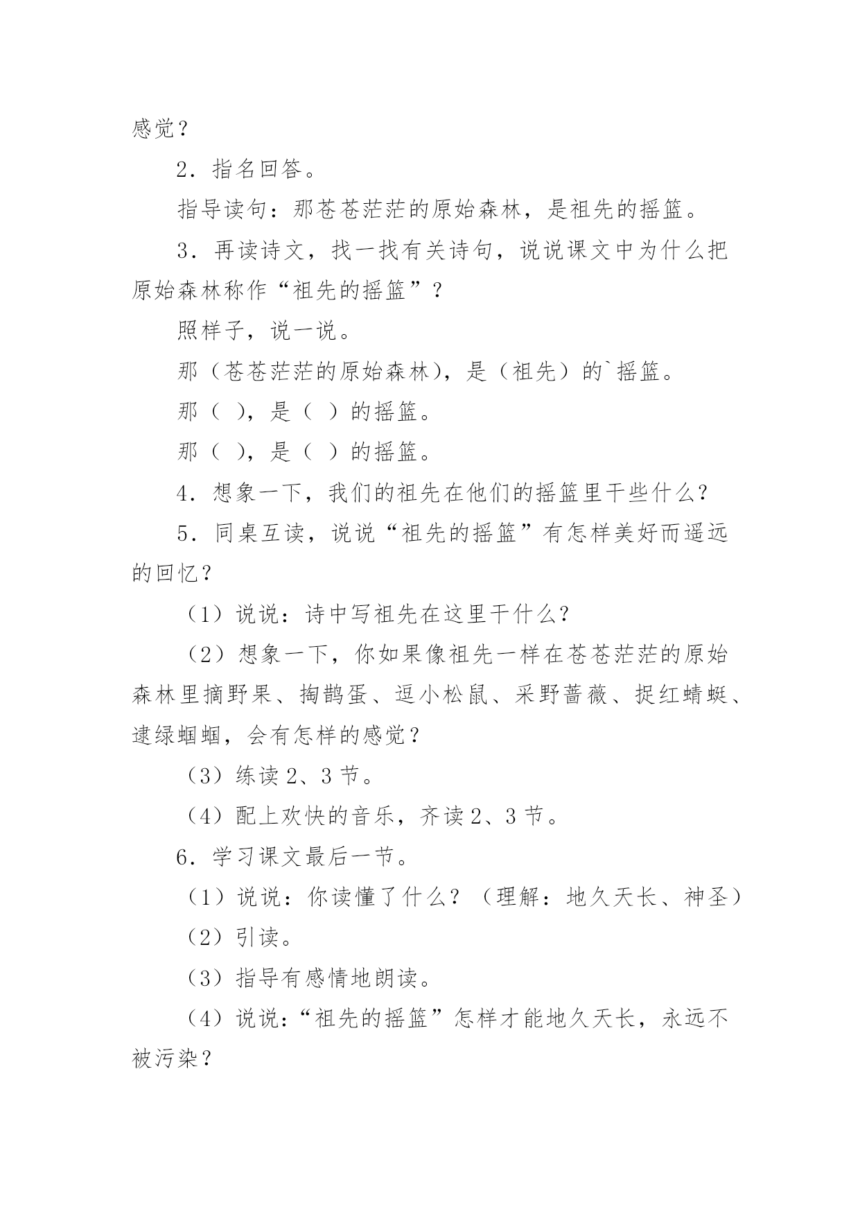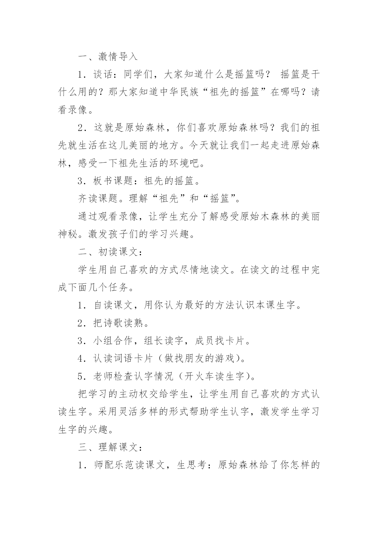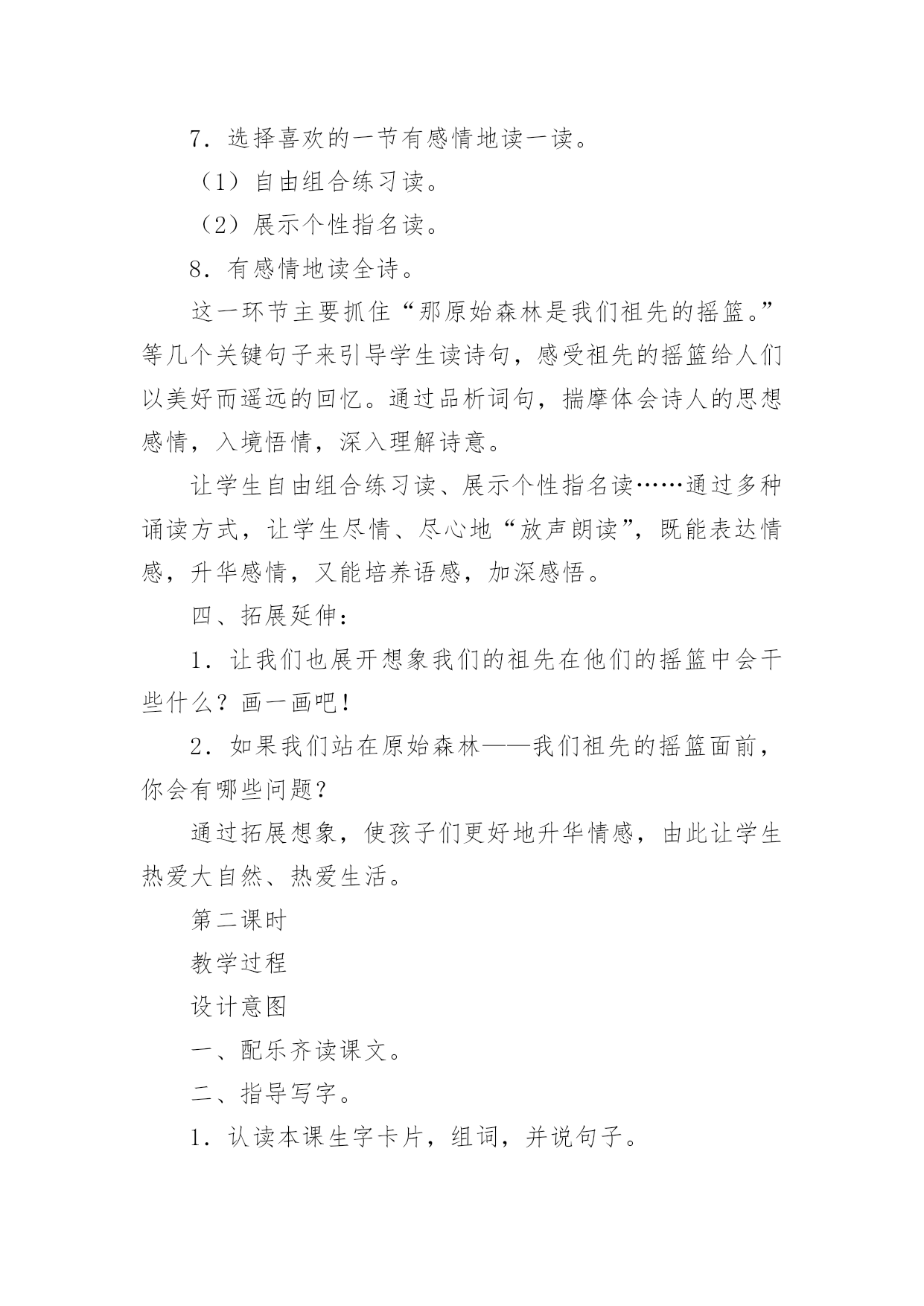 祖先的摇篮教学设计祖先的摇篮教学设计作为一名教师,通常需要用到教学设计来辅助教学,编写教学设计有利于我们科学、合理地支配课堂时间。你知道什么样的教学设计才能切实有效地帮助到我们吗?下面是小编整理的祖先的摇篮教学设计,仅供参考,希望能够帮助到大家。祖先的摇篮教学设计篇1教学目标:1.学会本课的生字新词。培养学生联系上下文理解词语的能力。2.能正确、流利、有感情地朗读课文。了解课文的主要内容,懂得“祖先的摇篮”的含义。3.充分发挥学生学习的主体性,开展小组讨论,理解、感悟课文。4.培养学生热爱大自然和热爱生活的美好情感。教学难点:能正确、流利、有感情地朗读课文。了解课文的主要内容,懂得“祖先的摇篮”的含义。教学重点:培养学生热爱大自然和热爱生活的美好情感。教学设计:第一课时教学过程设计意图一、激情导入1.谈话:同学们,大家知道什么是摇篮吗?摇篮是干什么用的?那大家知道中华民族“祖先的摇篮”在哪吗?请看录像。2.这就是原始森林,你们喜欢原始森林吗?我们的祖先就生活在这儿美丽的地方。今天就让我们一起走进原始森林,感受一下祖先生活的环境吧。3.板书课题:祖先的摇篮。齐读课题。理解“祖先”和“摇篮”。通过观看录像,让学生充分了解感受原始木森林的美丽神秘。激发孩子们的学习兴趣。二、初读课文:学生用自己喜欢的方式尽情地读文。在读文的过程中完成下面几个任务。1.自读课文,用你认为最好的方法认识本课生字。2.把诗歌读熟。3.小组合作,组长读字,成员找卡片。4.认读词语卡片(做找朋友的游戏)。5.老师检查认字情况(开火车读生字)。把学习的主动权交给学生,让学生用自己喜欢的方式认读生字。采用灵活多样的形式帮助学生认字,激发学生学习生字的兴趣。三、理解课文:1.师配乐范读课文,生思考:原始森林给了你怎样的感觉?2.指名回答。指导读句:那苍苍茫茫的原始森林,是祖先的摇篮。3.再读诗文,找一找有关诗句,说说课文中为什么把原始森林称作“祖先的摇篮”?照样子,说一说。那(苍苍茫茫的原始森林),是(祖先)的`摇篮。那(),是()的摇篮。那(),是()的摇篮。4.想象一下,我们的祖先在他们的摇篮里干些什么?5.同桌互读,说说“祖先的摇篮”有怎样美好而遥远的回忆?(1)说说:诗中写祖先在这里干什么?(2)想象一下,你如果像祖先一样在苍苍茫茫的原始森林里摘野果、掏鹊蛋、逗小松鼠、采野蔷薇、捉红蜻蜓、逮绿蝈蝈,会有怎样的感觉?(3)练读2、3节。(4)配上欢快的音乐,齐读2、3节。6.学习课文最后一节。(1)说说:你读懂了什么?(理解:地久天长、神圣)(2)引读。(3)指导有感情地朗读。(4)说说:“祖先的摇篮”怎样才能地久天长,永远不被污染?7.选择喜欢的一节有感情地读一读。(1)自由组合练习读。(2)展示个性指名读。8.有感情地读全诗。这一环节主要抓住“那原始森林是我们祖先的摇篮。”等几个关键句子来引导学生读诗句,感受祖先的摇篮给人们以美好而遥远的回忆。通过品析词句,揣摩体会诗人的思想感情,入境悟情,深入理解诗意。让学生自由组合练习读、展示个性指名读……通过多种诵读方式,让学生尽情、尽心地“放声朗读”,既能表达情感,升华感情,又能培养语感,加深感悟。四、拓展延伸:1.让我们也展开想象我们的祖先在他们的摇篮中会干些什么?画一画吧!2.如果我们站在原始森林——我们祖先的摇篮面前,你会有哪些问题?通过拓展想象,使孩子们更好地升华情感,由此让学生热爱大自然、热爱生活。第二课时教学过程设计意图一、配乐齐读课文。二、指导写字。1.认读本课生字卡片,组词,并说句子。2.小组讨论如何记忆字型,如何把字写好看。3.指导重点字的书写。“始”字中“女”作偏旁要变窄,横画变短不出头。“意”、“思”、“想”都有“心字底”。4.学生独立描红书写。让学生自己记字形,认生字,激发学生学习生字的兴趣,锻炼自主学习意识。孩子们的良师益友——访儿童文学作家吴珹认识吴珹是在第六届吴桥国际杂技艺术节上,当时,他为我们的杂技节会刊写了一些杂技节回忆文章。之后才知道,他还是一位儿童文学作家,作家出版社、接力出版社等10多家出版社出版的小学语文课外读物中,都选用过他的作品。河北教育出版社出版的《童年书架》中,几乎每个年级都有他的作品。在“六一”来临之际,记者采访了这位孩子的良师益友。许多孩子都读过吴珹的作品,但往往不知道作者是谁。今年春天,我市一位小学四年级的语文老师,让学生们在字典里查找课本中《芦叶船》作者的名字,但现代汉语字典里找不到吴珹的“珹”字。有位家长认识吴珹,老师知道后,就把吴珹请到学校,让他亲自给学生们讲《芦叶船》,深受孩子们欢迎。消息传开,好几个学校都请他去讲《芦叶船》,吴珹总是来者不拒,极其热情,还和不少孩子交了朋友。其实,吴珹的作品早就走进了孩子们中间。30年前的小学语文课本里就有他写的儿