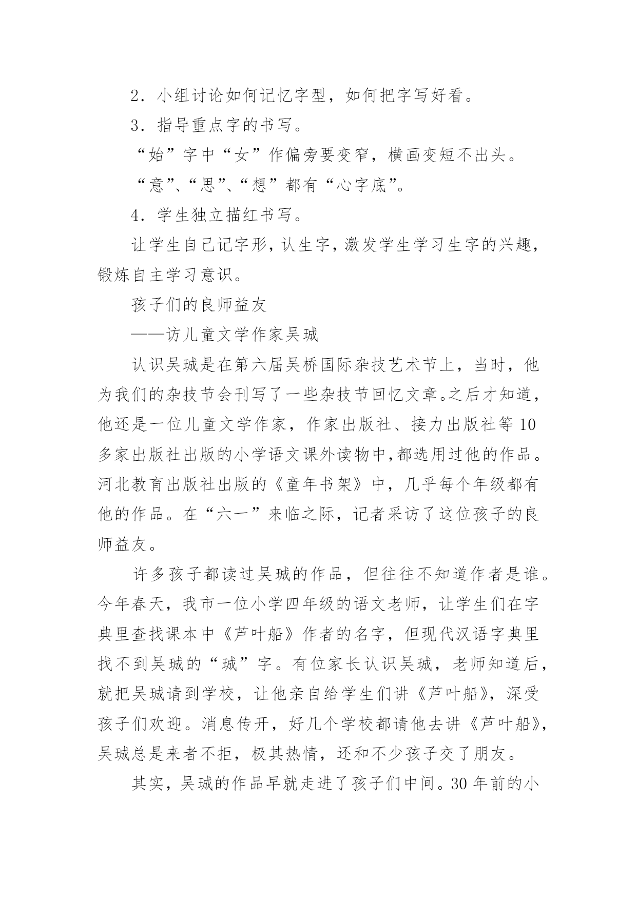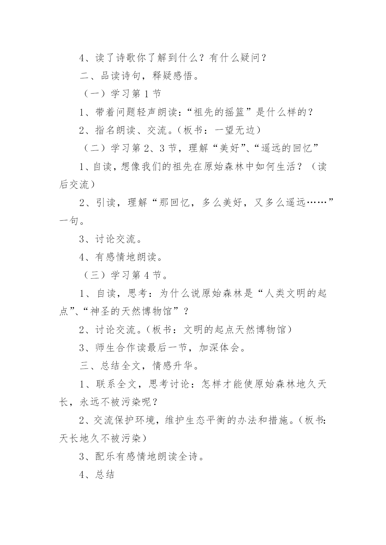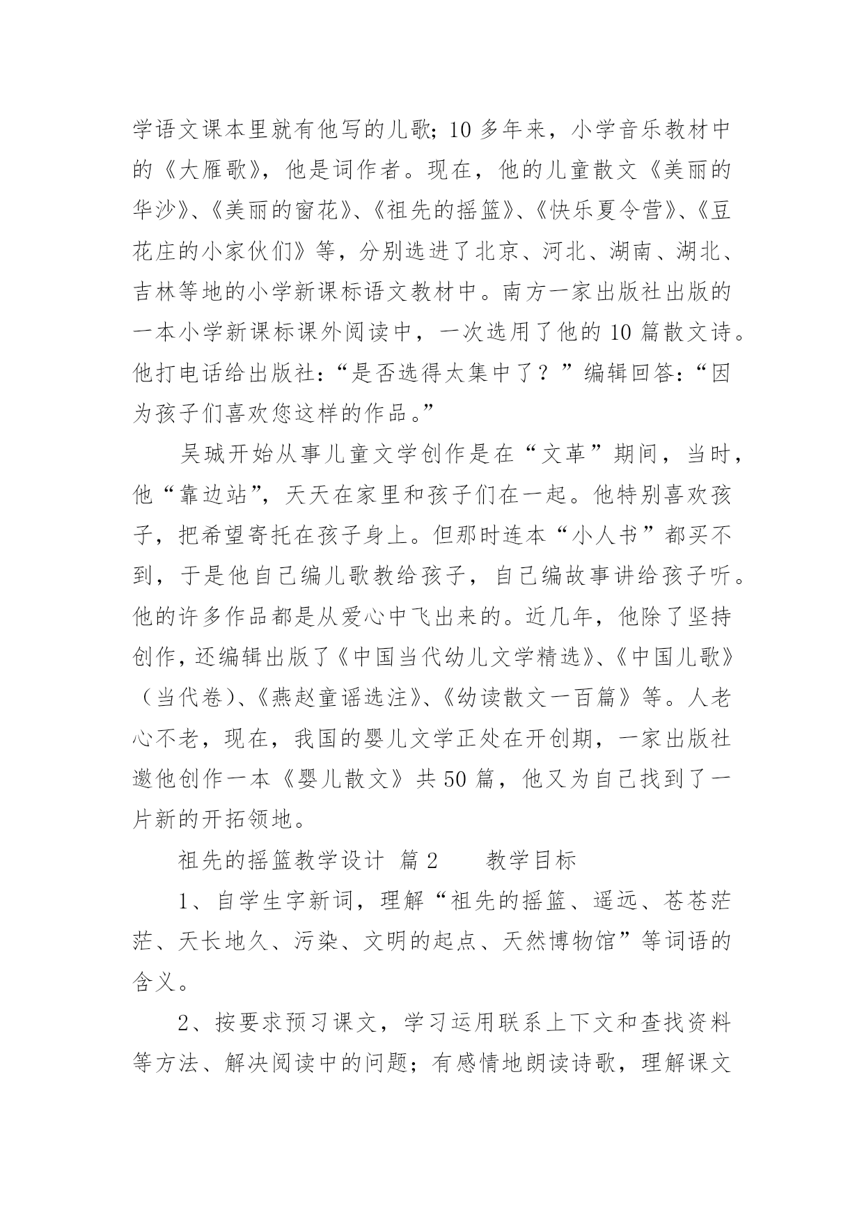 祖先的摇篮教学设计祖先的摇篮教学设计作为一名教师,通常需要用到教学设计来辅助教学,编写教学设计有利于我们科学、合理地支配课堂时间。你知道什么样的教学设计才能切实有效地帮助到我们吗?下面是小编整理的祖先的摇篮教学设计,仅供参考,希望能够帮助到大家。祖先的摇篮教学设计篇1教学目标:1.学会本课的生字新词。培养学生联系上下文理解词语的能力。2.能正确、流利、有感情地朗读课文。了解课文的主要内容,懂得“祖先的摇篮”的含义。3.充分发挥学生学习的主体性,开展小组讨论,理解、感悟课文。4.培养学生热爱大自然和热爱生活的美好情感。教学难点:能正确、流利、有感情地朗读课文。了解课文的主要内容,懂得“祖先的摇篮”的含义。教学重点:培养学生热爱大自然和热爱生活的美好情感。教学设计:第一课时教学过程设计意图一、激情导入1.谈话:同学们,大家知道什么是摇篮吗?摇篮是干什么用的?那大家知道中华民族“祖先的摇篮”在哪吗?请看录像。2.这就是原始森林,你们喜欢原始森林吗?我们的祖先就生活在这儿美丽的地方。今天就让我们一起走进原始森林,感受一下祖先生活的环境吧。3.板书课题:祖先的摇篮。齐读课题。理解“祖先”和“摇篮”。通过观看录像,让学生充分了解感受原始木森林的美丽神秘。激发孩子们的学习兴趣。二、初读课文:学生用自己喜欢的方式尽情地读文。在读文的过程中完成下面几个任务。1.自读课文,用你认为最好的方法认识本课生字。2.把诗歌读熟。3.小组合作,组长读字,成员找卡片。4.认读词语卡片(做找朋友的游戏)。5.老师检查认字情况(开火车读生字)。把学习的主动权交给学生,让学生用自己喜欢的方式认读生字。采用灵活多样的形式帮助学生认字,激发学生学习生字的兴趣。三、理解课文:1.师配乐范读课文,生思考:原始森林给了你怎样的感觉?2.指名回答。指导读句:那苍苍茫茫的原始森林,是祖先的摇篮。3.再读诗文,找一找有关诗句,说说课文中为什么把原始森林称作“祖先的摇篮”?照样子,说一说。那(苍苍茫茫的原始森林),是(祖先)的`摇篮。那(),是()的摇篮。那(),是()的摇篮。4.想象一下,我们的祖先在他们的摇篮里干些什么?5.同桌互读,说说“祖先的摇篮”有怎样美好而遥远的回忆?(1)说说:诗中写祖先在这里干什么?(2)想象一下,你如果像祖先一样在苍苍茫茫的原始森林里摘野果、掏鹊蛋、逗小松鼠、采野蔷薇、捉红蜻蜓、逮绿蝈蝈,会有怎样的感觉?(3)练读2、3节。(4)配上欢快的音乐,齐读2、3节。6.学习课文最后一节。(1)说说:你读懂了什么?(理解:地久天长、神圣)(2)引读。(3)指导有感情地朗读。(4)说说:“祖先的摇篮”怎样才能地久天长,永远不被污染?7.选择喜欢的一节有感情地读一读。(1)自由组合练习读。(2)展示个性指名读。8.有感情地读全诗。这一环节主要抓住“那原始森林是我们祖先的摇篮。”等几个关键句子来引导学生读诗句,感受祖先的摇篮给人们以美好而遥远的回忆。通过品析词句,揣摩体会诗人的思想感情,入境悟情,深入理解诗意。让学生自由组合练习读、展示个性指名读……通过多种诵读方式,让学生尽情、尽心地“放声朗读”,既能表达情感,升华感情,又能培养语感,加深感悟。四、拓展延伸:1.让我们也展开想象我们的祖先在他们的摇篮中会干些什么?画一画吧!2.如果我们站在原始森林——我们祖先的摇篮面前,你会有哪些问题?通过拓展想象,使孩子们更好地升华情感,由此让学生热爱大自然、热爱生活。第二课时教学过程设计意图一、配乐齐读课文。二、指导写字。1.认读本课生字卡片,组词,并说句子。2.小组讨论如何记忆字型,如何把字写好看。3.指导重点字的书写。“始”字中“女”作偏旁要变窄,横画变短不出头。“意”、“思”、“想”都有“心字底”。4.学生独立描红书写。让学生自己记字形,认生字,激发学生学习生字的兴趣,锻炼自主学习意识。孩子们的良师益友——访儿童文学作家吴珹认识吴珹是在第六届吴桥国际杂技艺术节上,当时,他为我们的杂技节会刊写了一些杂技节回忆文章。之后才知道,他还是一位儿童文学作家,作家出版社、接力出版社等10多家出版社出版的小学语文课外读物中,都选用过他的作品。河北教育出版社出版的《童年书架》中,几乎每个年级都有他的作品。在“六一”来临之际,记者采访了这位孩子的良师益友。许多孩子都读过吴珹的作品,但往往不知道作者是谁。今年春天,我市一位小学四年级的语文老师,让学生们在字典里查找课本中《芦叶船》作者的名字,但现代汉语字典里找不到吴珹的“珹”字。有位家长认识吴珹,老师知道后,就把吴珹请到学校,让他亲自给学生们讲《芦叶船》,深受孩子们欢迎。消息传开,好几个学校都请他去讲《芦叶船》,吴珹总是来者不拒,极其热情,还和不少孩子交了朋友。其实,吴珹的作品早就走进了孩子们中间。30年前的小学语文课本里就有他写的儿